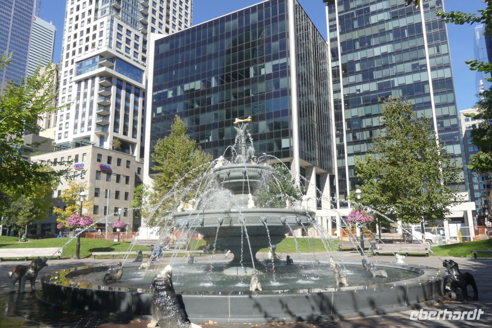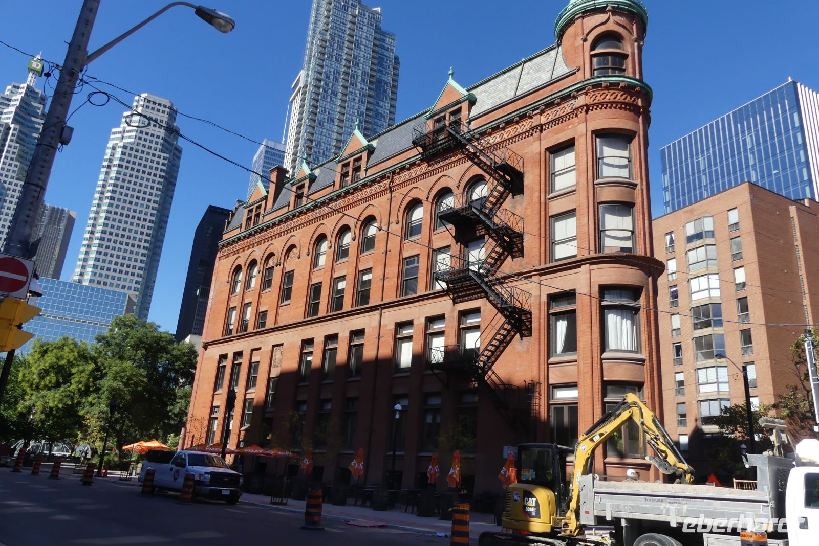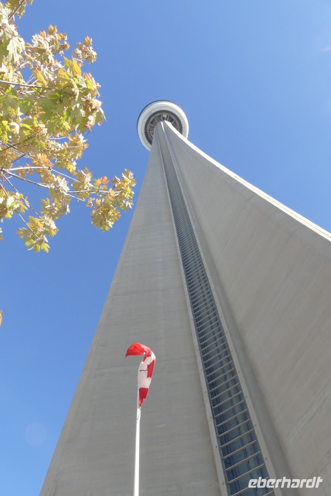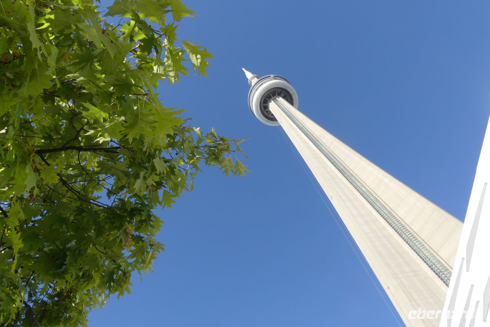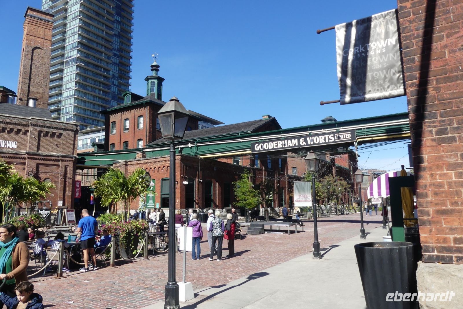 Wir kommen zum CN-Tower, mit 553 Metern lange Zeit höchste freistehende Turm der Welt. In 58 Sekunden bringt uns der Fahrstuhl auf die 346 Meter hoch gelegene Indoor-Aussichtsplattform. Bei blauem Himmel und Sonnenschein haben wir einen fantastischen Blick auf Toronto und den riesigen Ontariosee. Anschließend sehen wir uns einen sehr originellen Brunnen an: im Berczy Park befindet sich der sogenannte Hundebrunnen (Dog Fountain Berczy Park). Hier streben Hundefiguren nach dem goldenen Knochen an der Spitze. Gleich daneben besichtigen wir das sogenannte Bügeleisenhaus (früher eine Schnapsbrennerei). In der Mittagspause verweilen wir im Destillery District von Toronto. Das ist ein wiederbelebtes Quartier mit Backsteingebäuden, in denen sich früher eine Brauerei und Lagerräume befanden.