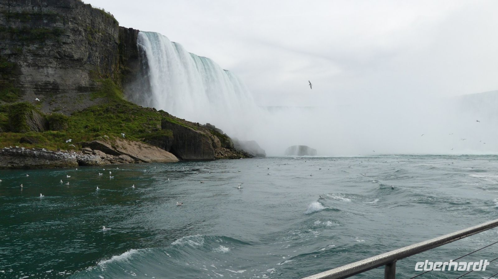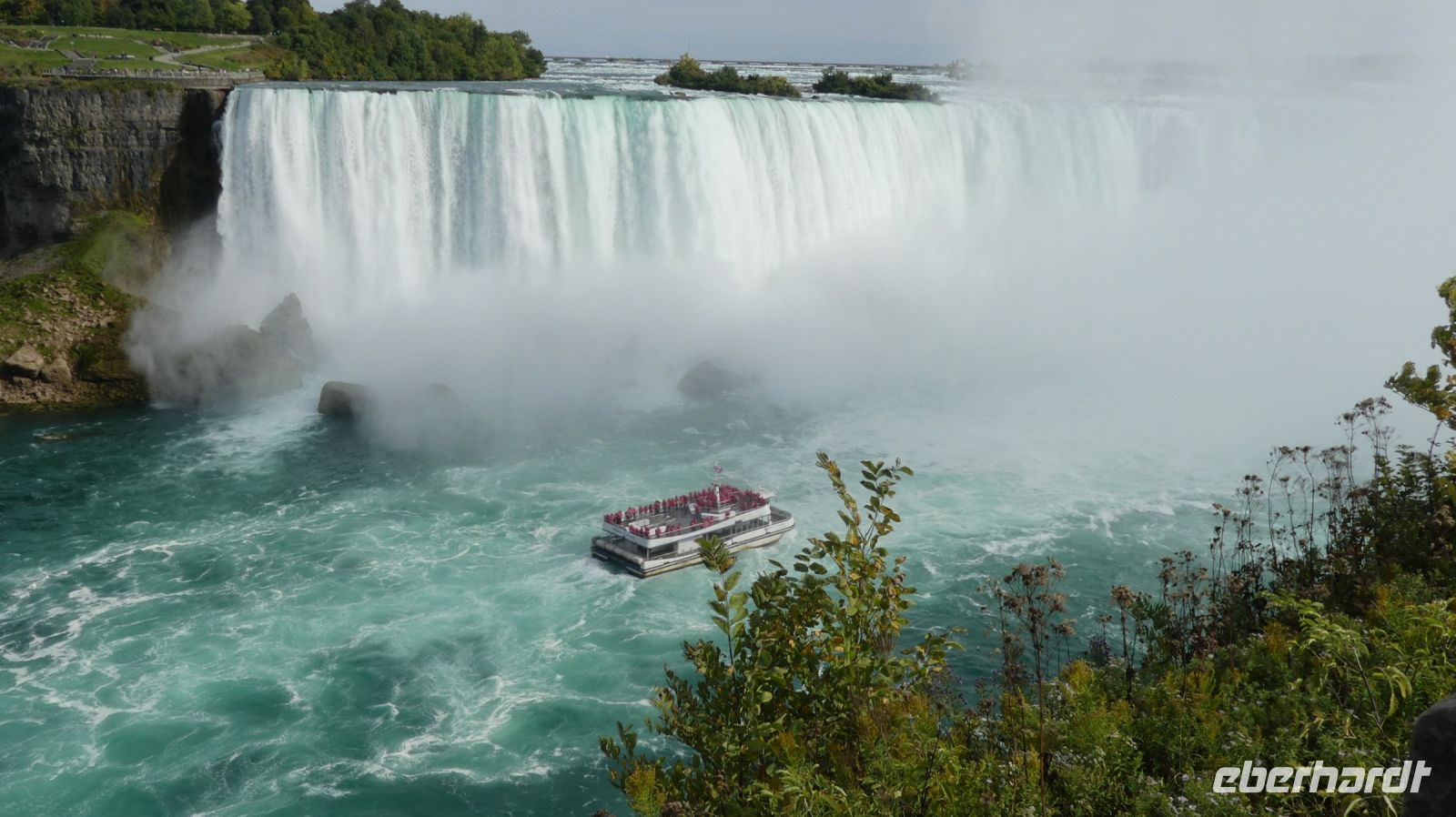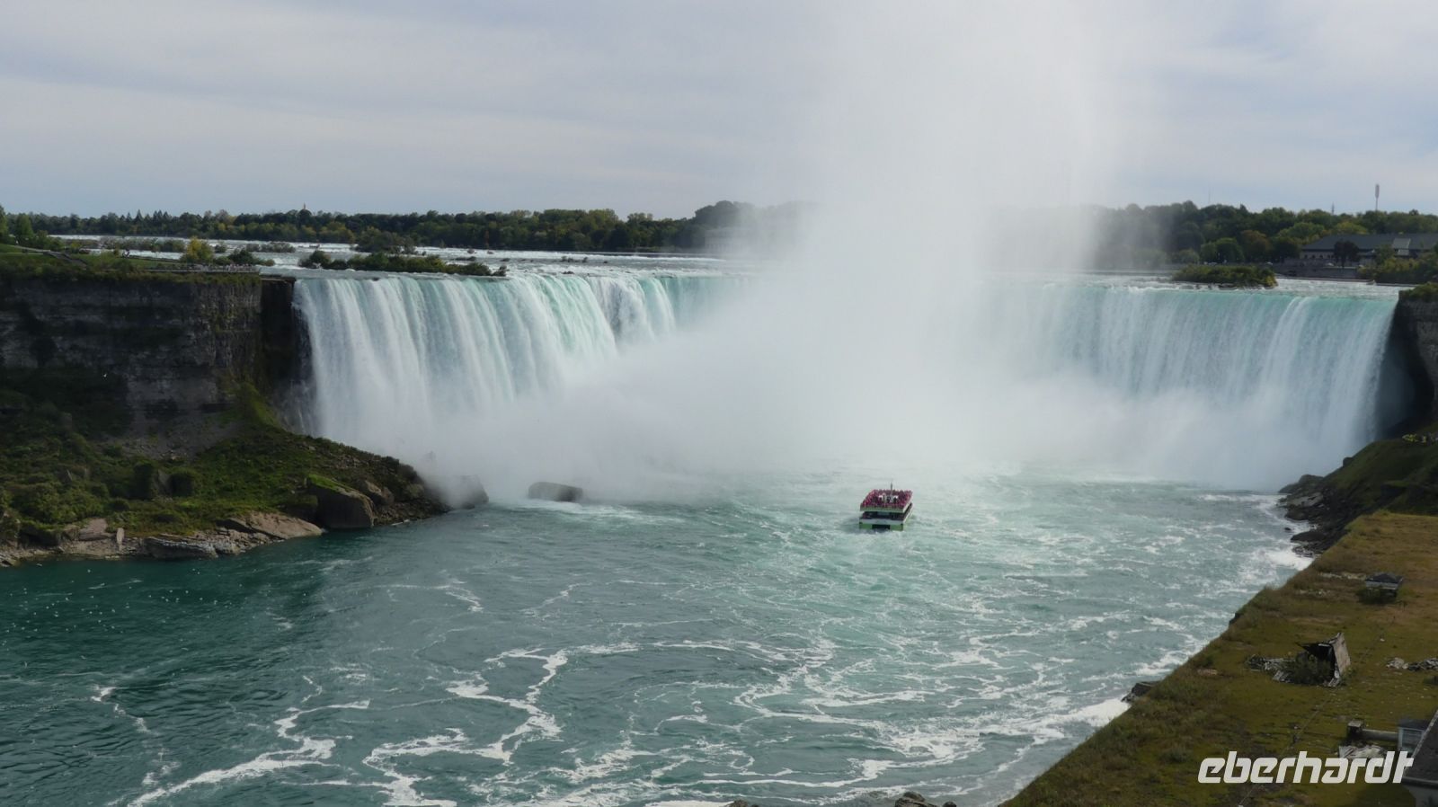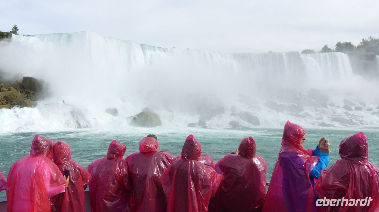 Nach rund 1,5 Stunden Fahrt mit unserem lieben Busfahrer Marco erreichen wir am Nachmittag die Niagarafälle an der kanadisch-amerikanischen Grenze. Bei diesem schönen Wetter spazieren wir entlang des erhöhten Ufers des Niagaraflusses bis nah an den Hauptfall, den Hufeisenfall heran. Auf einer Breite von etwa 820 Metern stürzt hier das Wasser 54 Meter in die Tiefe. Bei der anschließenden Bootsfahrt sehen wir uns das ganz aus der Nähe an. Ausgestattet mit roten Regenumhängen passieren wir den amerikanischen und dann den kanadischen Fall. Wem es zu feucht wird, der kann sich im Unterdeck ins trockene begeben. So oder so ist es ein beeindruckendes Erlebnis, die Fälle aus dieser Perspektive so nah zu sehen.