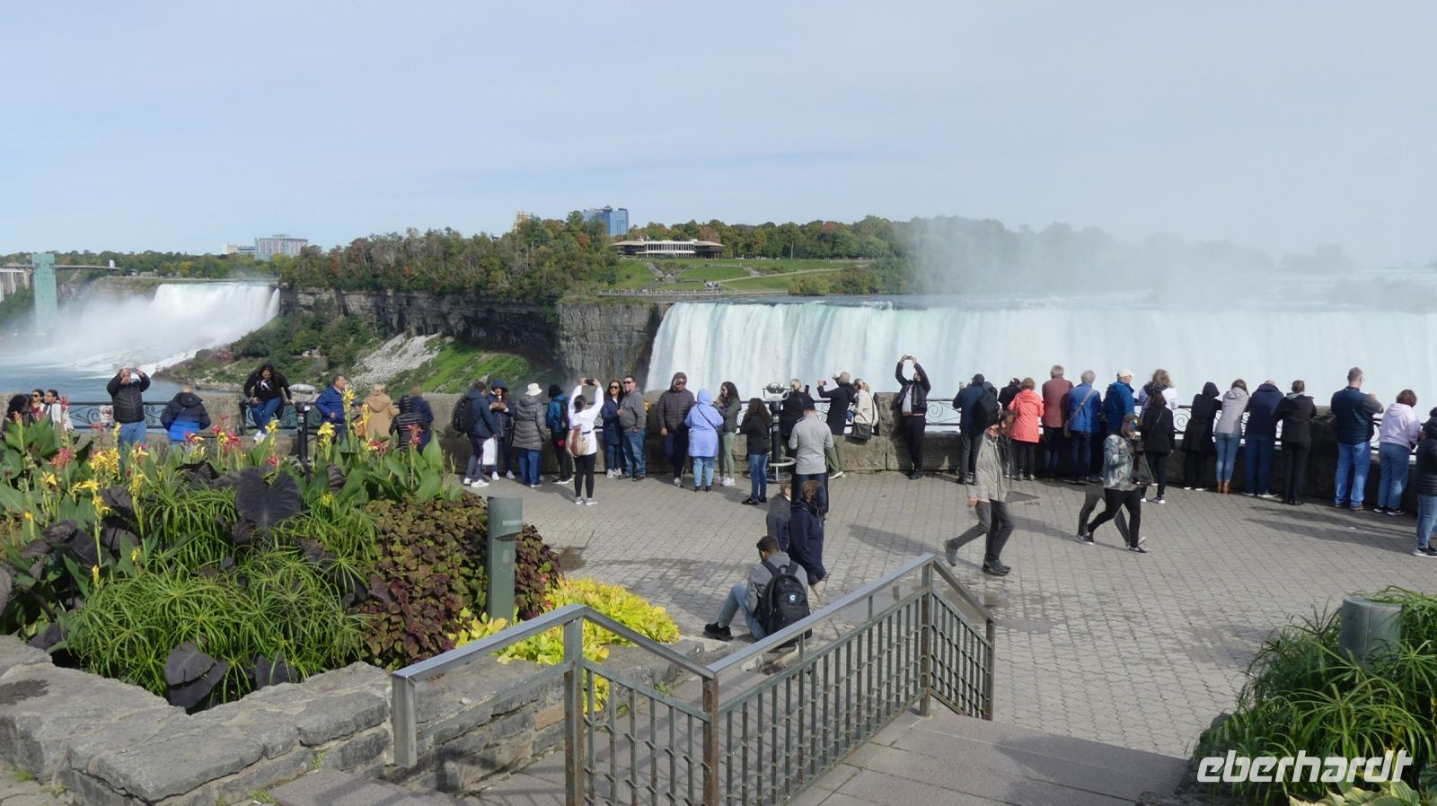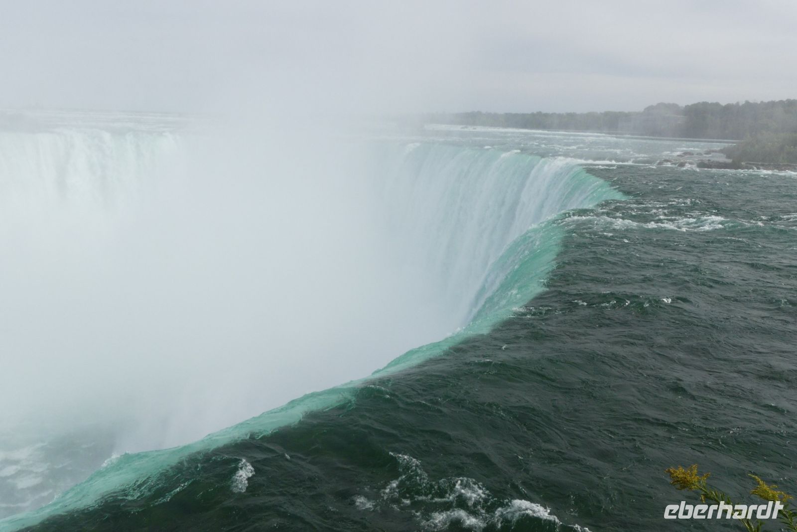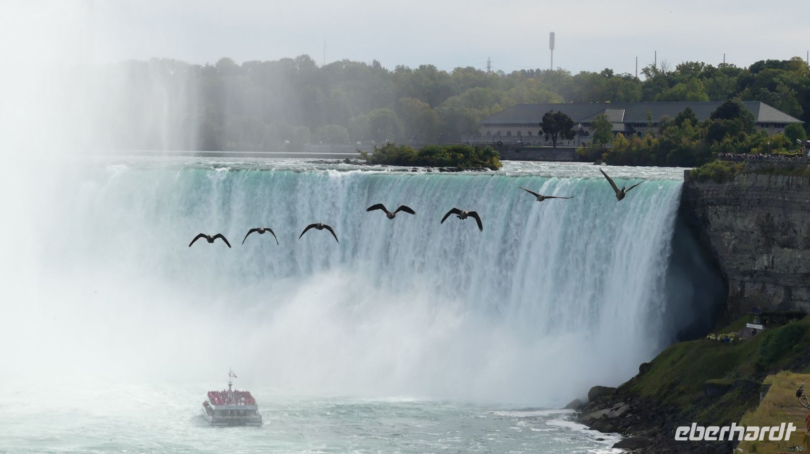 Nach rund 1,5 Stunden Fahrt mit unserem lieben Busfahrer Marco erreichen wir am Nachmittag die Niagarafälle an der kanadisch-amerikanischen Grenze. Bei diesem schönen Wetter spazieren wir entlang des erhöhten Ufers des Niagaraflusses bis nah an den Hauptfall, den Hufeisenfall heran. Auf einer Breite von etwa 820 Metern stürzt hier das Wasser 54 Meter in die Tiefe. Bei der anschließenden Bootsfahrt sehen wir uns das ganz aus der Nähe an. Ausgestattet mit roten Regenumhängen passieren wir den amerikanischen und dann den kanadischen Fall. Wem es zu feucht wird, der kann sich im Unterdeck ins trockene begeben. So oder so ist es ein beeindruckendes Erlebnis, die Fälle aus dieser Perspektive so nah zu sehen.
