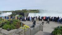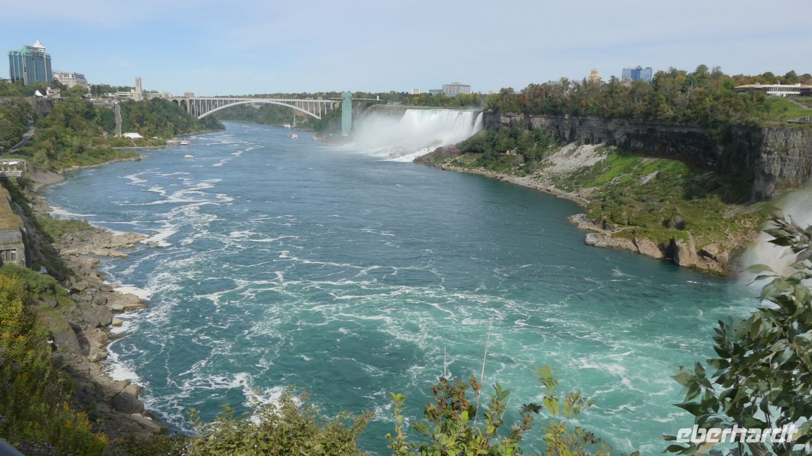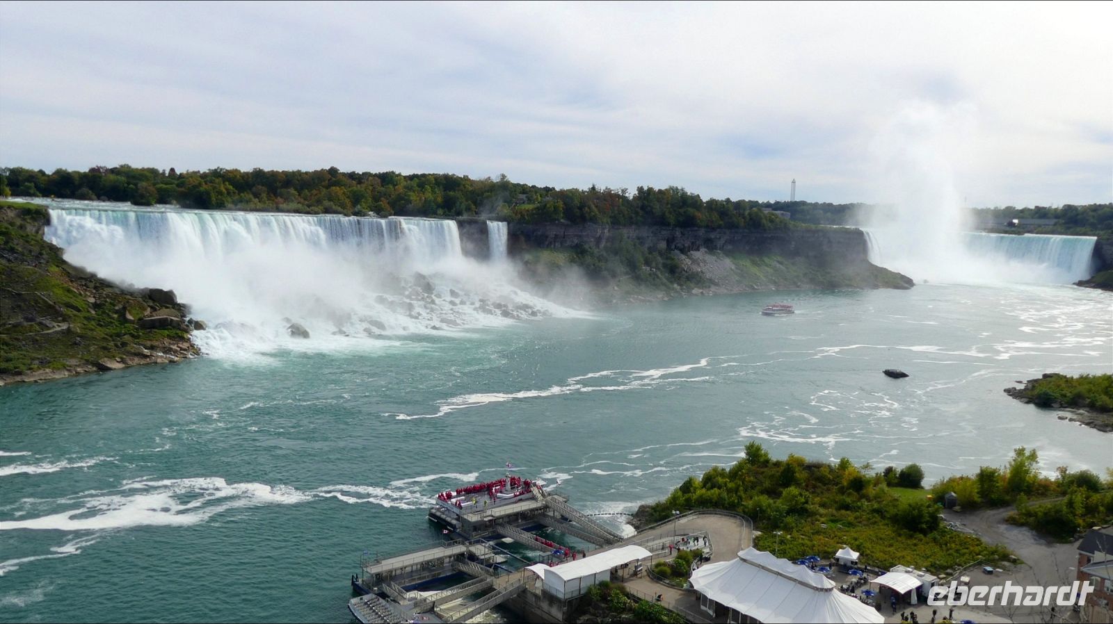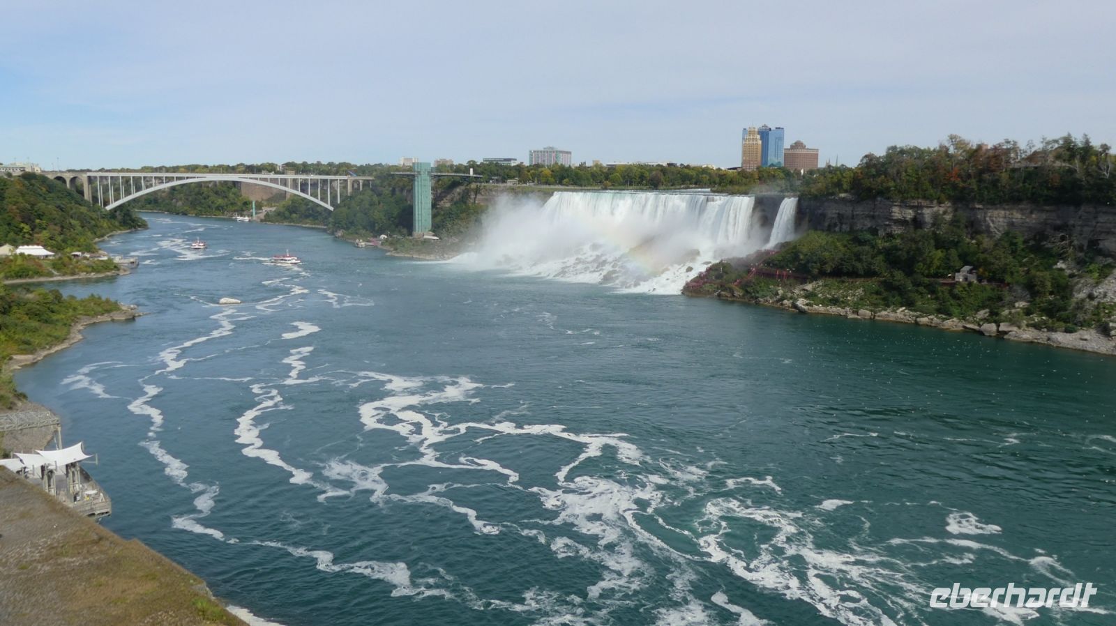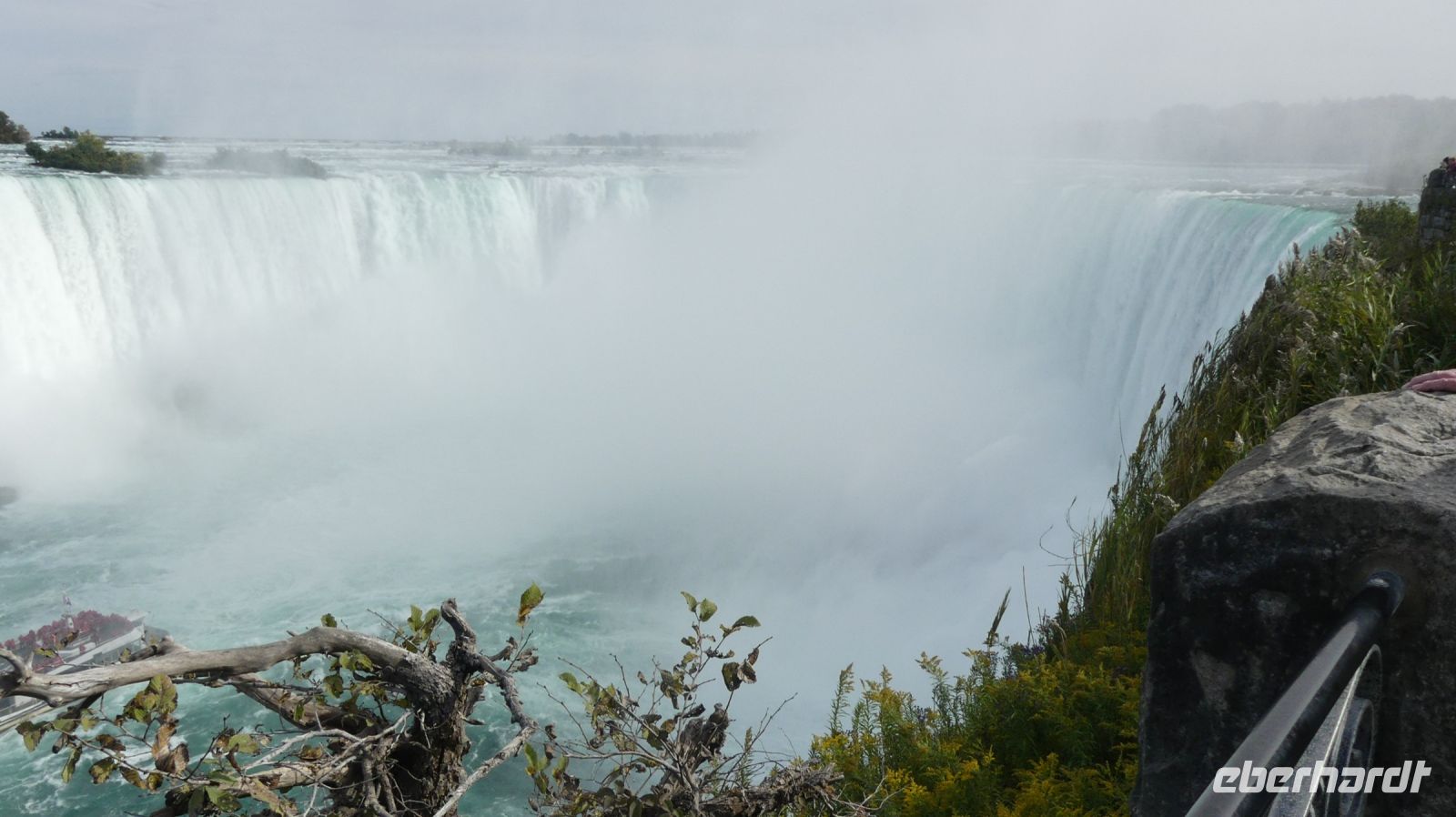 Nach rund 1,5 Stunden Fahrt mit unserem lieben Busfahrer Marco erreichen wir am Nachmittag die Niagarafälle an der kanadisch-amerikanischen Grenze. Bei diesem schönen Wetter spazieren wir entlang des erhöhten Ufers des Niagaraflusses bis nah an den Hauptfall, den Hufeisenfall heran. Auf einer Breite von etwa 820 Metern stürzt hier das Wasser 54 Meter in die Tiefe. Bei der anschließenden Bootsfahrt sehen wir uns das ganz aus der Nähe an. Ausgestattet mit roten Regenumhängen passieren wir den amerikanischen und dann den kanadischen Fall. Wem es zu feucht wird, der kann sich im Unterdeck ins trockene begeben. So oder so ist es ein beeindruckendes Erlebnis, die Fälle aus dieser Perspektive so nah zu sehen.