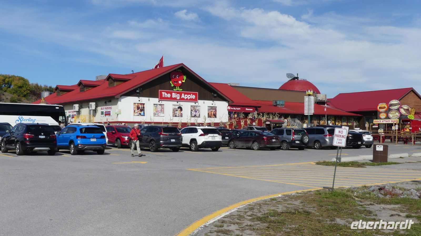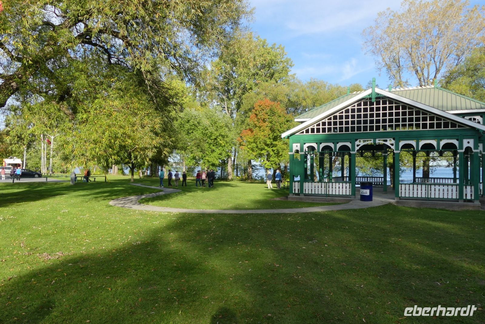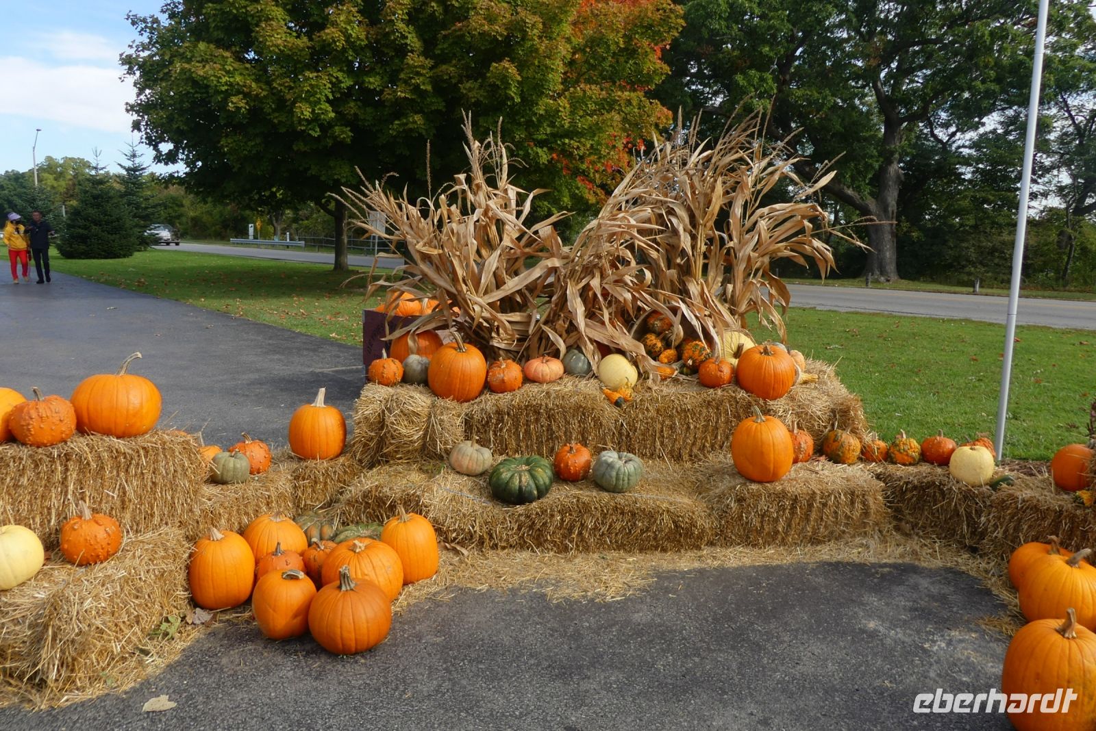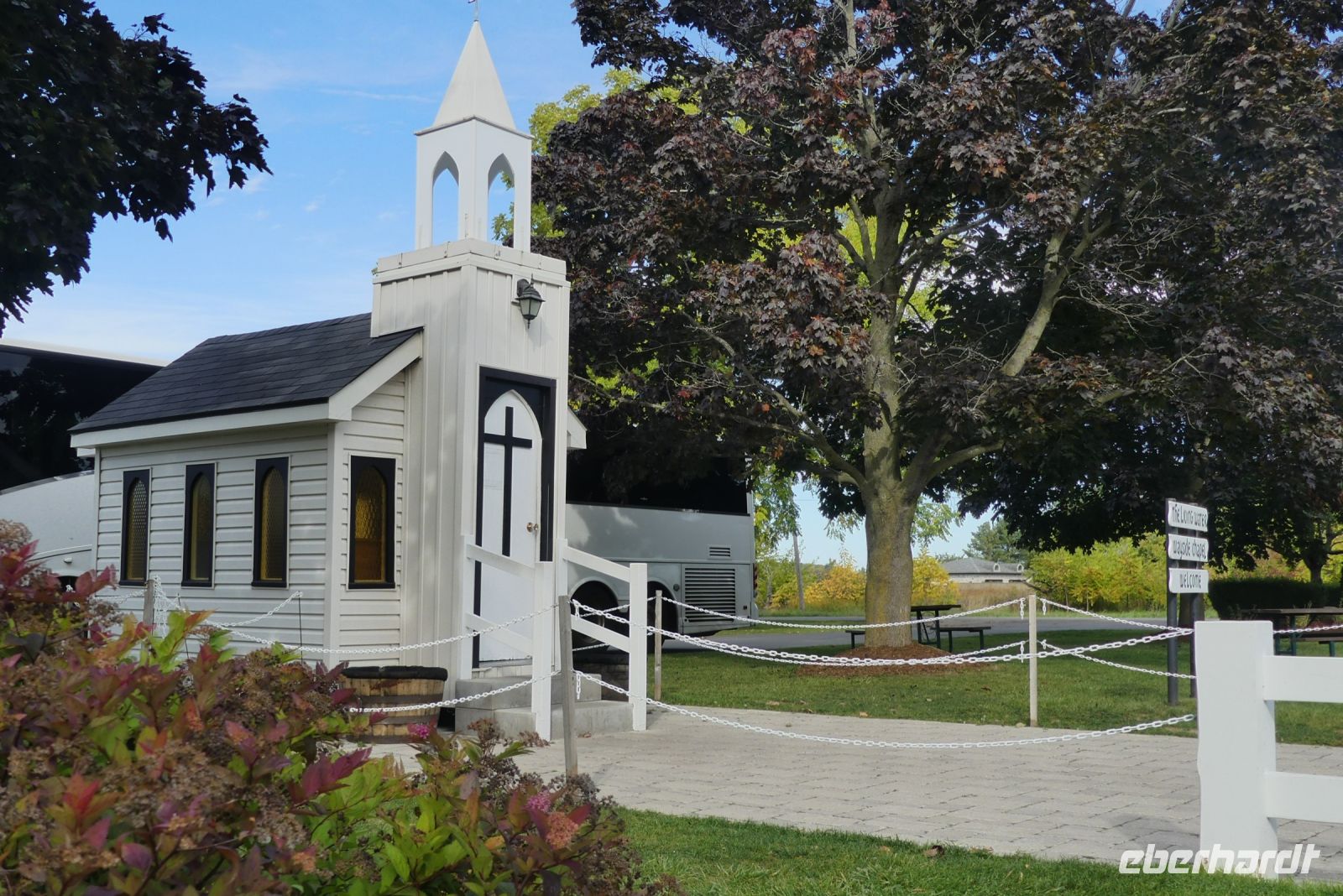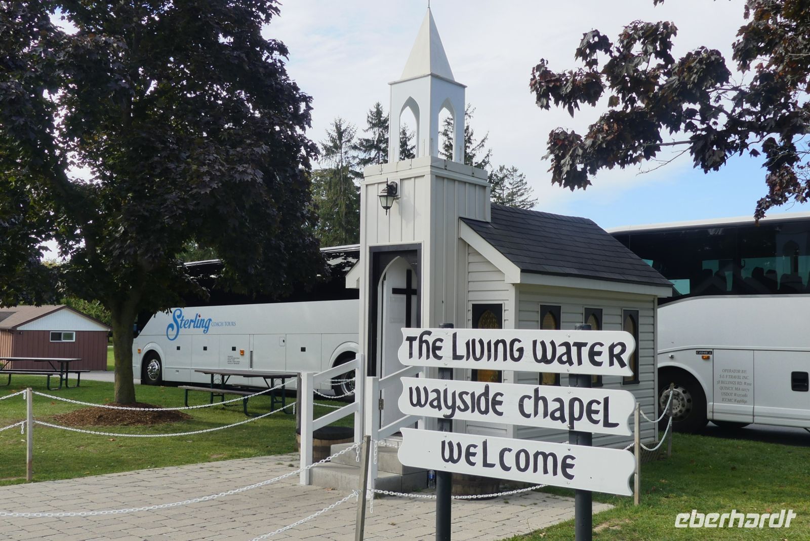 Mit knapp 400 Kilometern wird es heute unsere längste Tagesetappe werden. In Niagara halten wir erstmal am Sobeys Supermarkt. Dann fährt uns Marco entlang des Niagaraflusses. Es ist eine wunderschöne Route. Die Laubfärbung hat begonnen und es ist wieder schönes sonniges Wetter. Es sind Weinanbaugebiete und tolle Villen zu sehen. Wir halten am sogenannten Whirlpool. Das ist eine Stelle, an welcher der Niagarafluss seine Richtung abrupt ändert und dabei gefährliche Strudel entstehen. Etwas später folgt ein Stopp an der kleinsten Kirche der Welt mit dem Namen „The living water way side chapel“. Hier befindet sich auch ein originelles Geschäft mit regionalen Produkten. Eine Augenweite sind vor allem die vielen Kürbisse. Gleich darauf kommen wir in das schmucke Städtchen Niagara on the Lake. Wer hier ein Häuschen besitzt, kann sich glücklich schätzen. Alles macht einen sehr gepflegten Eindruck und die Ortsstraße wird von schönen Blumenrabatten gesäumt.