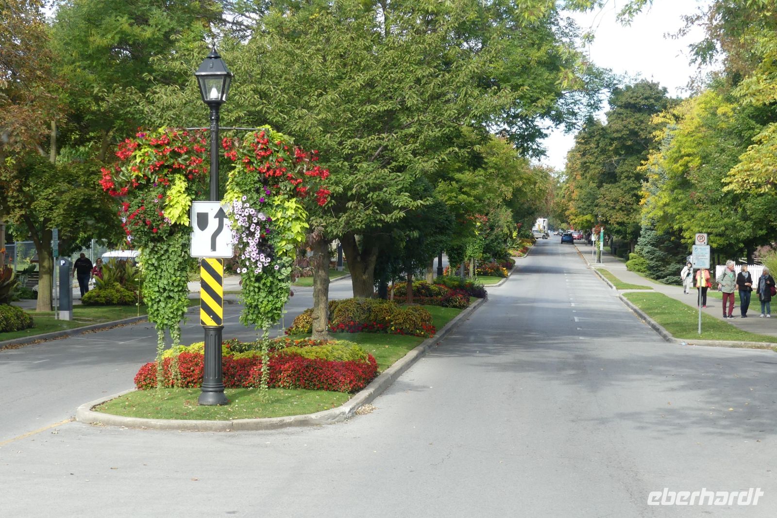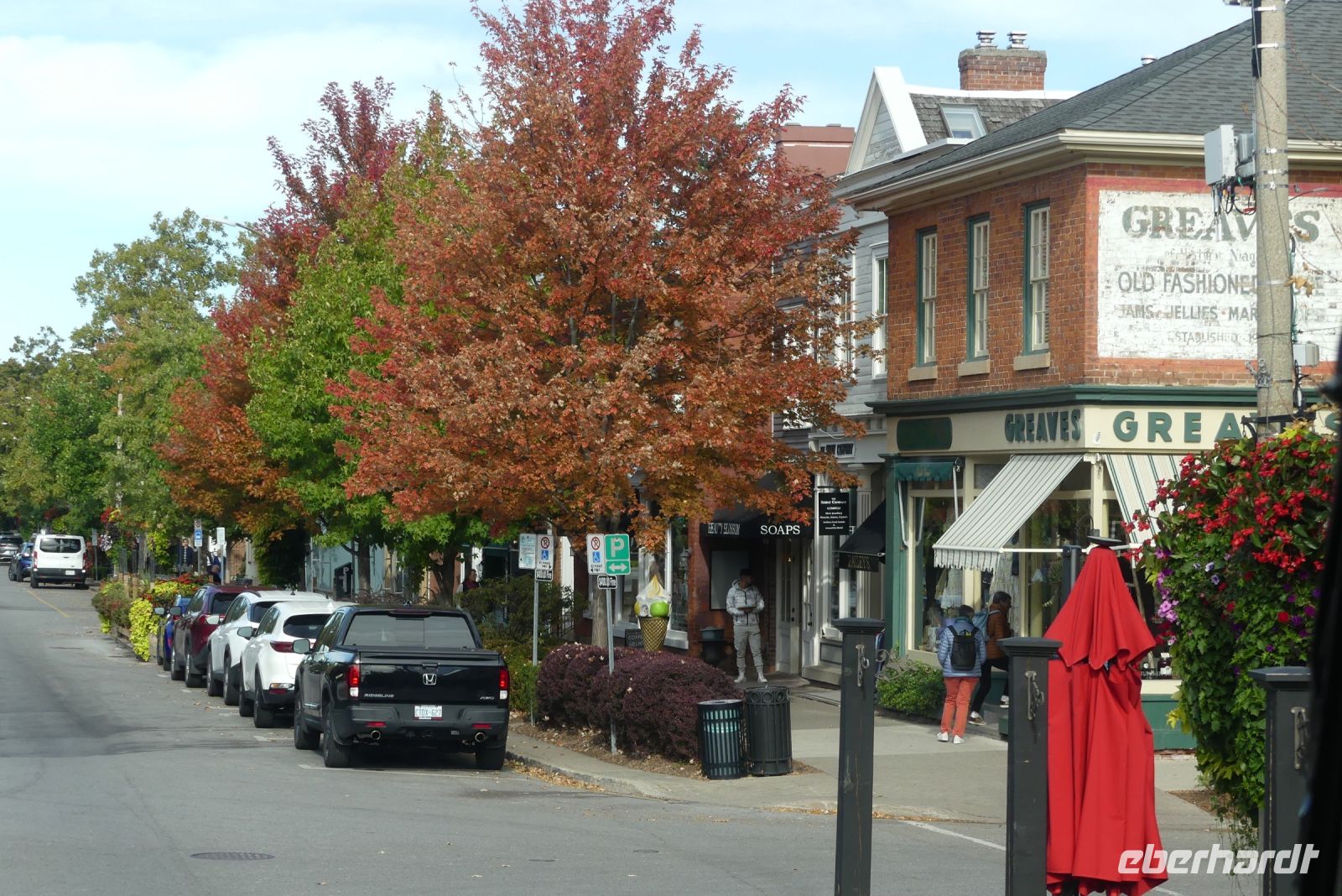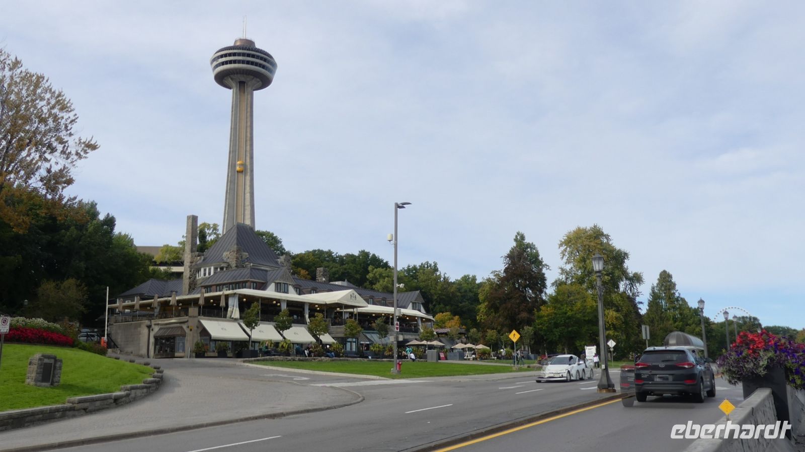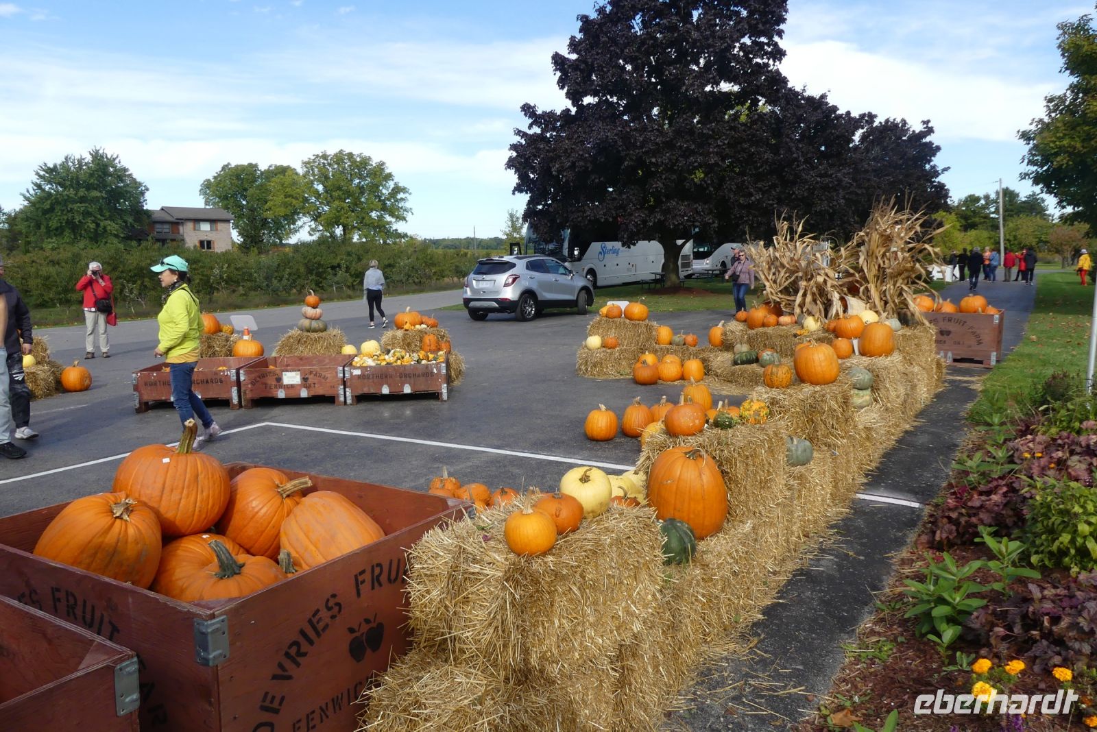 Mit knapp 400 Kilometern wird es heute unsere längste Tagesetappe werden. In Niagara halten wir erstmal am Sobeys Supermarkt. Dann fährt uns Marco entlang des Niagaraflusses. Es ist eine wunderschöne Route. Die Laubfärbung hat begonnen und es ist wieder schönes sonniges Wetter. Es sind Weinanbaugebiete und tolle Villen zu sehen. Wir halten am sogenannten Whirlpool. Das ist eine Stelle, an welcher der Niagarafluss seine Richtung abrupt ändert und dabei gefährliche Strudel entstehen. Etwas später folgt ein Stopp an der kleinsten Kirche der Welt mit dem Namen „The living water way side chapel“. Hier befindet sich auch ein originelles Geschäft mit regionalen Produkten. Eine Augenweite sind vor allem die vielen Kürbisse. Gleich darauf kommen wir in das schmucke Städtchen Niagara on the Lake. Wer hier ein Häuschen besitzt, kann sich glücklich schätzen. Alles macht einen sehr gepflegten Eindruck und die Ortsstraße wird von schönen Blumenrabatten gesäumt.