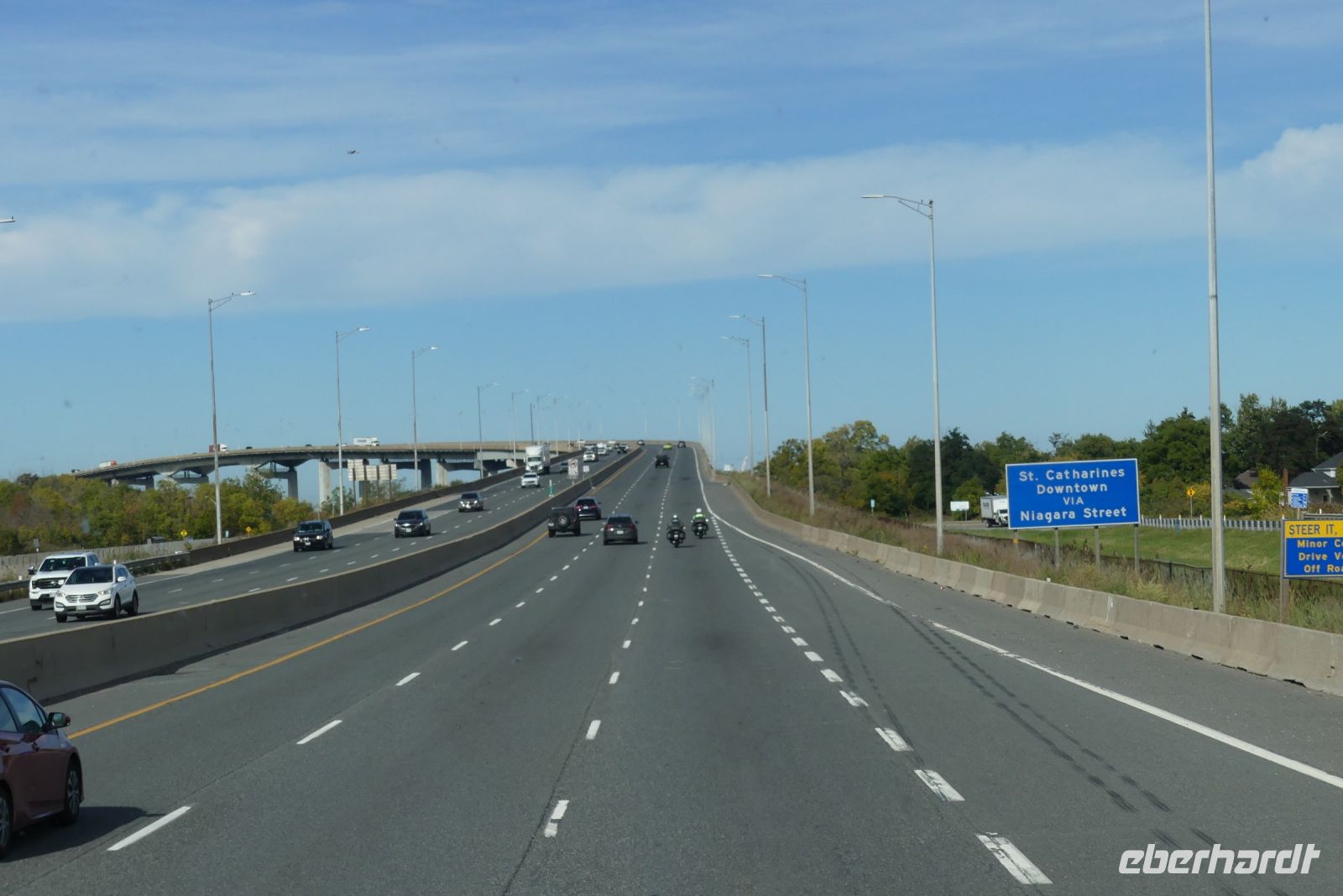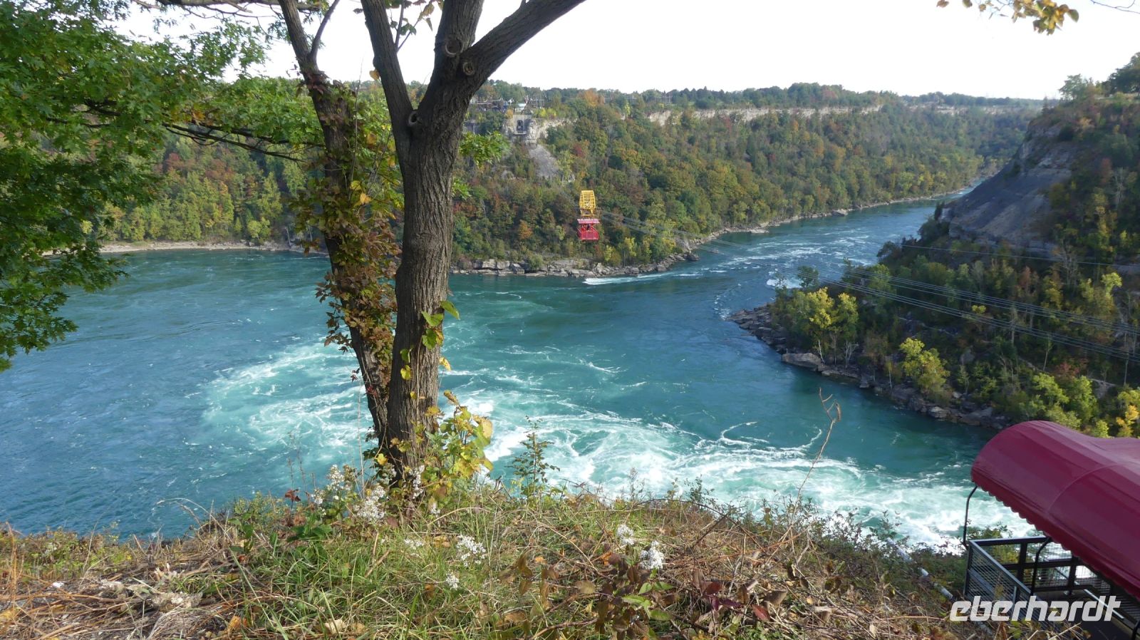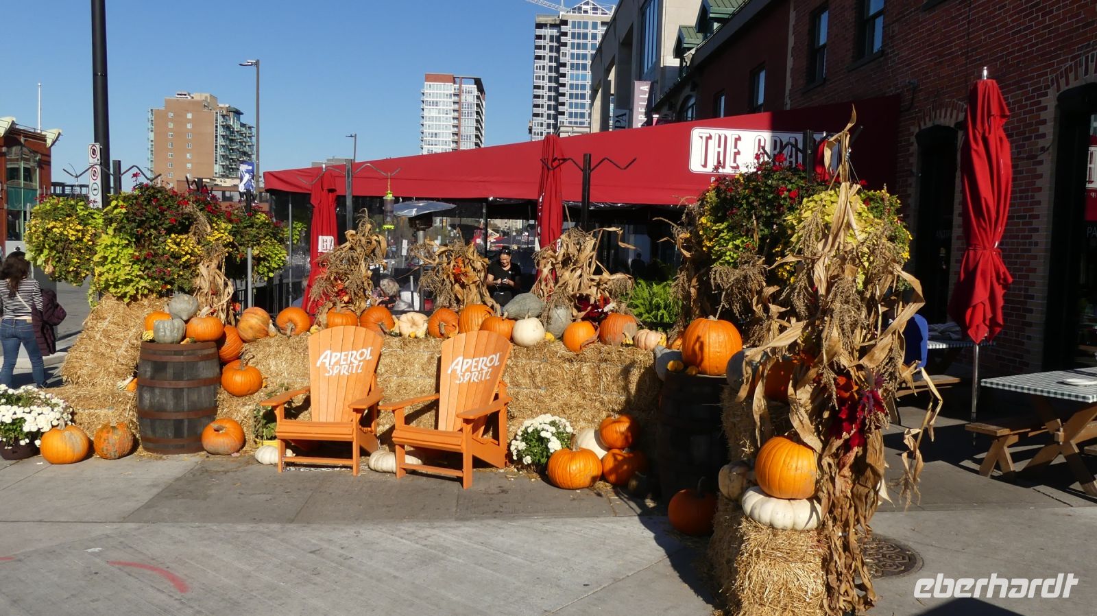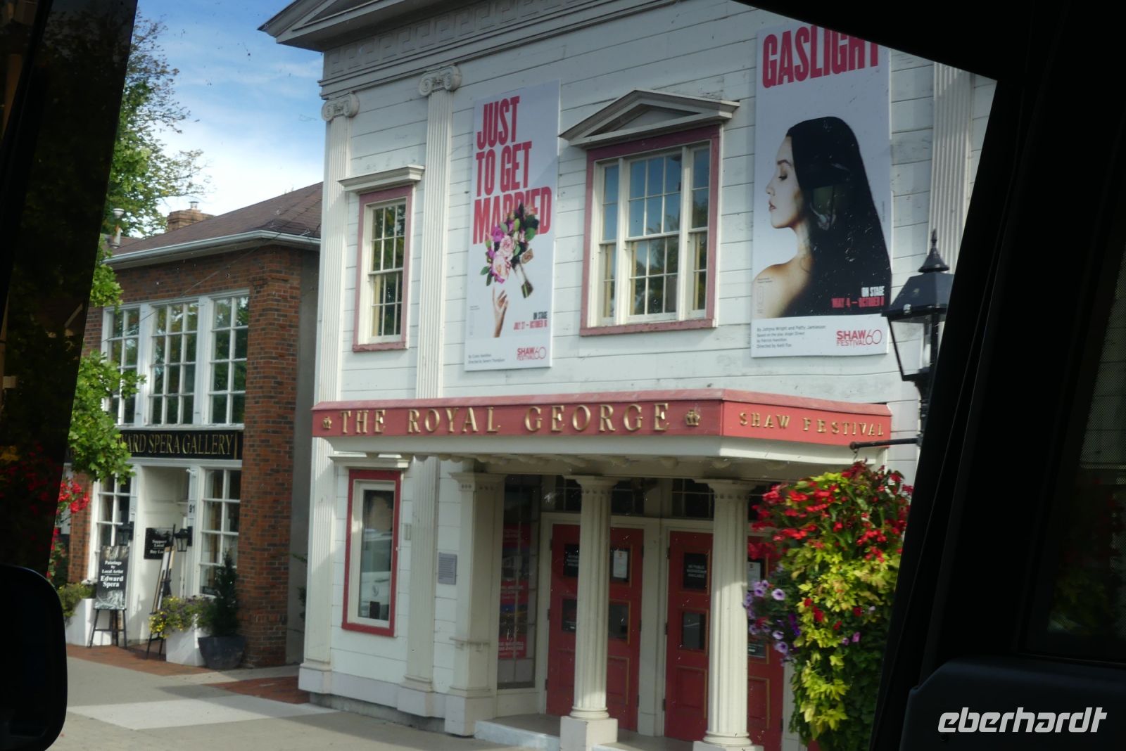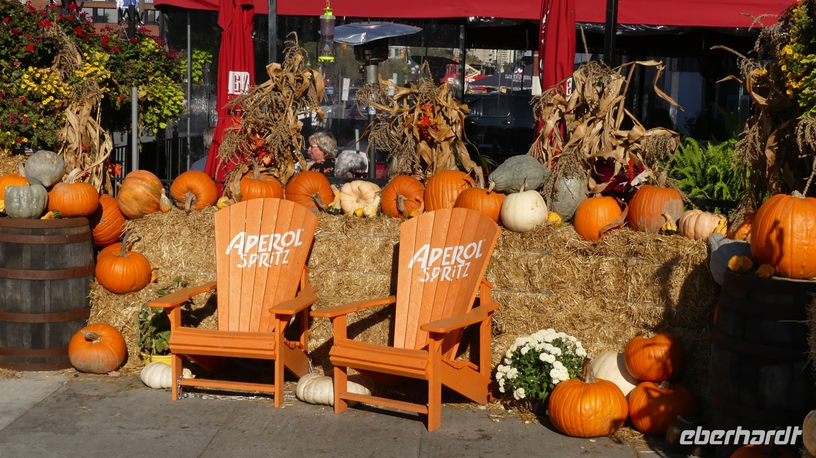 Mit knapp 400 Kilometern wird es heute unsere längste Tagesetappe werden. In Niagara halten wir erstmal am Sobeys Supermarkt. Dann fährt uns Marco entlang des Niagaraflusses. Es ist eine wunderschöne Route. Die Laubfärbung hat begonnen und es ist wieder schönes sonniges Wetter. Es sind Weinanbaugebiete und tolle Villen zu sehen. Wir halten am sogenannten Whirlpool. Das ist eine Stelle, an welcher der Niagarafluss seine Richtung abrupt ändert und dabei gefährliche Strudel entstehen. Etwas später folgt ein Stopp an der kleinsten Kirche der Welt mit dem Namen „The living water way side chapel“. Hier befindet sich auch ein originelles Geschäft mit regionalen Produkten. Eine Augenweite sind vor allem die vielen Kürbisse. Gleich darauf kommen wir in das schmucke Städtchen Niagara on the Lake. Wer hier ein Häuschen besitzt, kann sich glücklich schätzen. Alles macht einen sehr gepflegten Eindruck und die Ortsstraße wird von schönen Blumenrabatten gesäumt.