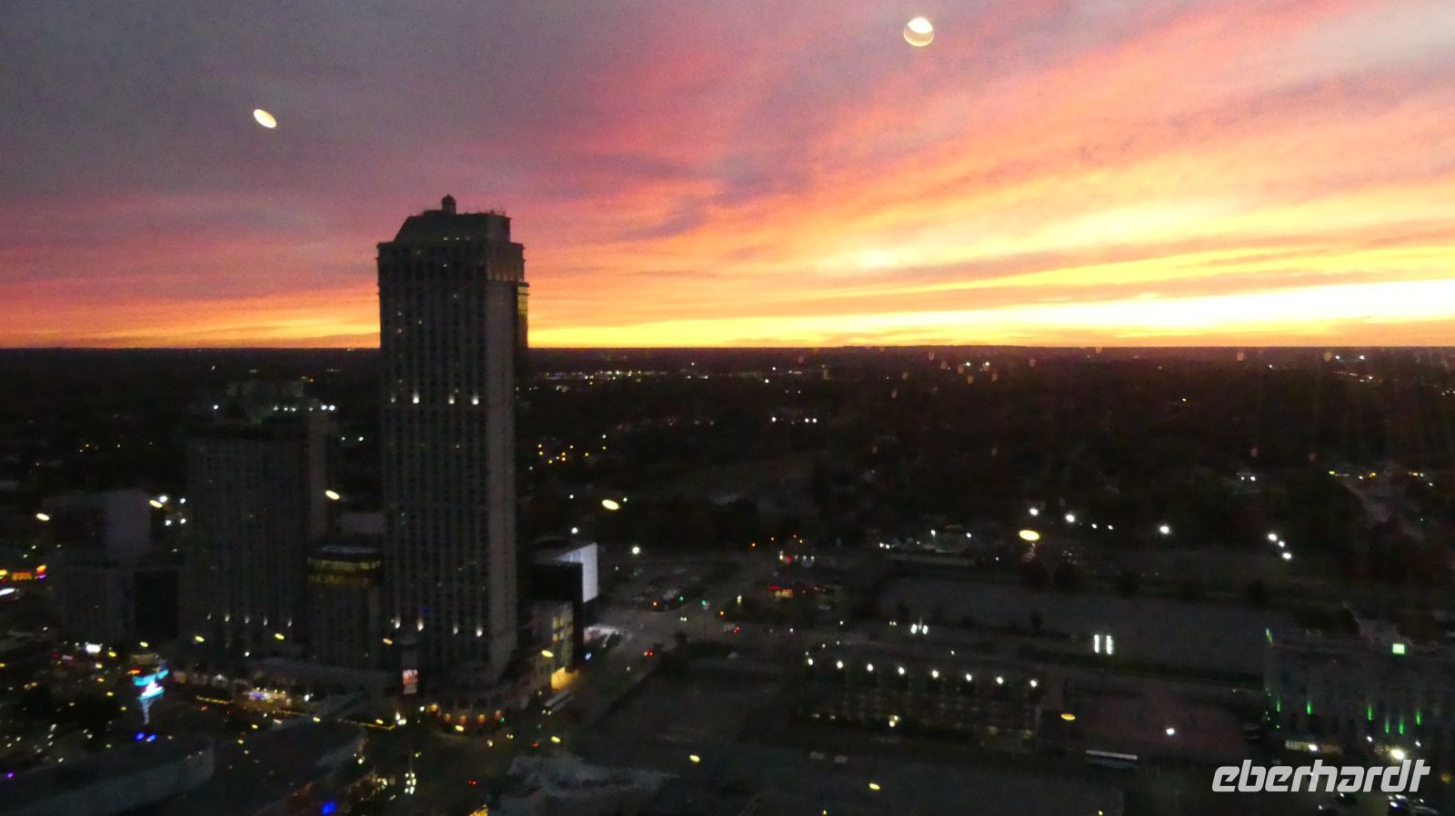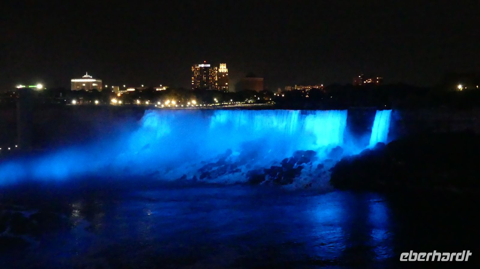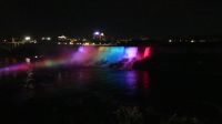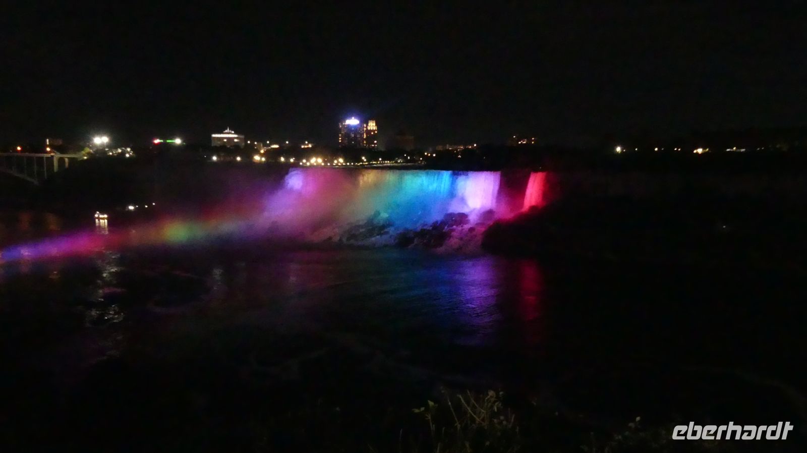 Nach etwas Zeit im Hotel laufen wir am Abend zum Skylon Tower. Im Drehrestaurants des Turmes genießen wir unser 3-Gang-Abendessen bei herrlicher Aussicht. Wir erleben einen fantastischen Sonnenuntergang mit tollem Abendrot und sehen die farbig beleuchteten Wasserfälle. Nach dem Essen kommen noch einige mit, um sich die beleuchteten Fälle aus der Nähe anzusehen.