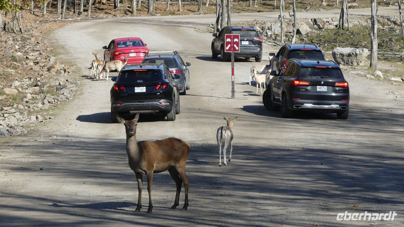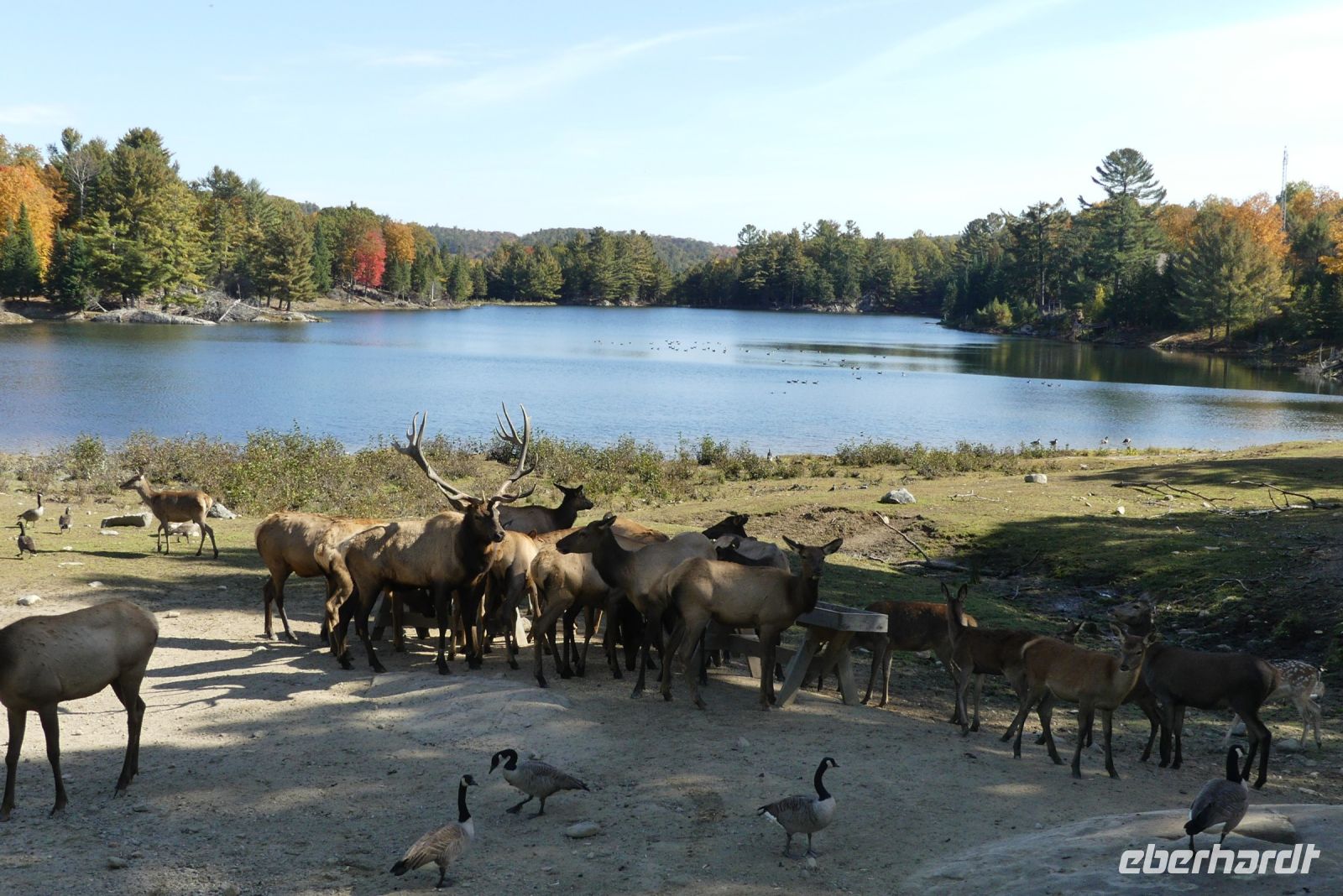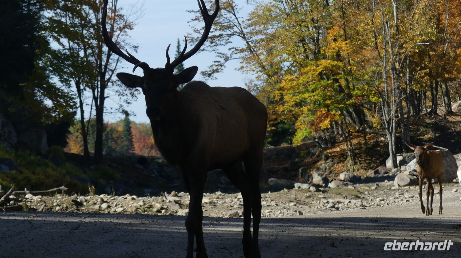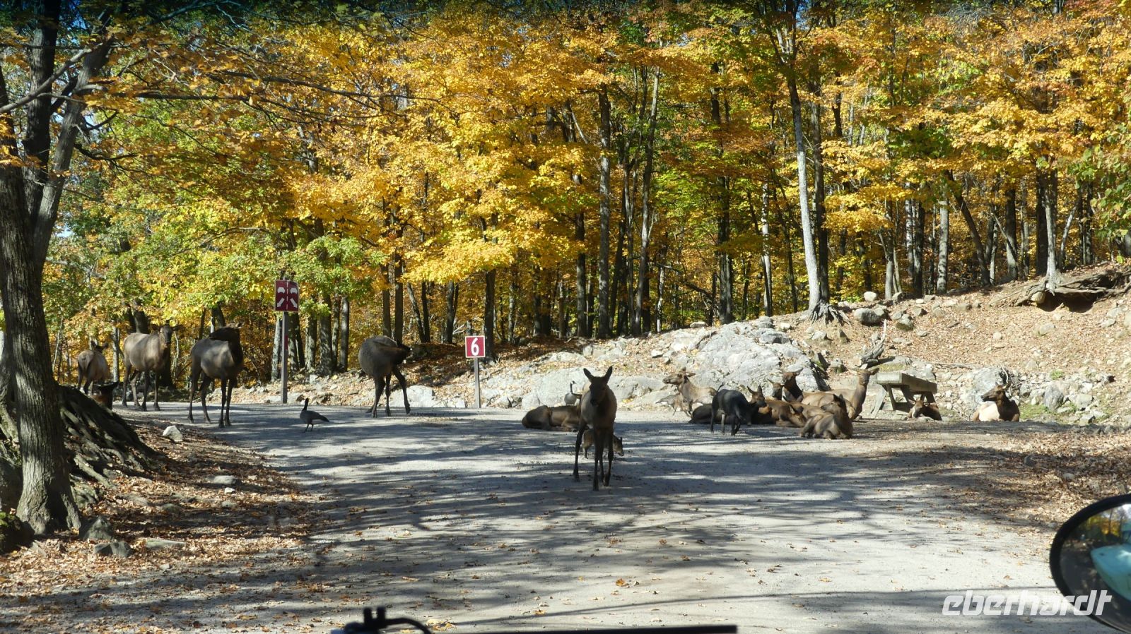 Unser erstes Tagesziel ist der Richtung Montreal gelegene Omega-Wildpark. In diesem Park wurden so ziemlich alle Wildtieren angesiedelt, die ihre Heimat in Kanada haben. Ähnlich wie bei einer Safari begeben wir uns mit einem Fahrzeug auf Entdeckungsreise. Wir sitzen in einem älteren Modell eines Schulbusses. Durch die offenen Fenster können wir fotografieren und Tiere mit Möhren füttern. Vor allem die Wapitis warten schon auf diesen Imbiss. Sie sind an die Fahrzeuge gewöhnt und nicht scheu. Wapitis ähneln Hirschen und zählen auch zu der Familie der Hirsche. Bei dieser Tour durch eine schöne hügelige Landschaft mit toller Laubfärbung begegnen wir außerdem Wildschweinen, Karibus, Schwarzbären, Polarfüchsen, Wölfen, Bisons u. a. m.
