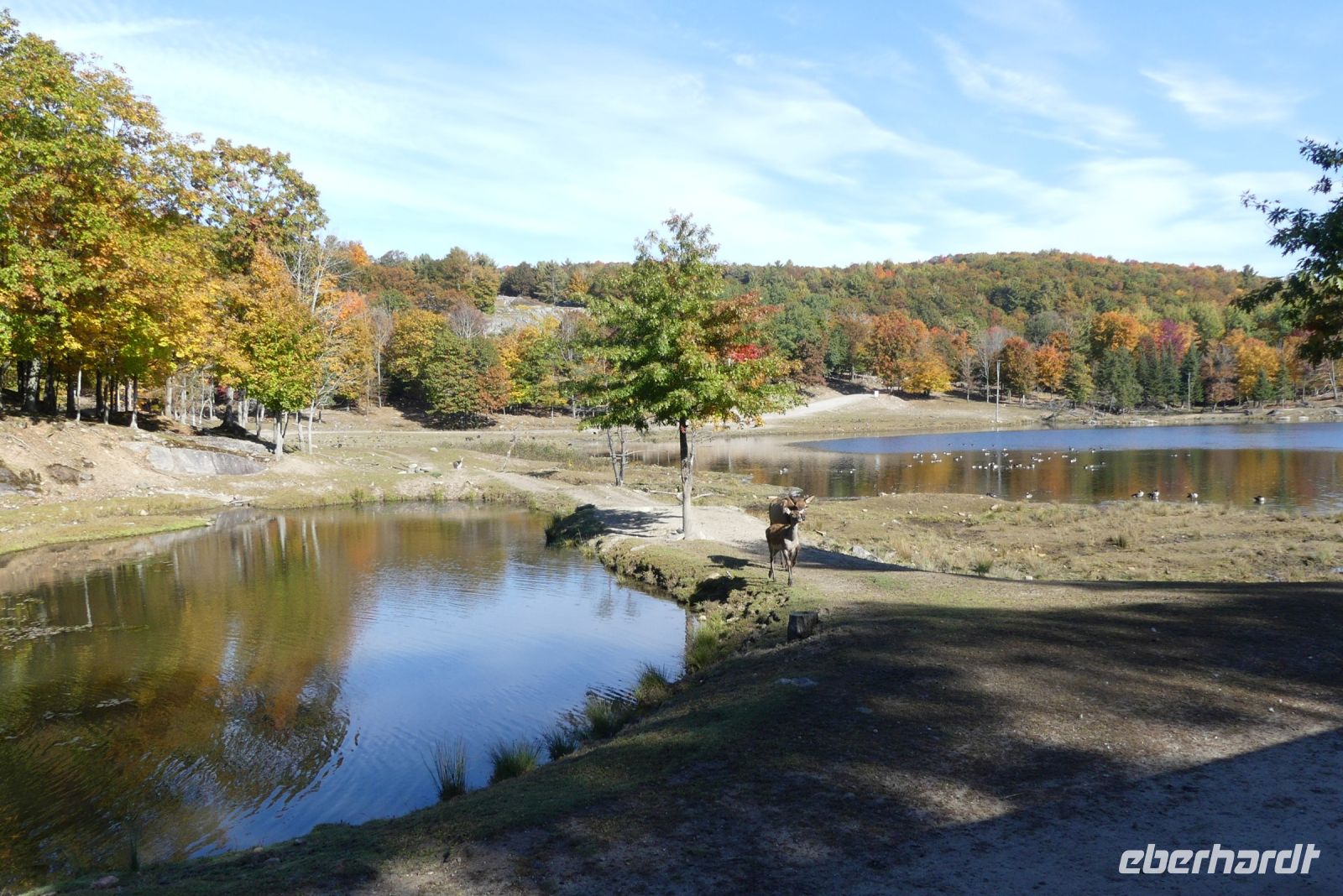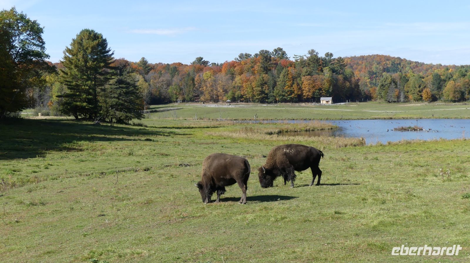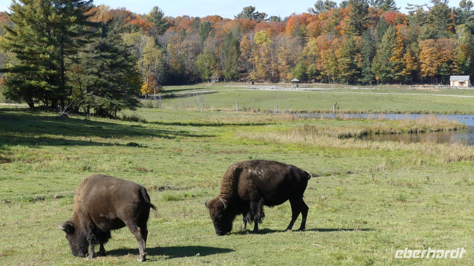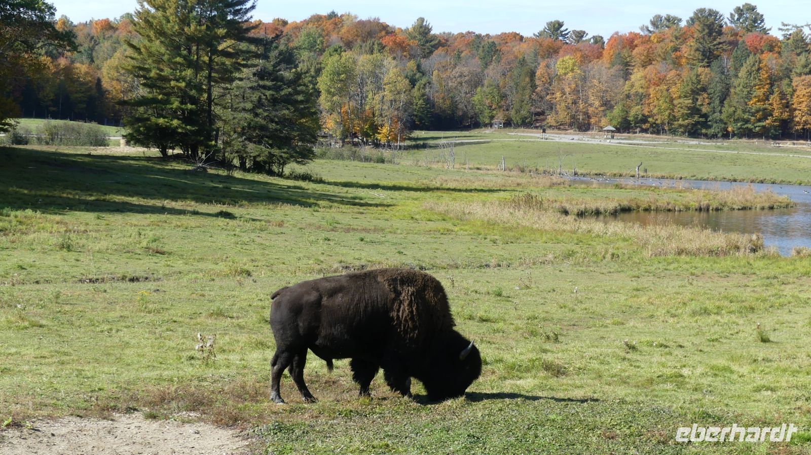 Unser erstes Tagesziel ist der Richtung Montreal gelegene Omega-Wildpark. In diesem Park wurden so ziemlich alle Wildtieren angesiedelt, die ihre Heimat in Kanada haben. Ähnlich wie bei einer Safari begeben wir uns mit einem Fahrzeug auf Entdeckungsreise. Wir sitzen in einem älteren Modell eines Schulbusses. Durch die offenen Fenster können wir fotografieren und Tiere mit Möhren füttern. Vor allem die Wapitis warten schon auf diesen Imbiss. Sie sind an die Fahrzeuge gewöhnt und nicht scheu. Wapitis ähneln Hirschen und zählen auch zu der Familie der Hirsche. Bei dieser Tour durch eine schöne hügelige Landschaft mit toller Laubfärbung begegnen wir außerdem Wildschweinen, Karibus, Schwarzbären, Polarfüchsen, Wölfen, Bisons u. a. m.