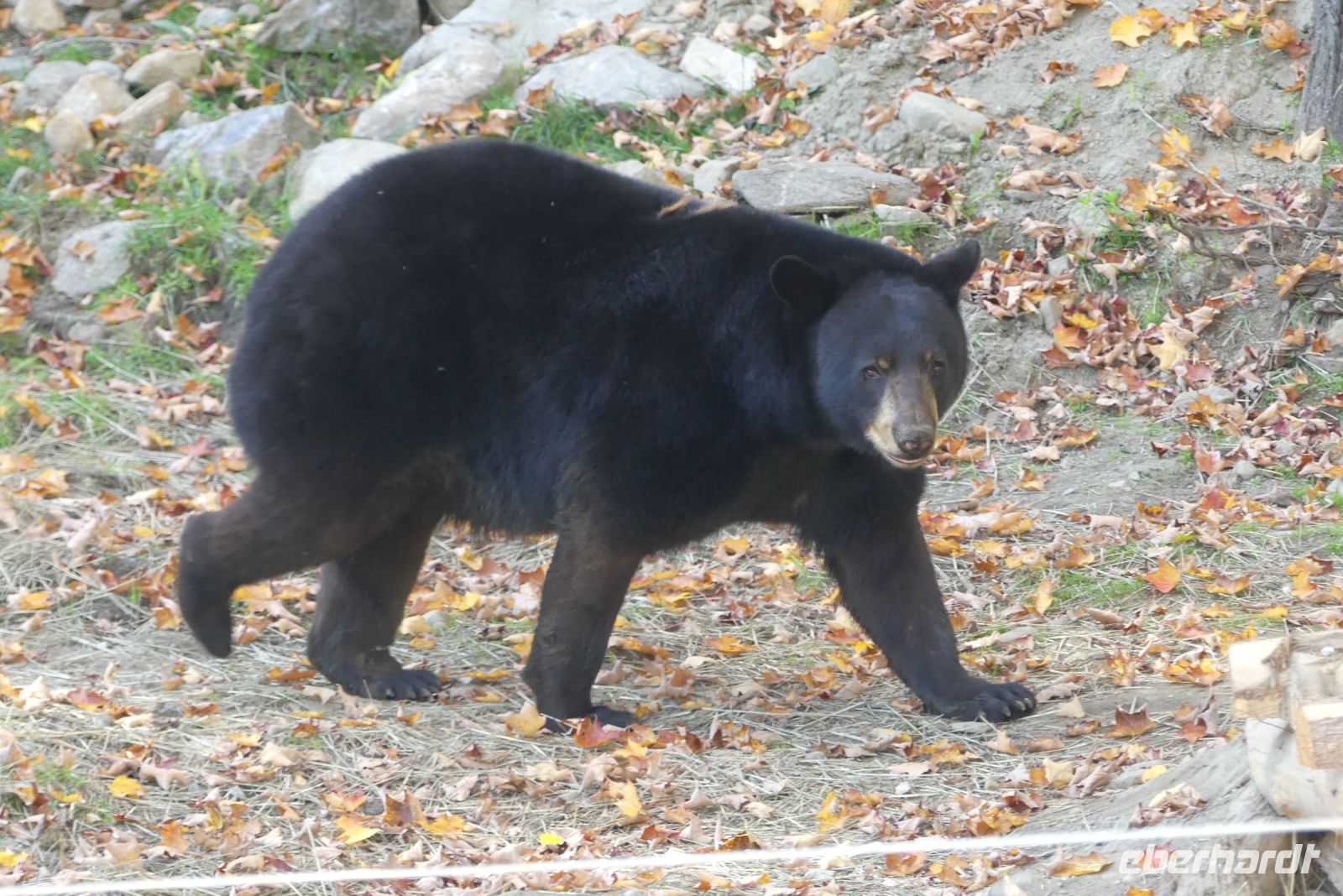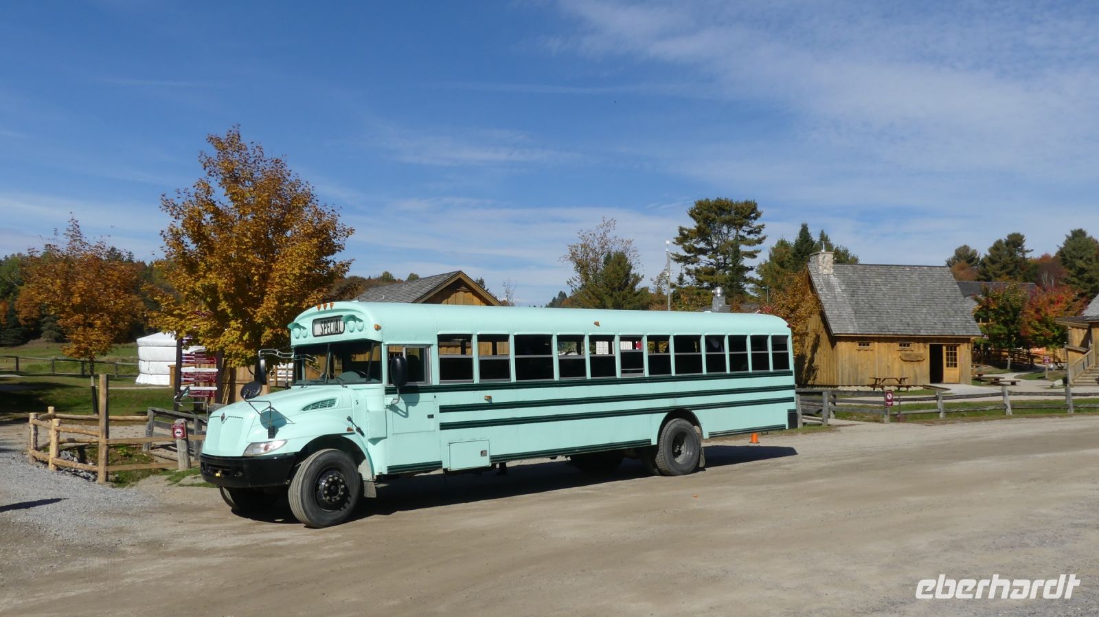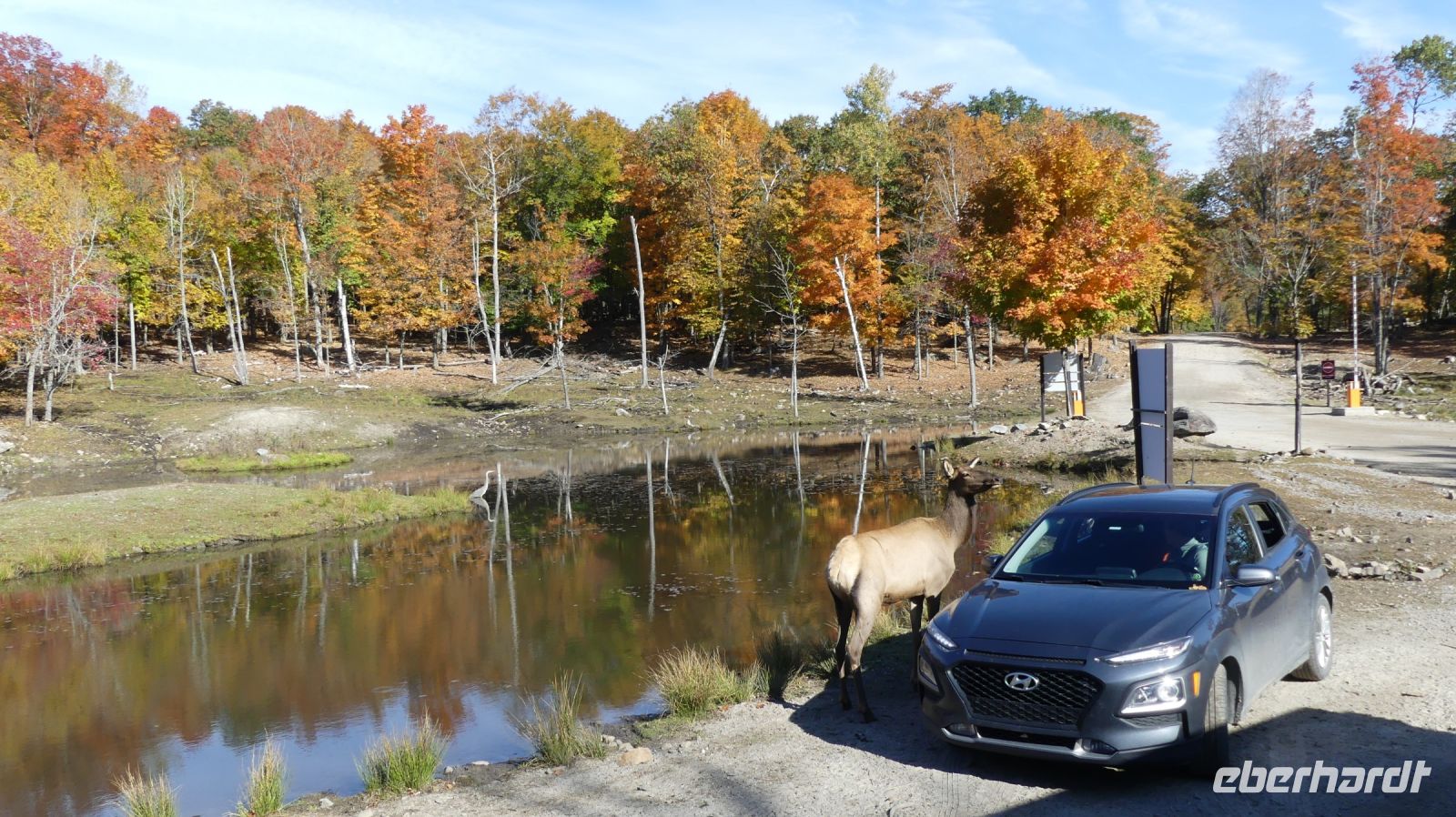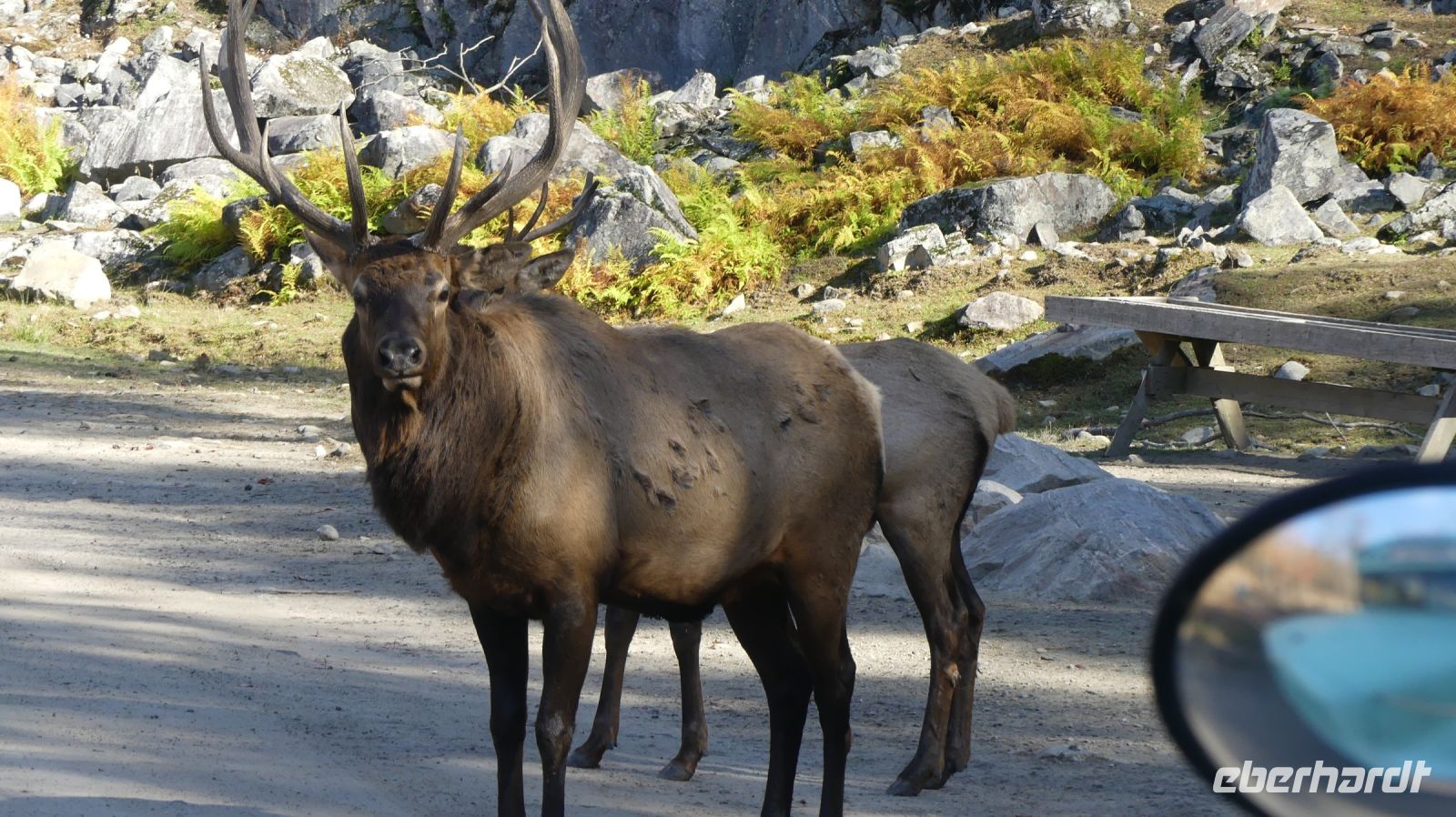 Unser erstes Tagesziel ist der Richtung Montreal gelegene Omega-Wildpark. In diesem Park wurden so ziemlich alle Wildtieren angesiedelt, die ihre Heimat in Kanada haben. Ähnlich wie bei einer Safari begeben wir uns mit einem Fahrzeug auf Entdeckungsreise. Wir sitzen in einem älteren Modell eines Schulbusses. Durch die offenen Fenster können wir fotografieren und Tiere mit Möhren füttern. Vor allem die Wapitis warten schon auf diesen Imbiss. Sie sind an die Fahrzeuge gewöhnt und nicht scheu. Wapitis ähneln Hirschen und zählen auch zu der Familie der Hirsche. Bei dieser Tour durch eine schöne hügelige Landschaft mit toller Laubfärbung begegnen wir außerdem Wildschweinen, Karibus, Schwarzbären, Polarfüchsen, Wölfen, Bisons u. a. m.