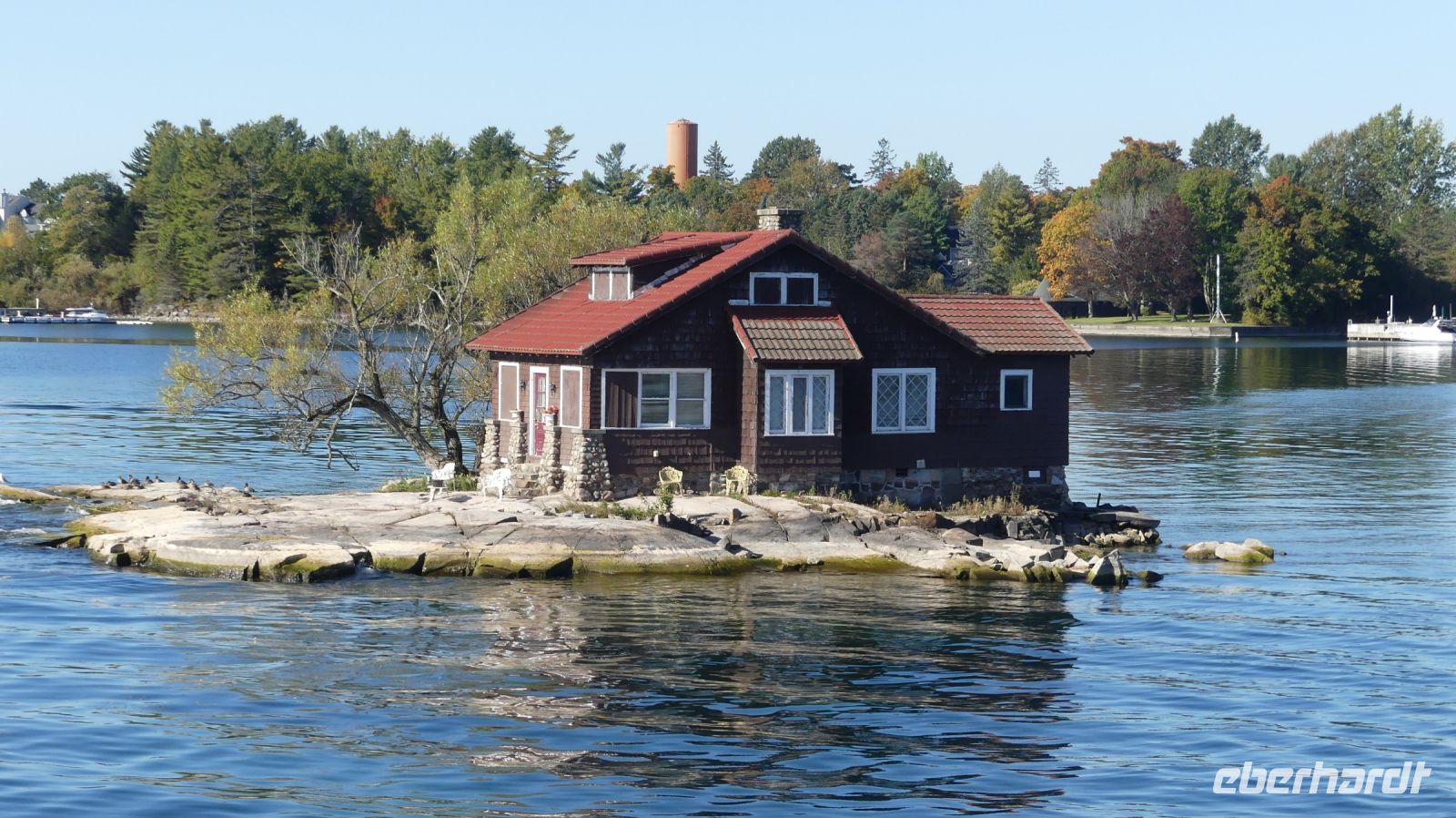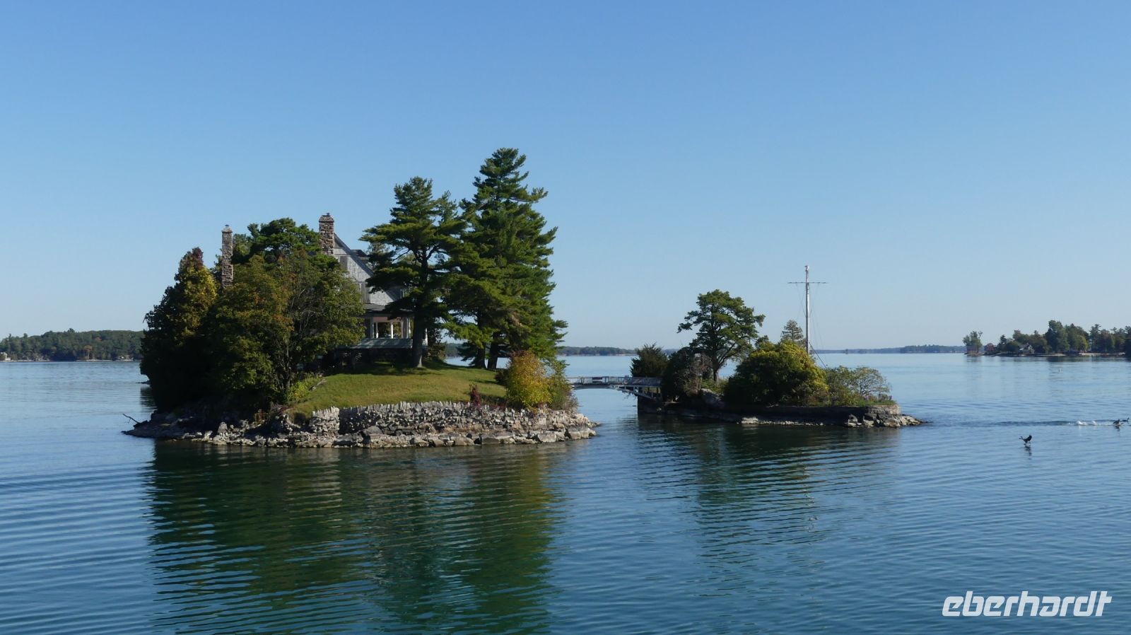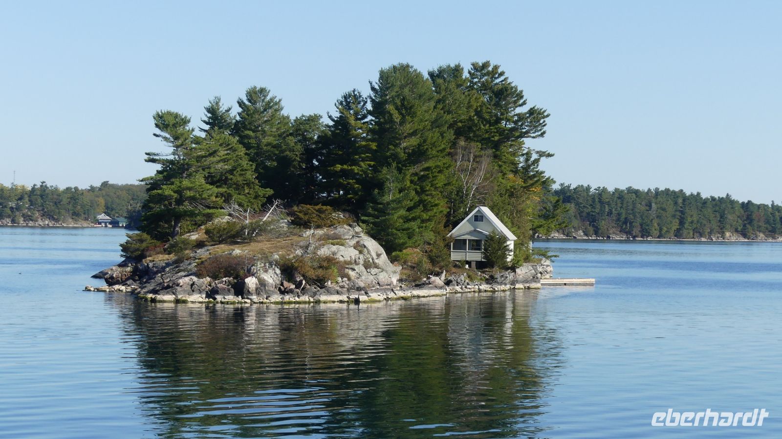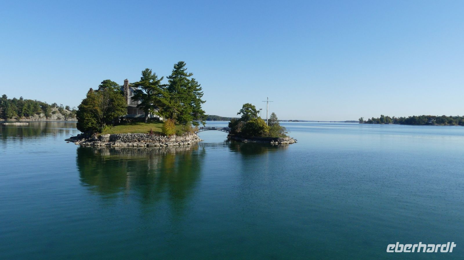 Auch heute haben wir Glück mit dem Wetter. Sonnenschein und blauer Himmel bieten optimale Bedingungen für unsere Bootsfahrt durch die Inselwelt im Ausflussgebiet des St.-Lorenz-Stromes aus dem Ontariosee. Von der Ortschaft Rockport startet unser Ausflugsschiff ins Land der tausend Inseln. Genau genommen sind es nicht tausend, sondern 1.864 Inseln. Für ihre Entstehung hat der weiße Mann wissenschaftliche Erklärungen, aber mir gefällt die Geschichte der Ureinwohner besser, die besagt, dass Blütenblätter vom Himmel fielen und diese Region in einen Garten Gottes verwandelten. Als Insel wird Land anerkannt, dass mindesten 2x2 Meter hat und ein Baum darauf steht.