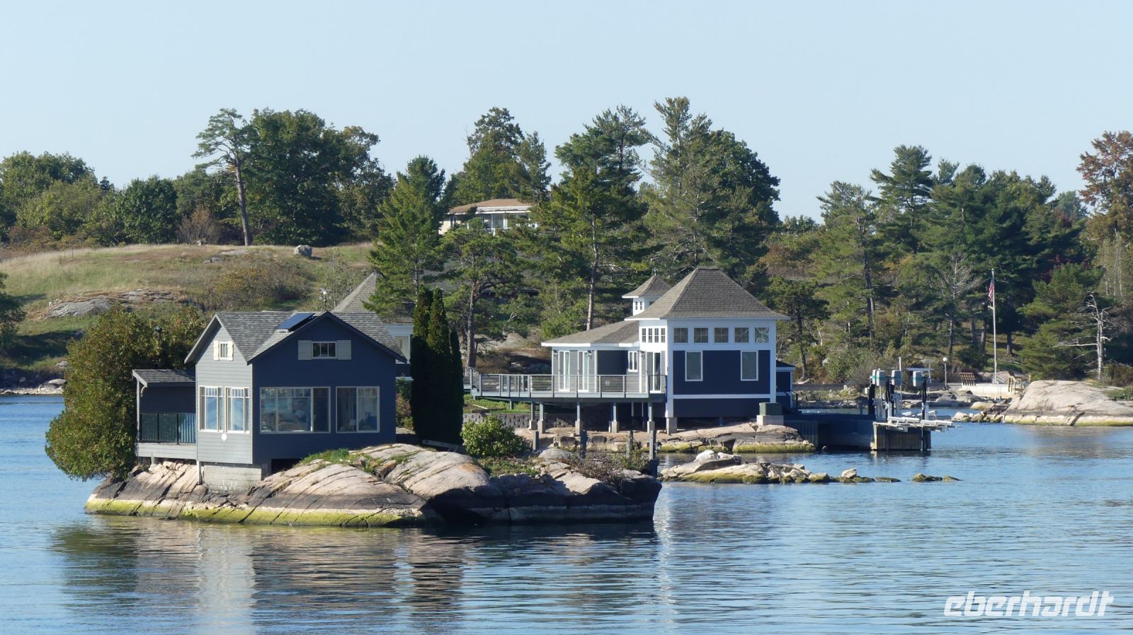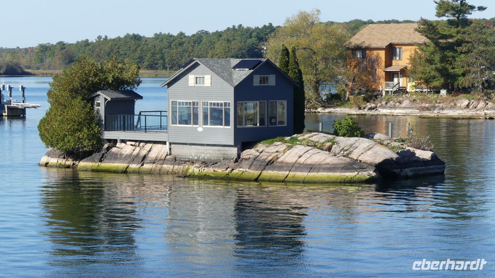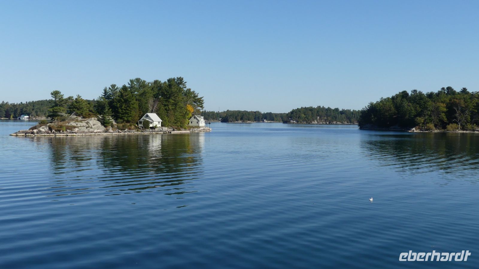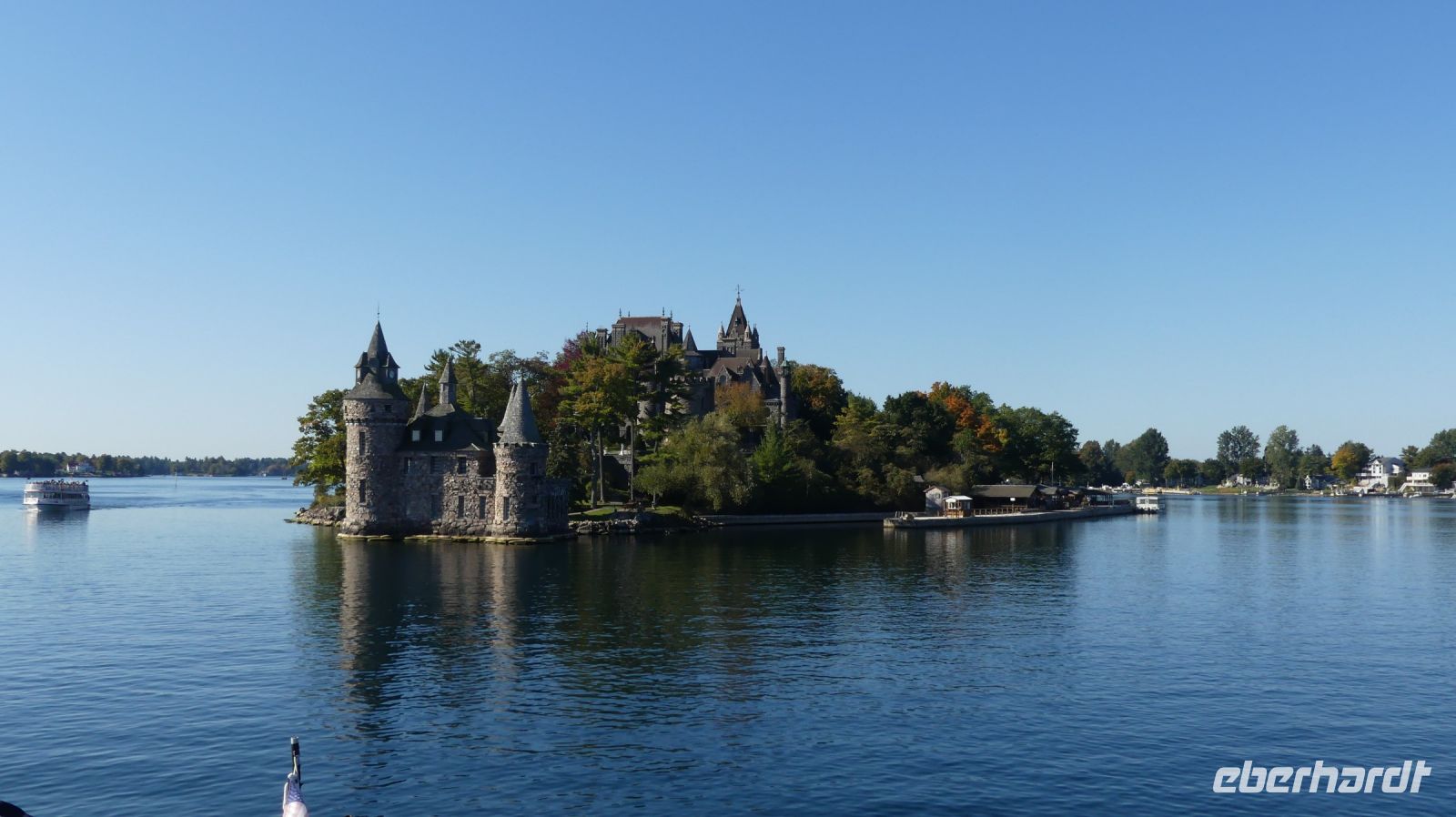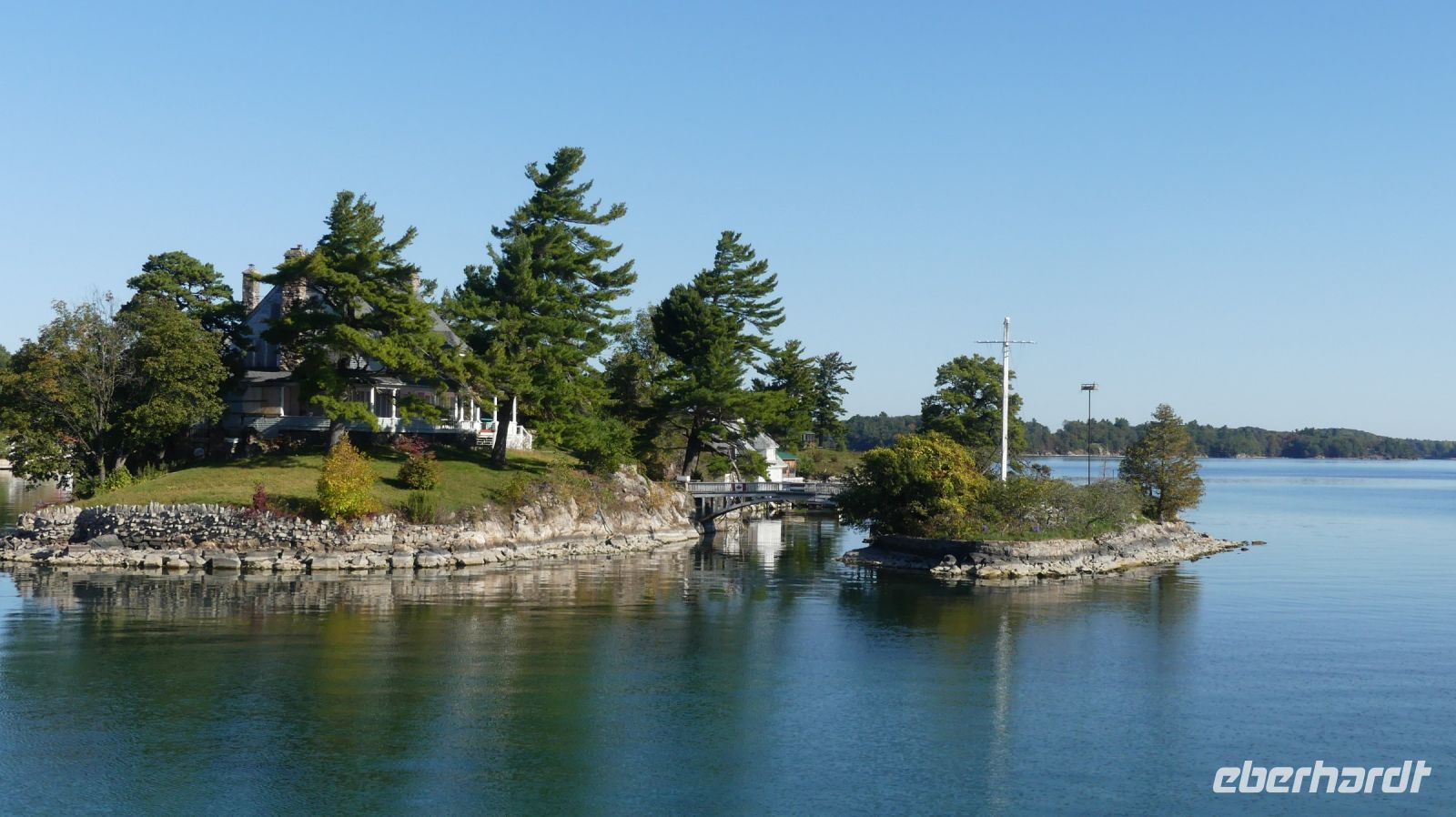 Auch heute haben wir Glück mit dem Wetter. Sonnenschein und blauer Himmel bieten optimale Bedingungen für unsere Bootsfahrt durch die Inselwelt im Ausflussgebiet des St.-Lorenz-Stromes aus dem Ontariosee. Von der Ortschaft Rockport startet unser Ausflugsschiff ins Land der tausend Inseln. Genau genommen sind es nicht tausend, sondern 1.864 Inseln. Für ihre Entstehung hat der weiße Mann wissenschaftliche Erklärungen, aber mir gefällt die Geschichte der Ureinwohner besser, die besagt, dass Blütenblätter vom Himmel fielen und diese Region in einen Garten Gottes verwandelten. Als Insel wird Land anerkannt, dass mindesten 2x2 Meter hat und ein Baum darauf steht.