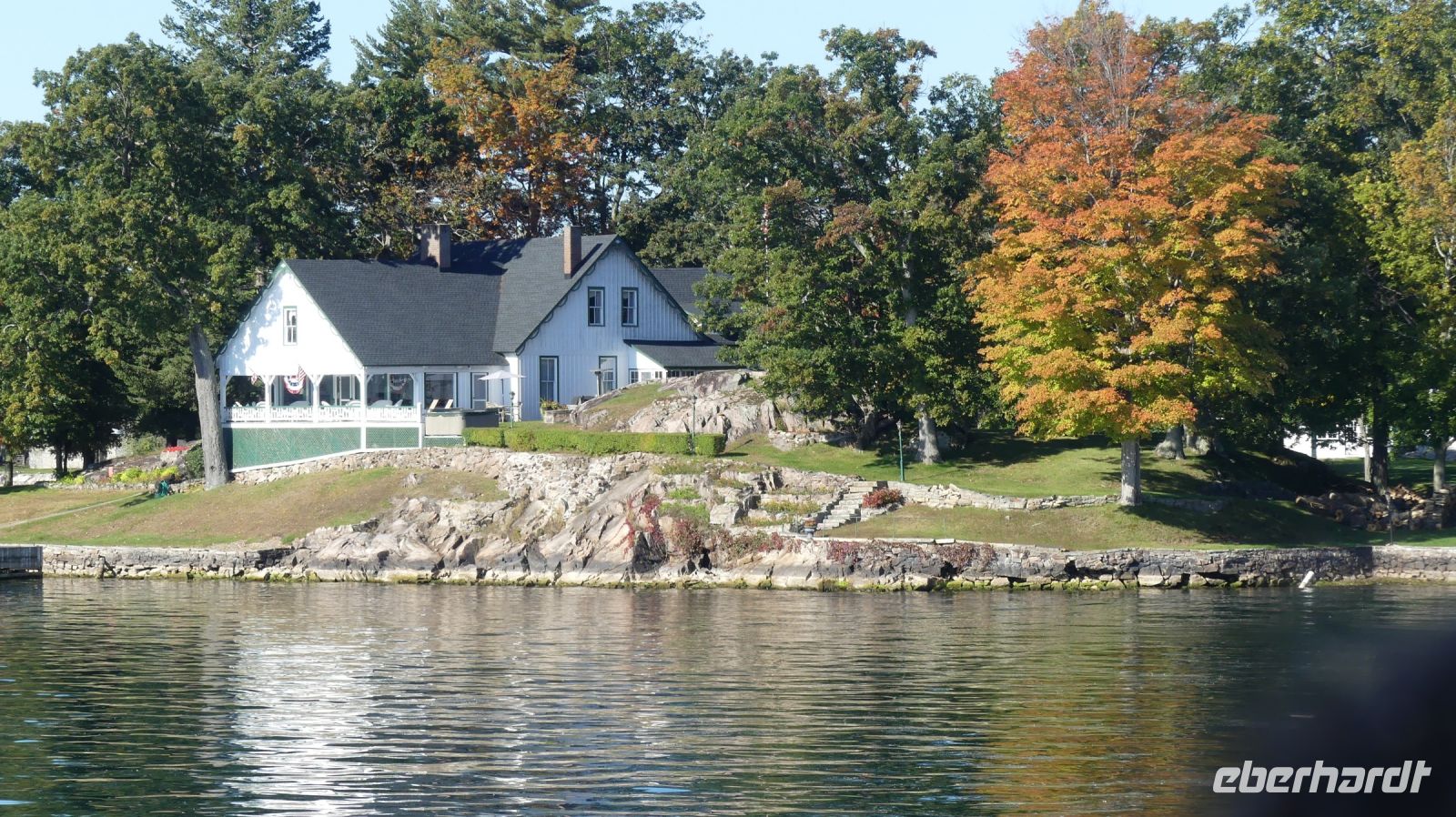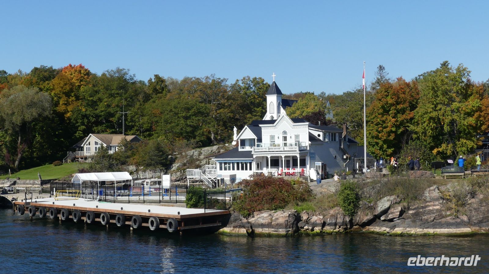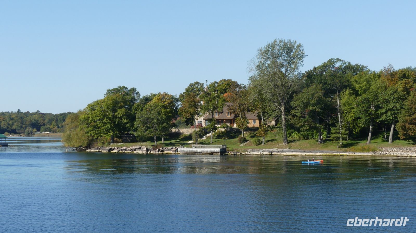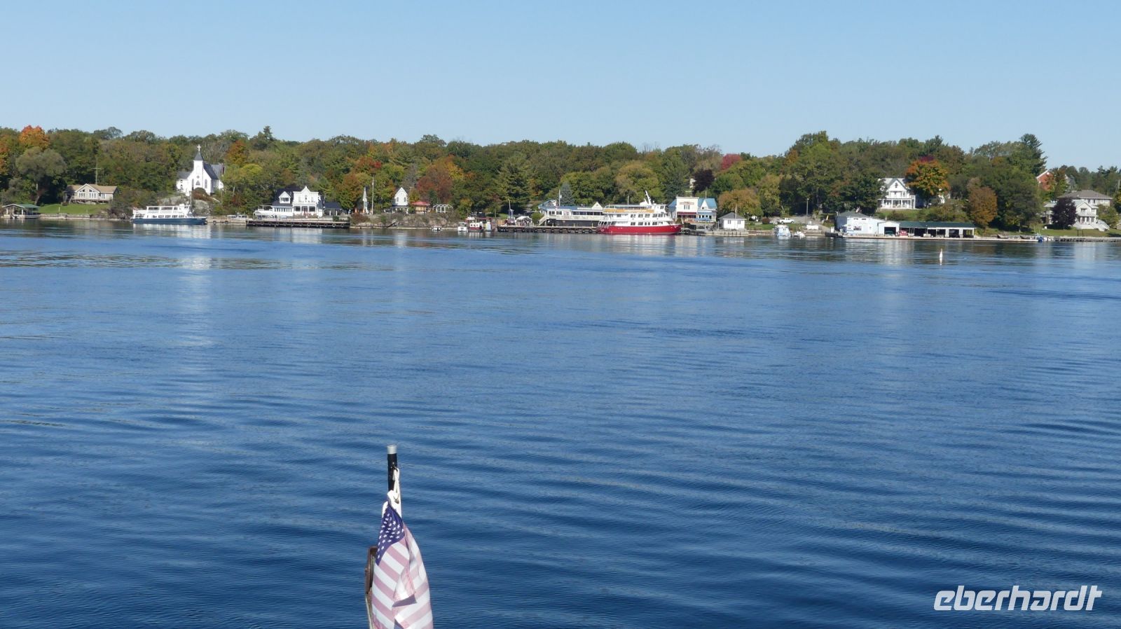Auch heute haben wir Glück mit dem Wetter. Sonnenschein und blauer Himmel bieten optimale Bedingungen für unsere Bootsfahrt durch die Inselwelt im Ausflussgebiet des St.-Lorenz-Stromes aus dem Ontariosee. Von der Ortschaft Rockport startet unser Ausflugsschiff ins Land der tausend Inseln. Genau genommen sind es nicht tausend, sondern 1.864 Inseln. Für ihre Entstehung hat der weiße Mann wissenschaftliche Erklärungen, aber mir gefällt die Geschichte der Ureinwohner besser, die besagt, dass Blütenblätter vom Himmel fielen und diese Region in einen Garten Gottes verwandelten. Als Insel wird Land anerkannt, dass mindesten 2x2 Meter hat und ein Baum darauf steht.