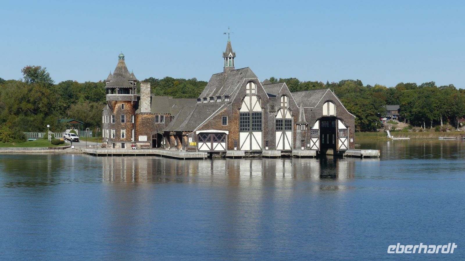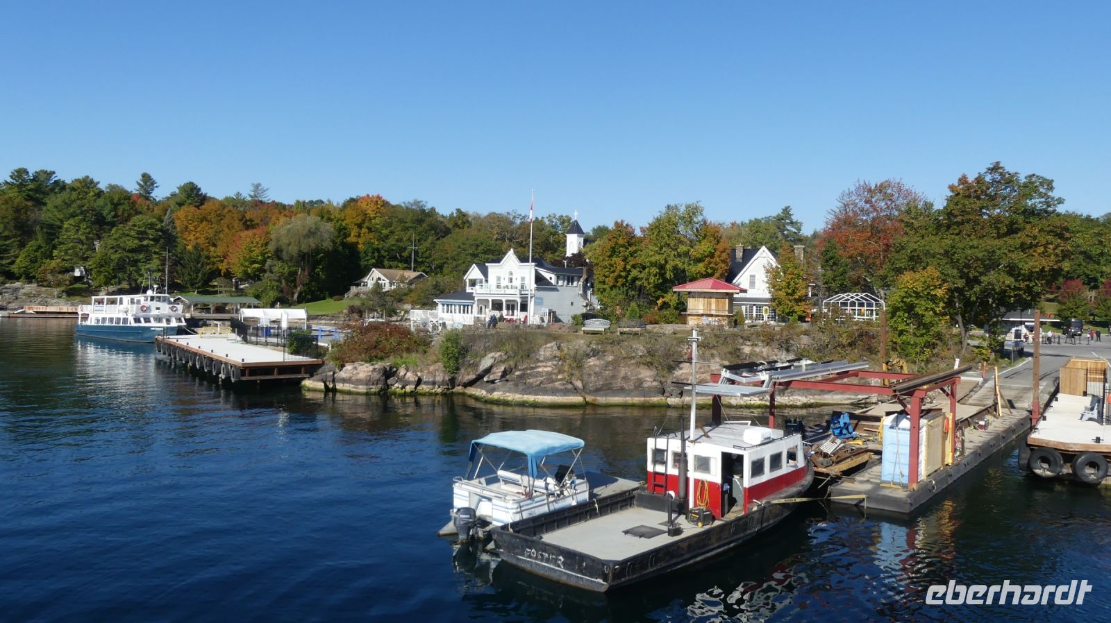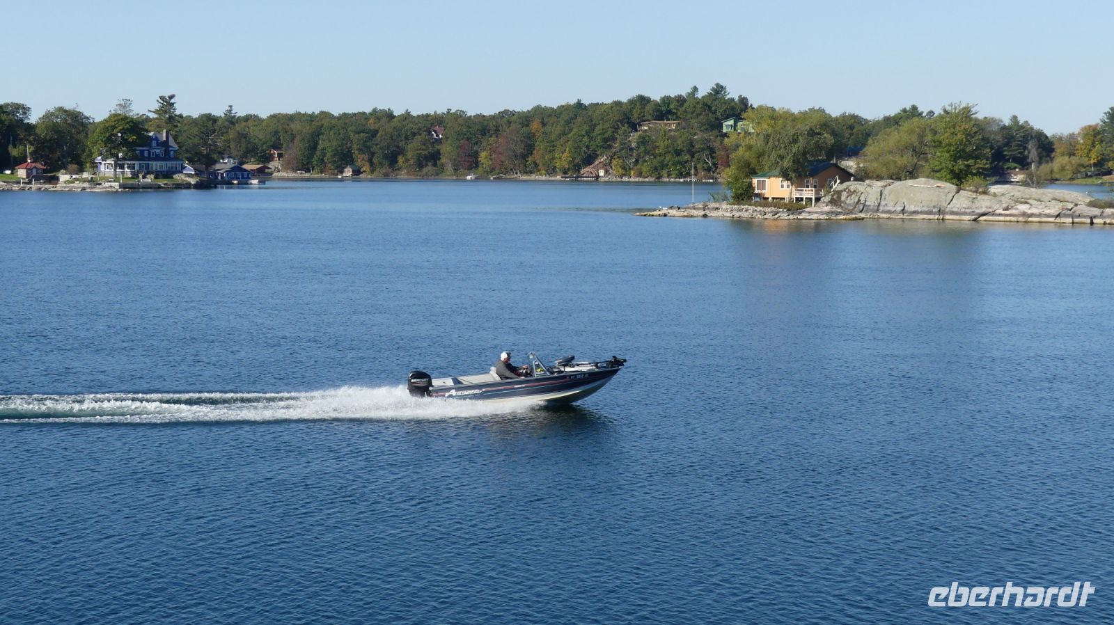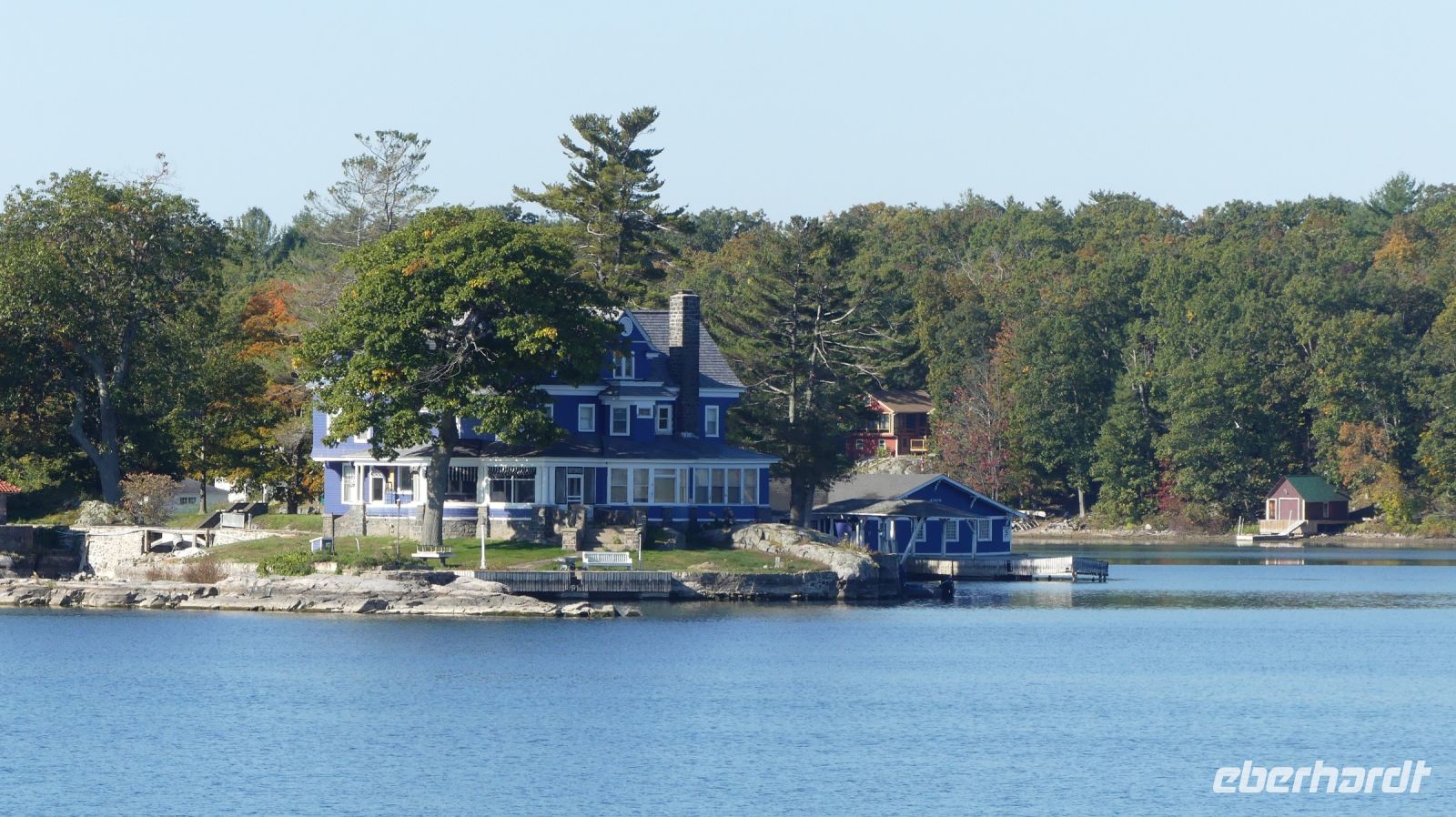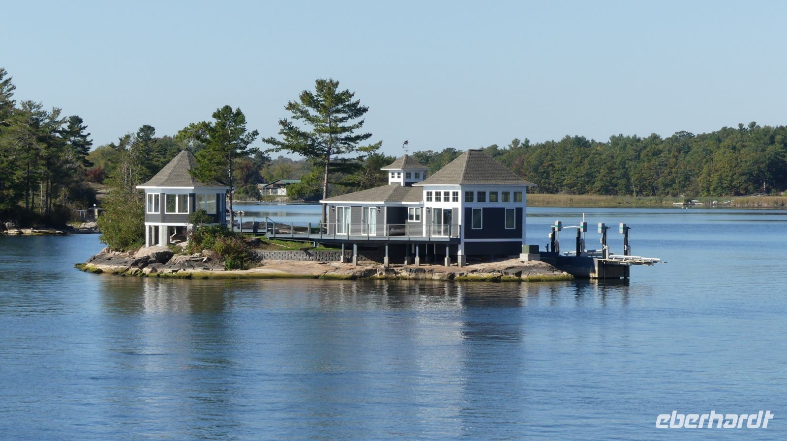 Auch heute haben wir Glück mit dem Wetter. Sonnenschein und blauer Himmel bieten optimale Bedingungen für unsere Bootsfahrt durch die Inselwelt im Ausflussgebiet des St.-Lorenz-Stromes aus dem Ontariosee. Von der Ortschaft Rockport startet unser Ausflugsschiff ins Land der tausend Inseln. Genau genommen sind es nicht tausend, sondern 1.864 Inseln. Für ihre Entstehung hat der weiße Mann wissenschaftliche Erklärungen, aber mir gefällt die Geschichte der Ureinwohner besser, die besagt, dass Blütenblätter vom Himmel fielen und diese Region in einen Garten Gottes verwandelten. Als Insel wird Land anerkannt, dass mindesten 2x2 Meter hat und ein Baum darauf steht.