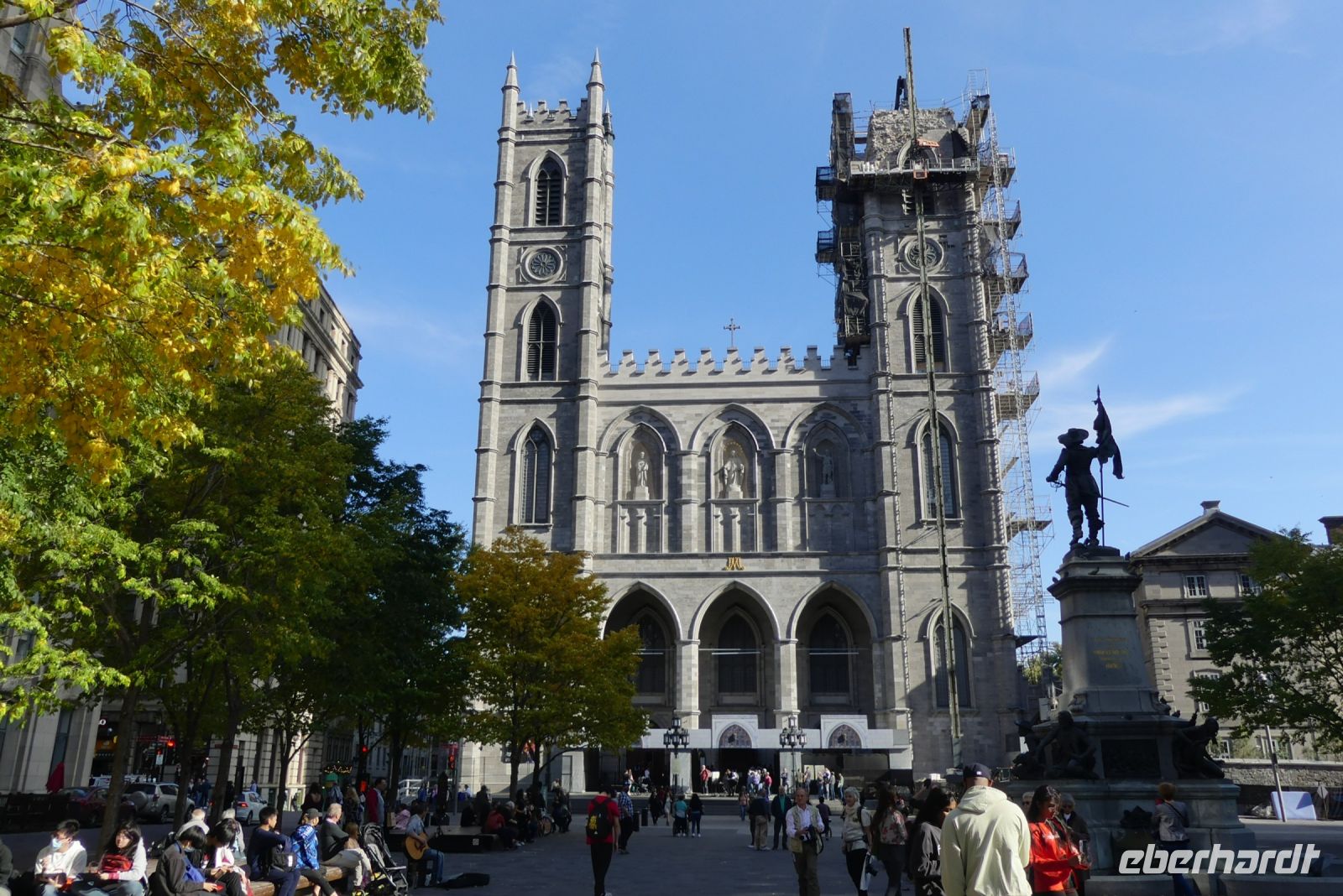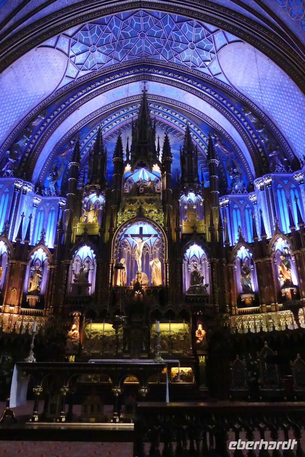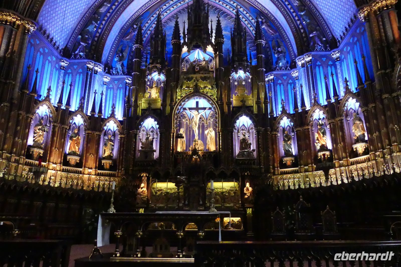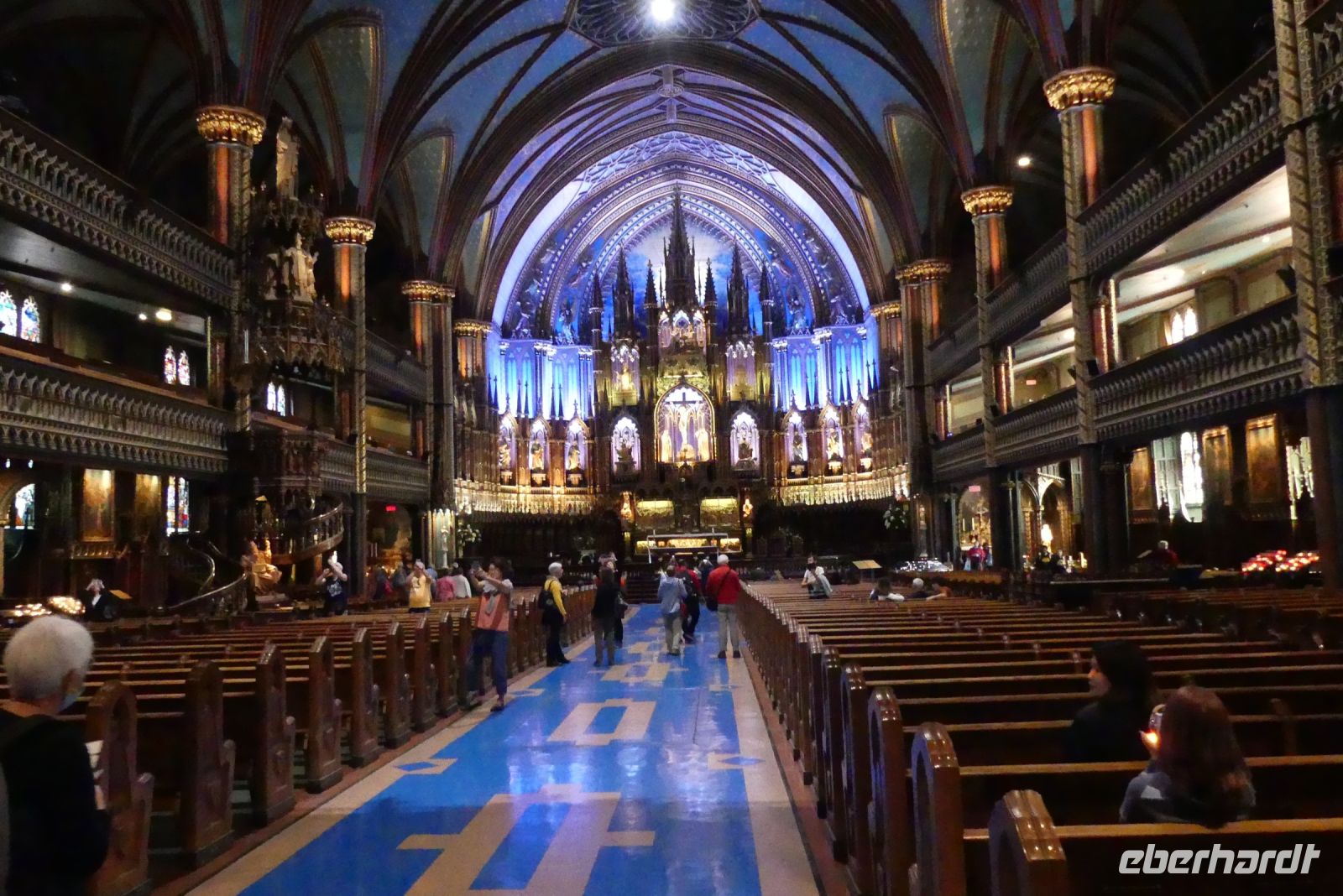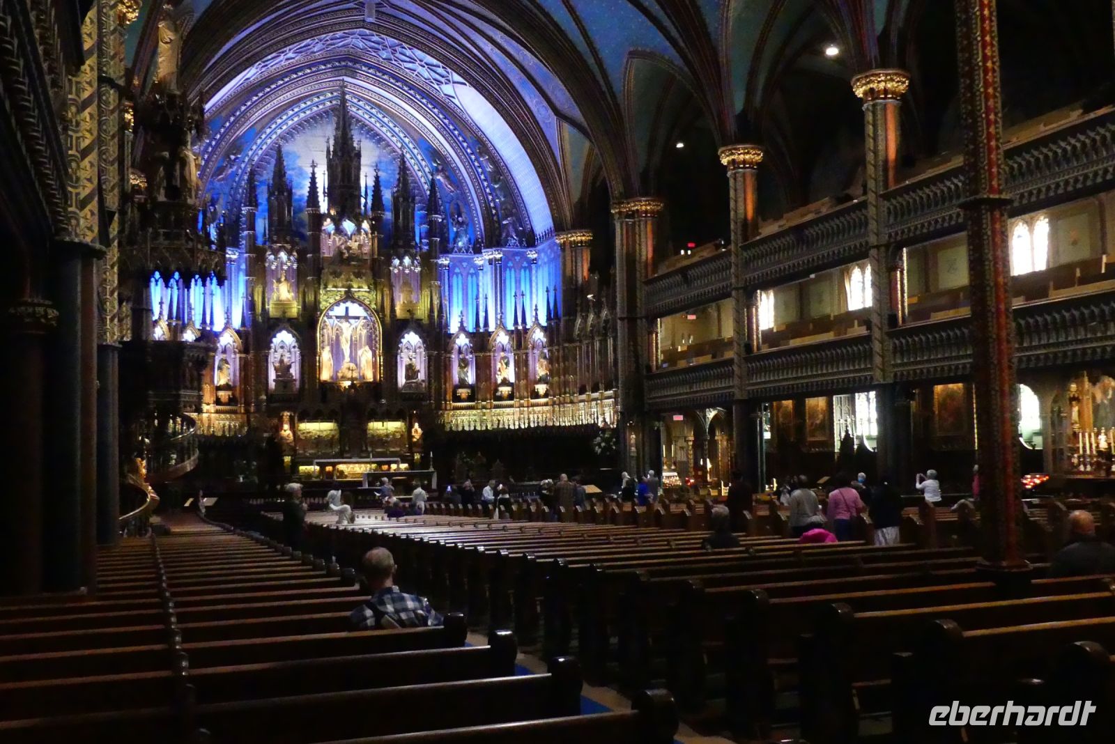 Im Örtchen Montebello halten wir kurz für einen Einkauf im Supermarkt. Dann geht es weiter nach Montreal am St.-Lorenz-Strom. Hier übernimmt Betina, ebenfalls Schweizerin, die Stadtführung. Im Stadtzentrum am Platz Place d´Armes besuchen wir die Basilika Notre Dame. Ihre äußere eher schlichte Erscheinung verrät nichts über ihre Pracht im Inneren. So sind wir beim Betreten der Basilika doch ziemlich überwältigt vom prächtigen Innenraum.
