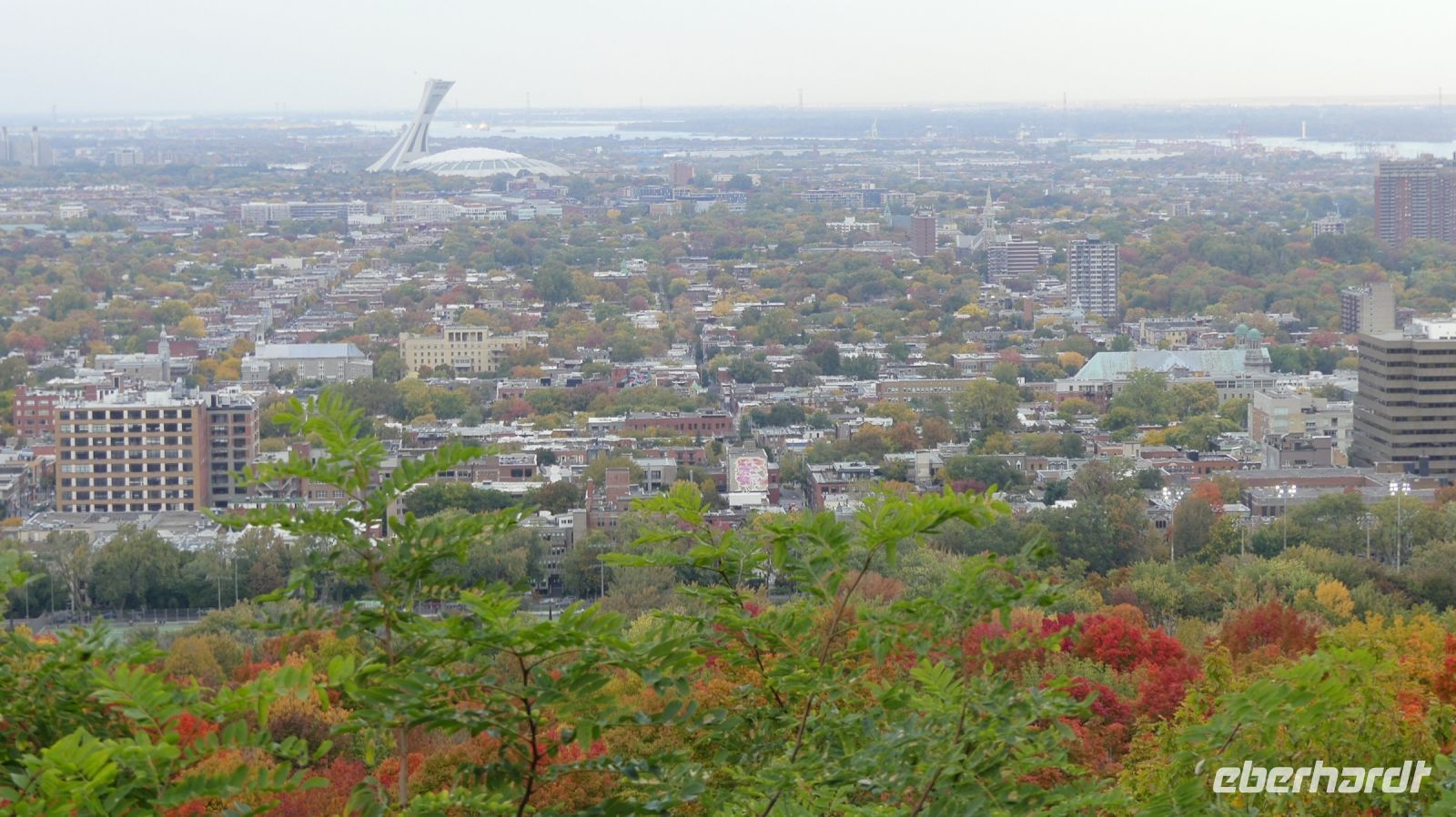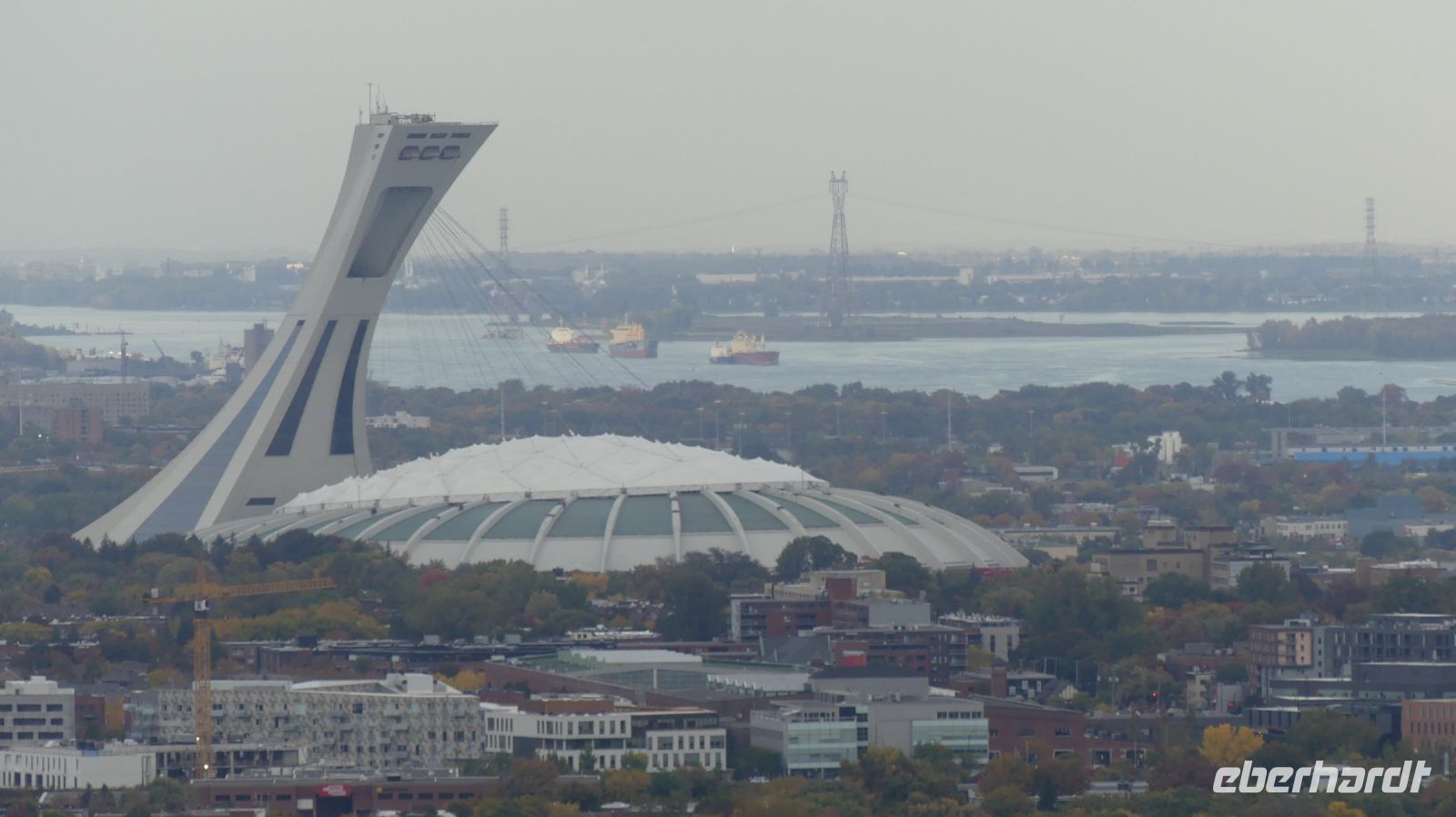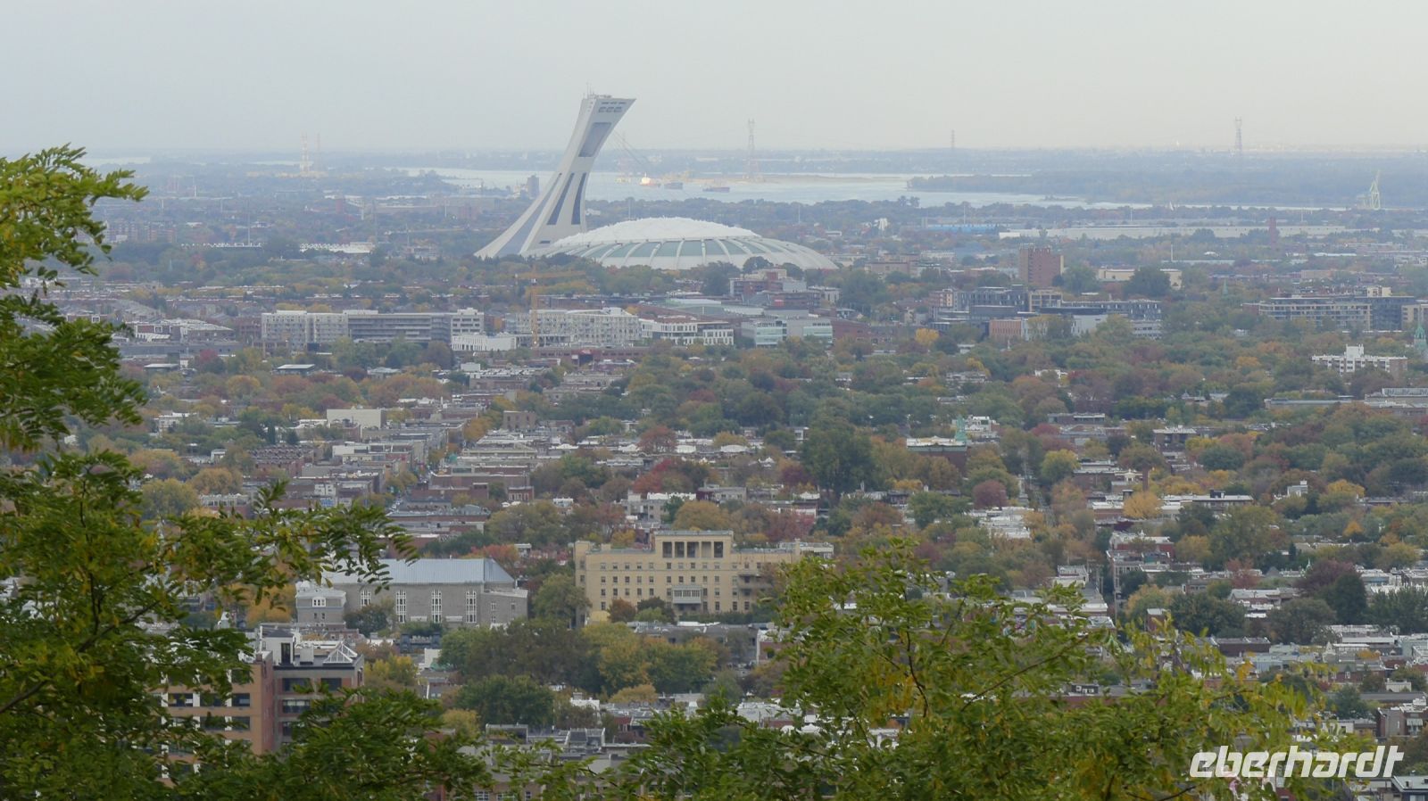 Nach einer kleine Rundfahrt durch die Innenstadt erreichen wir den Park Mont (Mount) Royal mit dem gleichnamigen Hausberg mit einer Höhe von 232 Metern. Die Montrealer legen großen Wert darauf, dass es sich nicht um einen Hügel, sondern einen Berg handelt. Dieser verfügt über eine große Aussichtsterrasse mit einer fantastischen Aussicht auf die Stadt und über den St.-Lorenz-Strom zu den Inselbergen. Unsere Weiterfahrt verzögert sich etwas, weil unserer Bus mit einem Auto beim Abbiegen eine kleine Kollision hatte und jetzt die Formalitäten zu klären sind. Schließlich können wir unsere Tour fortsetzen, um zunächst einen Fotostopp an einem anderen Aussichtspunkt einzulegen. Hier sehen wir einen weiteren Teil der Stadt mit dem markanten Olympiastadion. Dies erinnert uns an die Olympischen Sommerspiele von 1976 mit den vielen Medaillen für die deutschen Sportler.