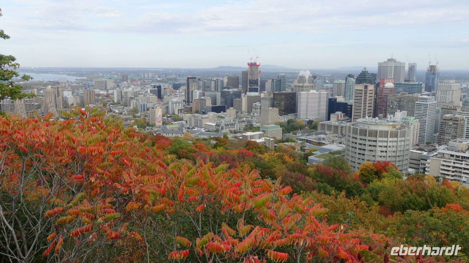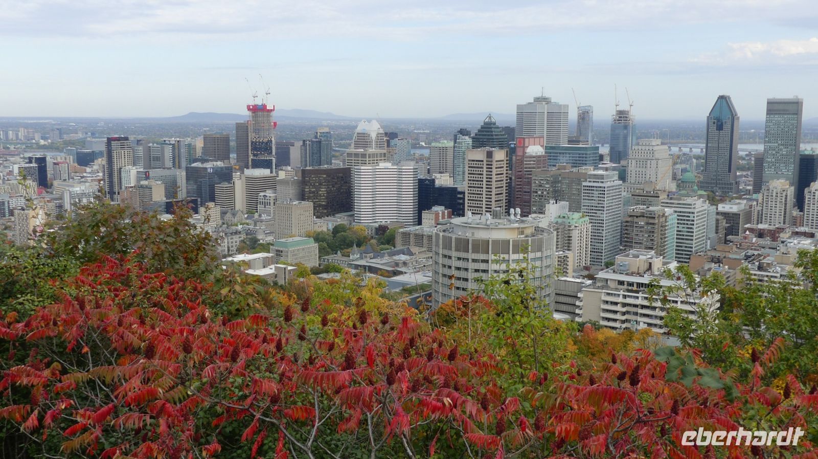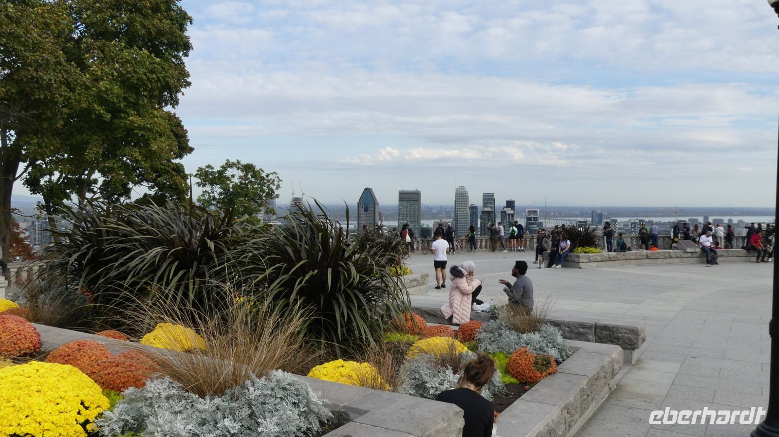 Nach einer kleine Rundfahrt durch die Innenstadt erreichen wir den Park Mont (Mount) Royal mit dem gleichnamigen Hausberg mit einer Höhe von 232 Metern. Die Montrealer legen großen Wert darauf, dass es sich nicht um einen Hügel, sondern einen Berg handelt. Dieser verfügt über eine große Aussichtsterrasse mit einer fantastischen Aussicht auf die Stadt und über den St.-Lorenz-Strom zu den Inselbergen. Unsere Weiterfahrt verzögert sich etwas, weil unserer Bus mit einem Auto beim Abbiegen eine kleine Kollision hatte und jetzt die Formalitäten zu klären sind. Schließlich können wir unsere Tour fortsetzen, um zunächst einen Fotostopp an einem anderen Aussichtspunkt einzulegen. Hier sehen wir einen weiteren Teil der Stadt mit dem markanten Olympiastadion. Dies erinnert uns an die Olympischen Sommerspiele von 1976 mit den vielen Medaillen für die deutschen Sportler.