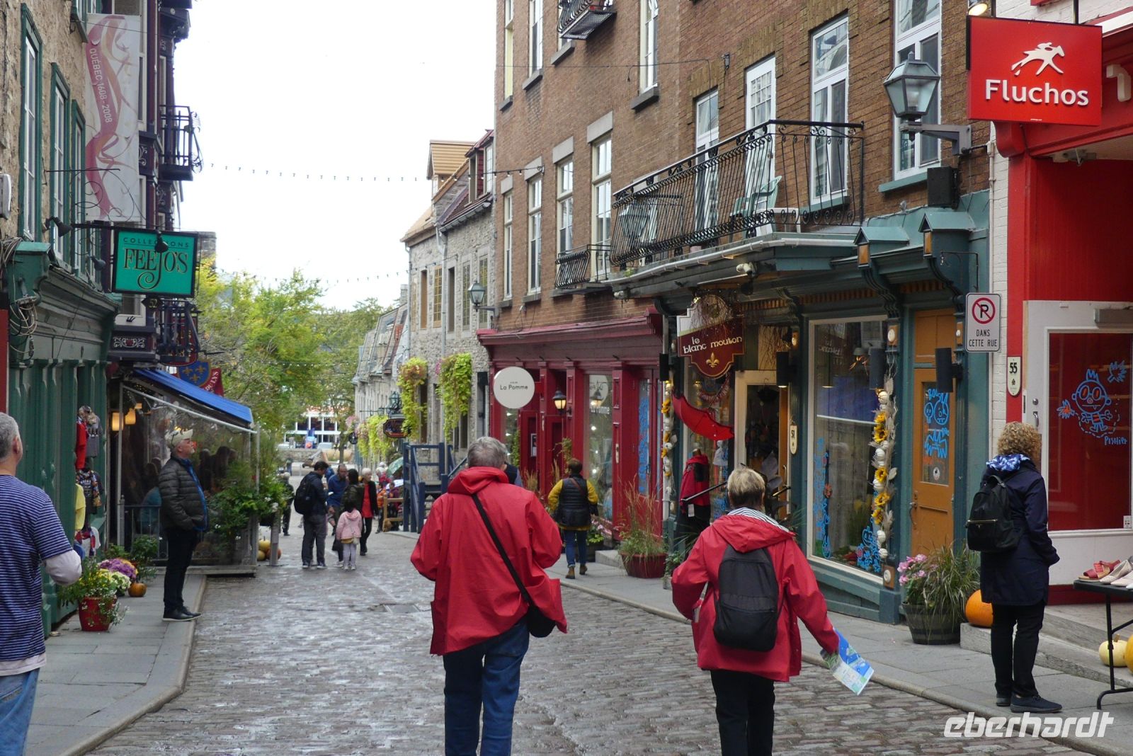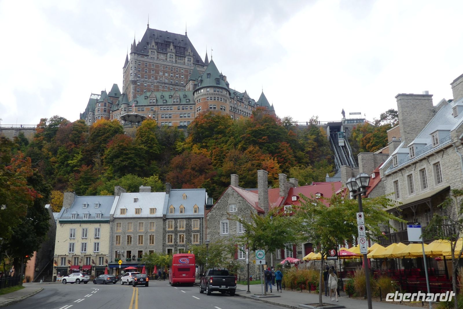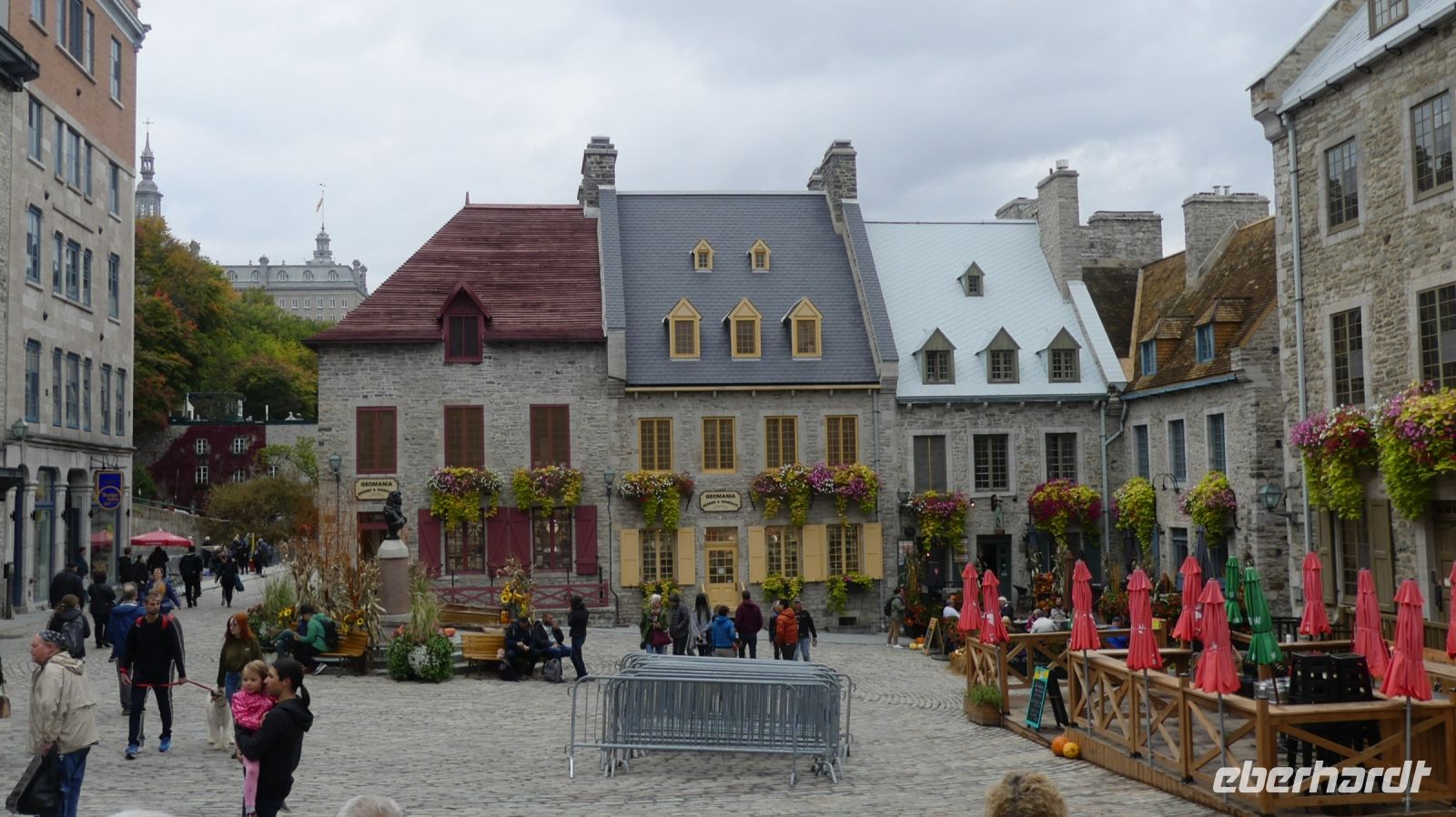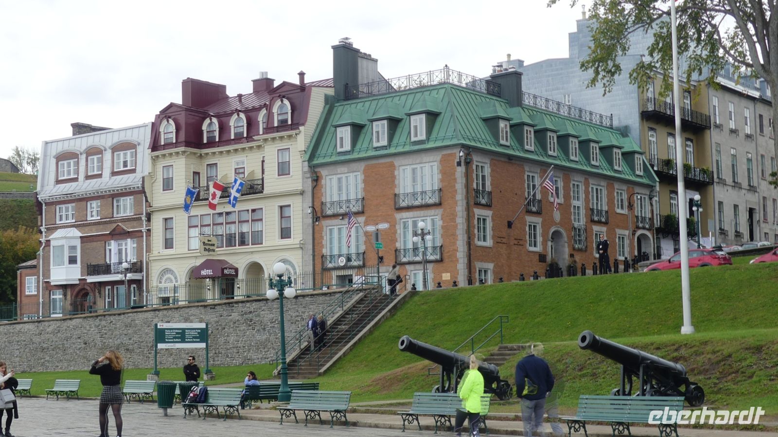 Auch für Quebec haben wir eine eigene Stadtführerin. Wie es der Zufall so will, ist auch Marina Schweizerin. Sie wird uns rund zwei Stunden ihre schöne Stadt zeigen und wir werden begeistert sein von ihrer Erzählweise und einer sehr angenehmen klaren Stimme. Zunächst unternehmen wir eine Orientierungsfahrt. Dabei sehen wir das Wohngebiet Montcalm mit schönen Häusern, Parkanlagen, die Zitadelle und das Parlamentsgebäude. Anschließend nehmen wir uns Zeit für einen ausgiebigen Spaziergang durch die Altstadt. Diese steht auf der UNESCO-Welterbeliste und teilt sich in die Ober- und Unterstadt. Auf der Terrasse Dufferin haben wir einen schönen Ausblick auf das Chateau Frontenac, auf Quebec und den St. Lorenz-Strom. In der Unterstadt gibt es malerische Gässchen wie die Rue de Petit Champlain mit Kunsthandwerkläden und Restaurants. Der Place Royale, ein schöner Platz umrahmt von kleinen geschmückten Steinhäusern, gibt eine beliebte Filmkulisse (Traumschiff; Leonardo DiCaprio in Catch me if you can) ab.
