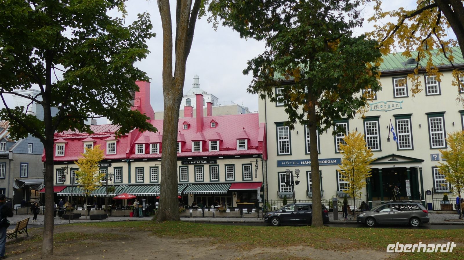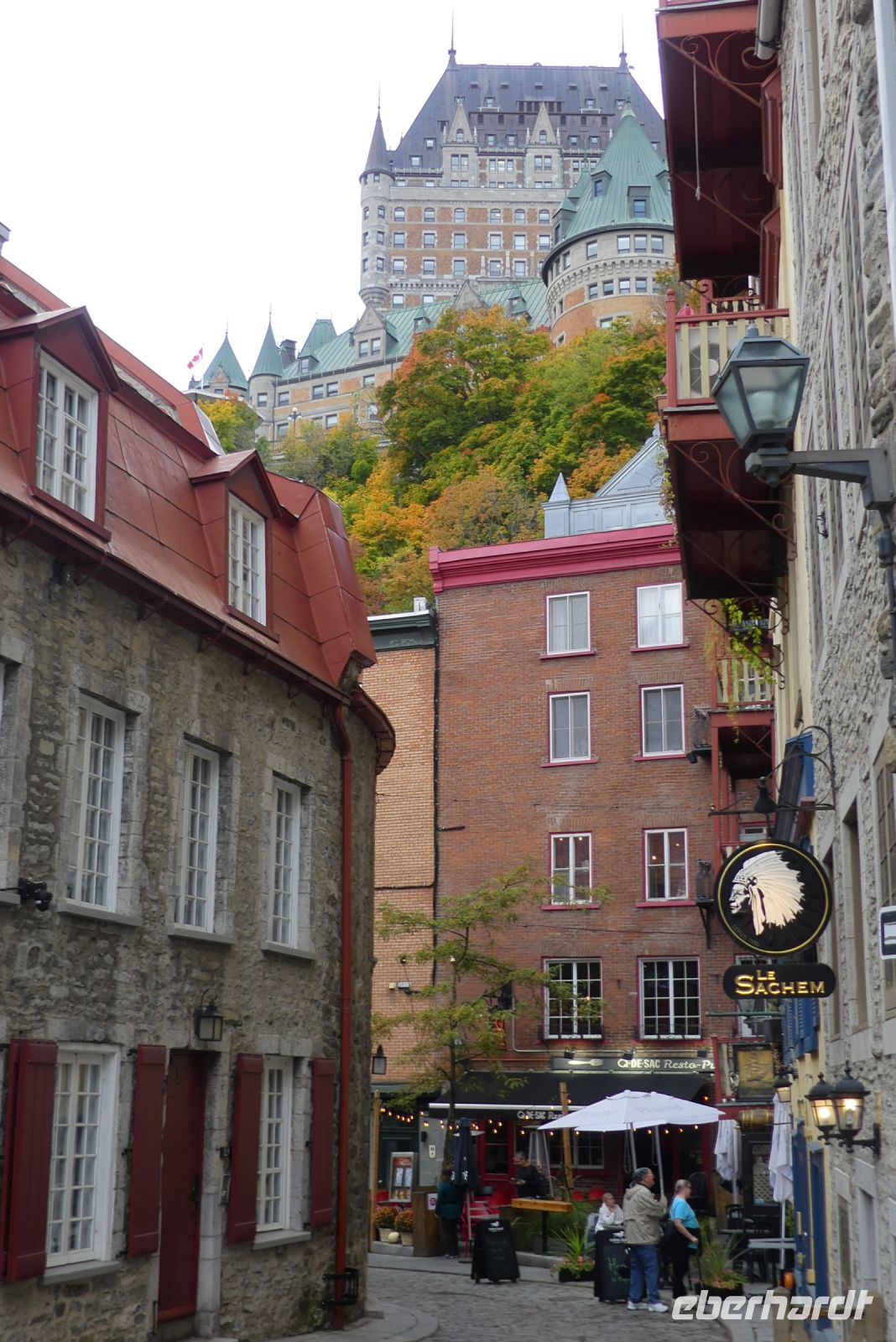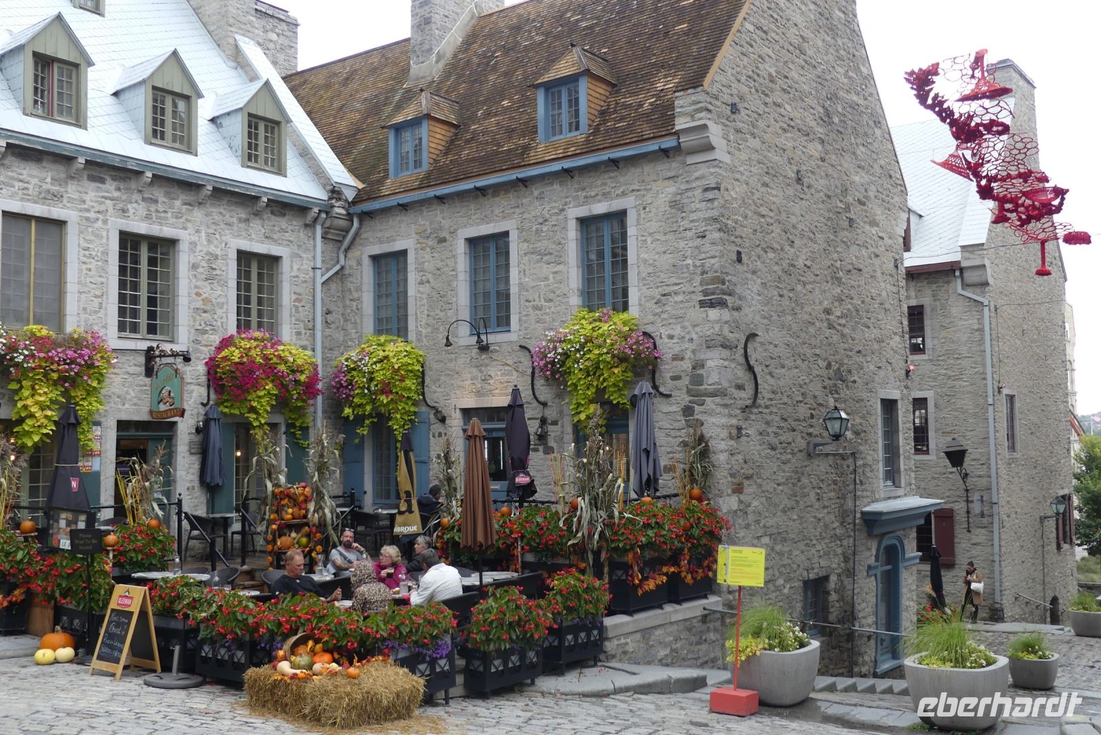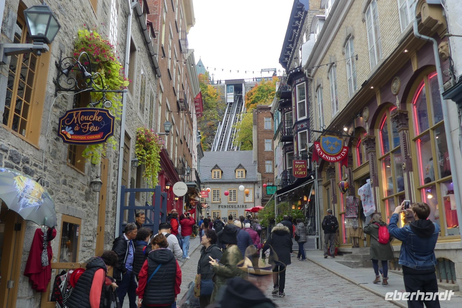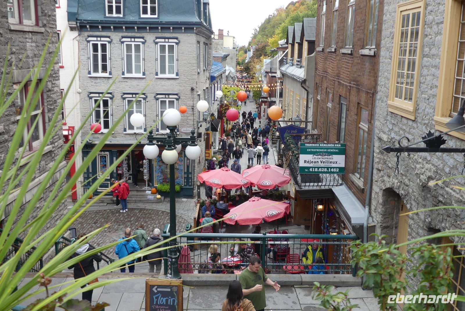 Auch für Quebec haben wir eine eigene Stadtführerin. Wie es der Zufall so will, ist auch Marina Schweizerin. Sie wird uns rund zwei Stunden ihre schöne Stadt zeigen und wir werden begeistert sein von ihrer Erzählweise und einer sehr angenehmen klaren Stimme. Zunächst unternehmen wir eine Orientierungsfahrt. Dabei sehen wir das Wohngebiet Montcalm mit schönen Häusern, Parkanlagen, die Zitadelle und das Parlamentsgebäude. Anschließend nehmen wir uns Zeit für einen ausgiebigen Spaziergang durch die Altstadt. Diese steht auf der UNESCO-Welterbeliste und teilt sich in die Ober- und Unterstadt. Auf der Terrasse Dufferin haben wir einen schönen Ausblick auf das Chateau Frontenac, auf Quebec und den St. Lorenz-Strom. In der Unterstadt gibt es malerische Gässchen wie die Rue de Petit Champlain mit Kunsthandwerkläden und Restaurants. Der Place Royale, ein schöner Platz umrahmt von kleinen geschmückten Steinhäusern, gibt eine beliebte Filmkulisse (Traumschiff; Leonardo DiCaprio in Catch me if you can) ab.