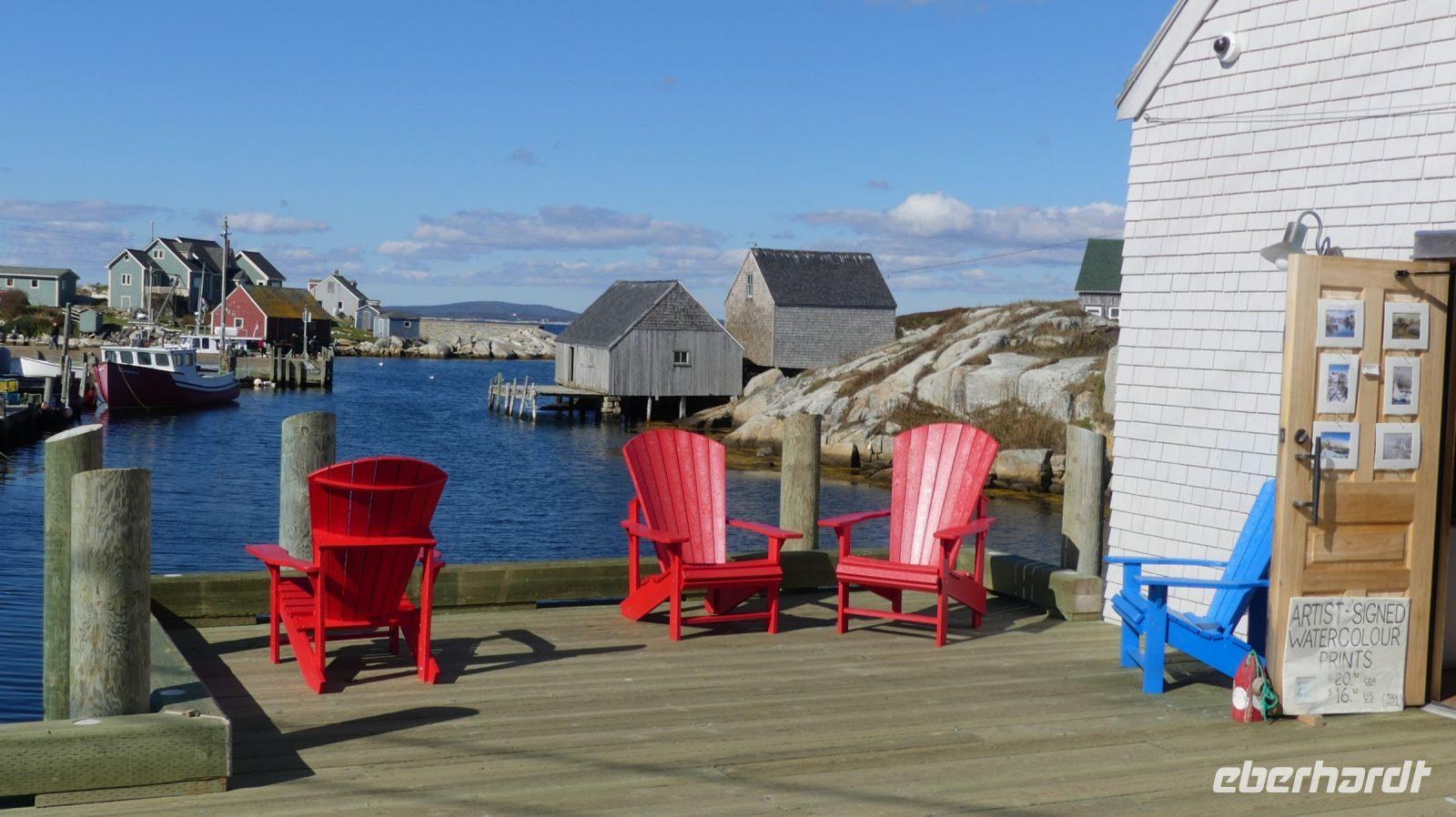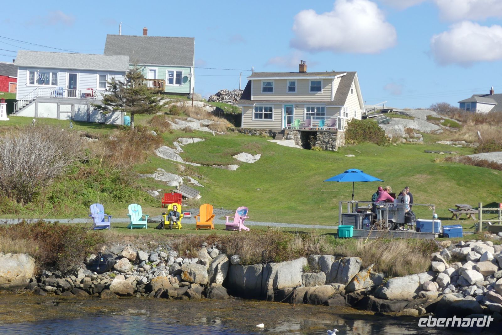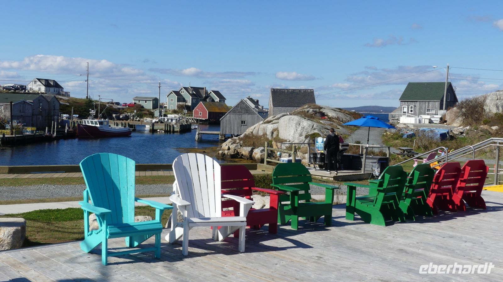 Wir verlassen Halifax Richtung Süden in eine wunderschöne Landschaft. Laubfärbung, Sonnenschein und wundervolle Buchten mit schmucken Häusern prägen das Bild. Für zwei Stunden bleiben wir in Peggys Cove. Ein kleiner Ort, der täglich von vielen Touristen aufgesucht wird. Wahrzeichen ist der Leuchtturm. Vor der malerischen Kulisse spielt ein Dudelsackspieler Amazing Grays, was mich daran erinnert, dass wir uns immer noch in Neu Schottland aufhalten. Die Küstenlandschaft mit den runden Steinen, Holzhäusern und Fischerbooten erinnert mich dagegen an Regionen in Norwegen. Farbige amerikanische Gartenstühle, die Adirondack Stühle passen sehr gut in das Bild.