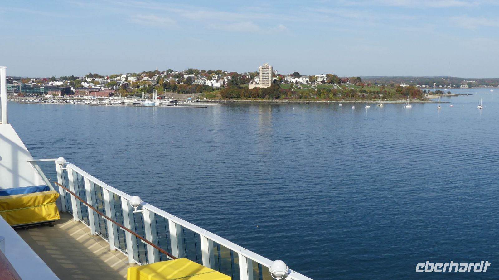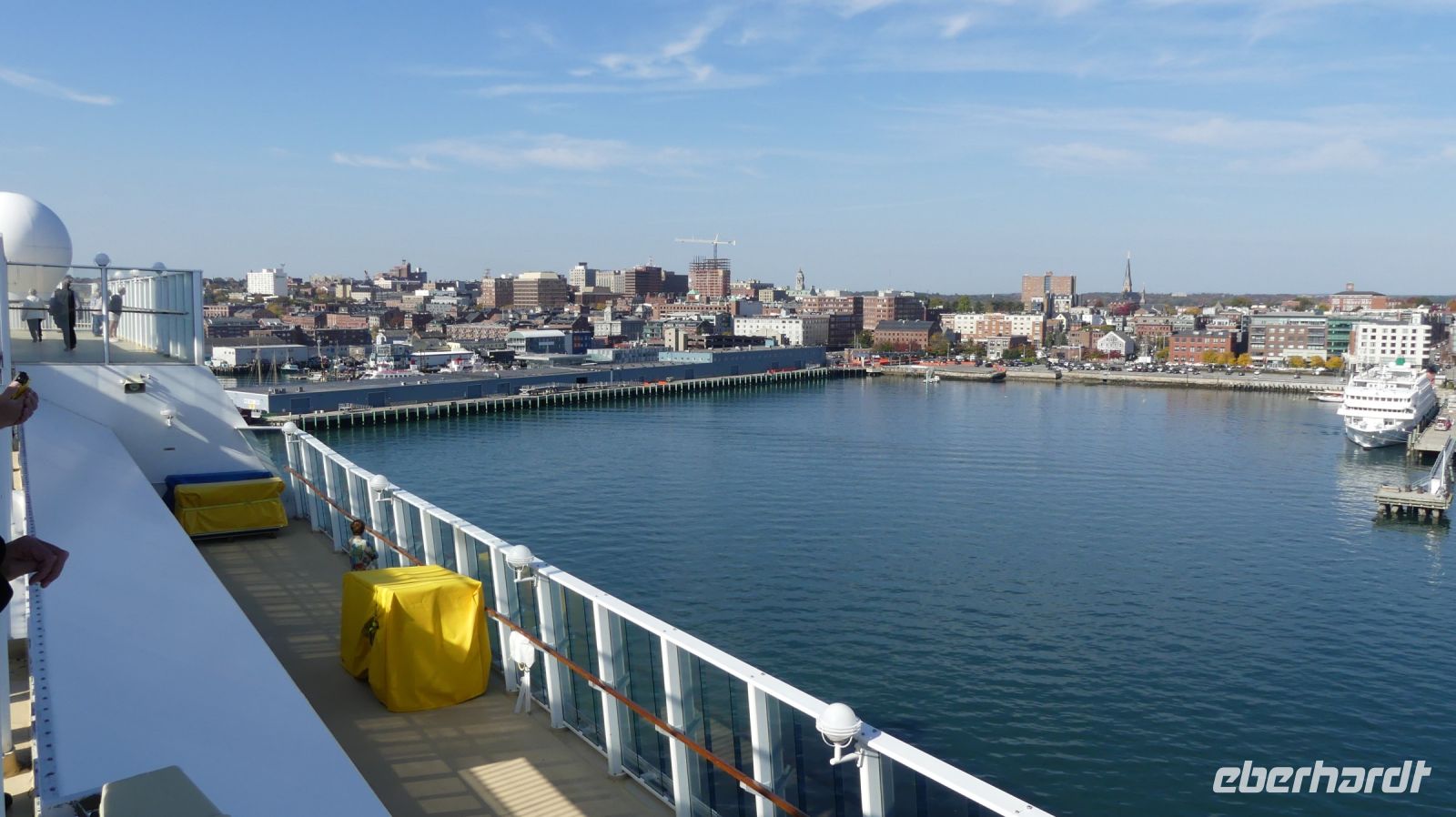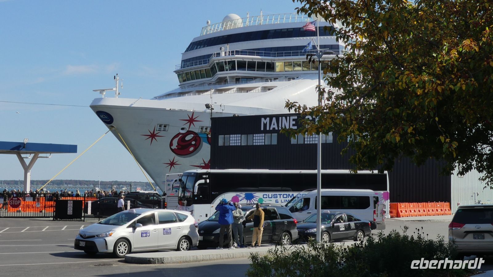 Am Vormittag laufen wir in die tiefe Bucht Casco Bay ein. Wir machen Halt in Portland, der Hauptstadt des US Bundesstaates Main. Die US Behörden kommen an Bord, um die Einreiseformalitäten für die USA abzuwickeln. Jeder Passagier muss mit seinem Pass und ESTA persönlich erscheinen. Durch die Aufteilung in Gruppen und Priorität für die Mittagsausflügler geht es zum Glück ohne Massenauflauf der Passagiere über die Bühne. Ein paar einfache Fragen werden gestellt und Fingerabdrücke genommen. Dann gibt es einen Stempel in den Pass und einen Vermerk auf der Bordkarte. Anschließend kommen die meisten von uns mit zum NCL-Ausflug.