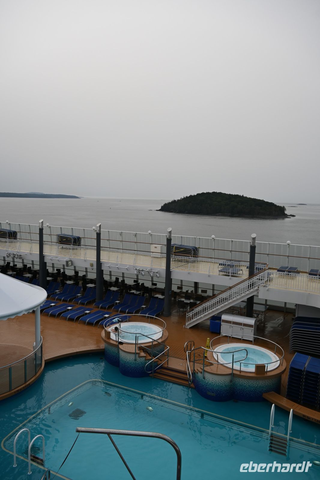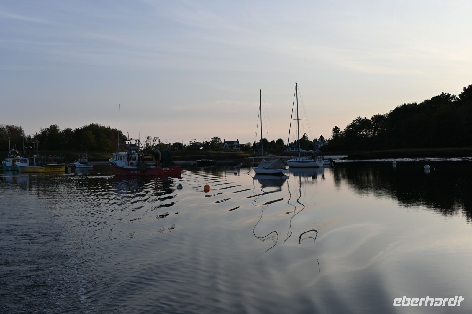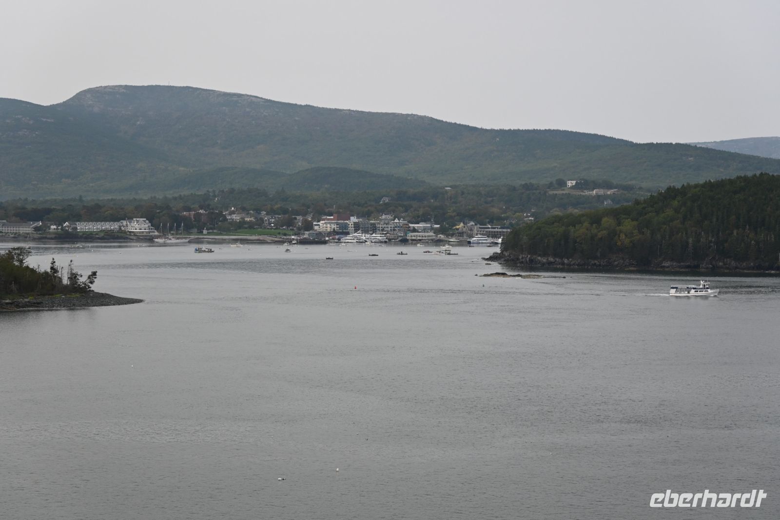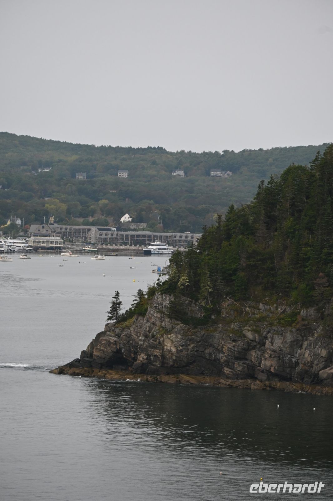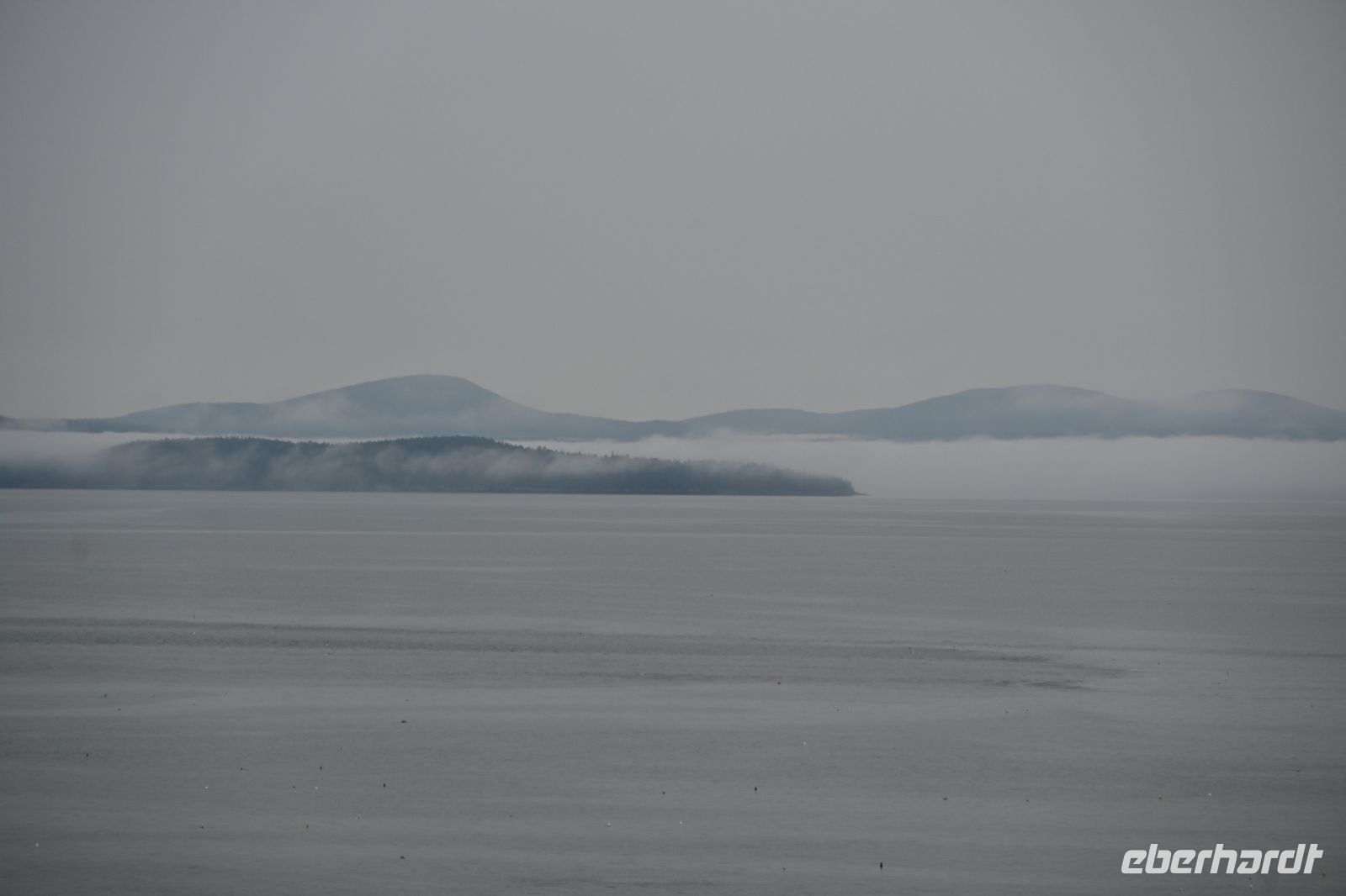 Tiefe Wolken liegen über der Bucht von Bar Harbor. Bisher waren wir vom Wetter verwöhnt, da können wir auch bei diesen Wetterbedingungen gut in den Tag starten. Wir können uns glücklich schätzen, denn ab dem nächsten Jahr dürfen hier nur noch Kreuzfahrtschiffe mit maximal 1.000 Passagieren anlegen. Der Hafen möchte so gegen den Übertourismus im Ort vorgehen.