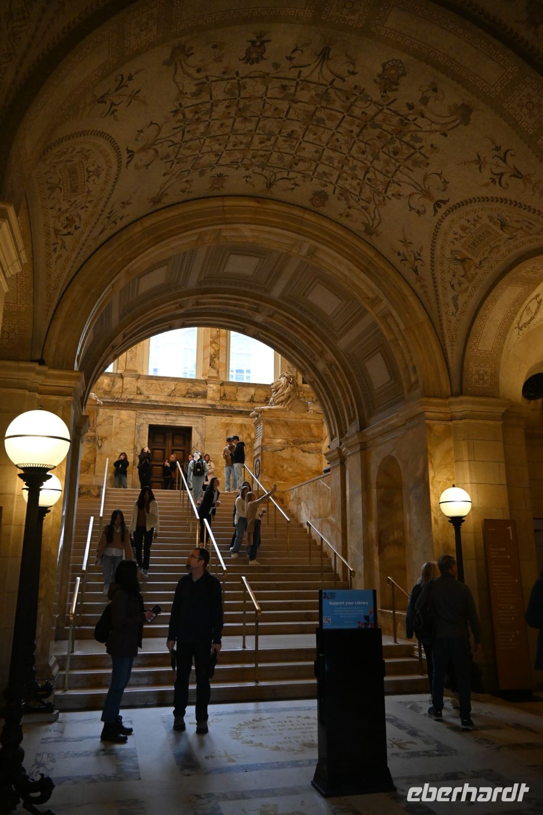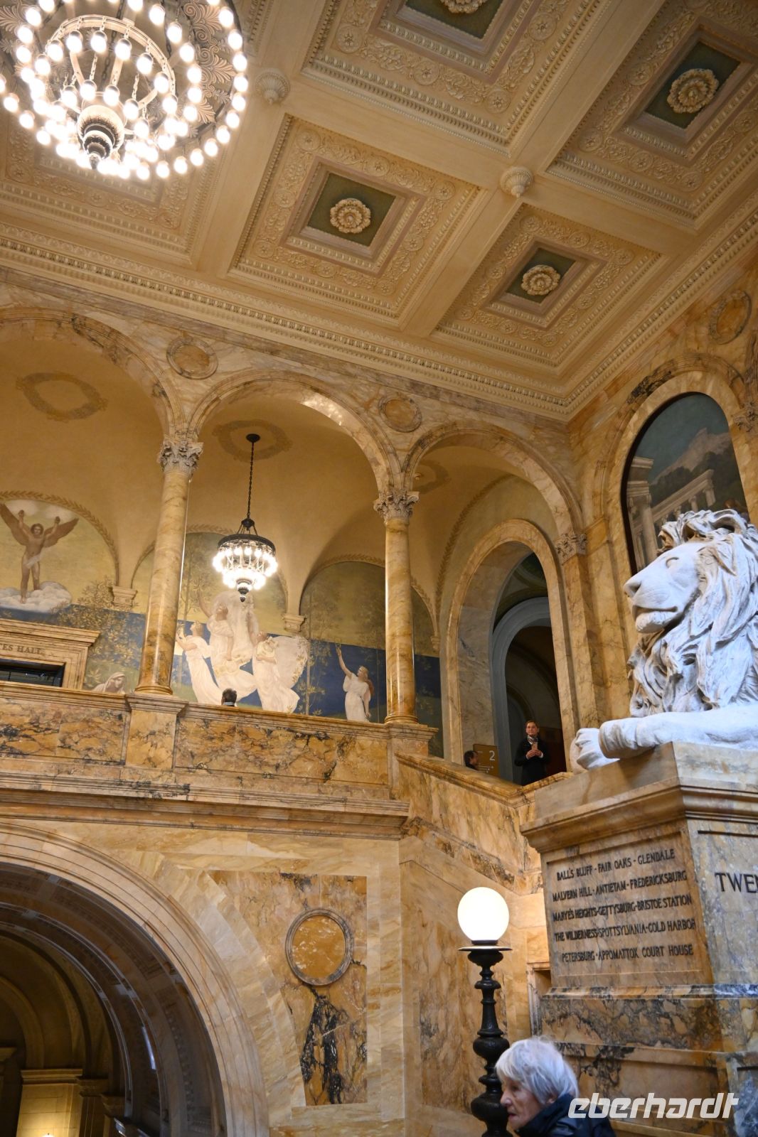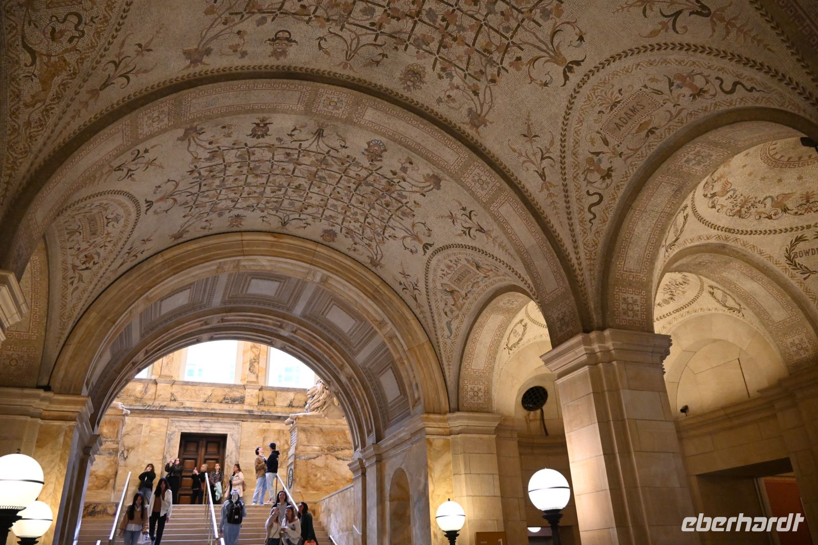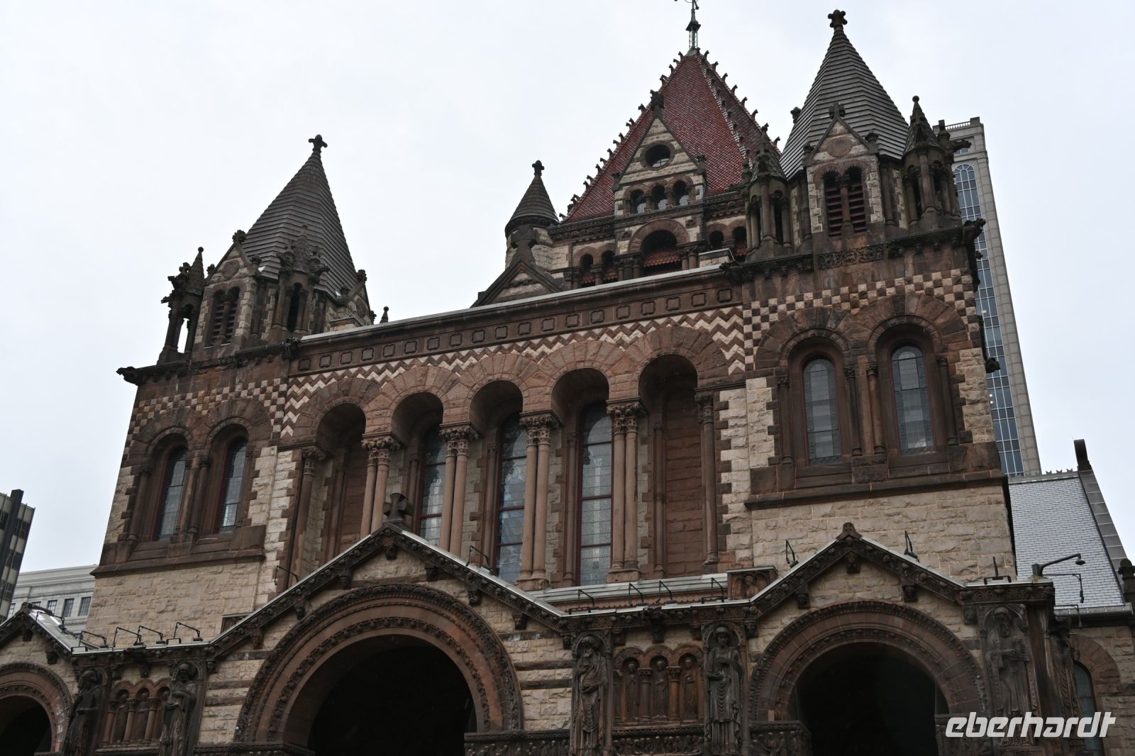 Weiter geht es für uns durch die Stadt. Auch sehr viel Tradition hat hier der, seit über 120 Jahren, stattfindende Boston-Marathon. Mit unserem Bus überqueren wir die Ziellinie. Einen Stopp machen wir an der Trinity Church und der Bibliothek. Um die hier gesammelten 23 Millionen Bücher, Schriften, Briefe, Karten usw. durchzuschauen, müssten wir wahrscheinlich noch ein paar Tage länger bleiben. Während uns Mary Margaret den Rest der Stadt zeigt, erzählt sie noch viel über die Geschichte der Stadt. Da das alles in englisch passiert, ist es für uns sehr schwierig ihr zu folgen. Daher sind wir froh, als Gary für unsere Mittagspause einen guten Parkplatz findet und wir am Quincy Market verschnaufen können. In der Markthalle wird alles von süß bis herzhaft verkauft, hier sollte keiner hungrig raus gehen.