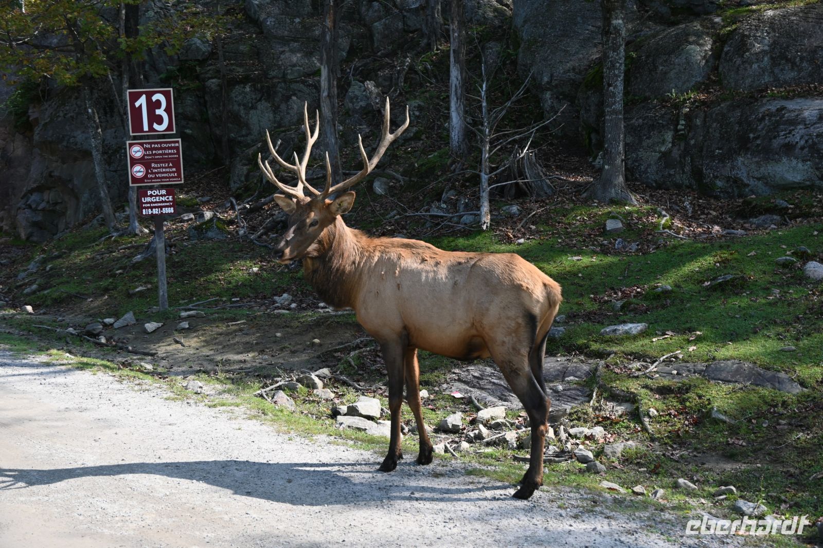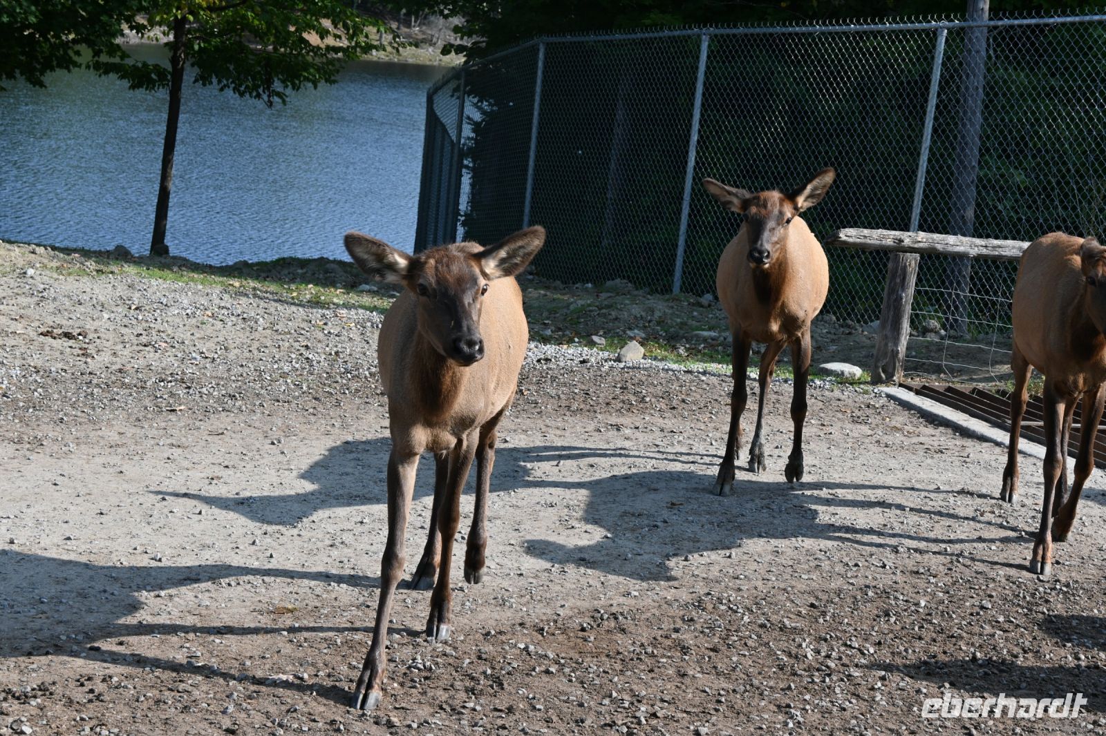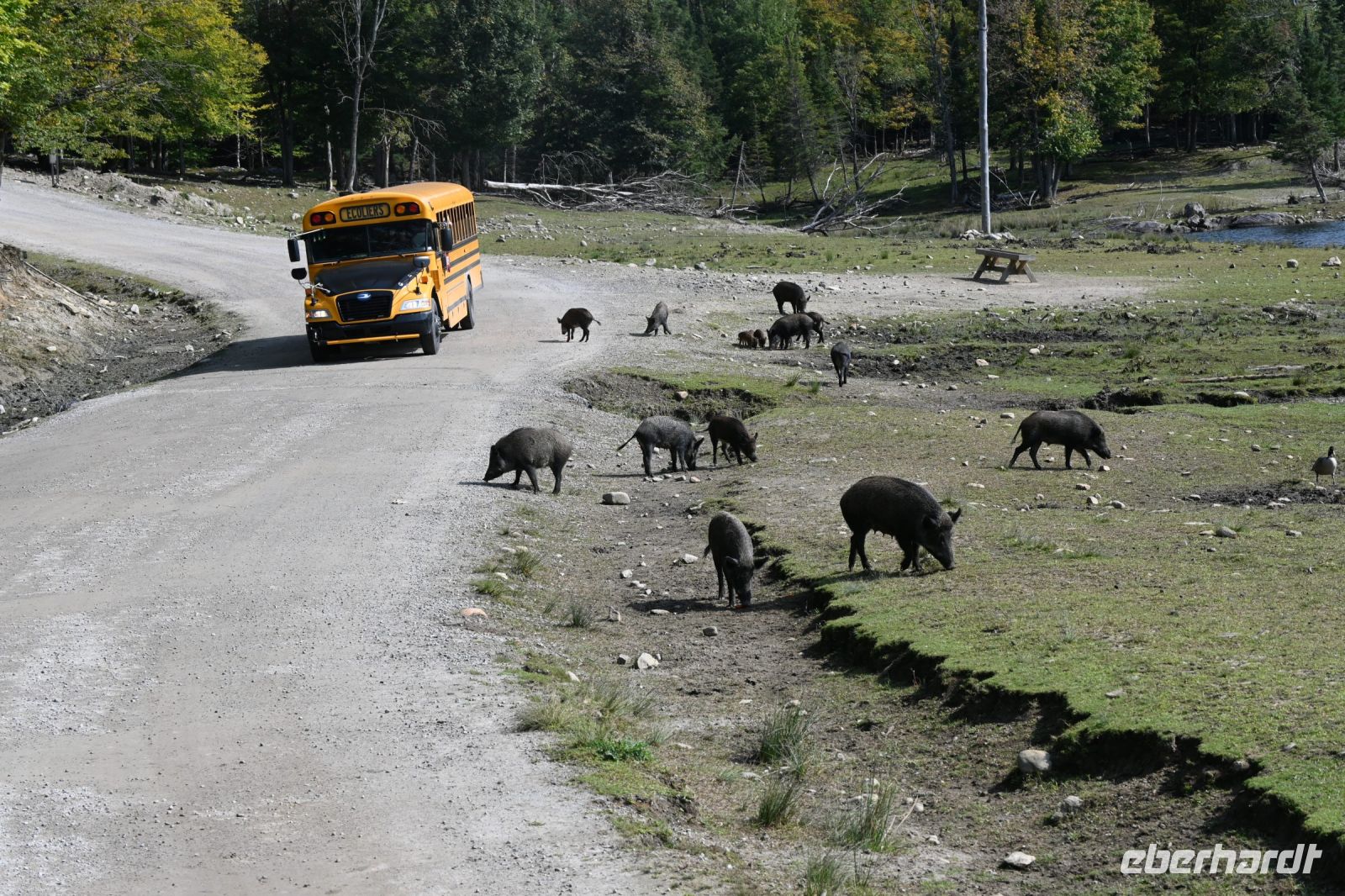 Überpünktlich sind wir heute bei unserem ersten Ausflug. Zwischen Ottawa und Montreal liegt der Omega Park. Mit einer Art Safaribus haben wir hier die Möglichkeit, die Tiere in ihrem natürlichen Lebensraum zu beobachten. Leider wurde unserem Fahrer des Parks die falsche Abfahrtszeit mitgeteilt und so starten wir leider verspätet. Als er endlich da ist, sind alle schnell im Bus. Wir werden mit Möhren ausgestattet und schon geht es los. Auf einem 15 Kilometer Rundweg erwarten uns hungrige Wapitis, obwohl schon zwei Busse vor uns in den Park gefahren sind, ist der Hunger nach Möhren anscheinend noch nicht gestillt. Der Wildpark hat eine Größe von 2200 Hektar mit ungefähr 600 Tieren. Es gibt Wildschweine, Schwarzbären, Biber, Füchse und auch Elche. Alles Tiere, die hier in Kanada heimisch oder eingewandert sind.
