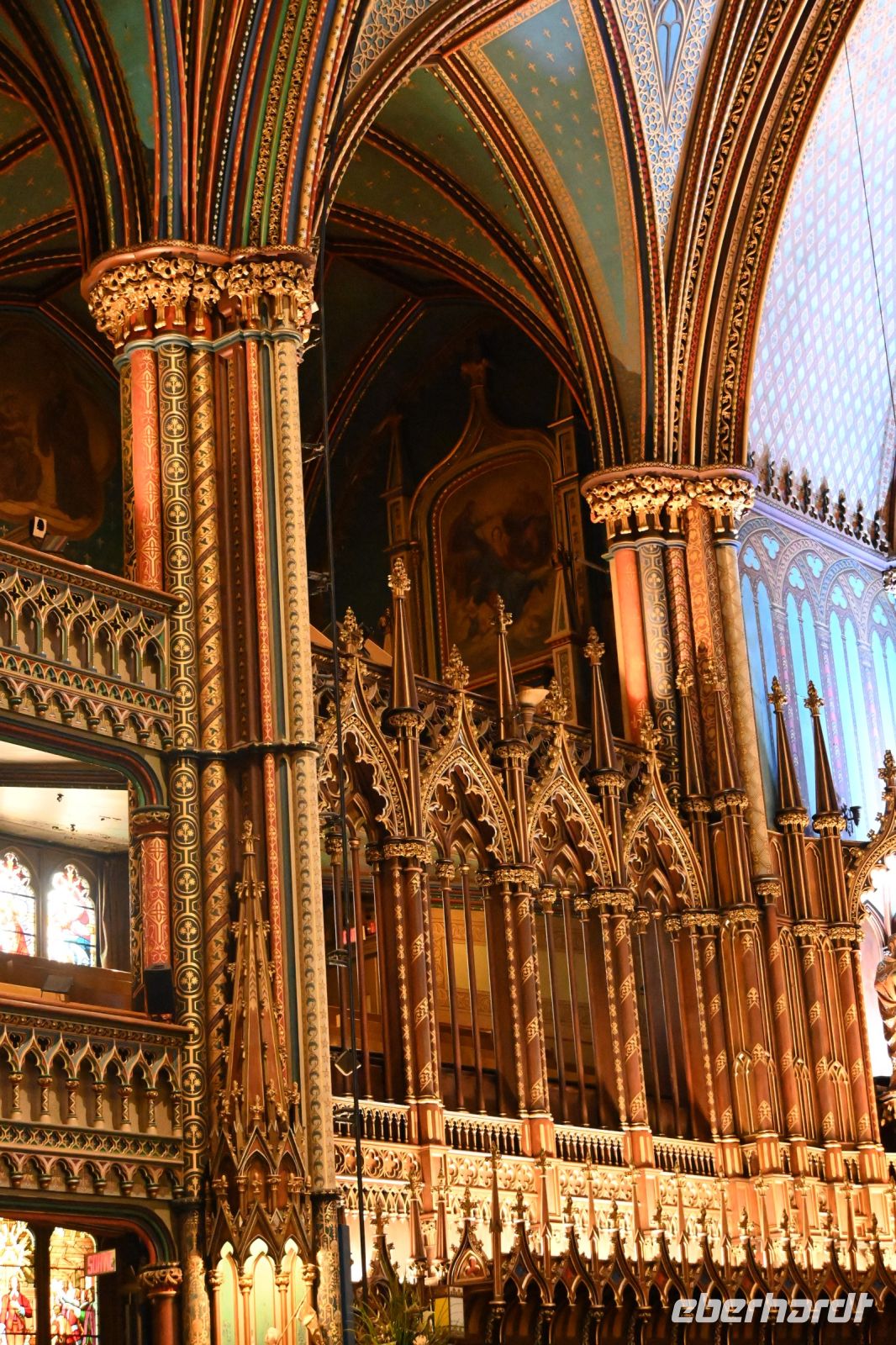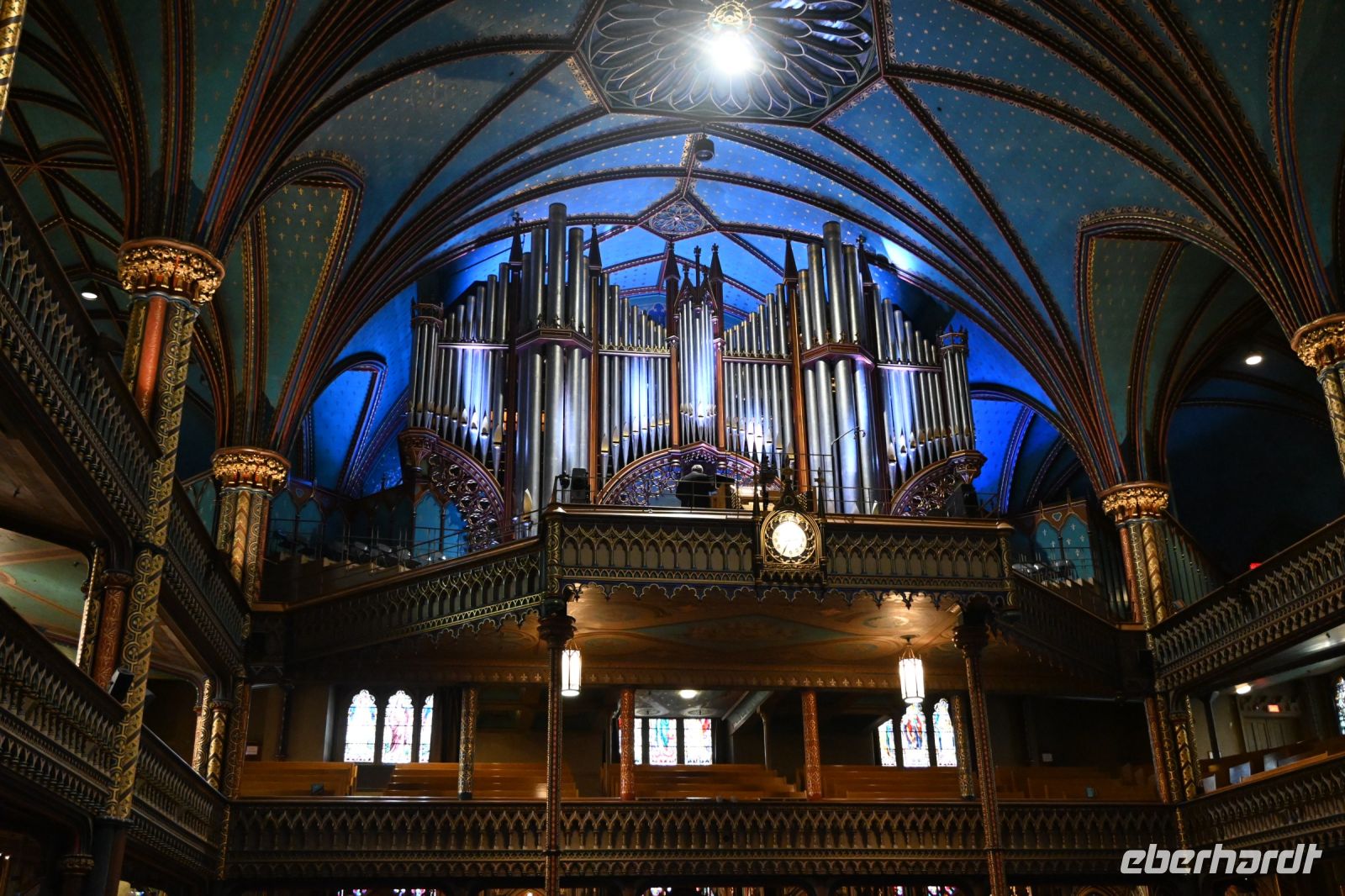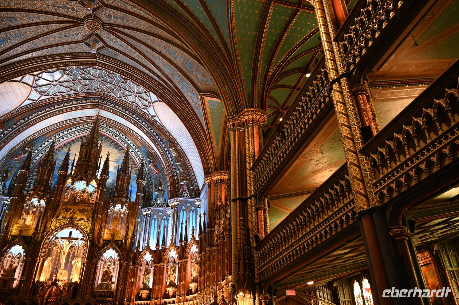Wir bewegen uns jetzt in der Provinz Quebec und erreichen am frühen Nachmittag die Millionenstadt Montreal. An der Basilika Notre-Dame de Montreal empfängt uns Bettina. Sie wird die nächsten Stunden unsere Reiseleiterin sein. Wir haben Glück und können noch die letzten Töne des Hausorgelspielers in der Basilika hören. Dreimal in der Woche spielt er für die Öffentlichkeit. Auch der erste Blick beeindruckt uns sehr. Von außen wirkte das Gebäude noch sehr simpel, innen ist sie prunkvoll ausgestattet und verziert. Die Basilika wurde ab 1824 erbaut und war rund 100 Jahre das höchste Gebäude in Montreal. Wenn man die vielen Wolkenkratzer drum herum sieht, kann man sich das nur schwer vorstellen.
