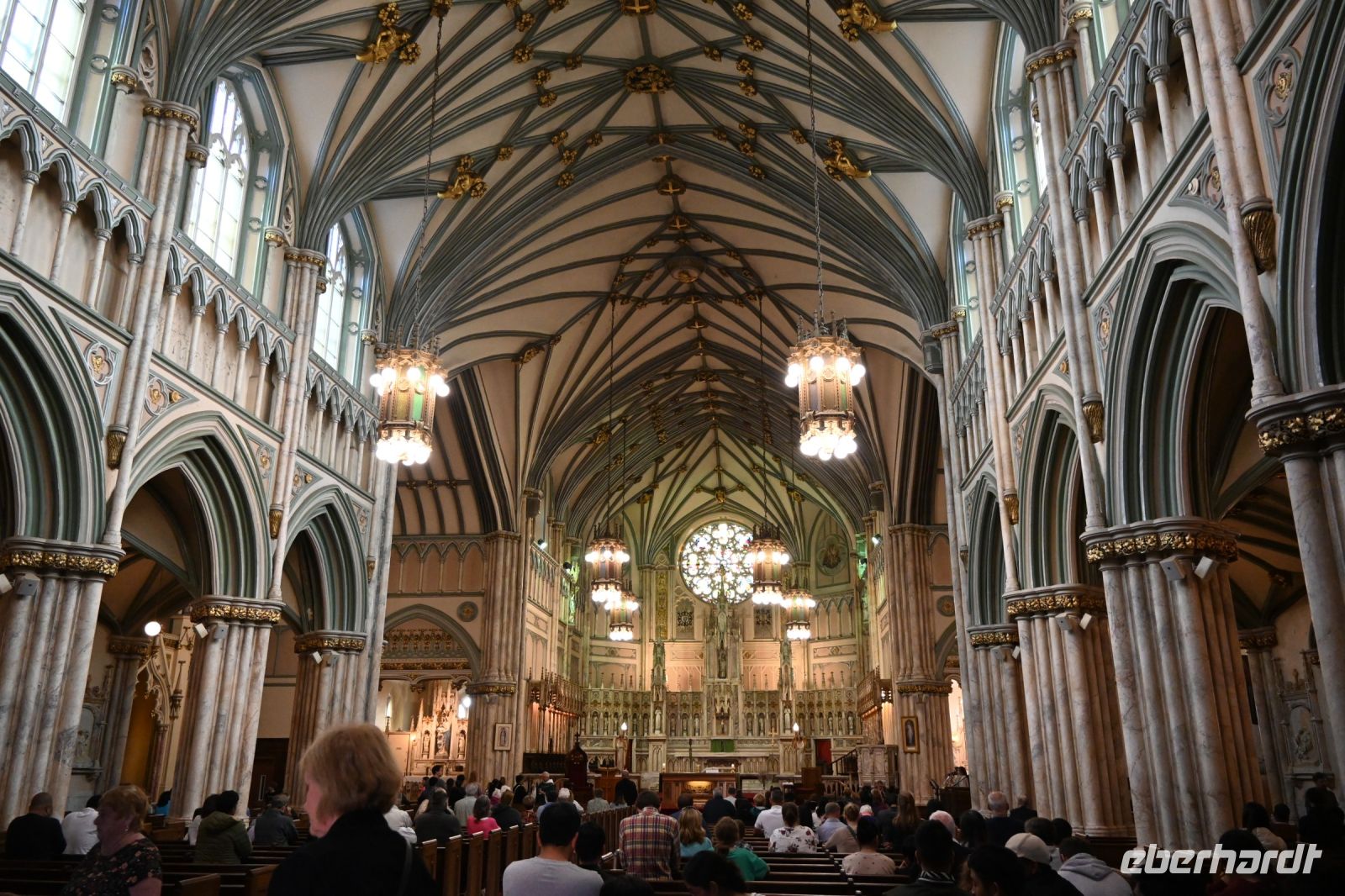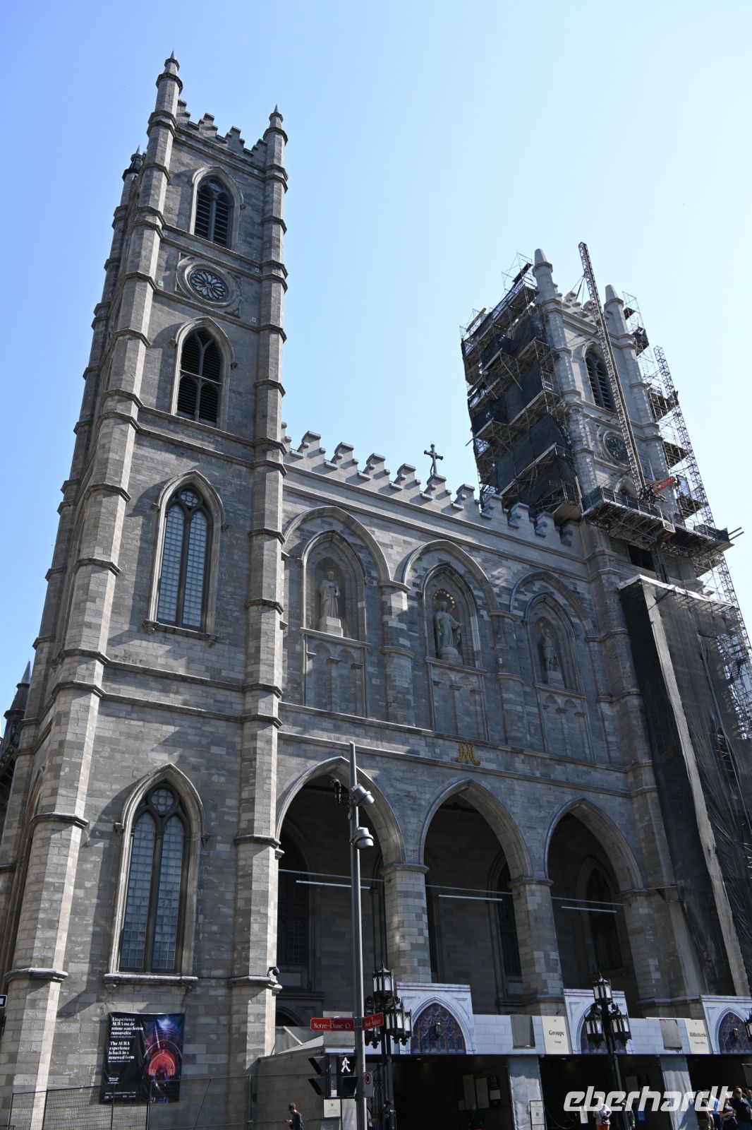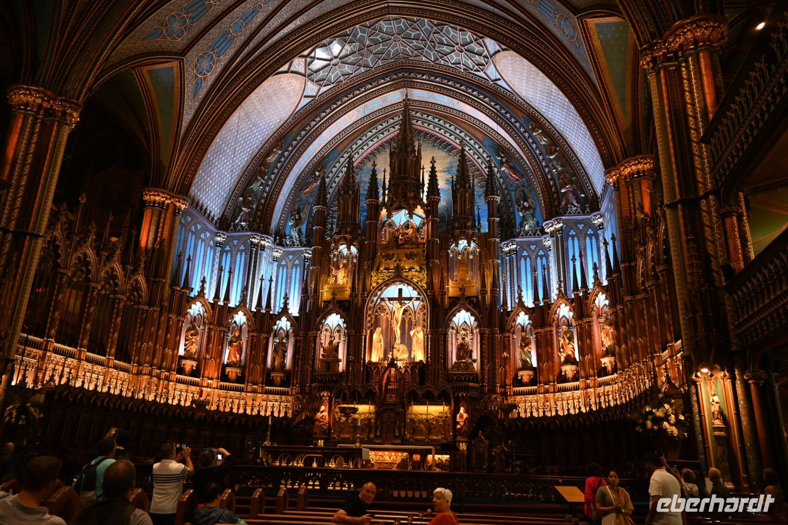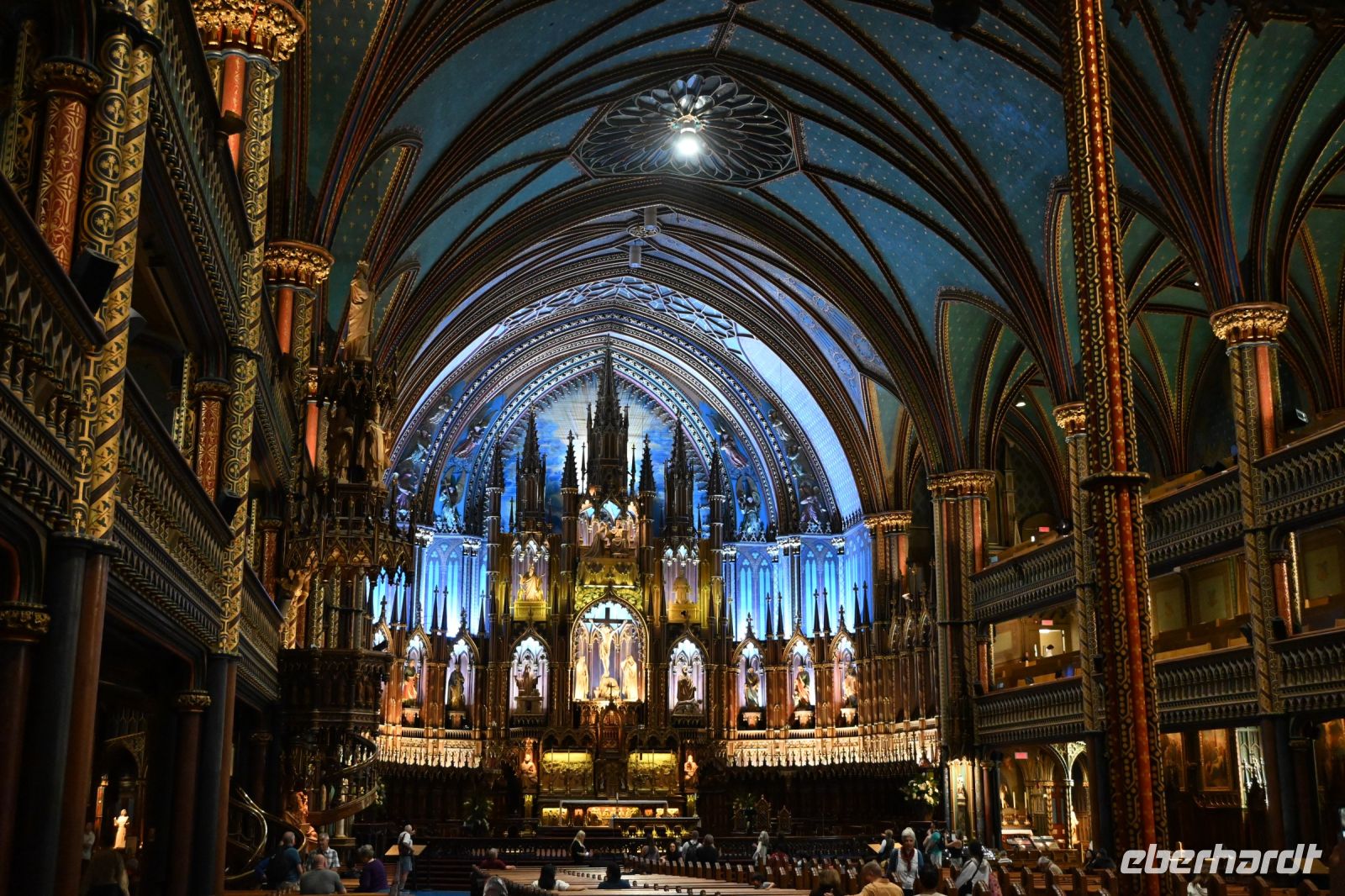 Wir bewegen uns jetzt in der Provinz Quebec und erreichen am frühen Nachmittag die Millionenstadt Montreal. An der Basilika Notre-Dame de Montreal empfängt uns Bettina. Sie wird die nächsten Stunden unsere Reiseleiterin sein. Wir haben Glück und können noch die letzten Töne des Hausorgelspielers in der Basilika hören. Dreimal in der Woche spielt er für die Öffentlichkeit. Auch der erste Blick beeindruckt uns sehr. Von außen wirkte das Gebäude noch sehr simpel, innen ist sie prunkvoll ausgestattet und verziert. Die Basilika wurde ab 1824 erbaut und war rund 100 Jahre das höchste Gebäude in Montreal. Wenn man die vielen Wolkenkratzer drum herum sieht, kann man sich das nur schwer vorstellen.