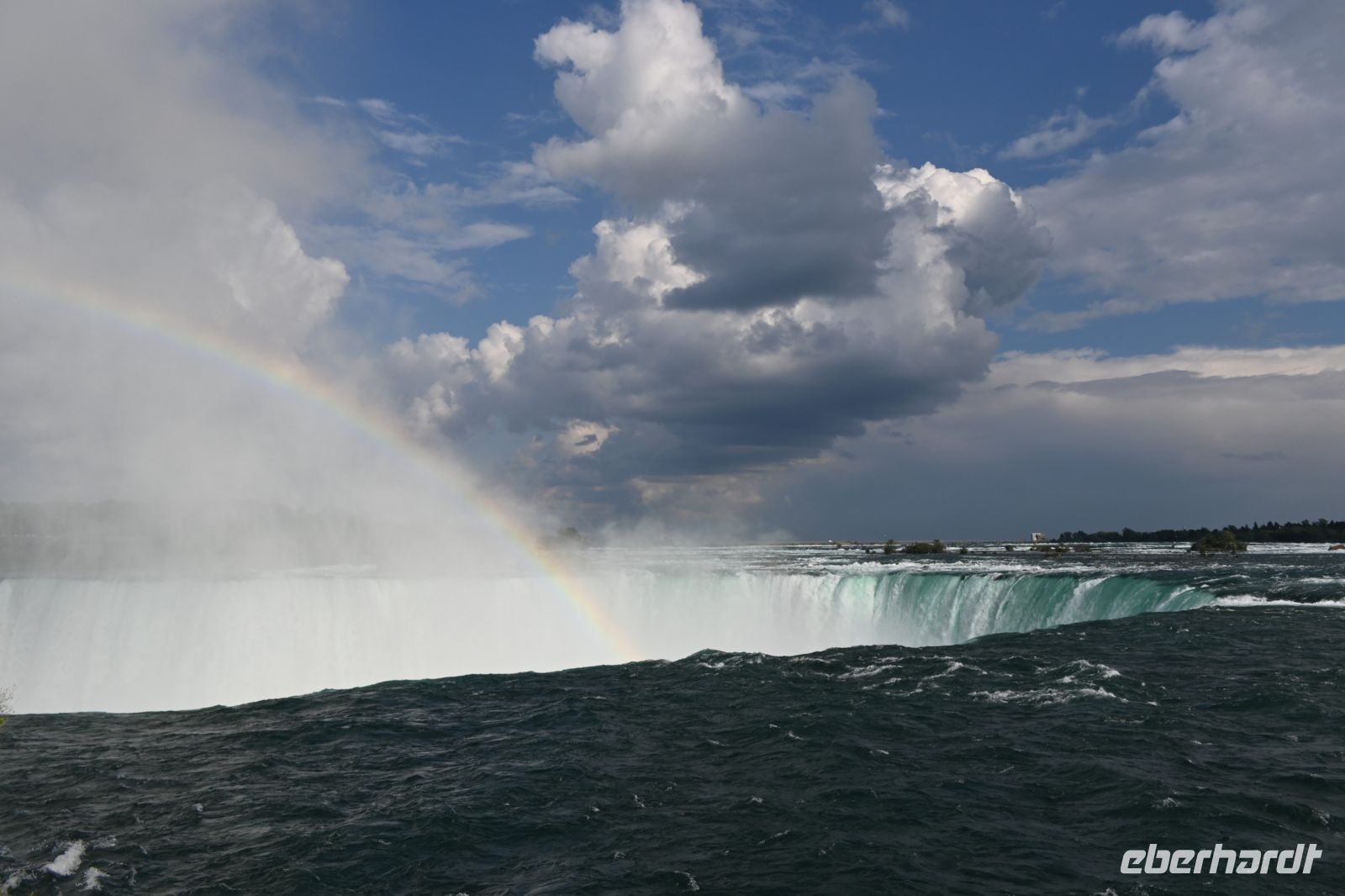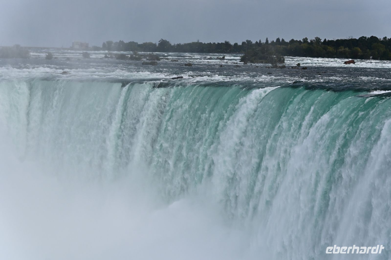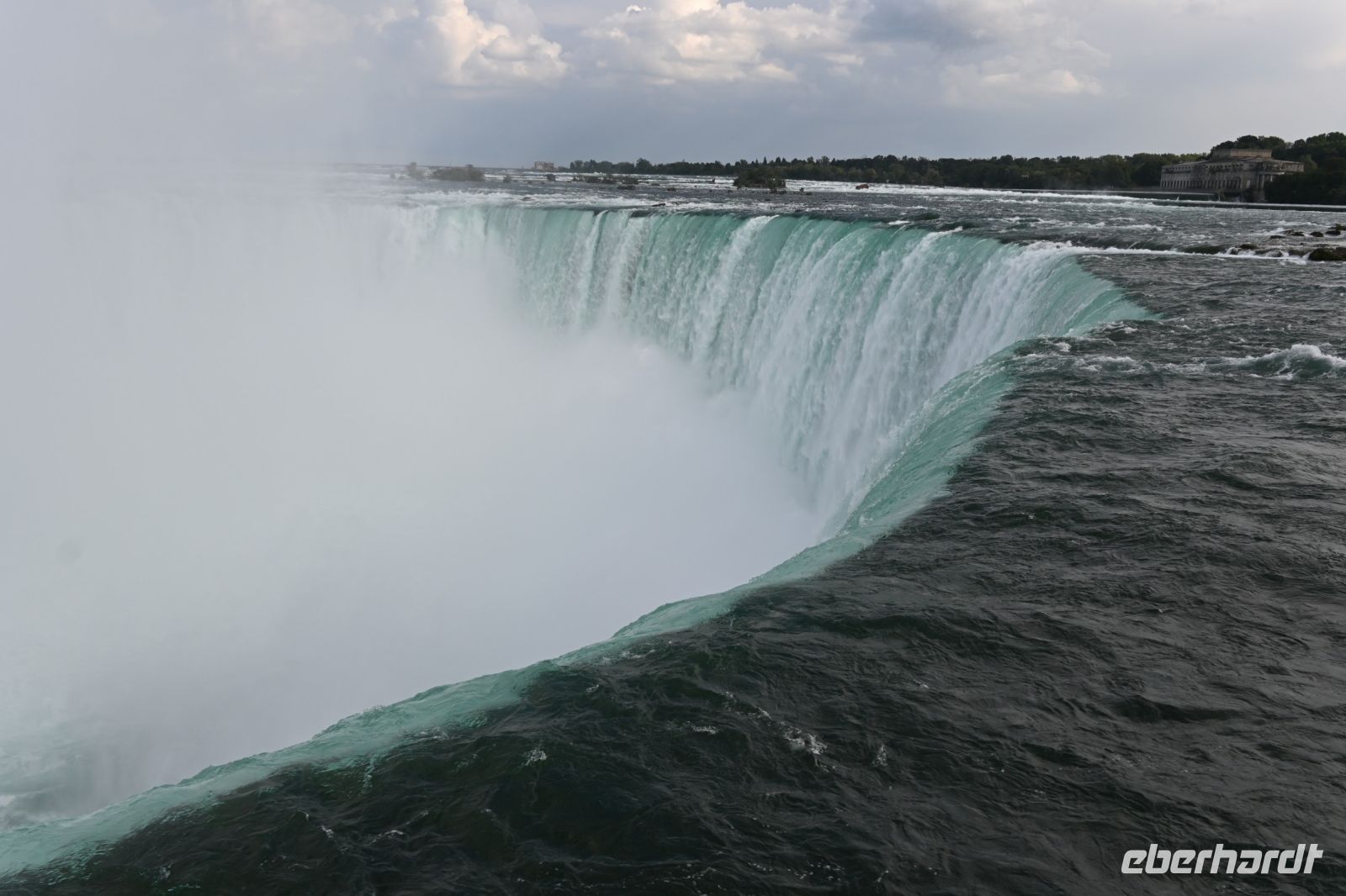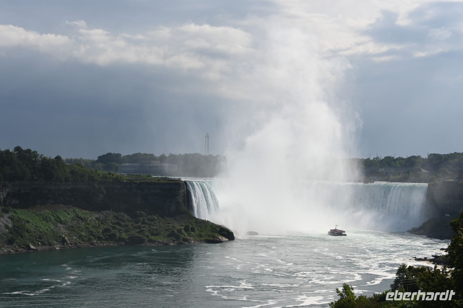 Auf unserer circa 400 Kilometer langen Strecke erzählt uns Margarith noch einiges über die Niagara Fälle. Durch die 6,4 Millionen Liter die pro Sekunde die 57 Meter nach unten stürzen, wird natürlich auch Gestein abgetragen. So kam es dazu, dass in der Nacht und im Winter 50% des Wassers über die Kraftwerke geleitet und Strom erzeugt wird. Seit der Entstehung vor rund 11.000 Jahren haben sich die Fälle schon elf Kilometer in Richtung Eriesee bewegt, 28 Kilometer ist der Fluss noch vom See entfernt. Damit bleibt uns noch etwas Zeit dieses Naturschauspiel zu bewundern.