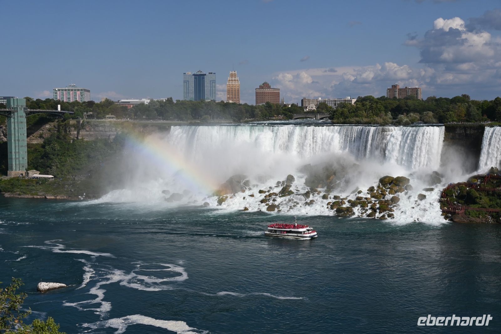 Wir erreichen Niagara Falls am frühen Nachmittag. Die Stadt wurde seit Mitte der 1800 rein für den Tourismus erbaut und finanziert sich auch nur dadurch. Über den Fahrstuhl erreichen wir das Ufer, werden mit einem roten Cape ausgestattet und gehen aufs Schiff. Vorbei an den American Falls, stehen wir schnell in der Gischt der Niagara Falls. Margarith sagt: „Man muss die Fälle sehen, riechen, spüren und auch schmecken.“ Während der Bootsfahrt machen wir das definitiv. Die Kraft, die man hier spürt ist überwältigend. Zum Glück scheint die Sonne und wir sind schnell wieder trocken.