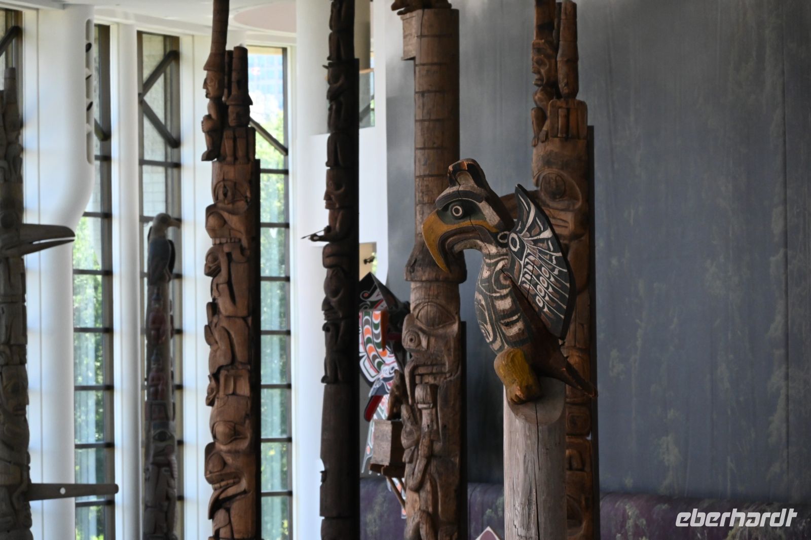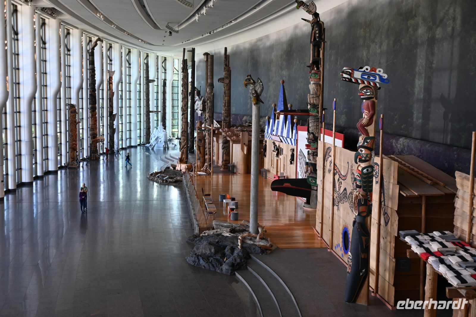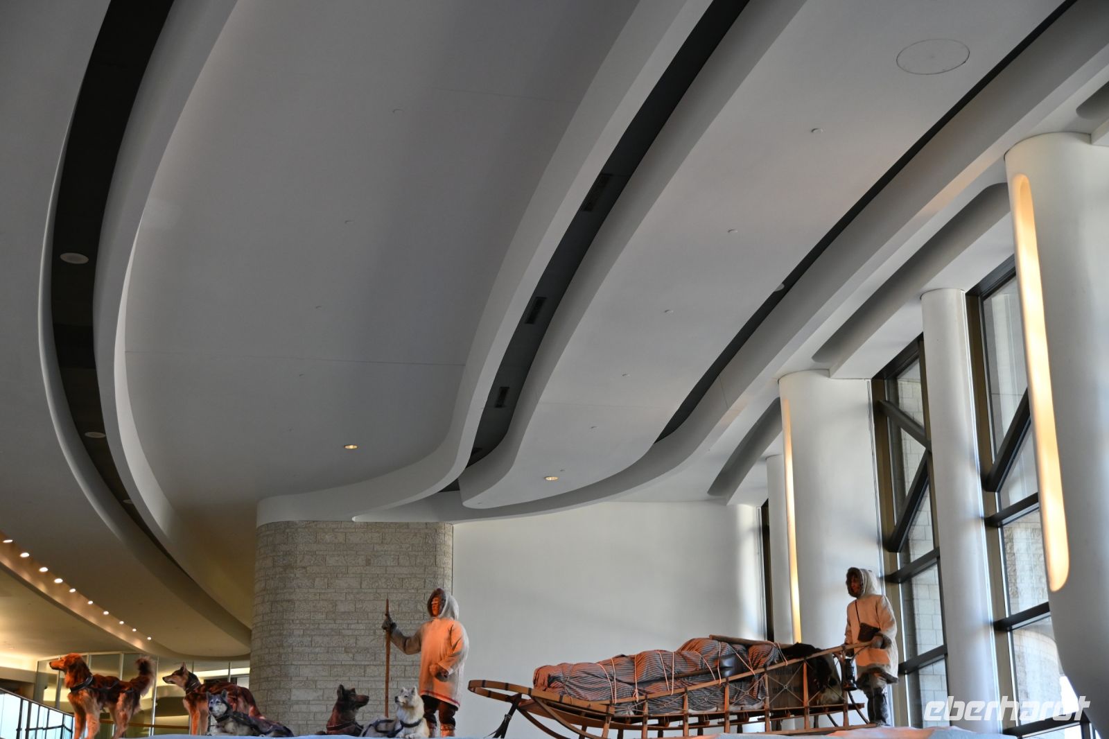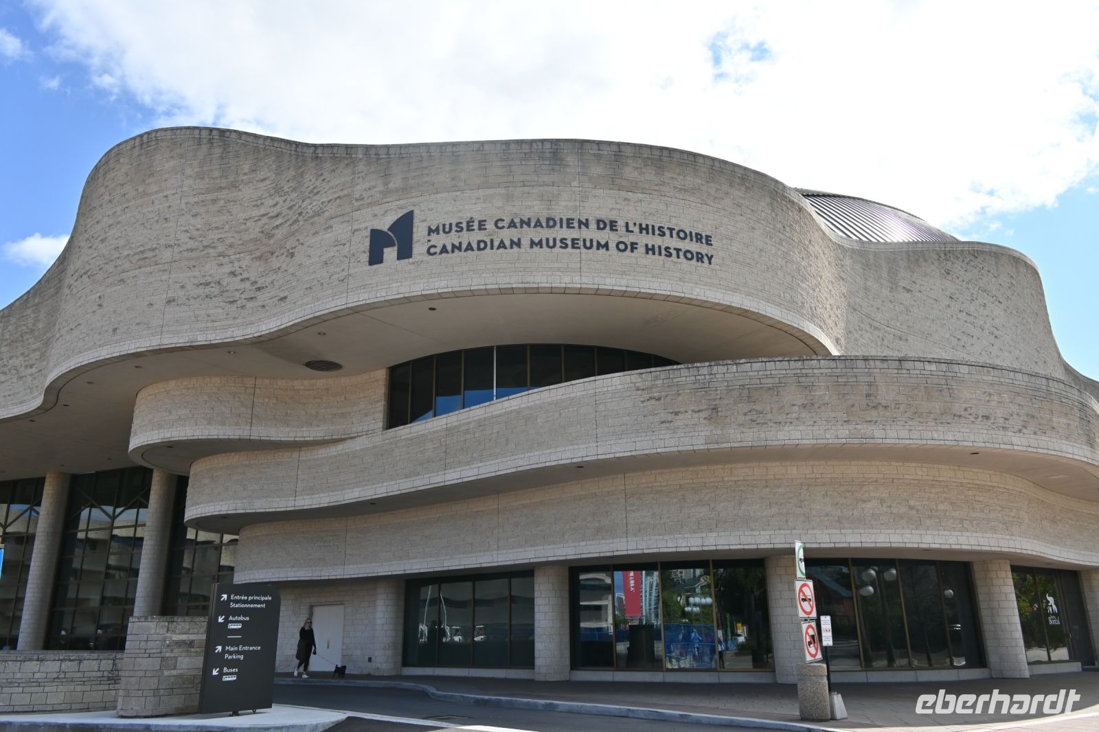 Unseren ersten Stopp machen wir in der Zwillingsstadt Gatineau, auf der anderen Flussseite, am Museum der kanadischen Geschichte. Einen Teil der Ausstellung kann man sich kostenfrei ansehen. Für das ganze Museum brauch man sicher einen halben Tag. Hier sind originale Totempfähle der Ureinwohner ausgestellt. Jedoch gab es diese lediglich an der Westküste, nicht hier im Osten.