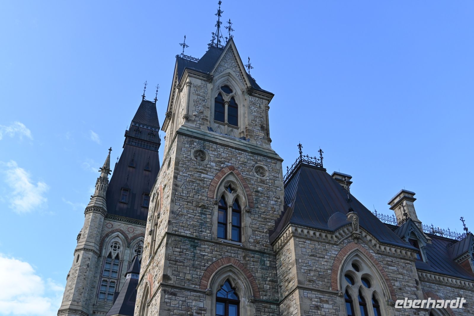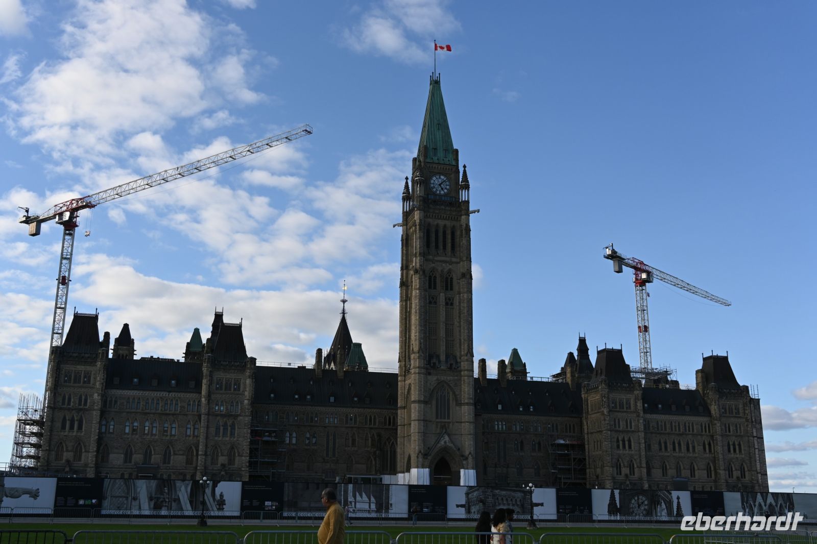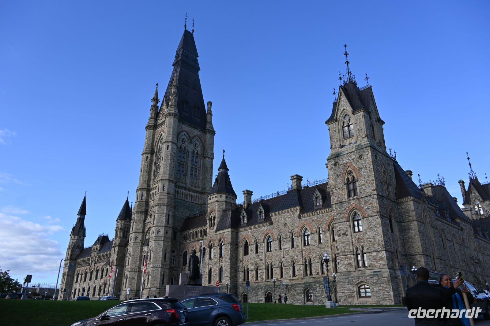 Anschließend machen wir mit dem Bus eine Tour durch die Stadt. Besonders auffällig ist hier vorfallen der Parliament Hill, der oft schon von Weitem zu sehen ist. Der gesamte Parlamentsbezirk am Ufer der Ottawa Fluss ist knapp neun Hektar groß und umfasst viele Gebäude. Am ausfälligsten von alles ist der Peace Tower im neogotischen Stil.