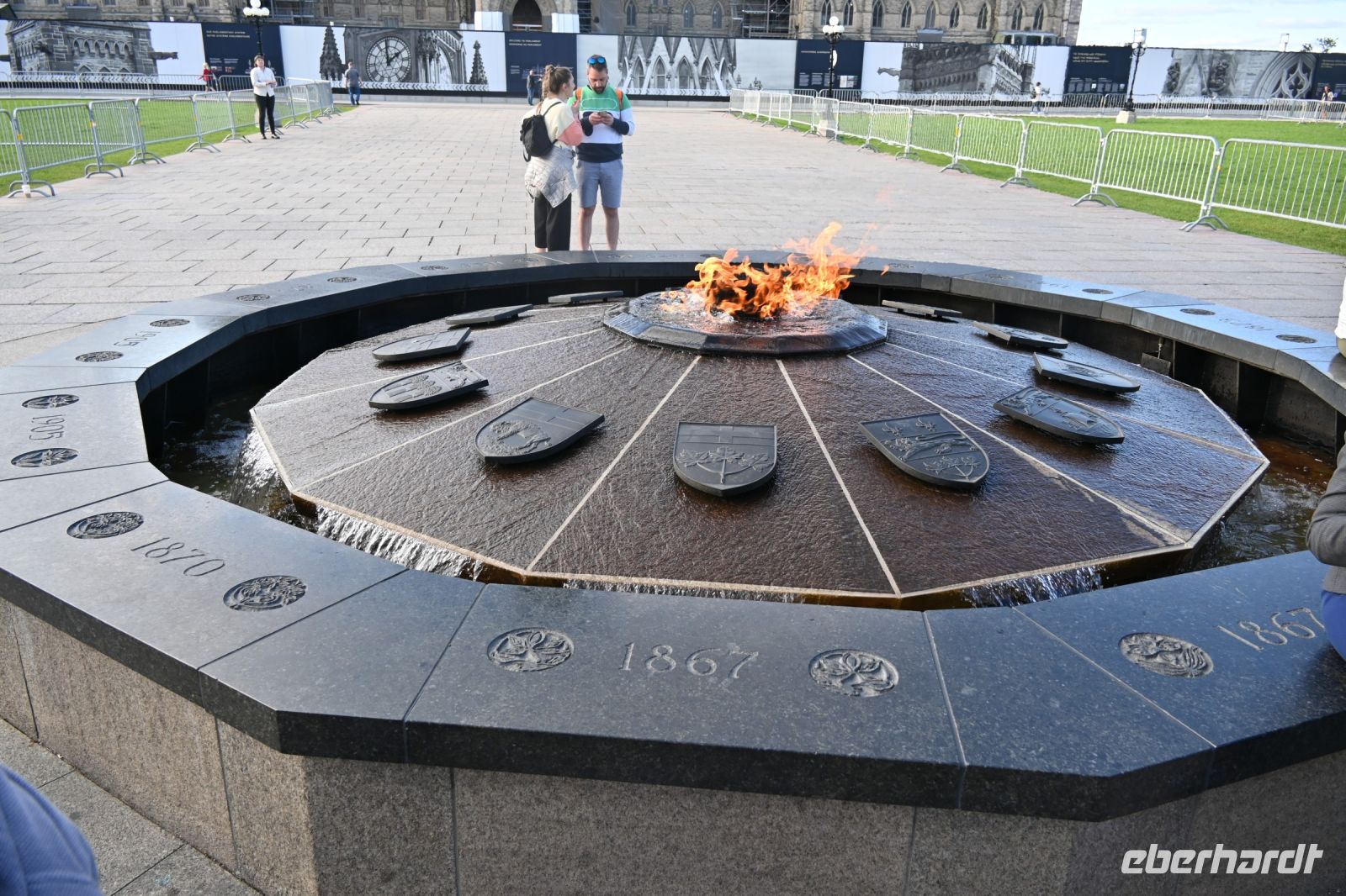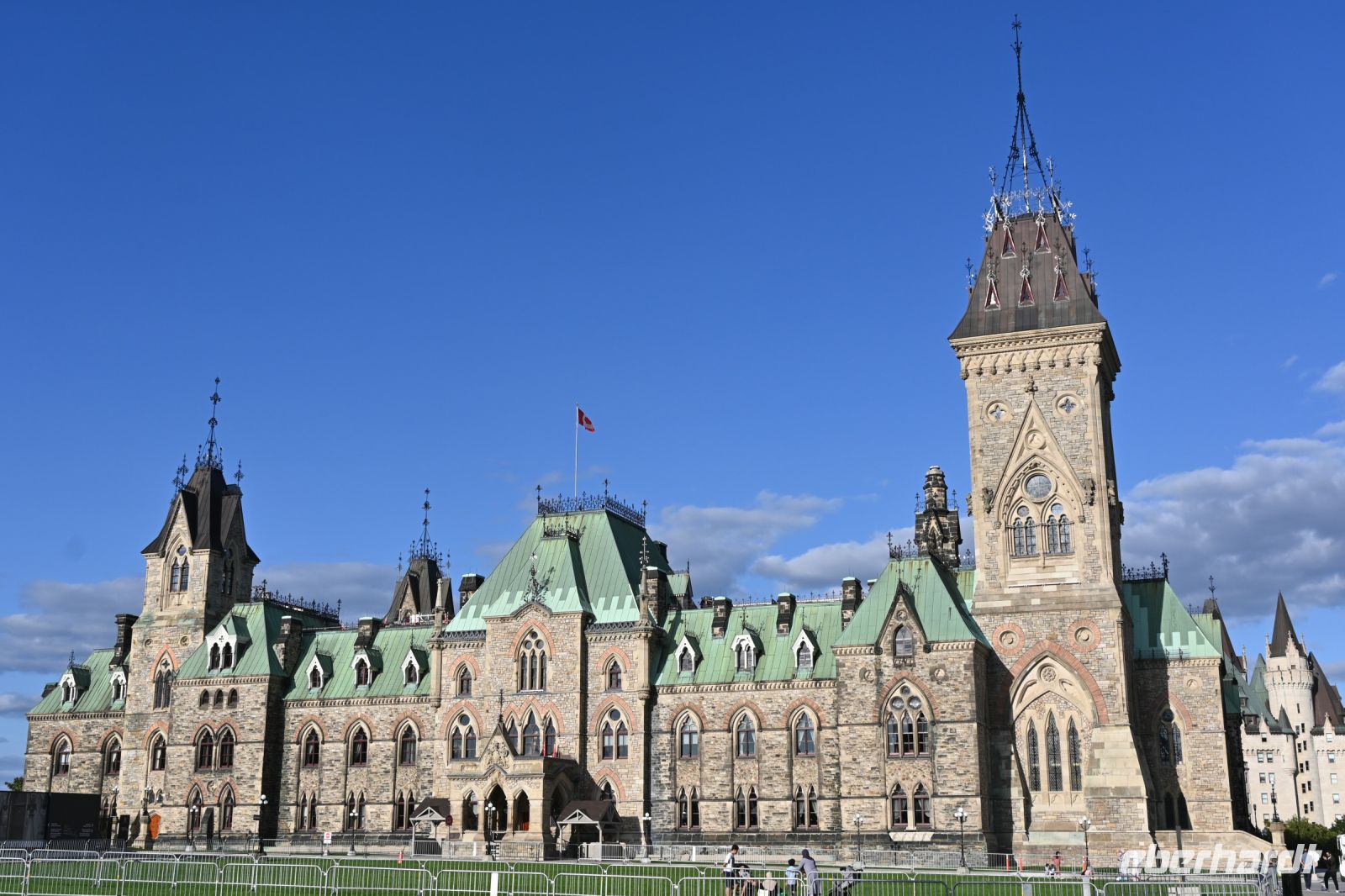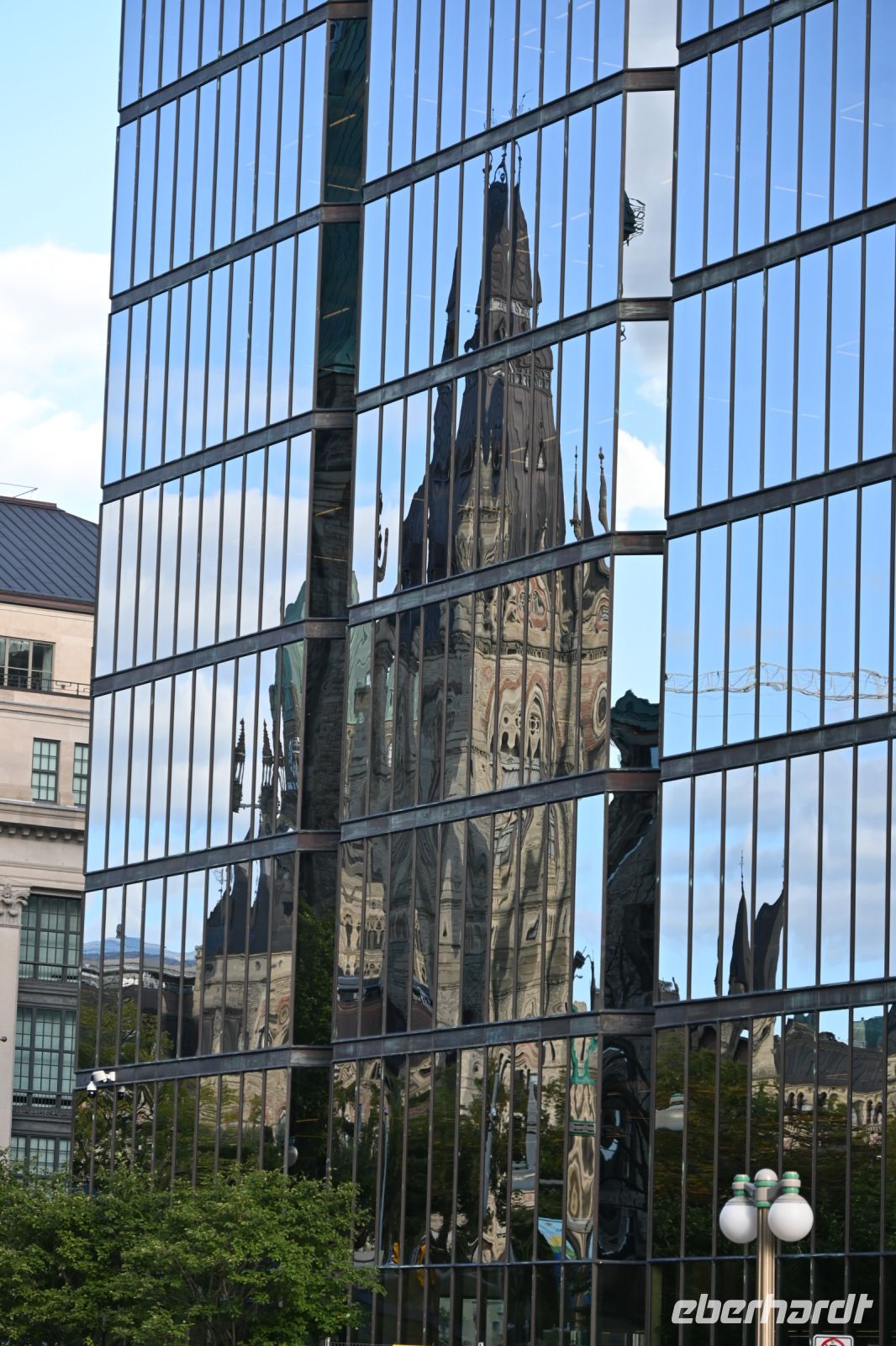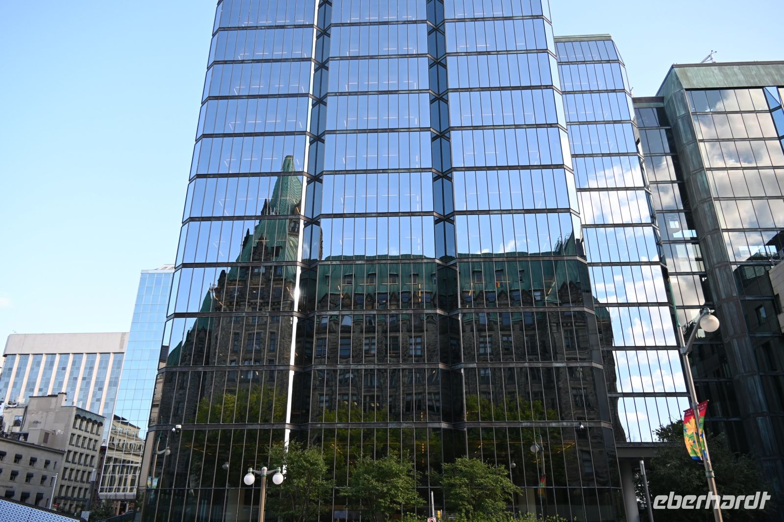Anschließend machen wir mit dem Bus eine Tour durch die Stadt. Besonders auffällig ist hier vorfallen der Parliament Hill, der oft schon von Weitem zu sehen ist. Der gesamte Parlamentsbezirk am Ufer der Ottawa Fluss ist knapp neun Hektar groß und umfasst viele Gebäude. Am ausfälligsten von alles ist der Peace Tower im neogotischen Stil.