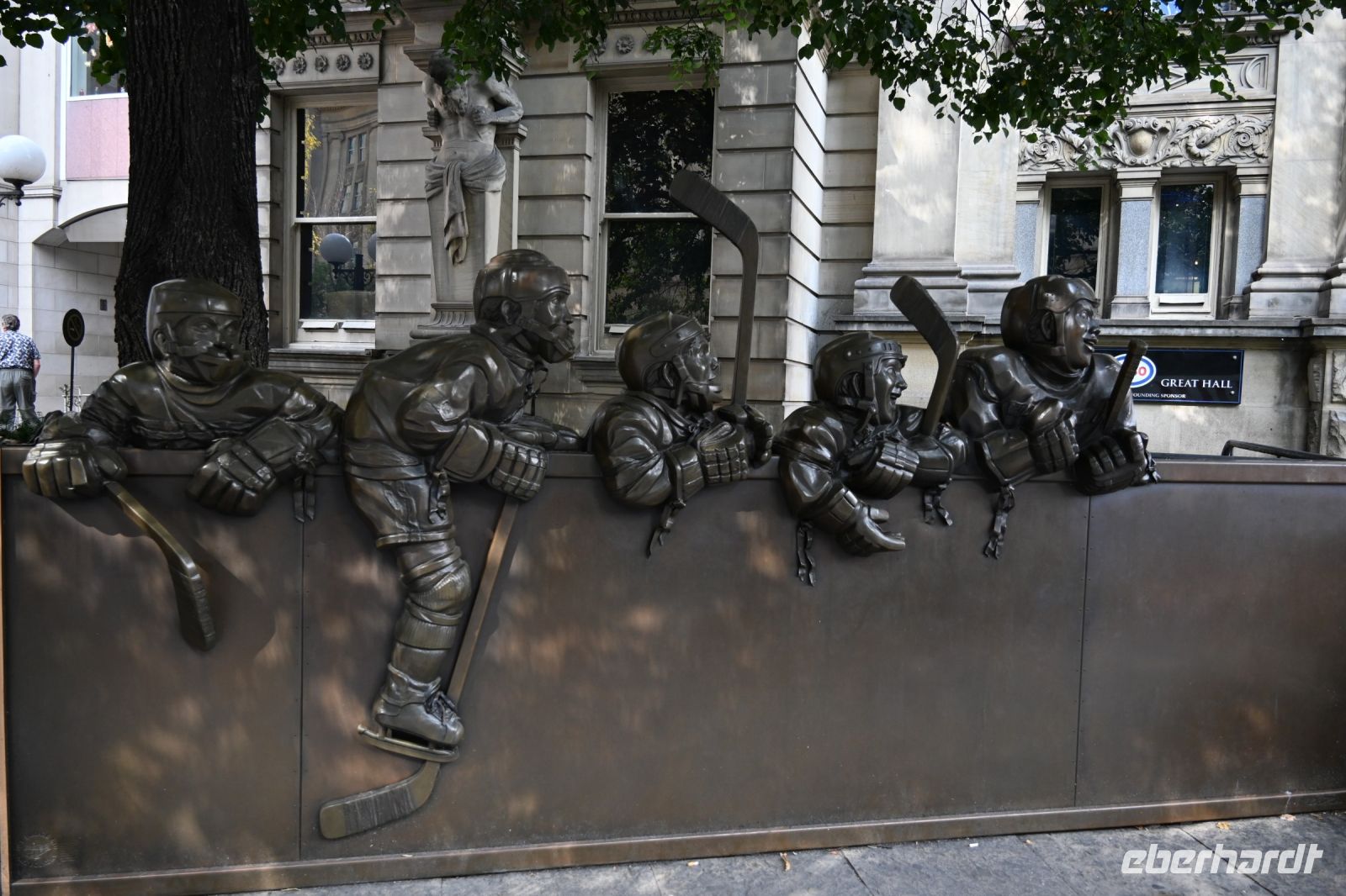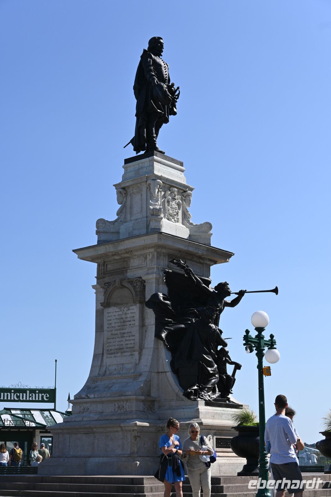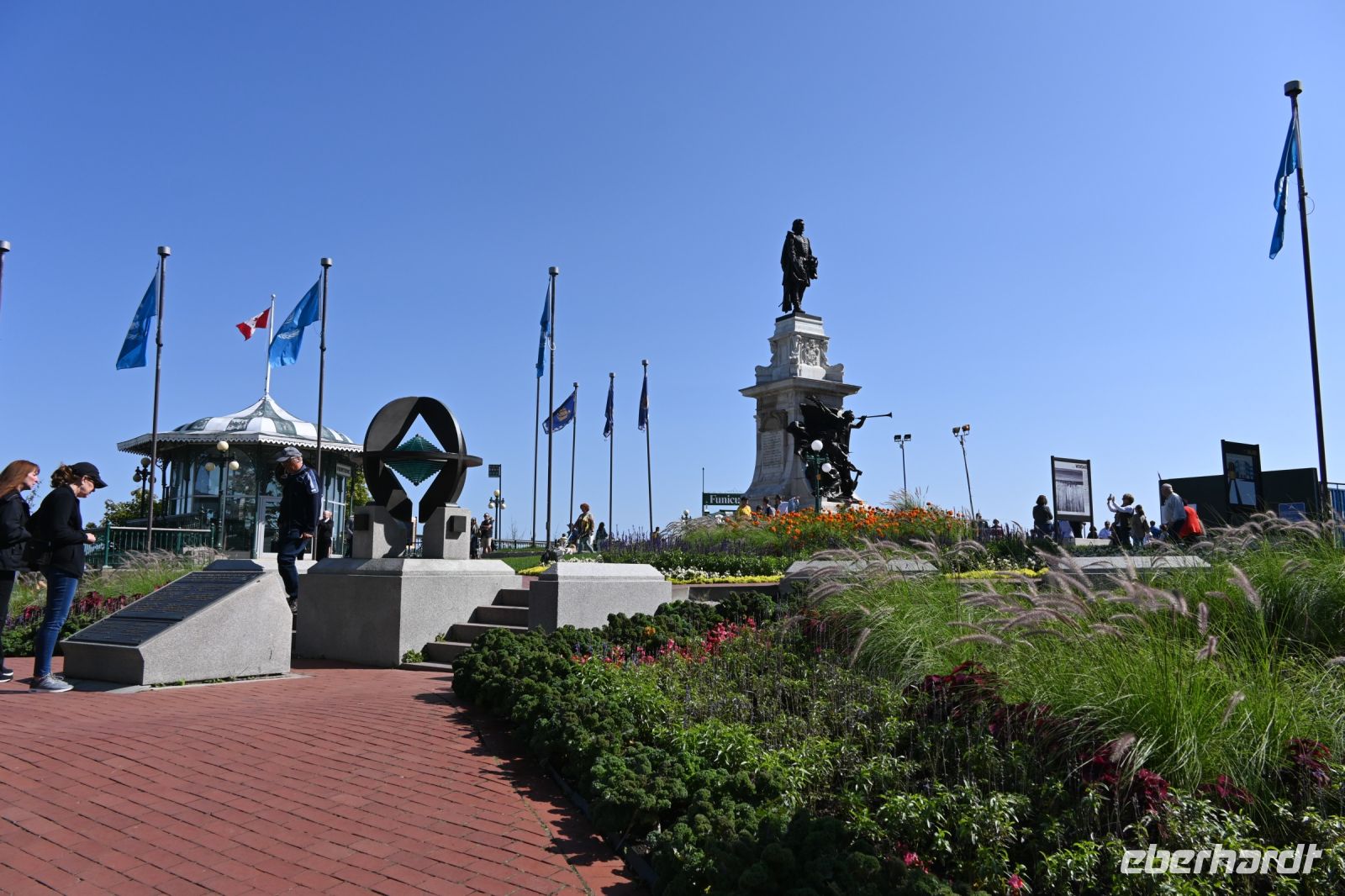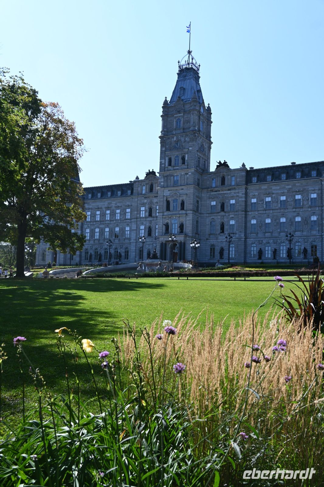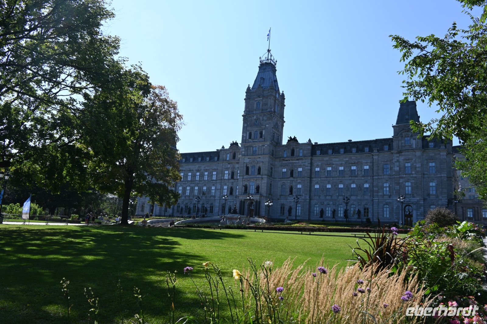 11.30 Uhr erreichen wir Quebec. Den schönen Ort müssen wir leider im Schnelldurchlauf erkunden. Auch hier darf Margarith nicht führen und wir sammeln Christine in der Stadt auf. Einen Fotostopp gibt es am Parlamentsgebäude. Die 26 Bronzestatuen an der Fassade erinnern an Schlüsselfiguren der Geschichte. Entlang der Stadtmauer geht es weiter, diese macht Quebec mit einer Länge von 4,5 Kilometern zur einzigen befestigten Stadt in Nordamerika. Damit wurde sie auch von der UNESCO zum Welterbe erklärt.