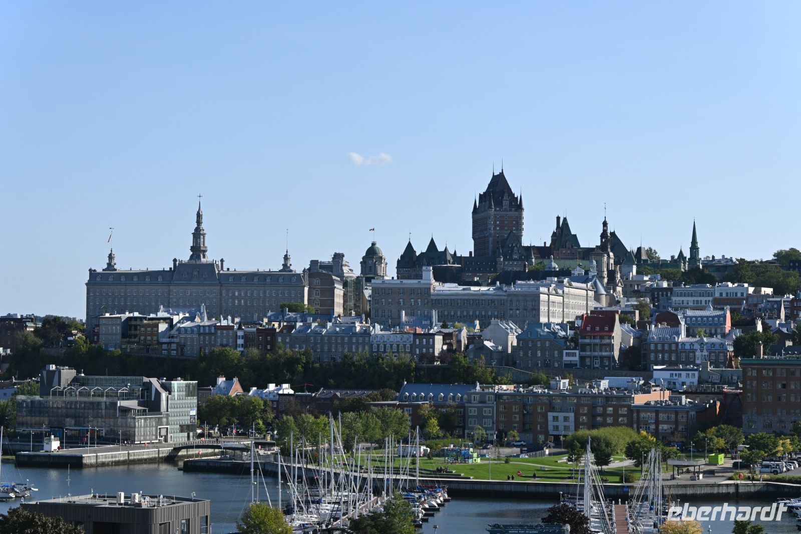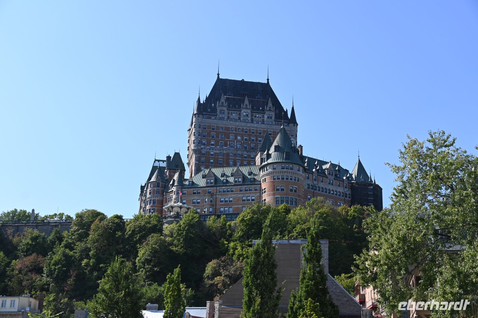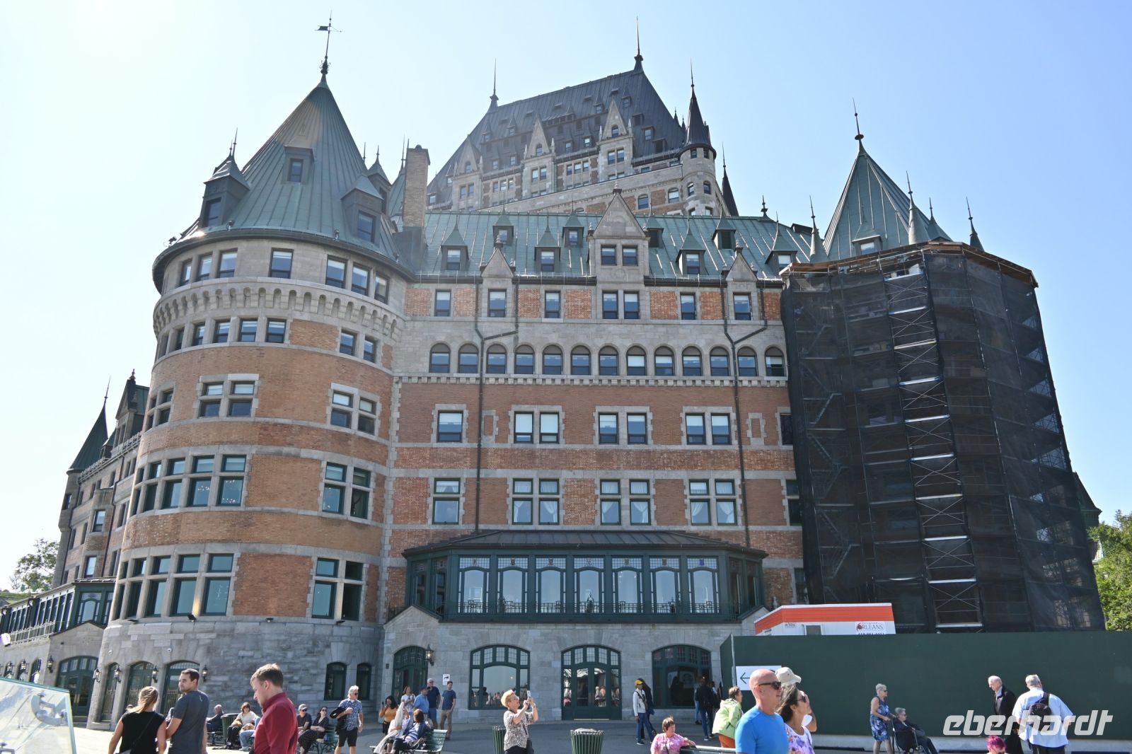 Hoch oben thront das Chateau Fontenac, Name und Aussehen lassen auf ein Schloss schließen, ist aber seit dem Bau vor 125 Jahren ein Gasthaus in dem sich Stars, Politiker, Royals und jeder der dazugehören möchte, die Klinke in die Hand geben. Christine ist froh, dass sie uns das Hotel aus der Nähe zeigen kann, denn bis vor einer Woche ist die Straße noch für Busse gesperrt. Da es anscheinend noch nicht zu alle durchgedrungen ist, bekommen wir hier gleich einen Parkplatz. Das normales Doppelzimmer mit Frühstück kostet für eine Nacht circa 600 Euro. Bei gesamt 610 Zimmern kann man sich natürlich auch für eine Suite entscheiden.