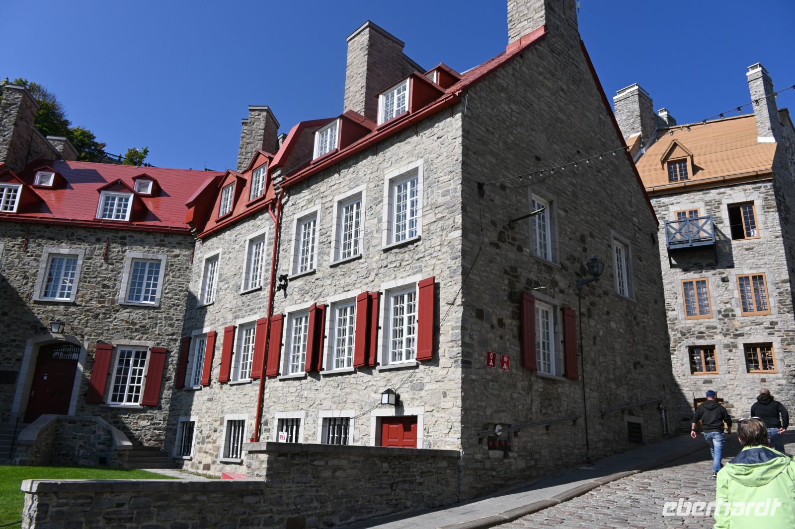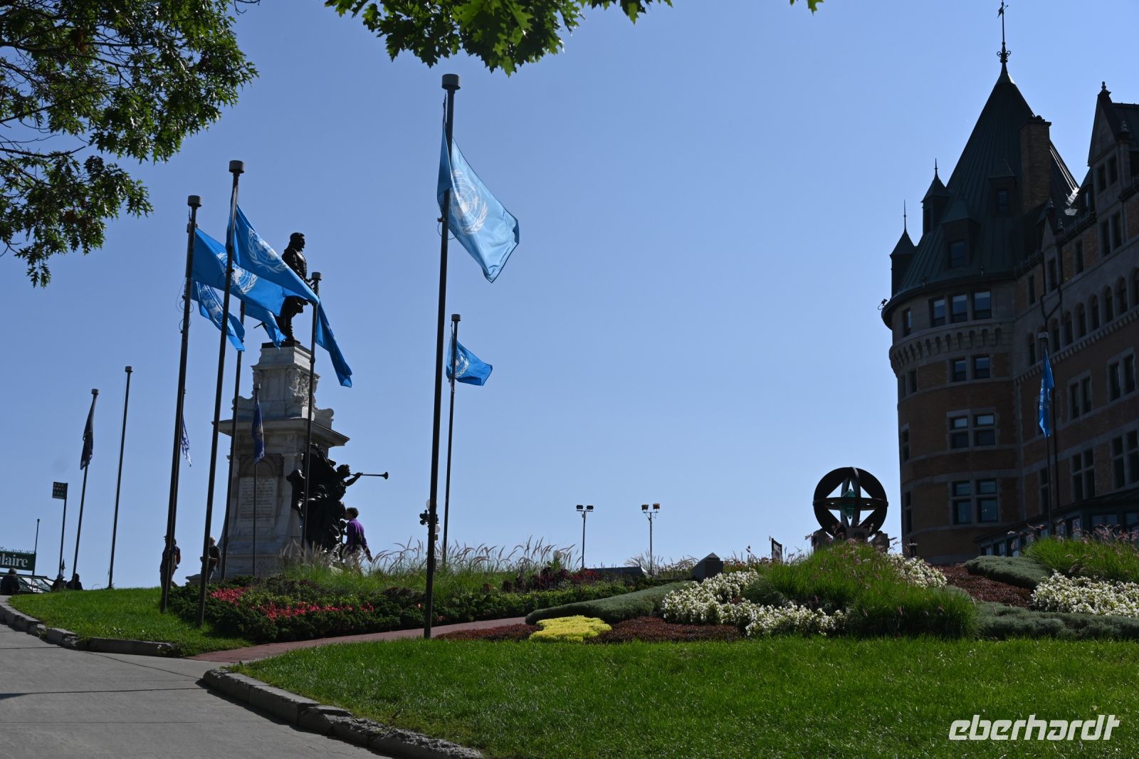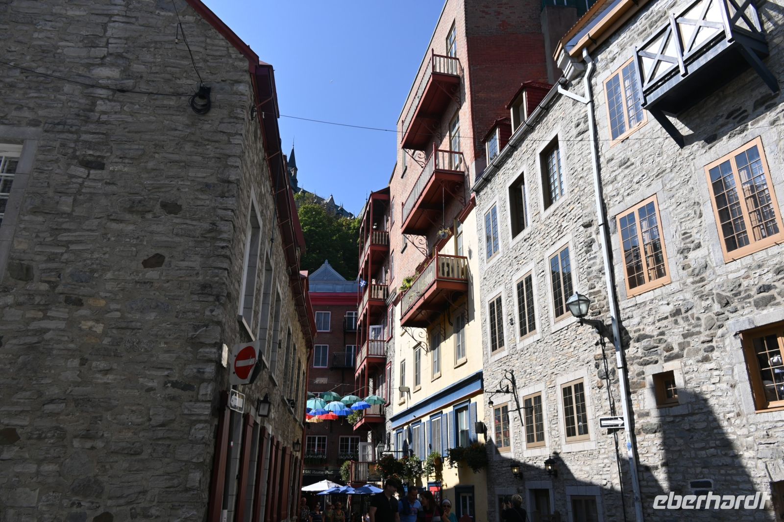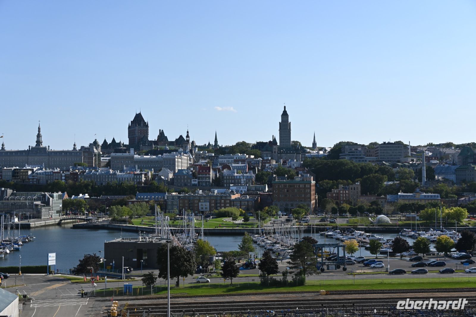 Hoch oben thront das Chateau Fontenac, Name und Aussehen lassen auf ein Schloss schließen, ist aber seit dem Bau vor 125 Jahren ein Gasthaus in dem sich Stars, Politiker, Royals und jeder der dazugehören möchte, die Klinke in die Hand geben. Christine ist froh, dass sie uns das Hotel aus der Nähe zeigen kann, denn bis vor einer Woche ist die Straße noch für Busse gesperrt. Da es anscheinend noch nicht zu alle durchgedrungen ist, bekommen wir hier gleich einen Parkplatz. Das normales Doppelzimmer mit Frühstück kostet für eine Nacht circa 600 Euro. Bei gesamt 610 Zimmern kann man sich natürlich auch für eine Suite entscheiden.