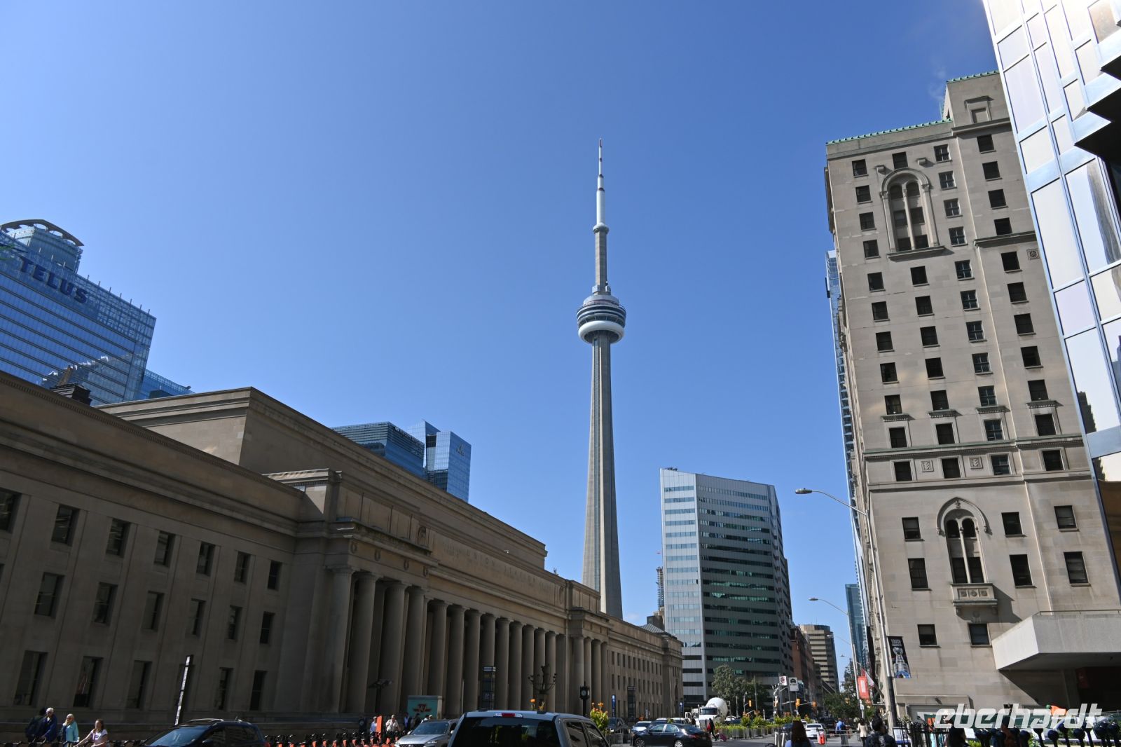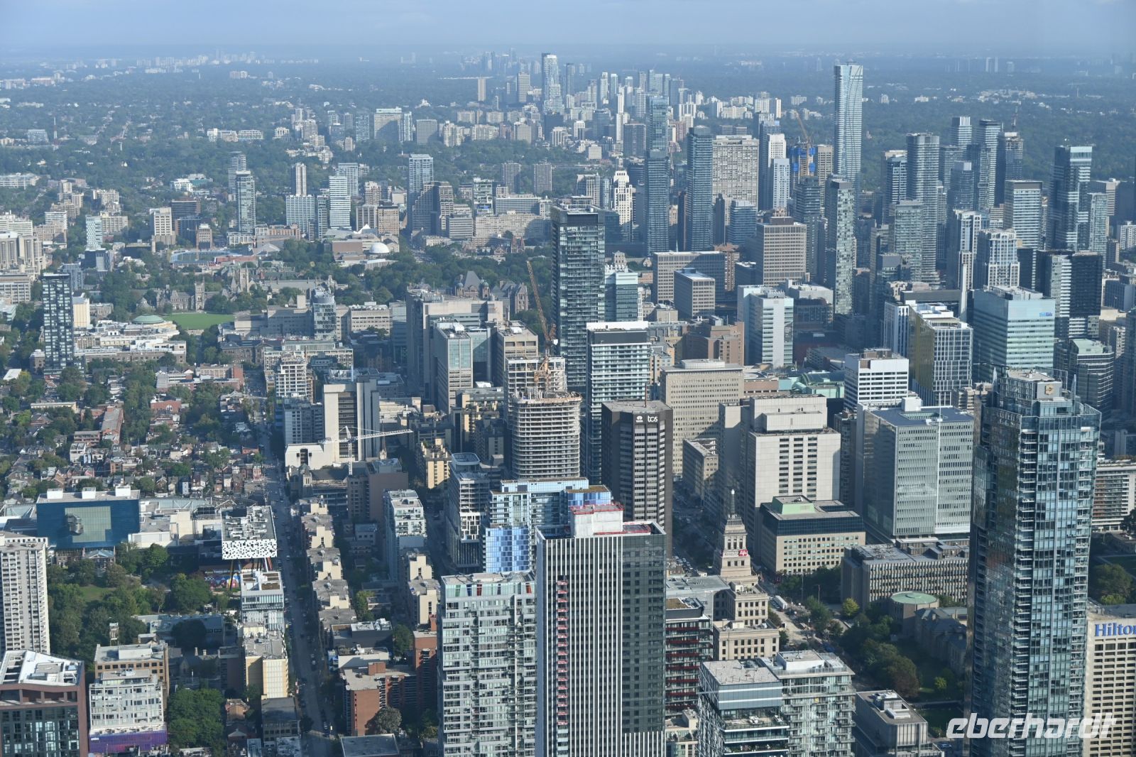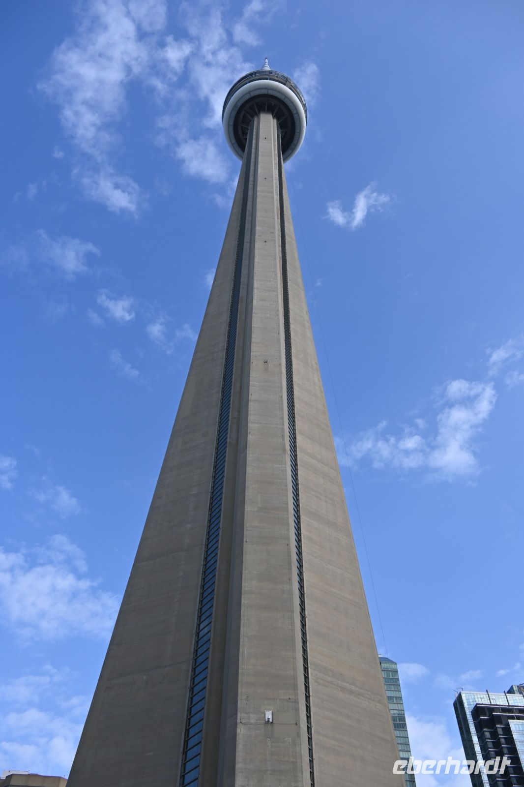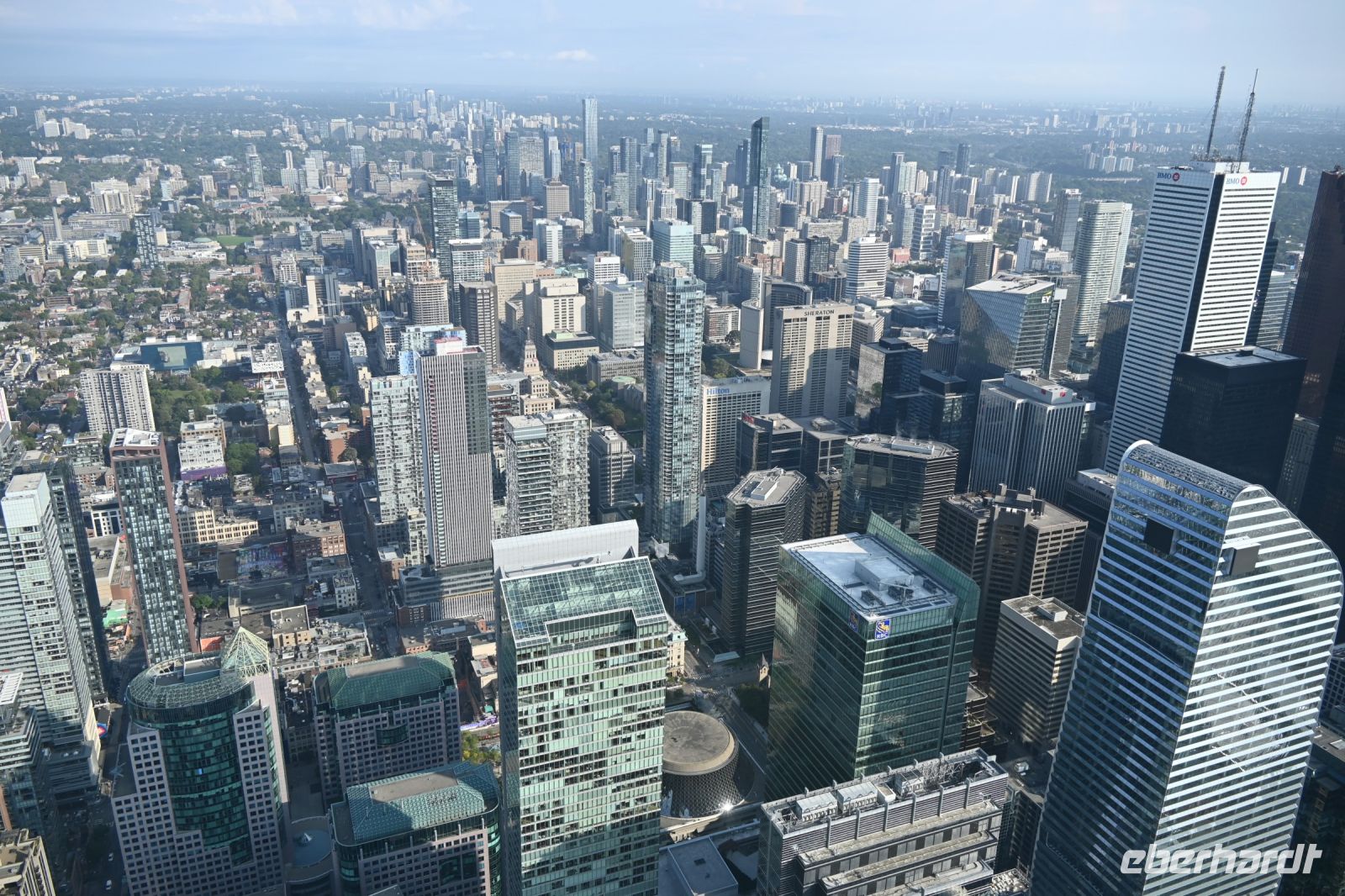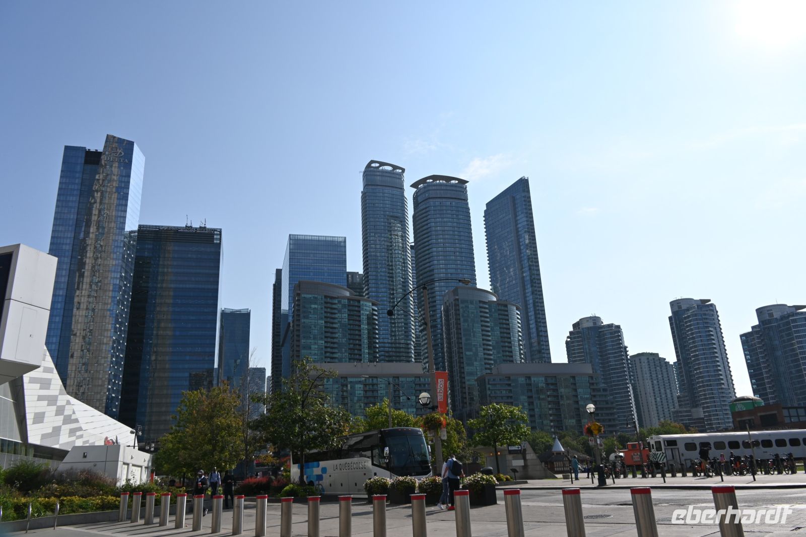 Wir starten unsere Rundfahrt durch Kanadas bevölkerungsreichste Stadt Kanadas. Von 37 Millionen Einwohnern leben hier knapp 3 Millionen. Hier hat sich das seit 1970 das Wirtschaftszentrum des Landes entwickelt und die Stadt ist immer mehr in die Höhe gewachsen. Aus allem heraus sticht der CN Tower. Er wurde gebaut, als immer mehr Wolkenkratzer aus der Erde wuchsen und die Einwohner in den Häusern keinen Fernsehempfang mehr hatten. Mit 553 Meter Höhe ist er das größte Bauwerk der westlichen Hemisphäre. In 58 Sekunden werden wir mit dem Aufzug auf die Aussichtsplattform gebracht. Von dort erwartet uns ein spektakulärer Blick auf die ganze Stadt. An klaren Tagen kann man hier sogar bis zu den Niagarafällen schauen. Dafür braucht man dann aber schon sehr gut Augen.