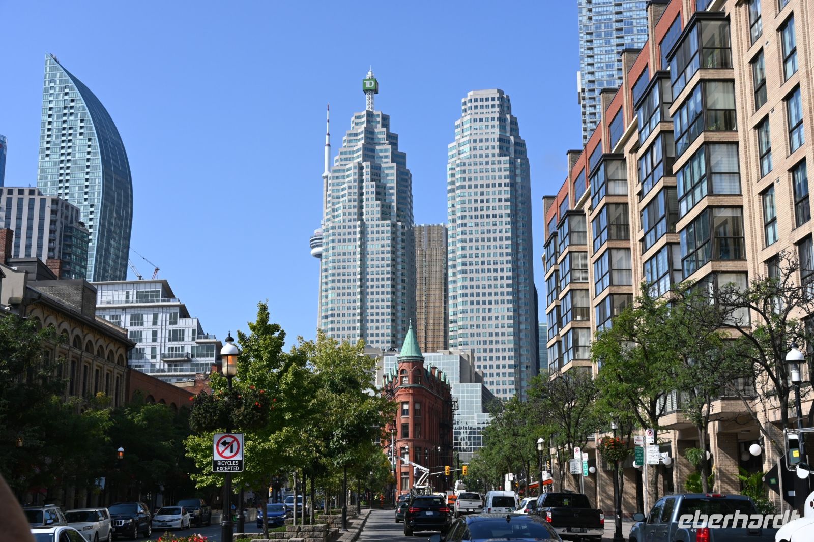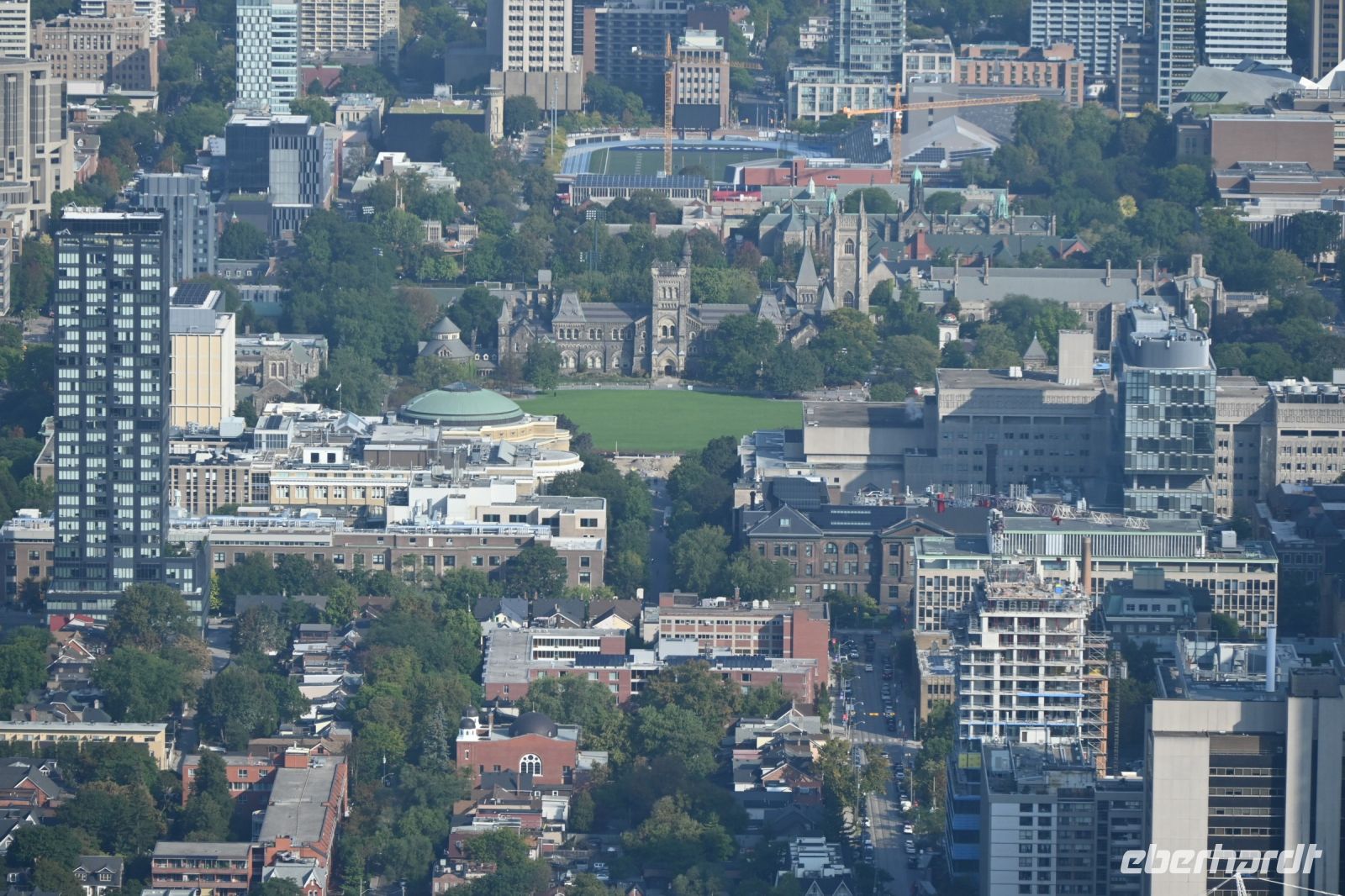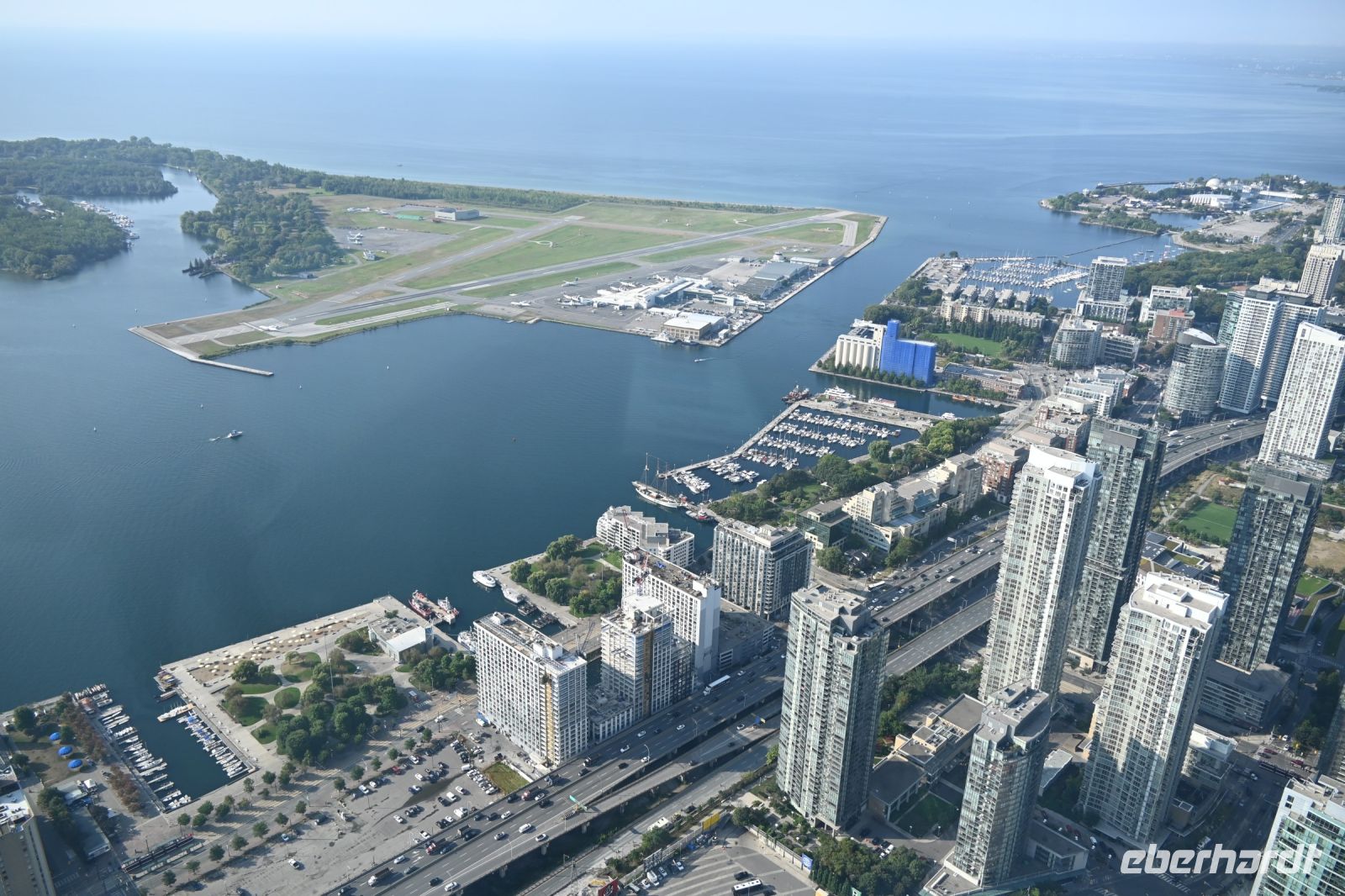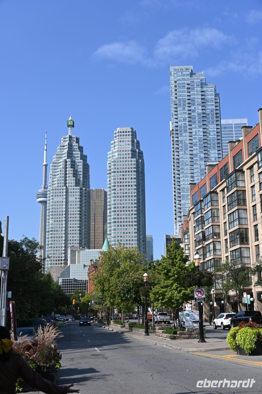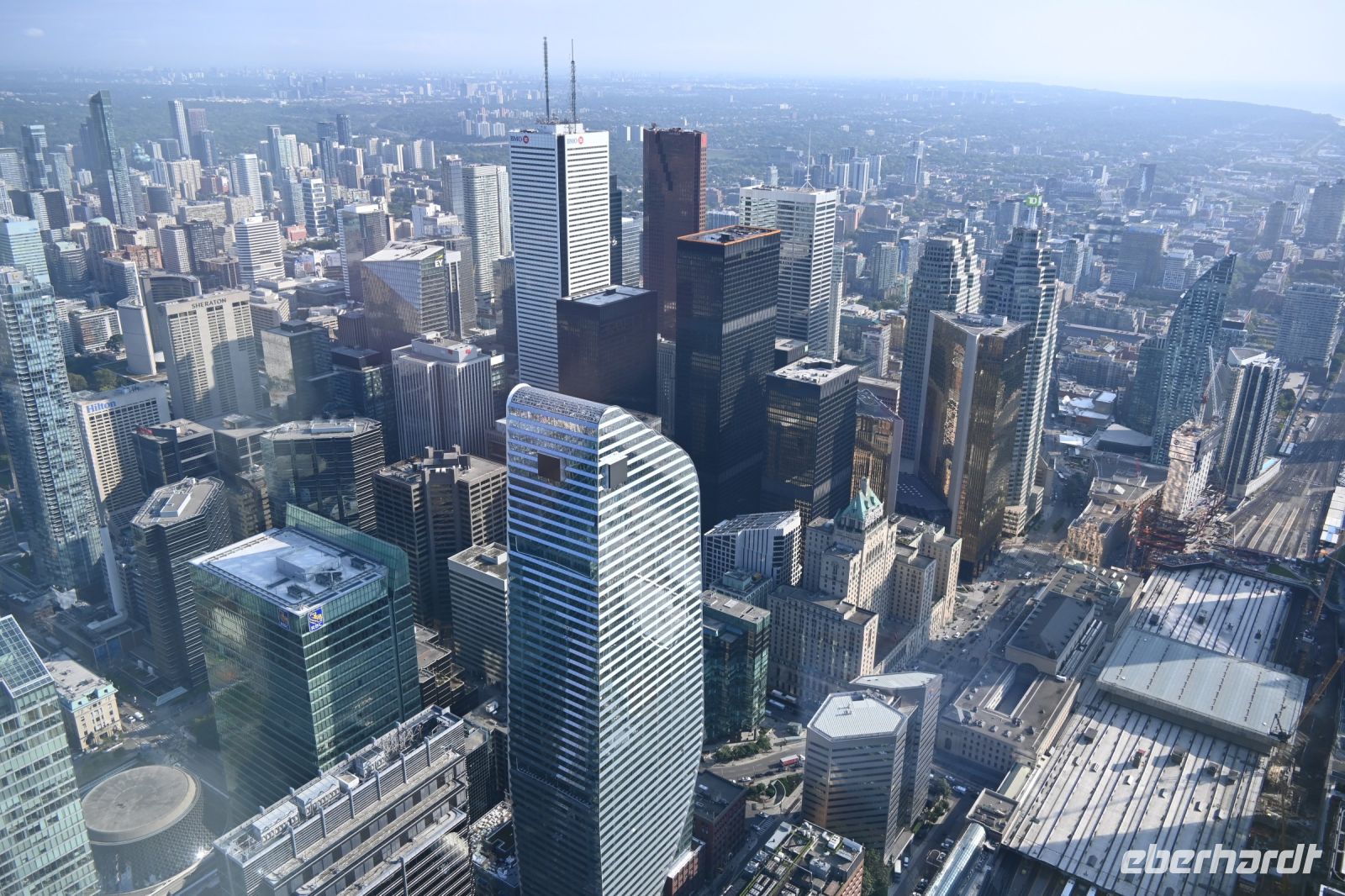 Wir starten unsere Rundfahrt durch Kanadas bevölkerungsreichste Stadt Kanadas. Von 37 Millionen Einwohnern leben hier knapp 3 Millionen. Hier hat sich das seit 1970 das Wirtschaftszentrum des Landes entwickelt und die Stadt ist immer mehr in die Höhe gewachsen. Aus allem heraus sticht der CN Tower. Er wurde gebaut, als immer mehr Wolkenkratzer aus der Erde wuchsen und die Einwohner in den Häusern keinen Fernsehempfang mehr hatten. Mit 553 Meter Höhe ist er das größte Bauwerk der westlichen Hemisphäre. In 58 Sekunden werden wir mit dem Aufzug auf die Aussichtsplattform gebracht. Von dort erwartet uns ein spektakulärer Blick auf die ganze Stadt. An klaren Tagen kann man hier sogar bis zu den Niagarafällen schauen. Dafür braucht man dann aber schon sehr gut Augen.