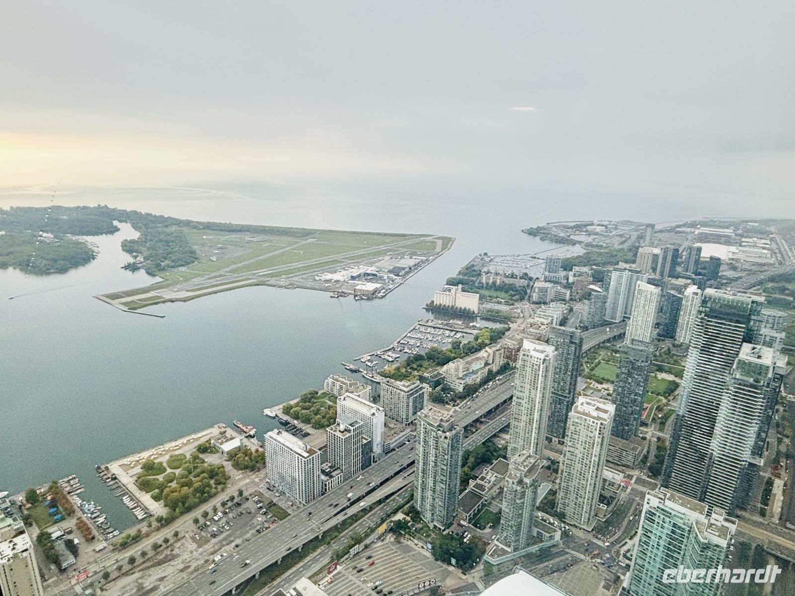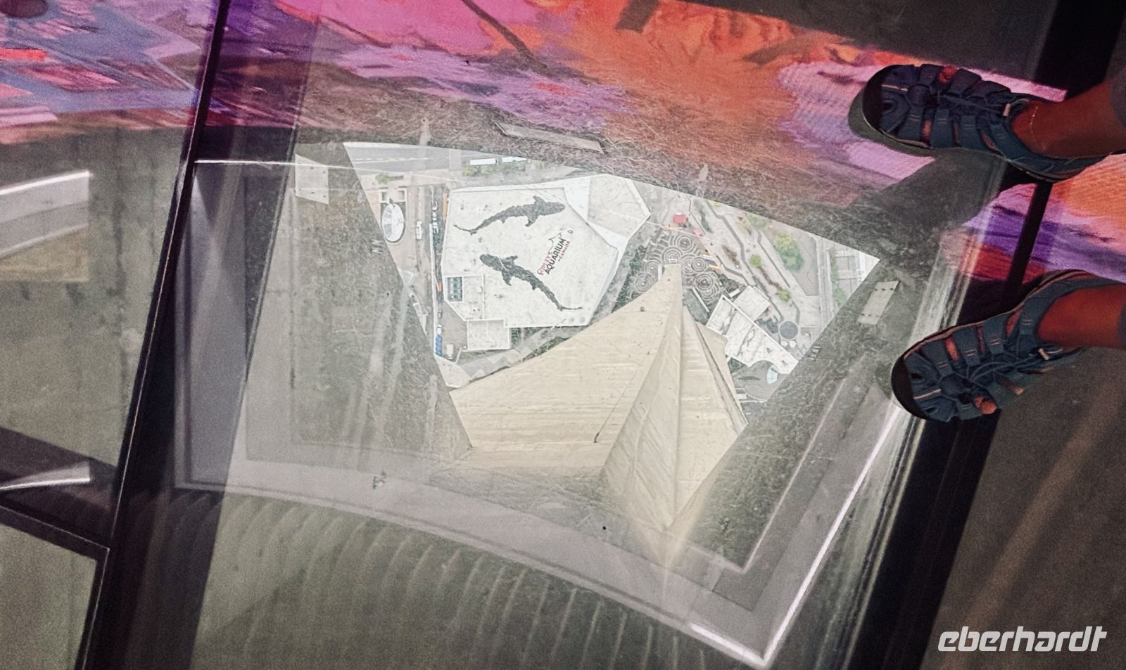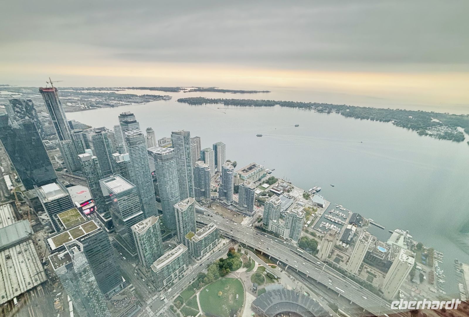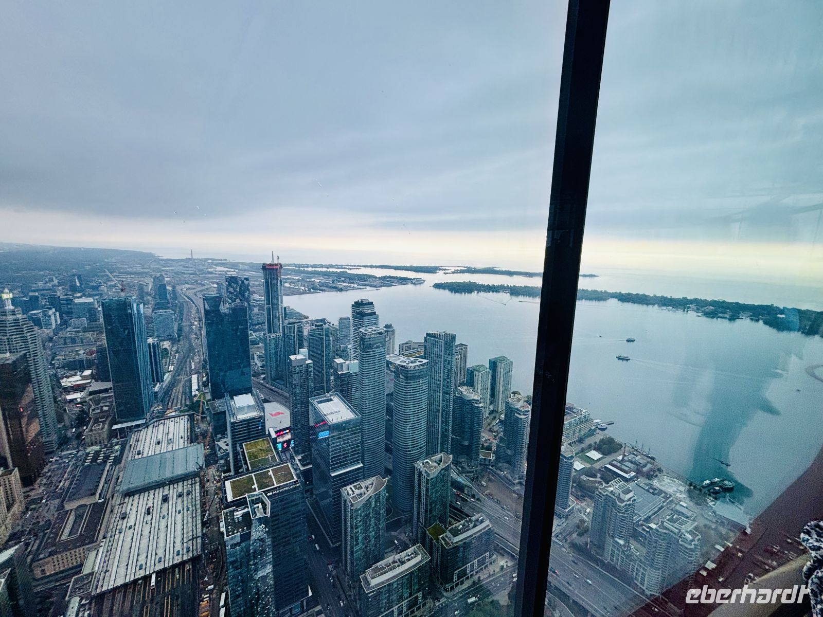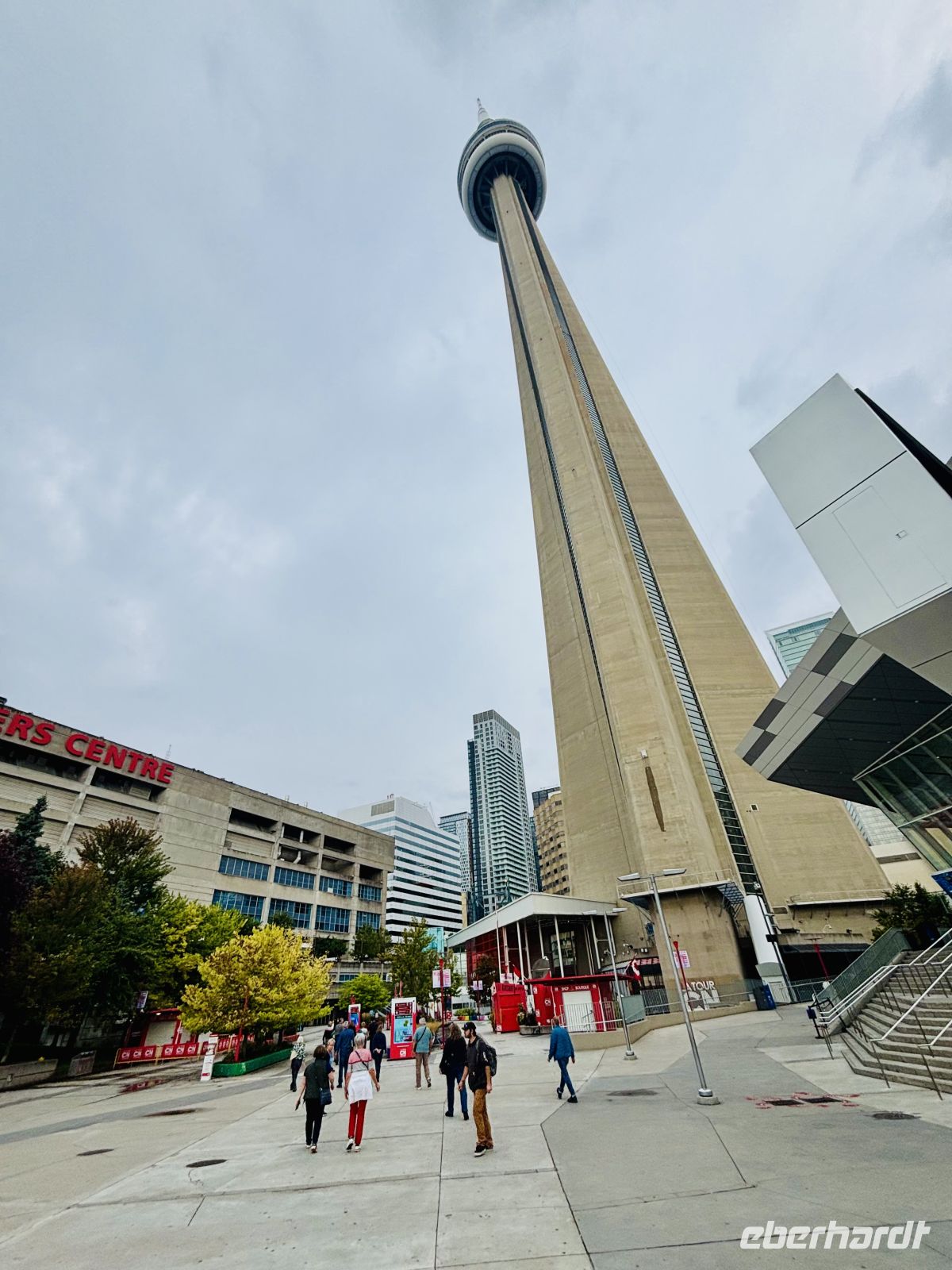 Höhepunkt unsererBesichtigungstour ist mit Sicherheit der 550 Meter hohe CN Tower, der 1976 erbaut wurde und seinen Namen der kanadischen Eisenbahngesellschaft Canadian National Railway verdankt. Wir haben Glück, außer uns sind fast keine Besucher da. Die Aufzüge und die Panoramaterrassen haben wir fast für uns alleine, keine Warteschlangen, kein Stau. Mit atemberaubender Geschwindigkeit schießen wir hinauf auf die Aussichtsplattform in fast 450 m Höhe. Ganz Wagemutige überqueren das gläserne Fußbodenareal und genießen den Blick in die Tiefe – vielleicht mit leichter Gänsehaut...?