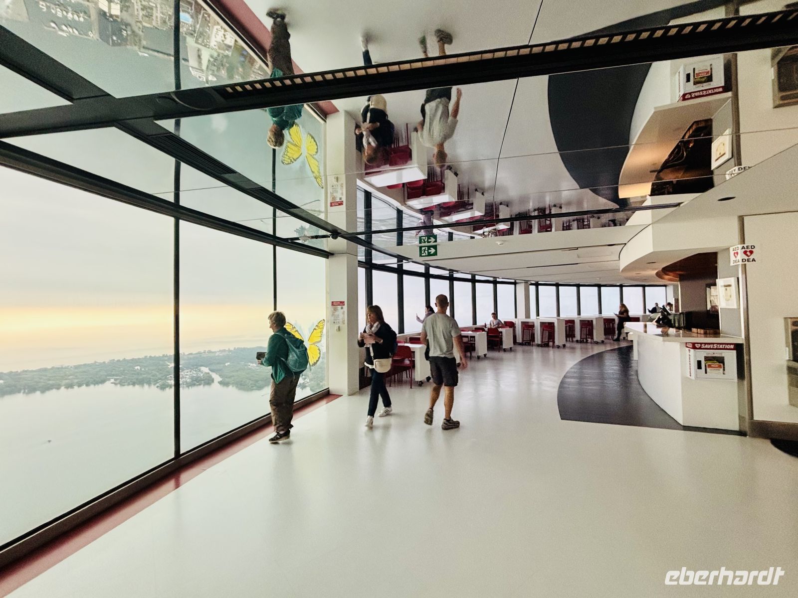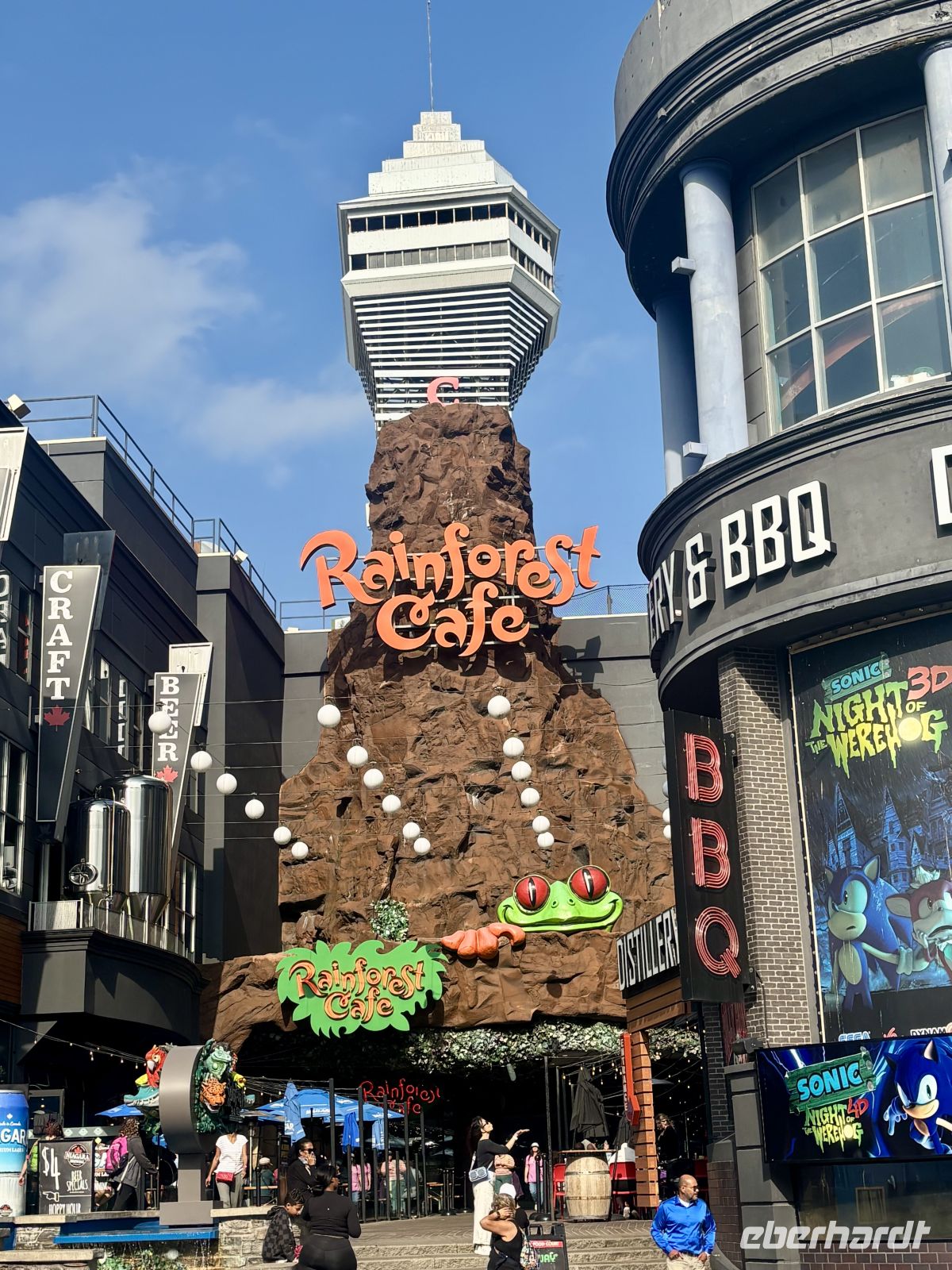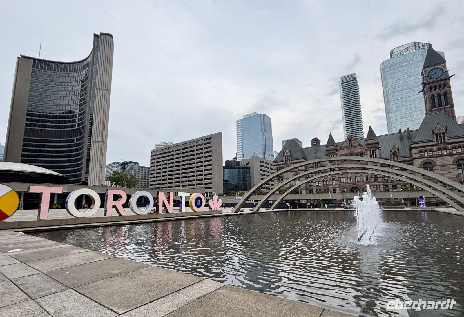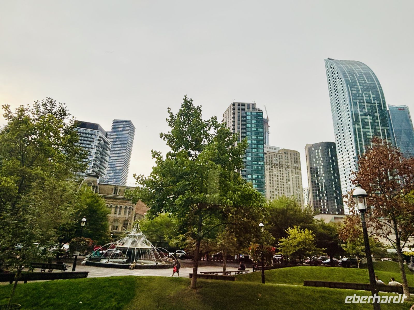 Höhepunkt unsererBesichtigungstour ist mit Sicherheit der 550 Meter hohe CN Tower, der 1976 erbaut wurde und seinen Namen der kanadischen Eisenbahngesellschaft Canadian National Railway verdankt. Wir haben Glück, außer uns sind fast keine Besucher da. Die Aufzüge und die Panoramaterrassen haben wir fast für uns alleine, keine Warteschlangen, kein Stau. Mit atemberaubender Geschwindigkeit schießen wir hinauf auf die Aussichtsplattform in fast 450 m Höhe. Ganz Wagemutige überqueren das gläserne Fußbodenareal und genießen den Blick in die Tiefe – vielleicht mit leichter Gänsehaut...?