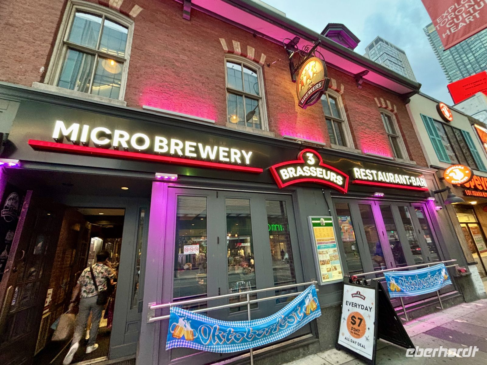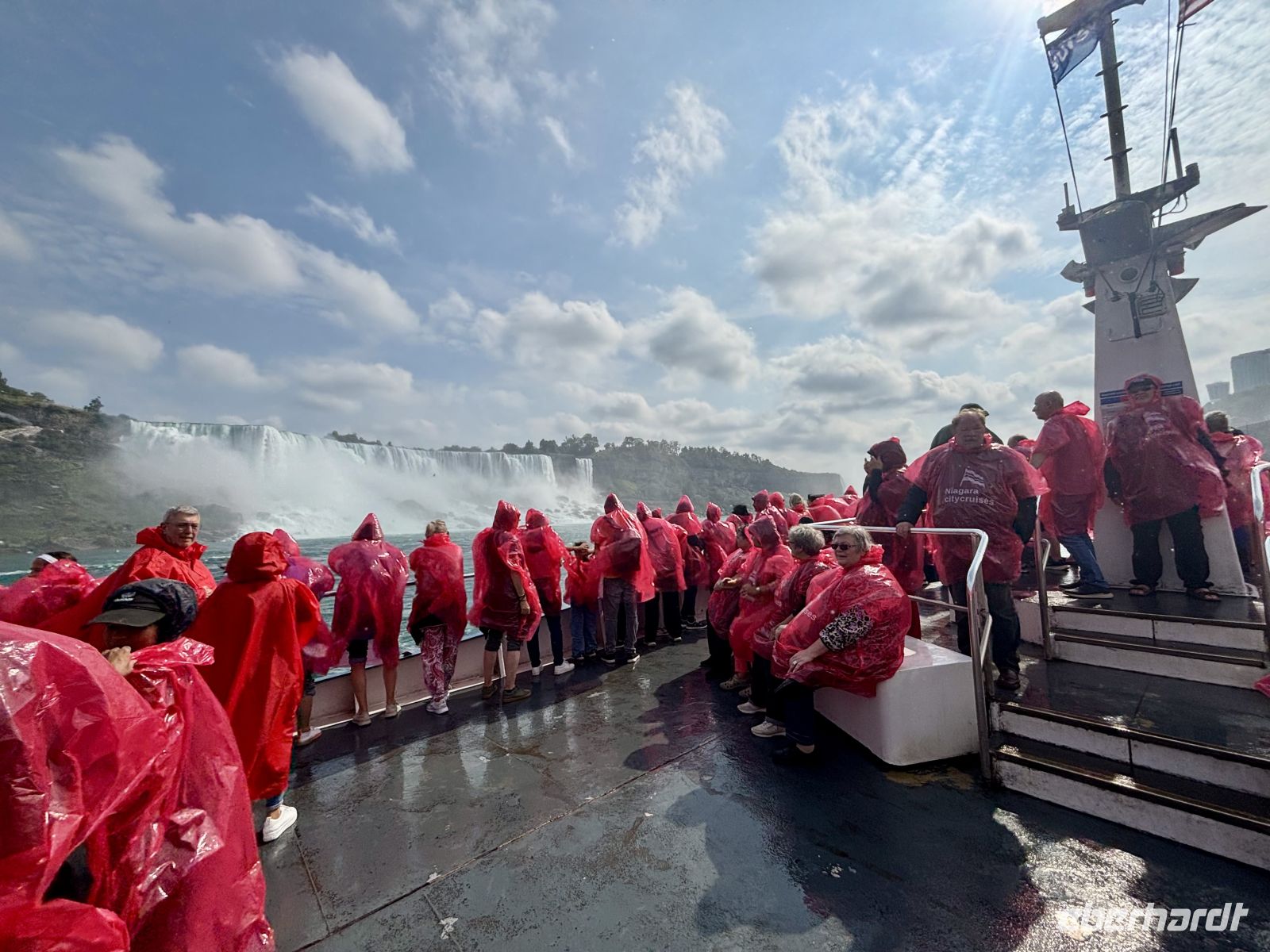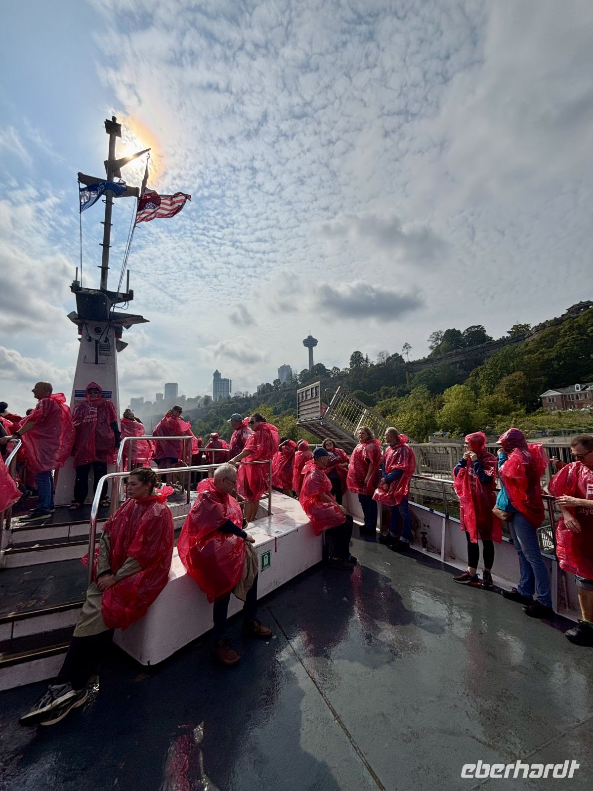 Rote Regencapes schützen uns bei unserer Bootsfahrt vor Spritzwasser und so genießen wir das einmalige Abenteuer, diese weltberühmten Wasserfälle hautnah zu erleben. Natürlich beachten wir die Warnung unserer Reiseleitung und schützen unsere Kameralinsen vor Spritzwasser. Leicht feucht, aber glücklich, fahren wir dann 130 km zurück in unser Hotel nach Toronto. Am Abend bummeln wir durch die beleuchteten Straßen und können bei einem gemeinsamen Abendessen im Restaurant Les 3 Brasseurs die Erlebnisse des Tages noch einmal austauschen. Zum Abschluss fahren wir dann hinauf in die 27. Etage unseres Hotels und genießen den Blick von der Aussichtsterrasse über das Lichtermeer der Stadt.