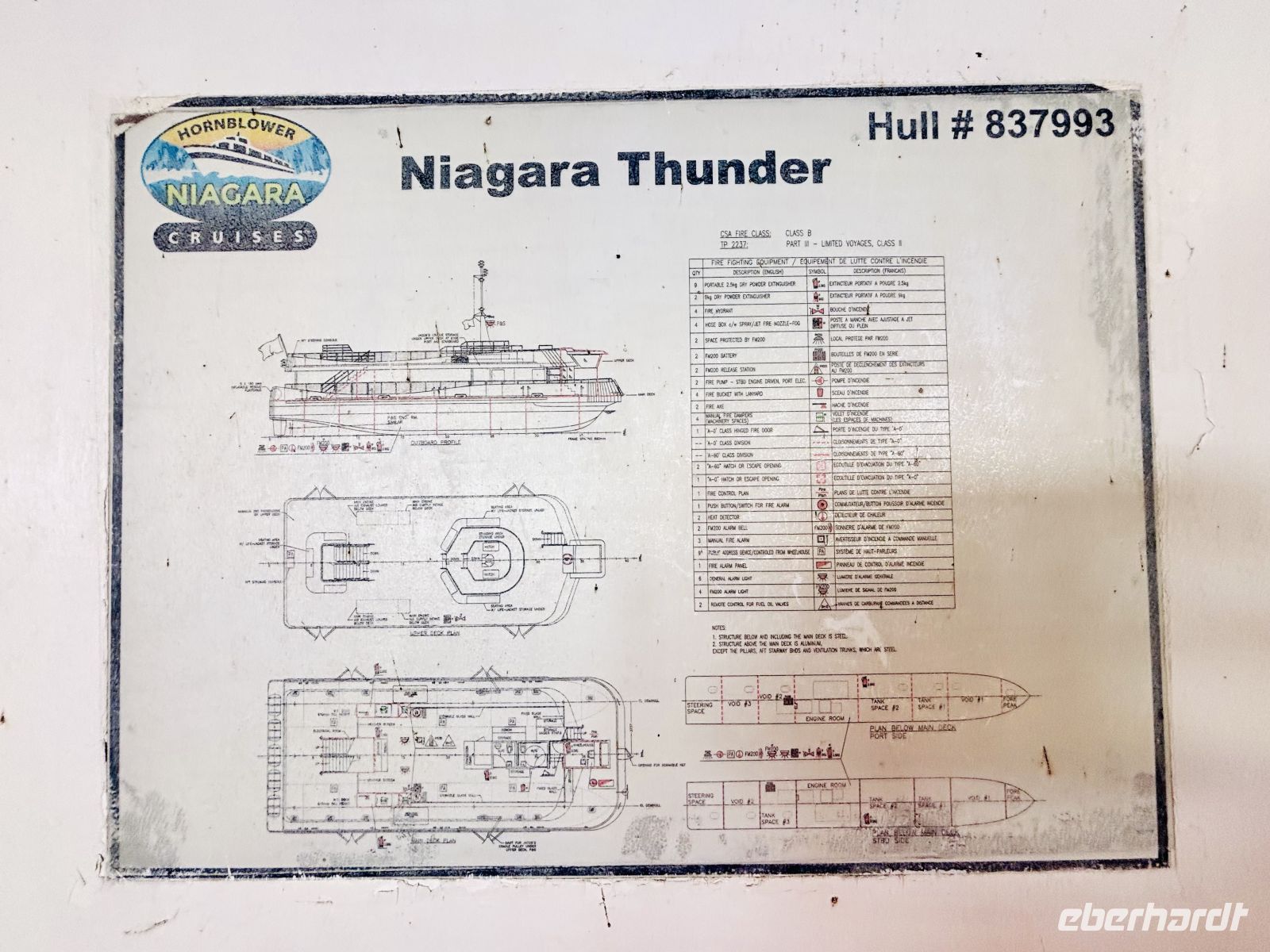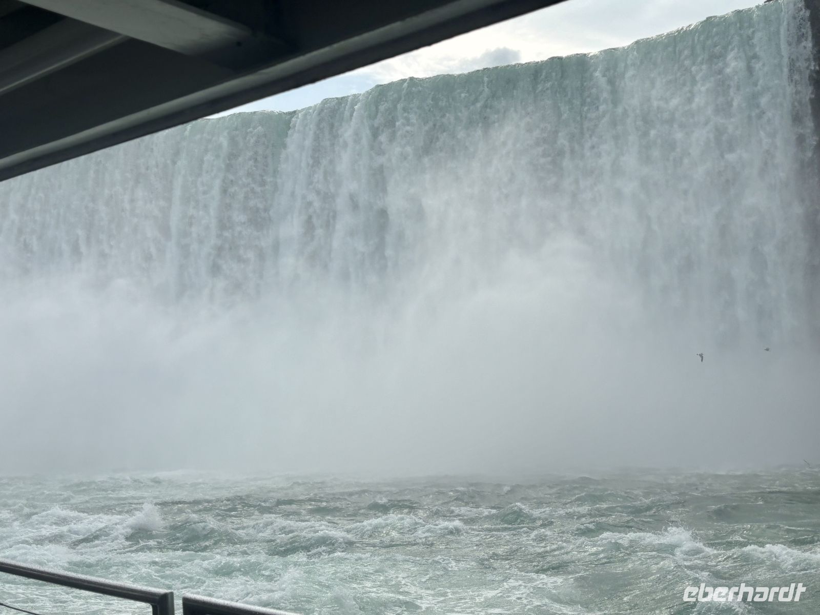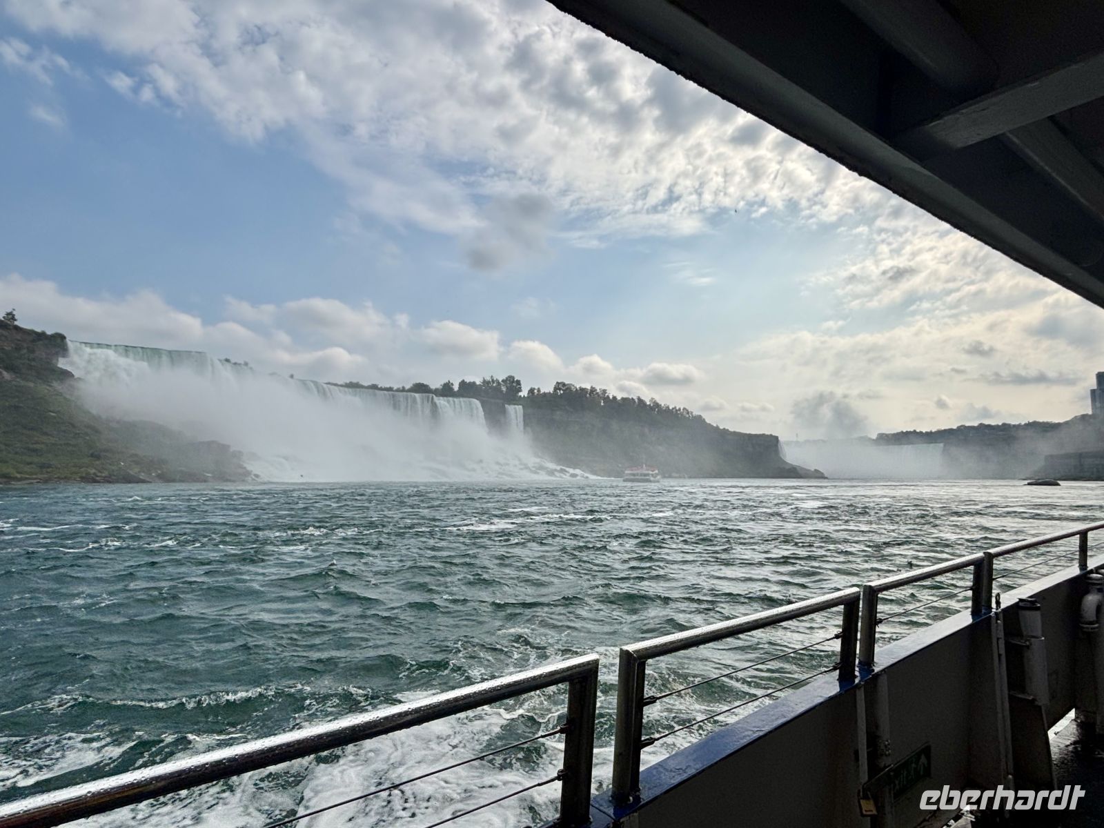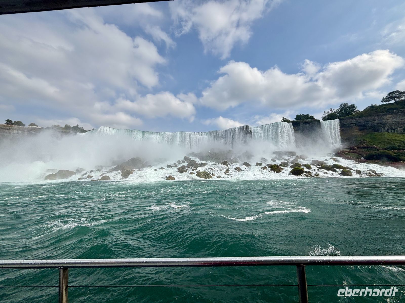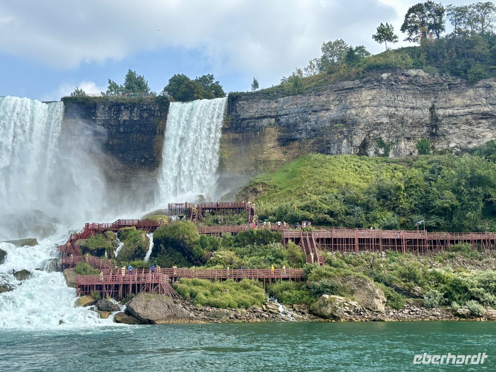 UnserZiel, die Niagara-Fälle, entstanden vor etwa 12.000 Jahren während der letzten Eiszeit und gehören zu größten Wasserfällen der Welt. Insgesamt stürzen hier durchschnittlich rund 3.000 Kubikmeter Wasser pro Sekunde hinab, also rund drei Millionen Liter, und das aus einer Höhe von etwa 57 Metern. Die Niagarafälle bestehen aus drei Fällen, von denen nur einer zu Kanada gehört: Das Hufeisen, die Horseshoe Falls. Fast 60 m hoch und 700 m breit verfügen diese über etwa 90% der gesamten Wassermassen, die alle dem Niagara River entstammen, der den Eriesee mit dem Ontariosee verbindet. Auf der US-amerikanischen Seite sehen wir die American Falls und die Bridal Veil Falls, die am schmälsten sind und daher auch „Brautschleierfälle“ genannt werden.