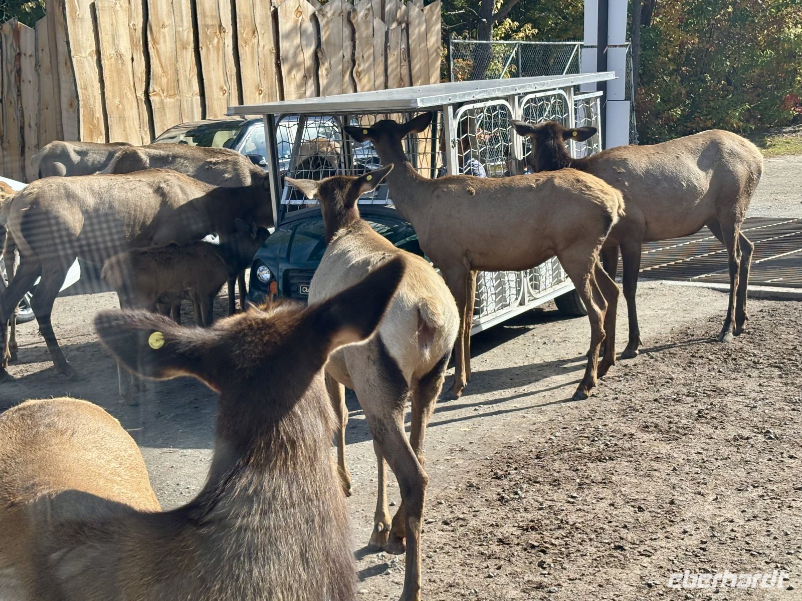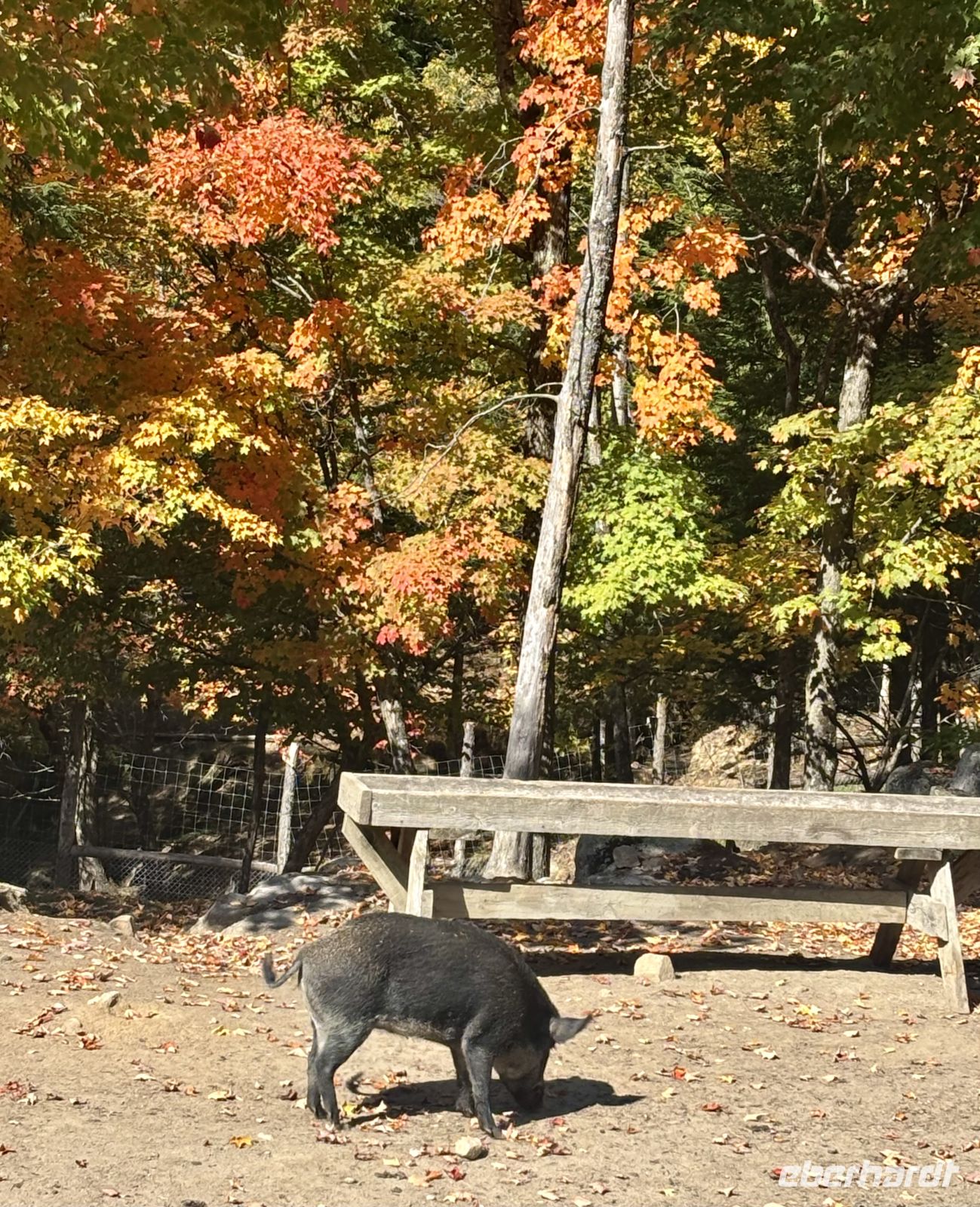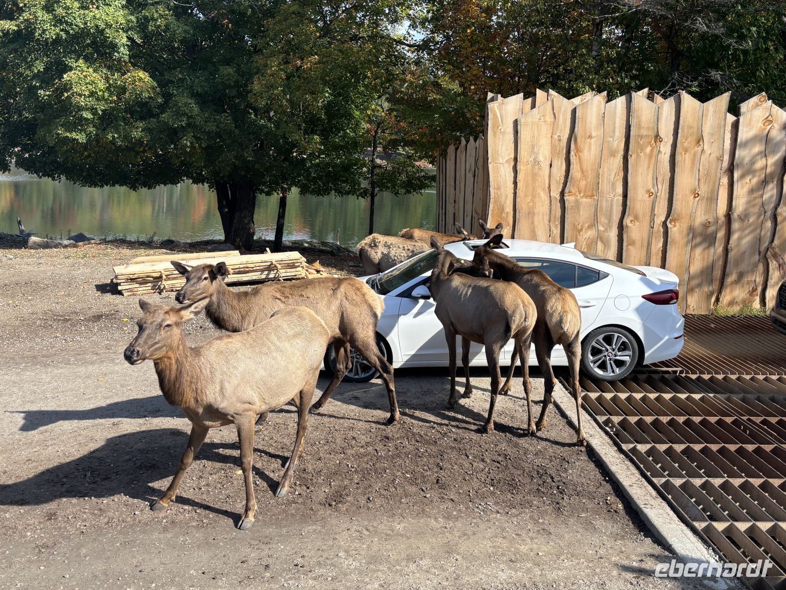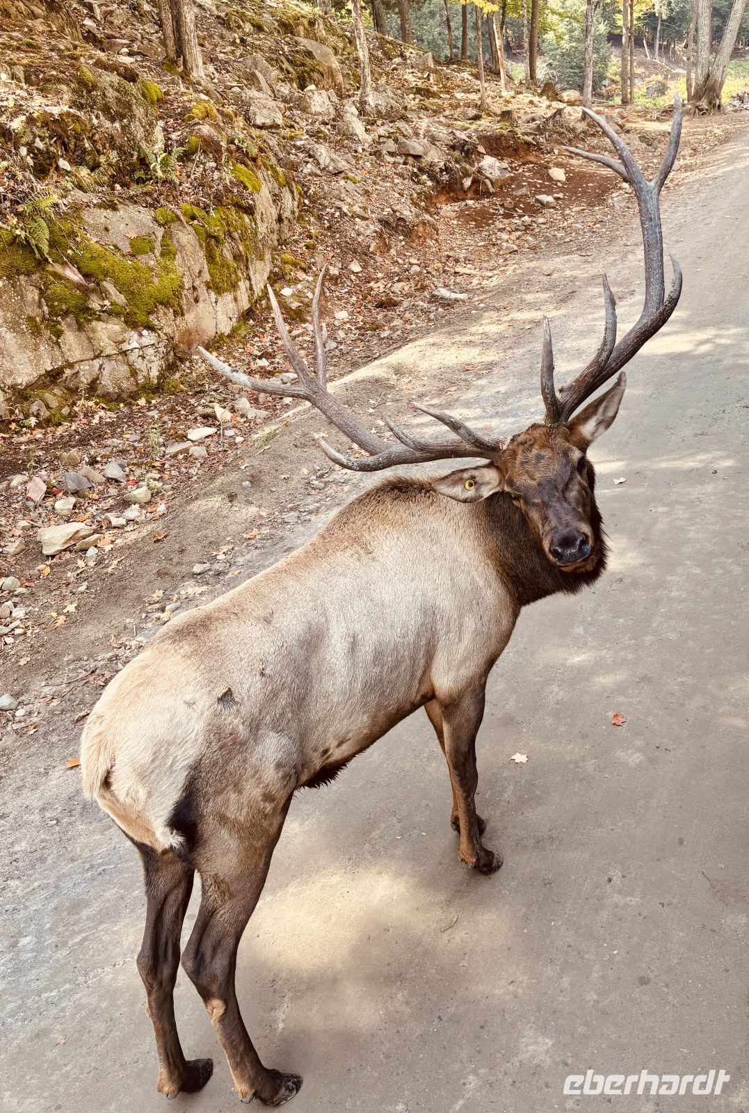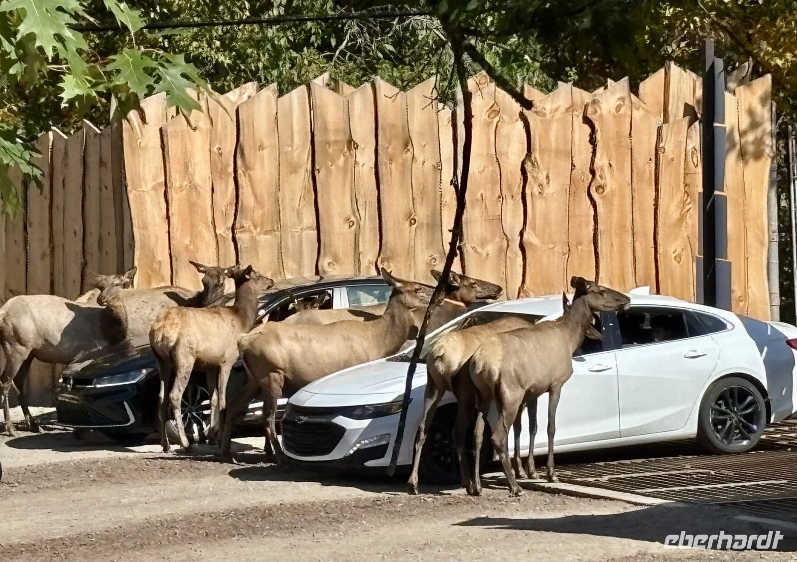 Es ist, als ob die Tiere des Parks nur auf uns gewartet hätten, alle zeigen sich. Unzählige Karibus belagern auf dem Rundweg die Fahrzeuge und strecken uns ihre Schnauze entgegen. Majestätische Hirsche mit unglaublichen Geweihen liegen im Schatten der Bäume, Wildschweine wuseln durch das Unterholz und über die Wege, Wölfe durchstreifen ihr Gehege und mindestens sechs Bären können wir beobachten. In unserem Bus springen wir ständig mit gezückter Kamera von einer Seite auf die andere, denn immer wieder bieten sich neue Fotomotive und alles vor der Kulisse des wunderschönen Herbstwaldes, dessen Farben im Sonnenschein leuchten.