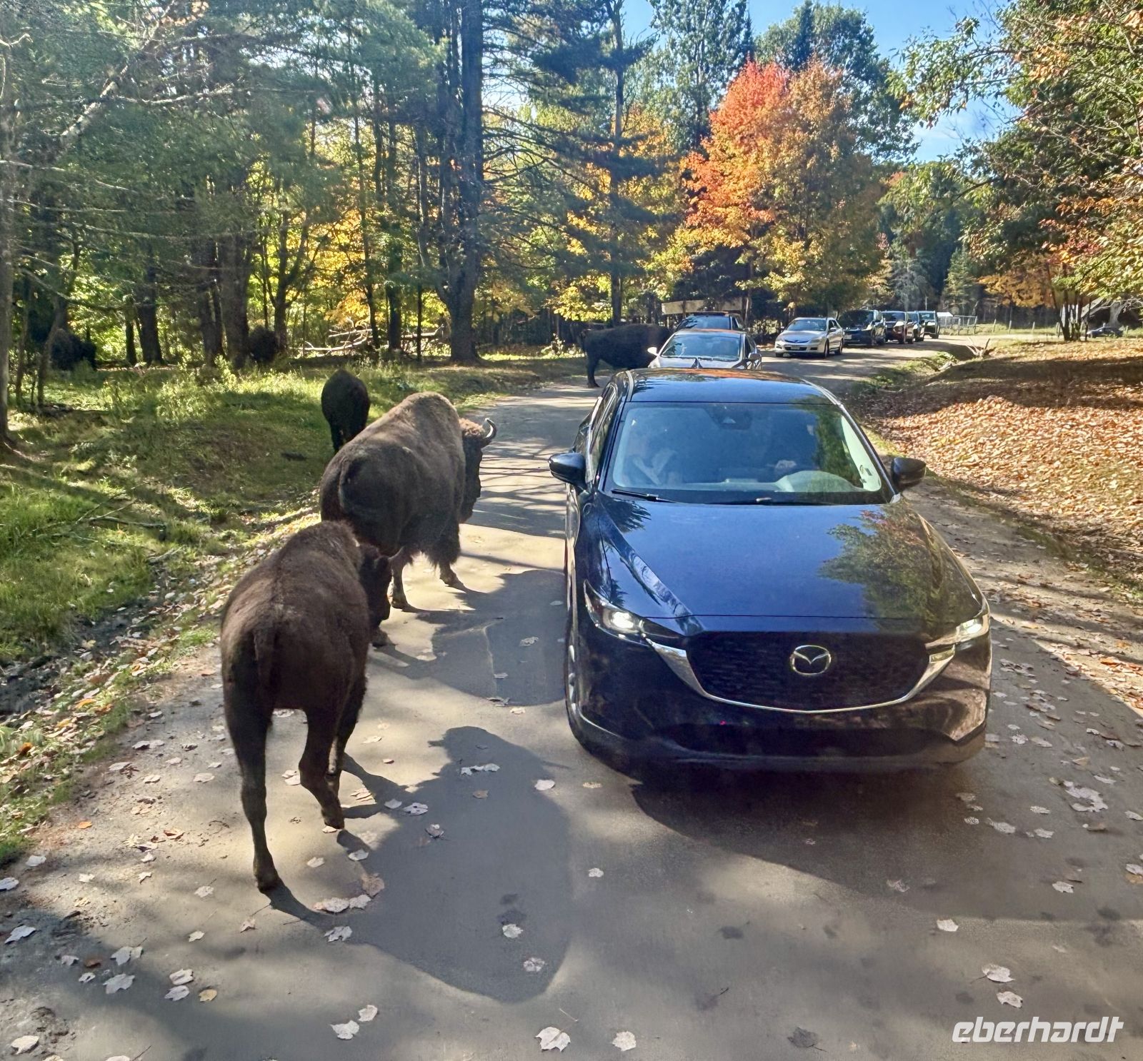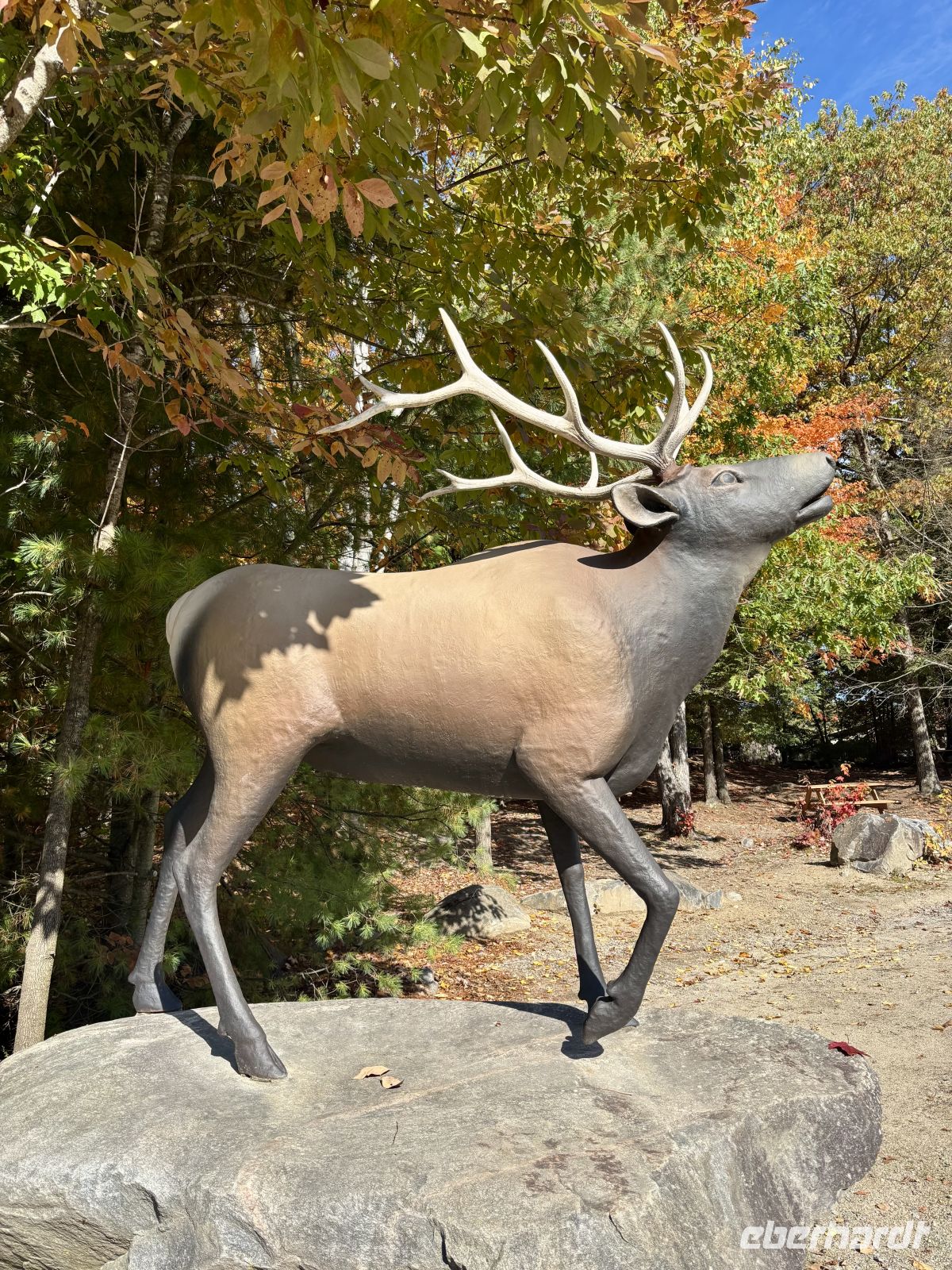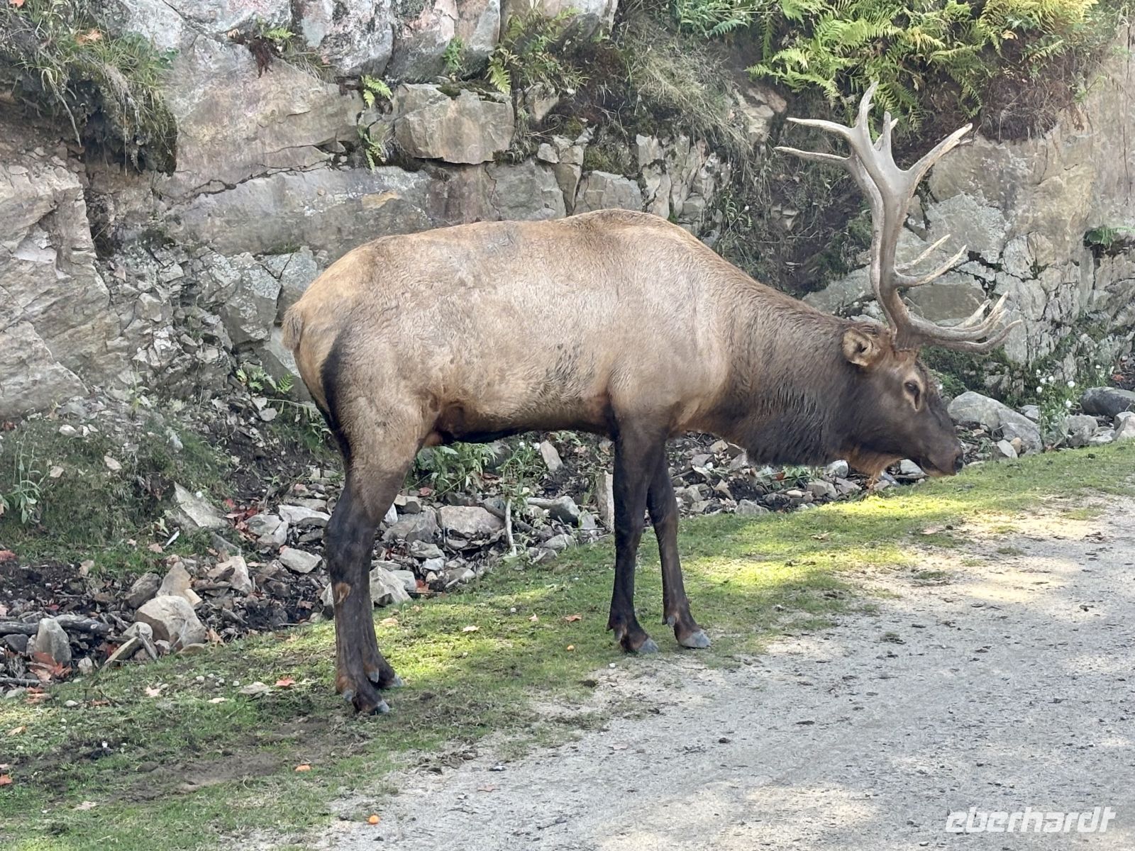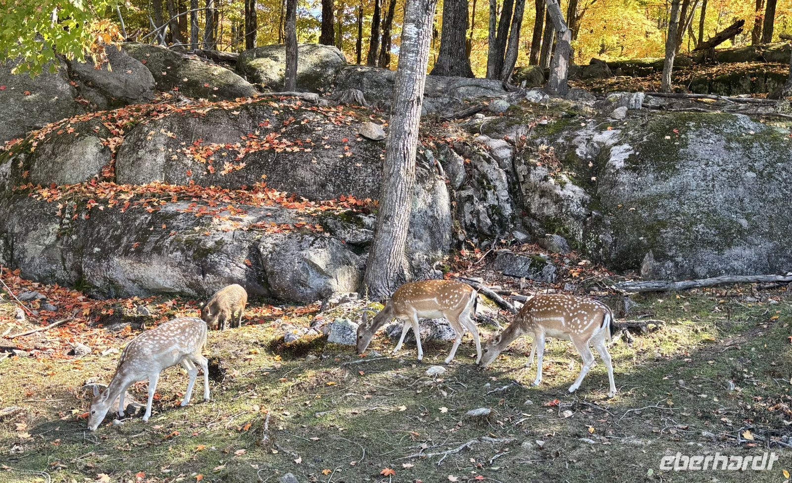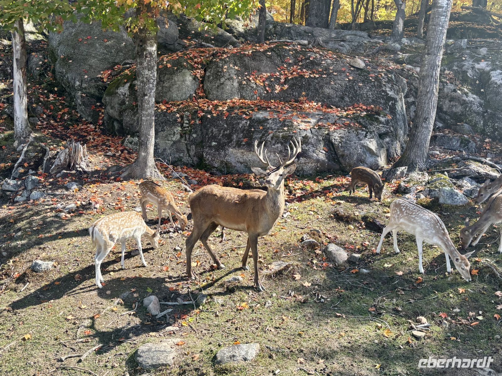 Es ist, als ob die Tiere des Parks nur auf uns gewartet hätten, alle zeigen sich. Unzählige Karibus belagern auf dem Rundweg die Fahrzeuge und strecken uns ihre Schnauze entgegen. Majestätische Hirsche mit unglaublichen Geweihen liegen im Schatten der Bäume, Wildschweine wuseln durch das Unterholz und über die Wege, Wölfe durchstreifen ihr Gehege und mindestens sechs Bären können wir beobachten. In unserem Bus springen wir ständig mit gezückter Kamera von einer Seite auf die andere, denn immer wieder bieten sich neue Fotomotive und alles vor der Kulisse des wunderschönen Herbstwaldes, dessen Farben im Sonnenschein leuchten.