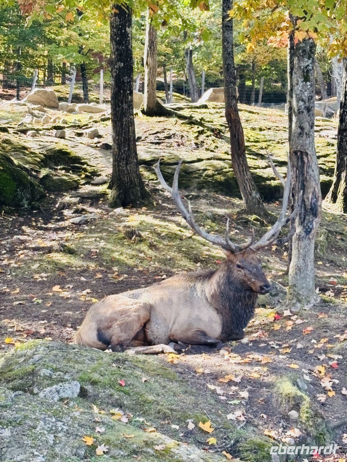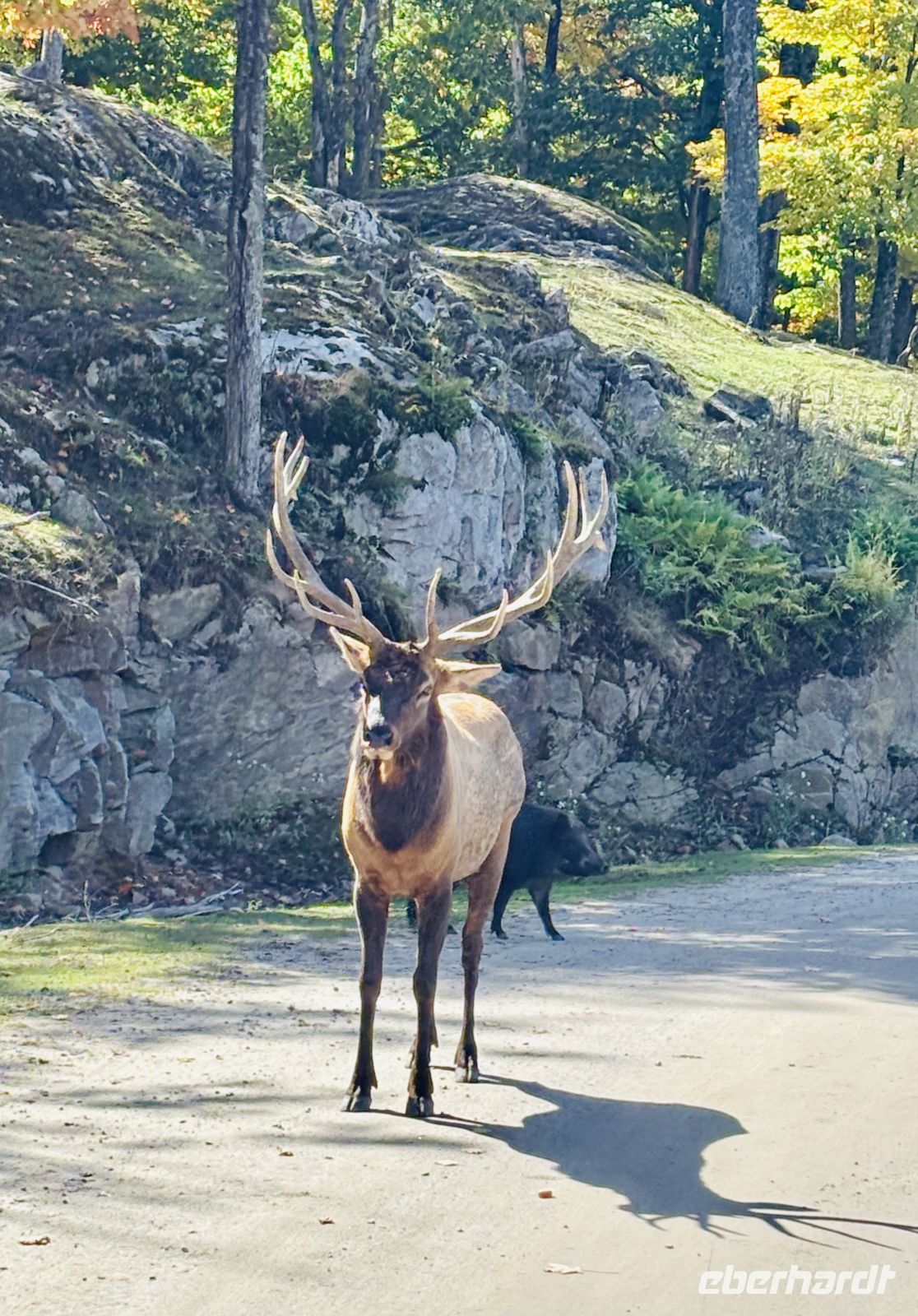 Strahlender Sonnenschein lockt zu einer letzten Rundfahrt durch Ottawa und wir haben sogar Zeit für einen Morgenspaziergang durch den Park der Rideau Hall, wo die Bäume bereits ihr flammendes Rot entwickeln. Und während der Weiterfahrt durch die Provinz Quebec geschieht das Wunder: rechts und links der Autobahn empfängt uns der Indian Summer! Die Blätter der Bäume präsentieren sich in einer Farbpracht, die jegliche Vorstellungen übersteigt. Sie färben sich rot, gelb und orange und verwandeln die Landschaft in eine ganz besondere, fast schon magische Atmosphäre. Wir genießen diese Leuchten im Sonnenschein. Knapp 80 Kilometer lang ist die Fahrtstrecke, und dann gehen wir auf Safari! Ohne Jagdausrüstung, nur mit der Kamera „bewaffnet“ erleben wir die beeindruckende Tierwelt des Omega Wildparks hautnah. Der Park erstreckt sich über 2.200 Hektar und ist mit seiner abwechslungsreichen Vegetation, dichten Waldgebieten, weiten Wasserflächen und saftigen Graszonen der Lebensraum für über 800 Tiere. Hier leben Rehe, Elche, Luchse und sogar Bären und Wölfe.