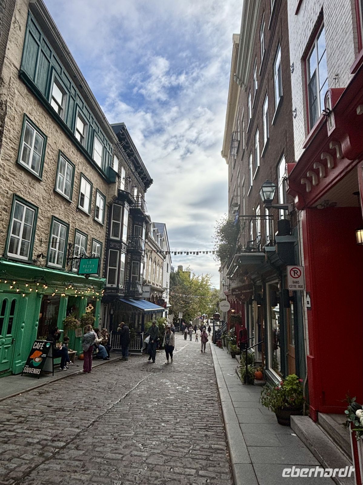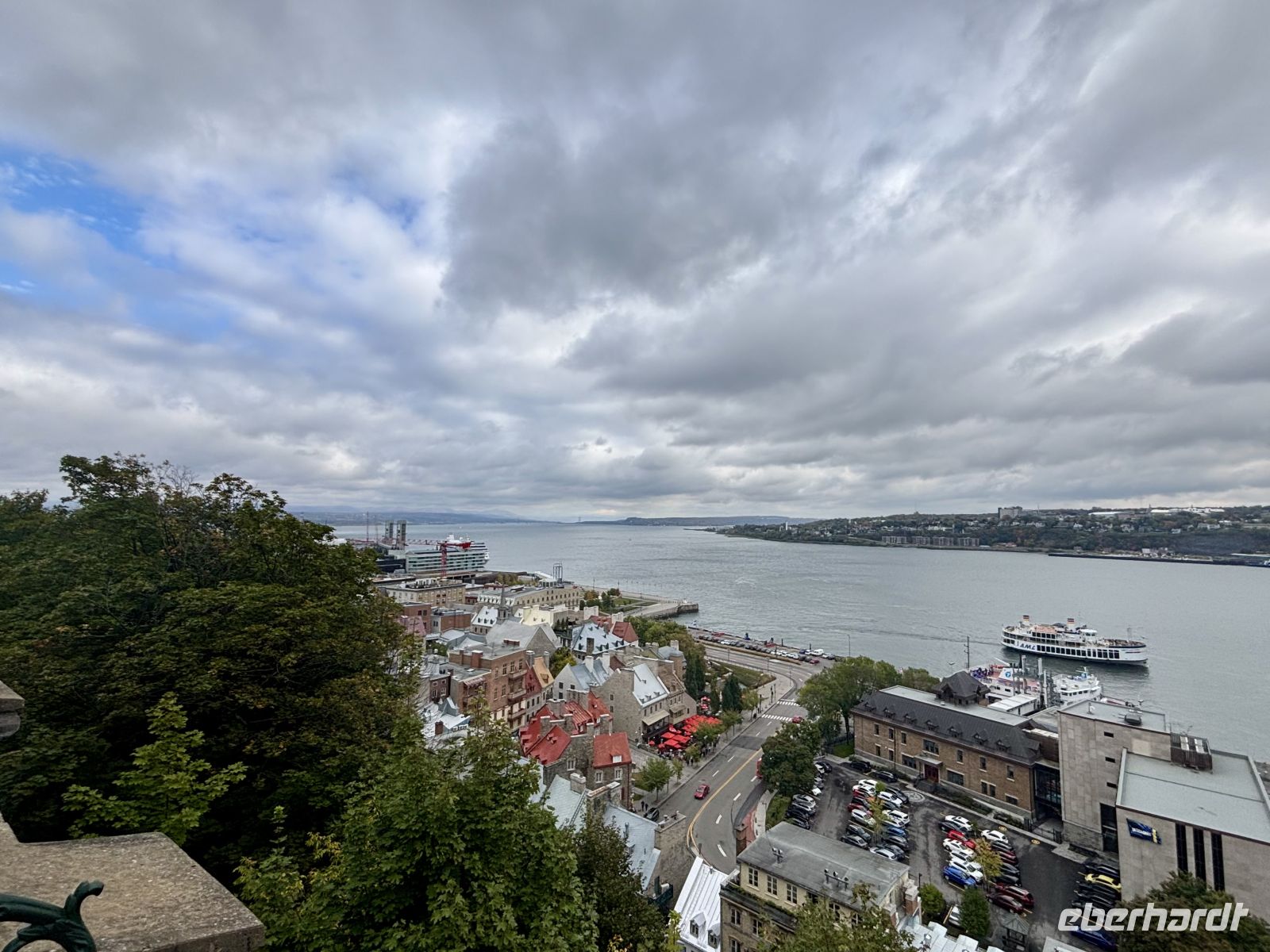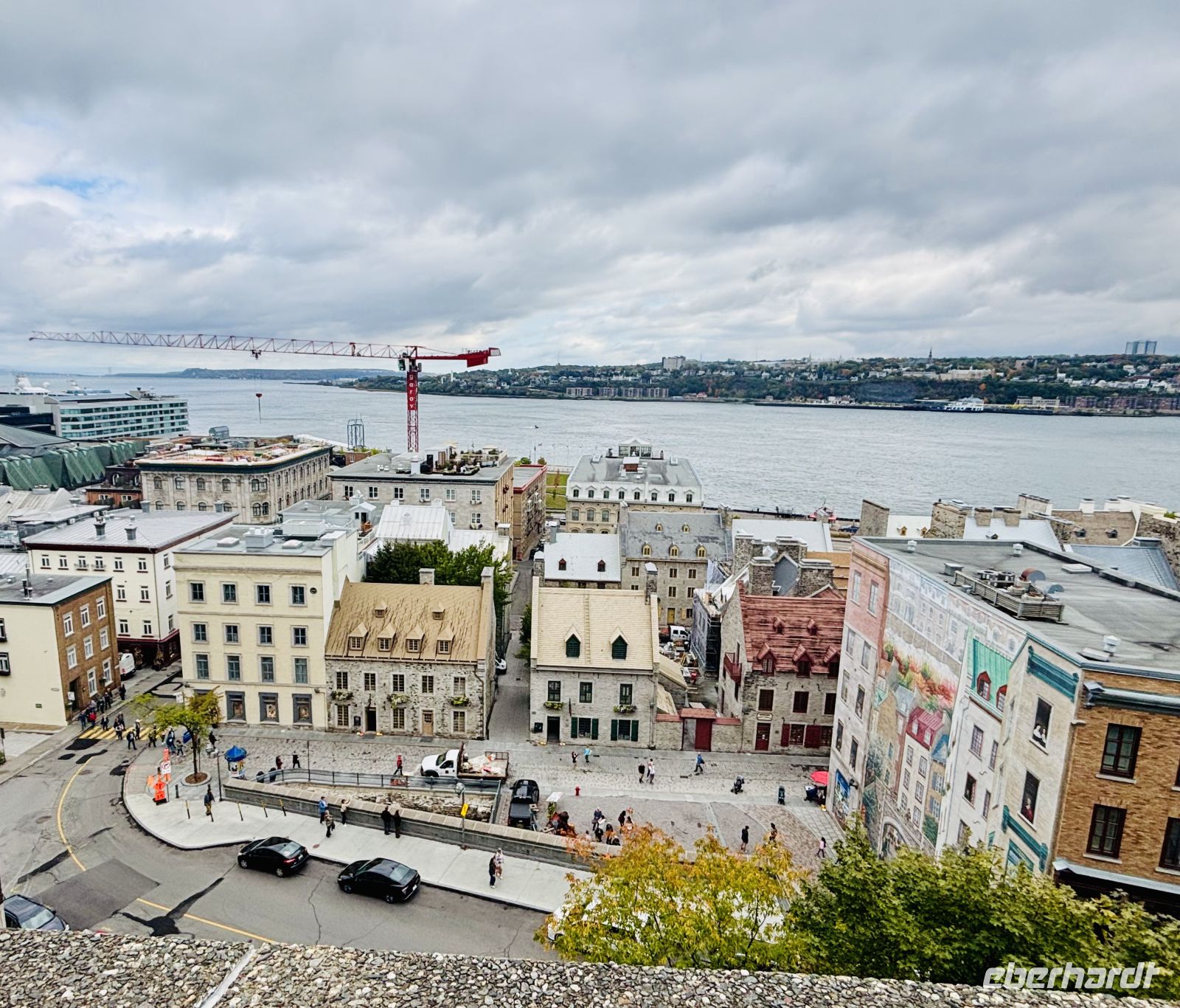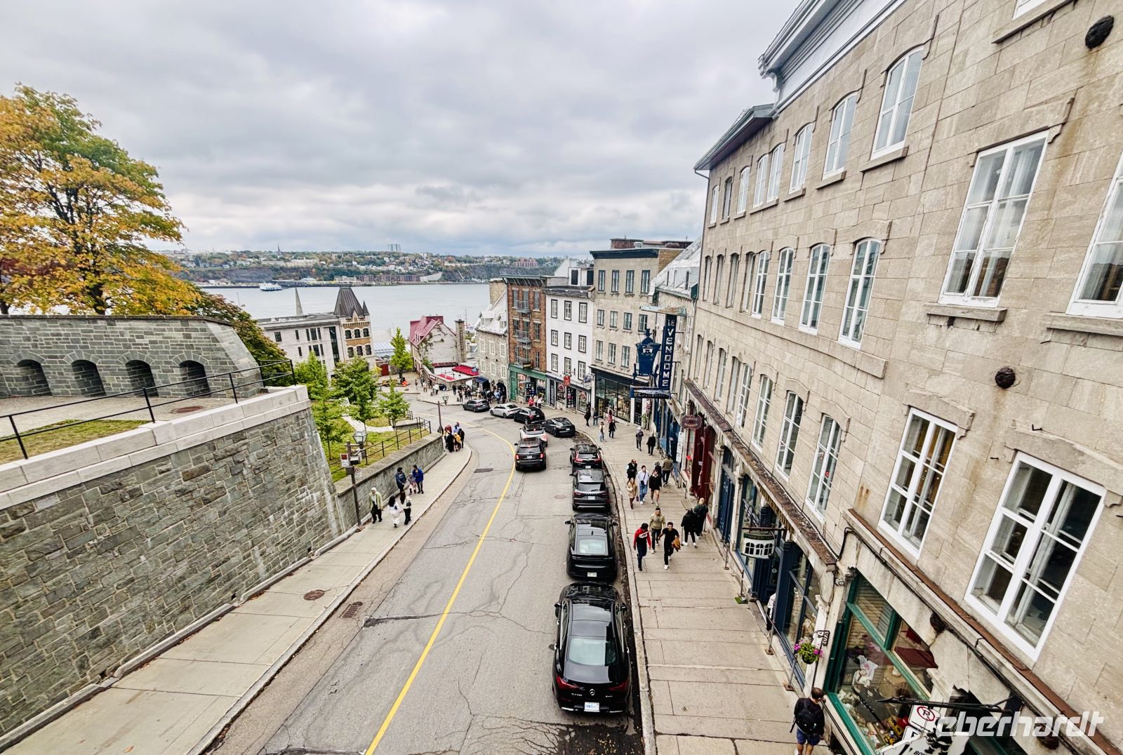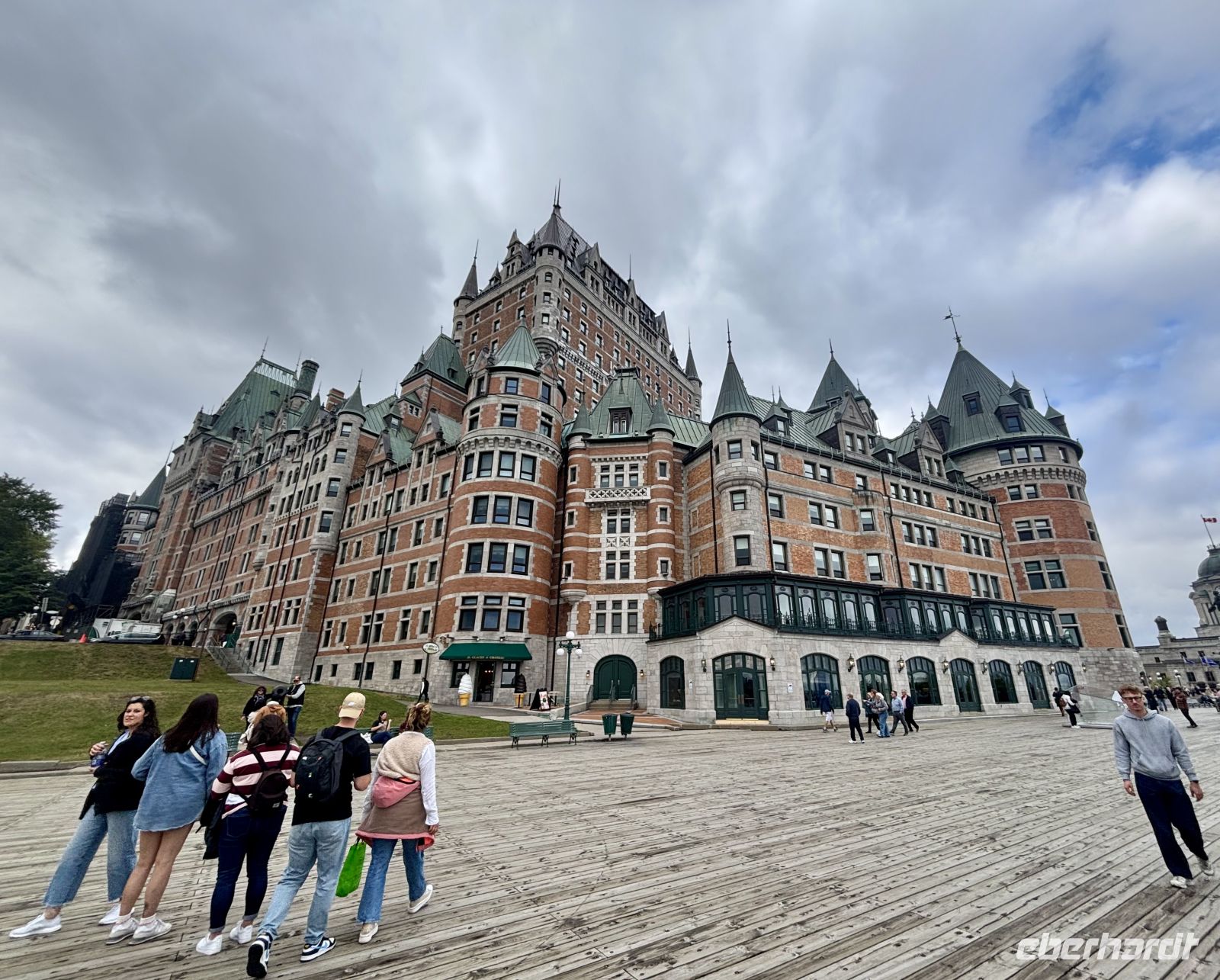 Zusammen mit Dagmar und dem örtlichen Reiseleiter machen wir eine Stadtrundfahrt durch die unterschiedlichen Viertel Quebecs, sehen wir den Regierungsbezirk, den Battlefields Park, die Rue Saint-Jean mit ihren zahllosen Cafés, Restaurants, Bars, Hotels und schönen Geschäften und die Grande Allée. Wir spazieren auch zu Fuß durch die malerische Altstadt, die von dem Wahrzeichen der Stadt, dem imposanten Luxus-Hotel Château Frontenac überragt wird und bummeln entlang der Dufferin-Terrasse. Auf dieser hölzernen Panoramastrecke unterhalb des Schlosshotels lässt es sich herrlich flanieren. Sie wurde in den 1870er Jahren errichtet und verläuft über 430 Meter, von der Zitadelle in nördlicher Richtung vorbei am Hotel Château Frontenac bis zur Place d’Armes. Am nördlichen Ende der Terrasse befindet sich die Bergstation der Funiculaire du Vieux-Québec, einer Standseilbahn in die Unterstadt.