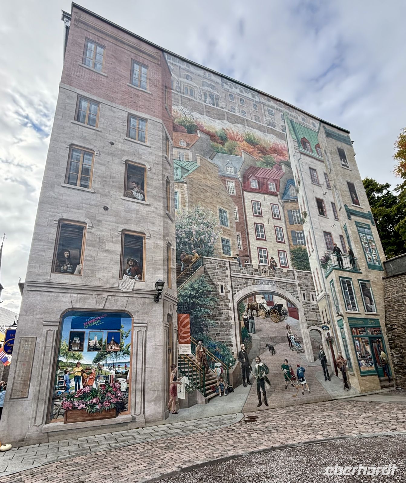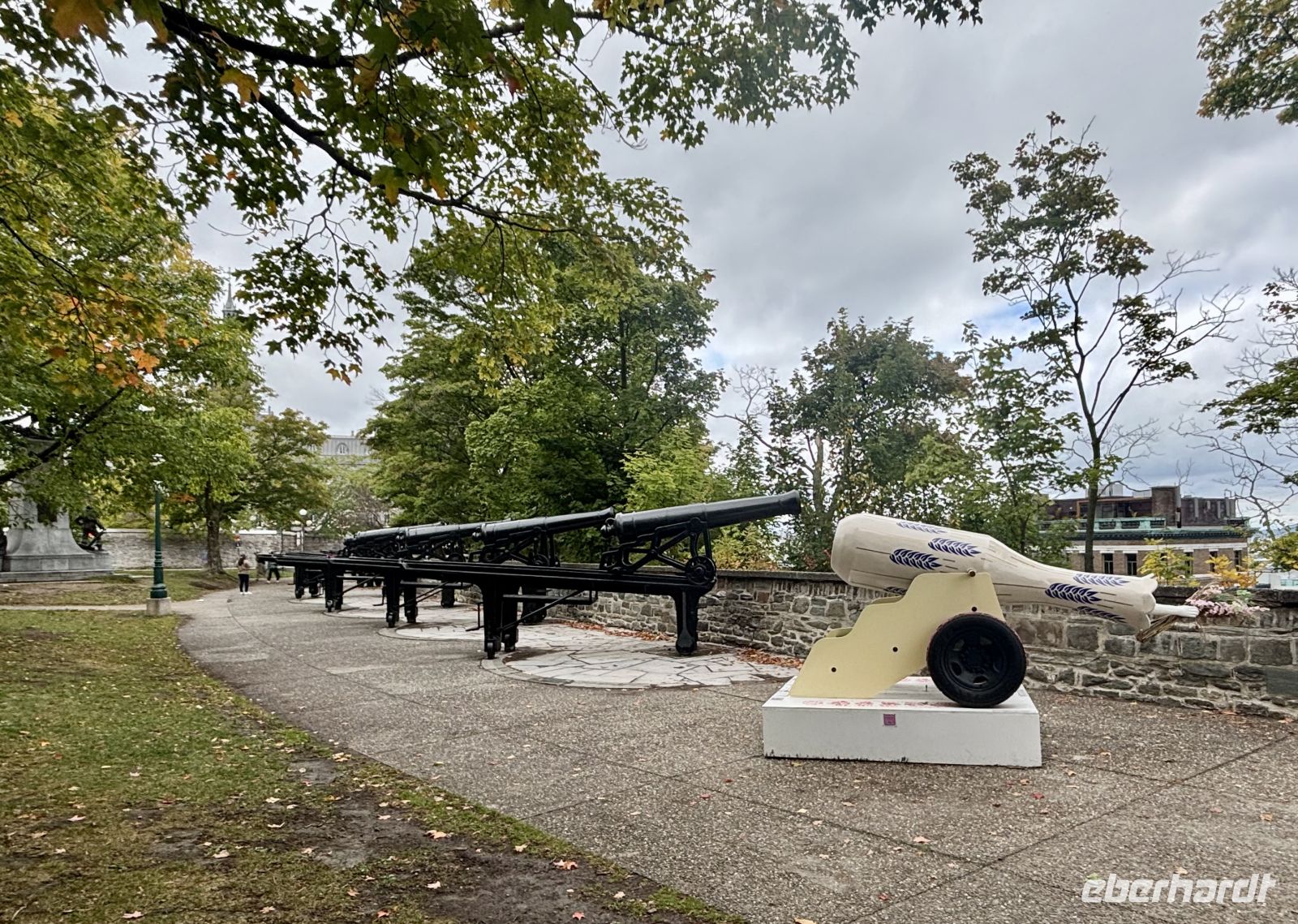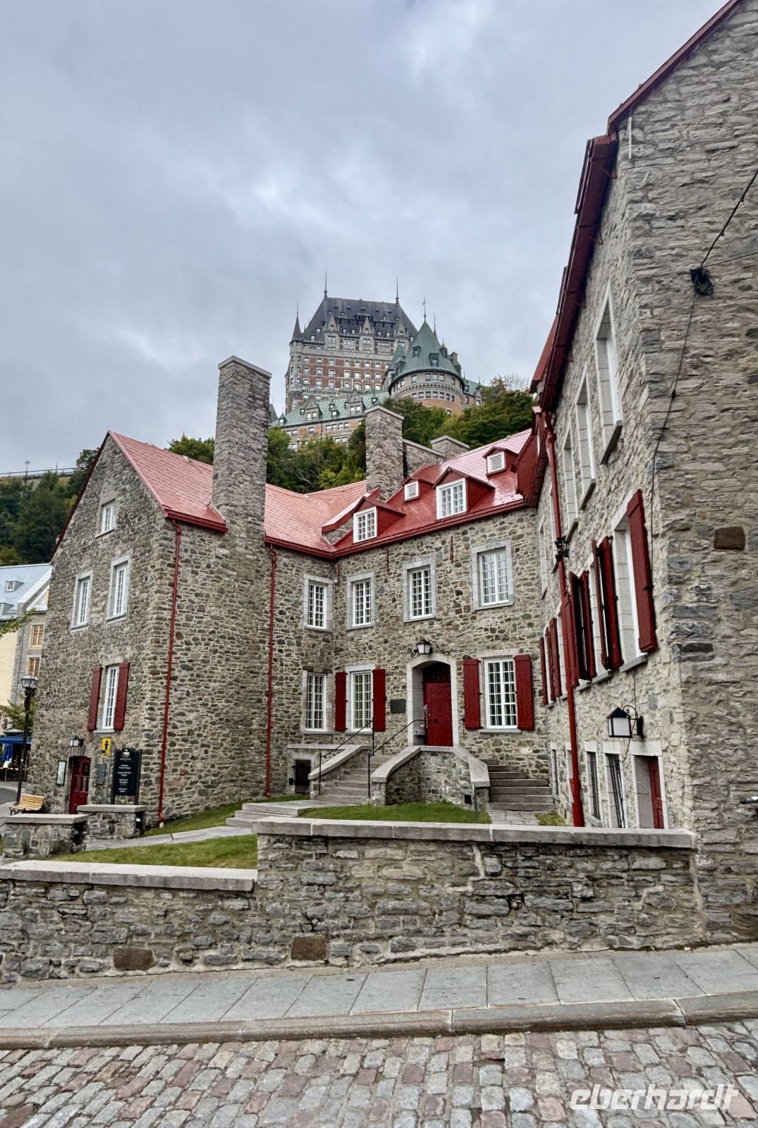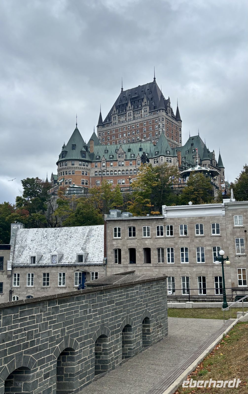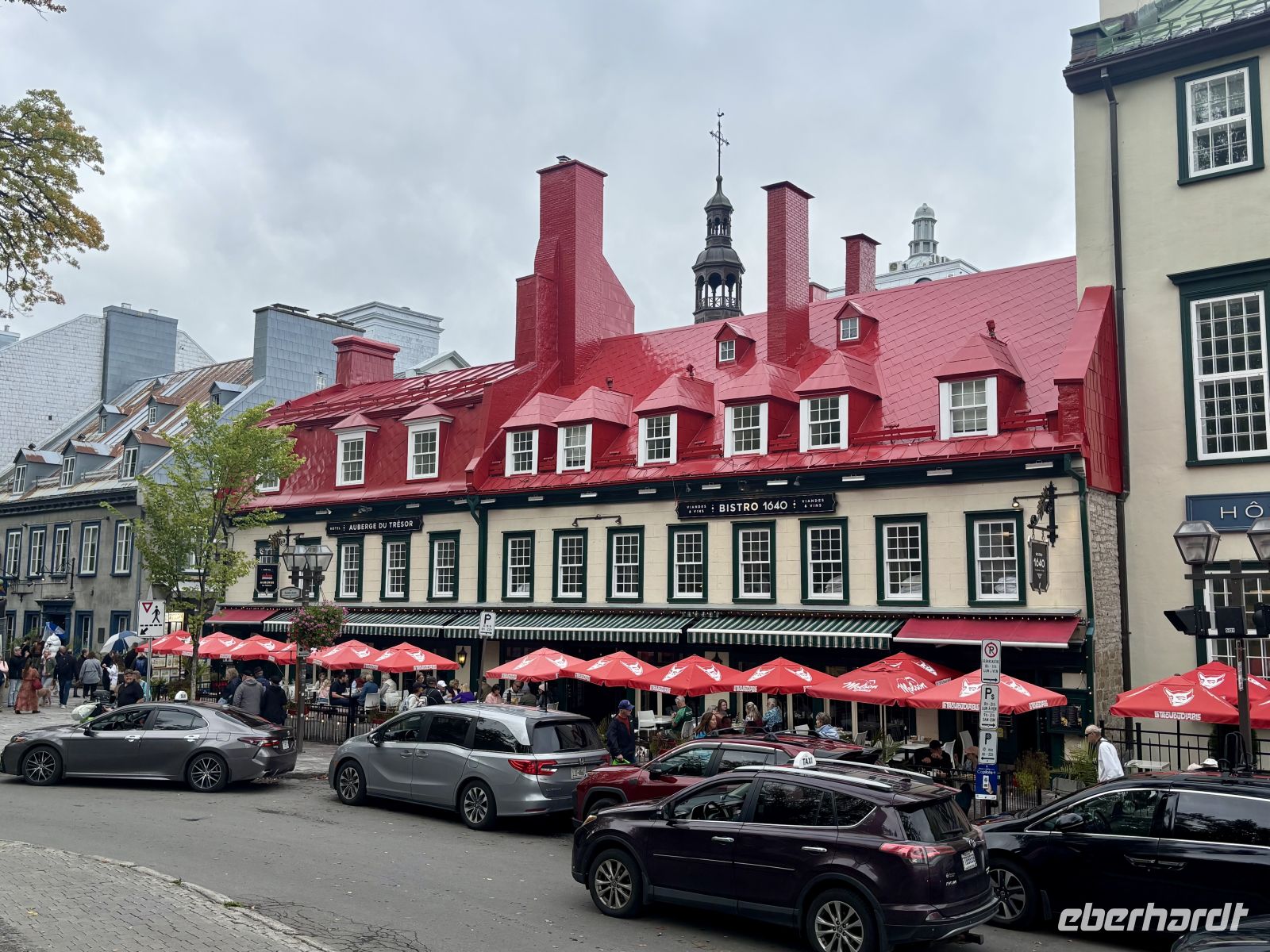 Zusammen mit Dagmar und dem örtlichen Reiseleiter machen wir eine Stadtrundfahrt durch die unterschiedlichen Viertel Quebecs, sehen wir den Regierungsbezirk, den Battlefields Park, die Rue Saint-Jean mit ihren zahllosen Cafés, Restaurants, Bars, Hotels und schönen Geschäften und die Grande Allée. Wir spazieren auch zu Fuß durch die malerische Altstadt, die von dem Wahrzeichen der Stadt, dem imposanten Luxus-Hotel Château Frontenac überragt wird und bummeln entlang der Dufferin-Terrasse. Auf dieser hölzernen Panoramastrecke unterhalb des Schlosshotels lässt es sich herrlich flanieren. Sie wurde in den 1870er Jahren errichtet und verläuft über 430 Meter, von der Zitadelle in nördlicher Richtung vorbei am Hotel Château Frontenac bis zur Place d’Armes. Am nördlichen Ende der Terrasse befindet sich die Bergstation der Funiculaire du Vieux-Québec, einer Standseilbahn in die Unterstadt.