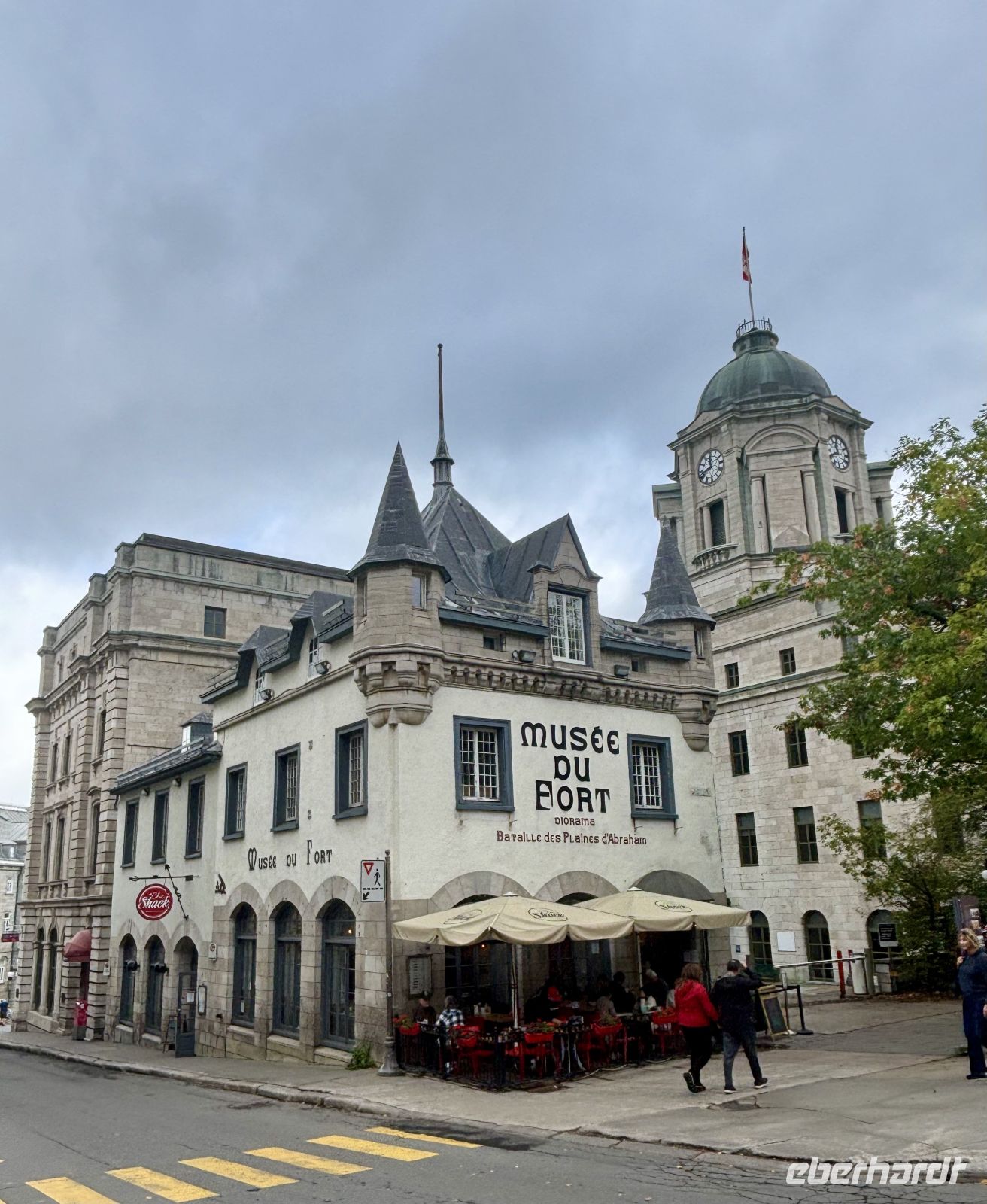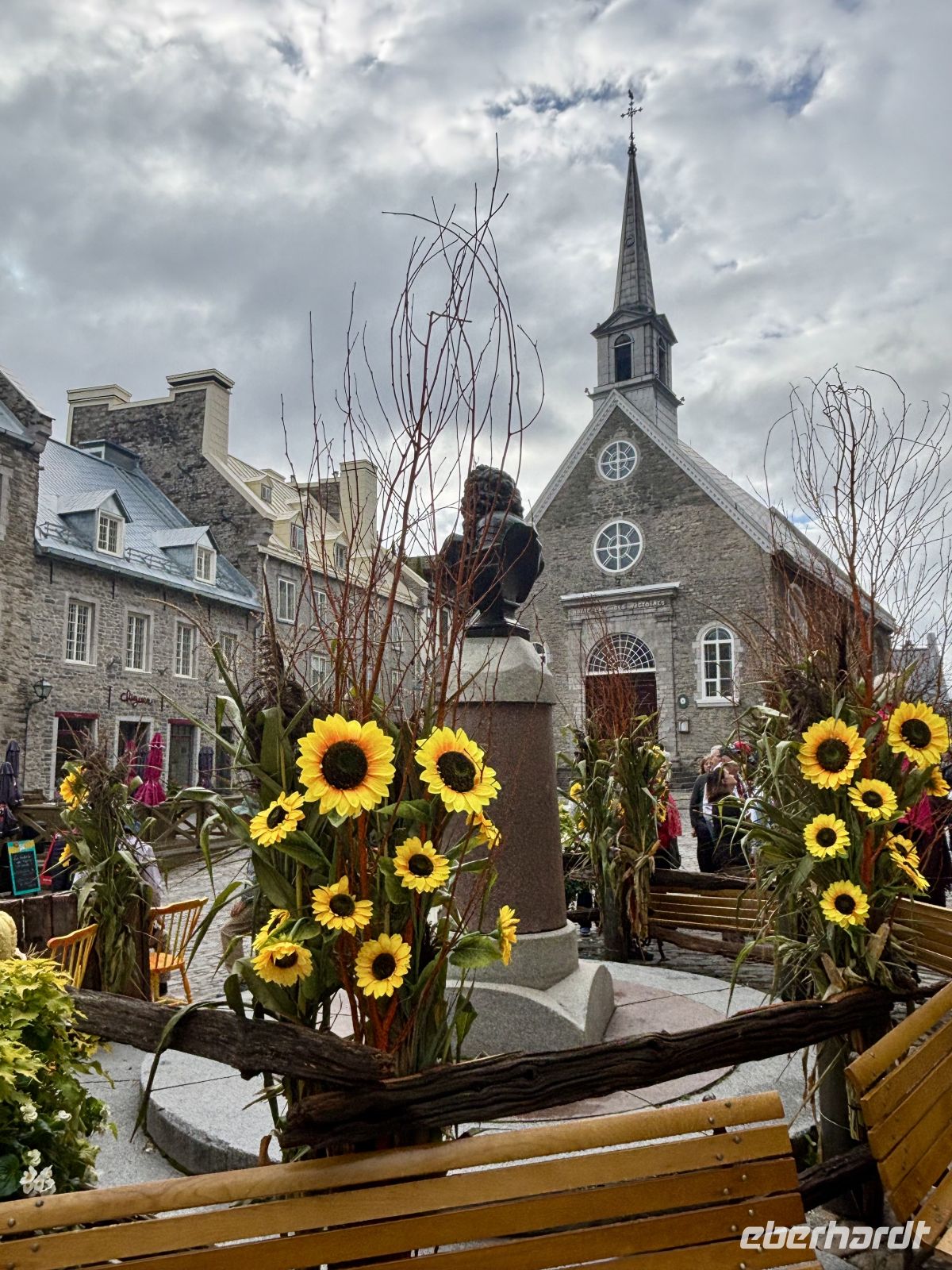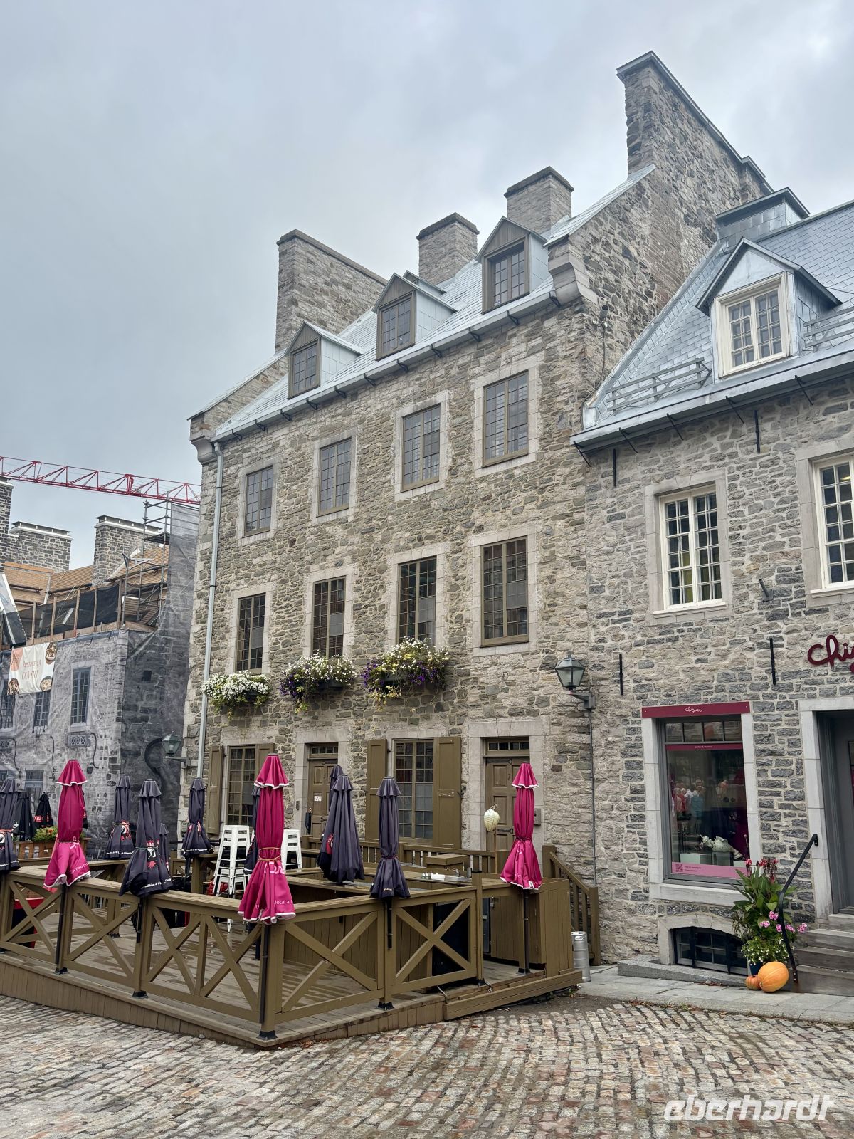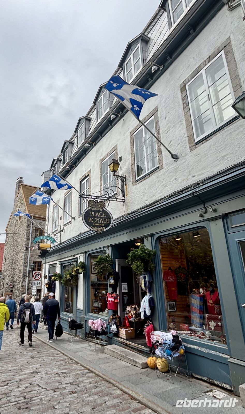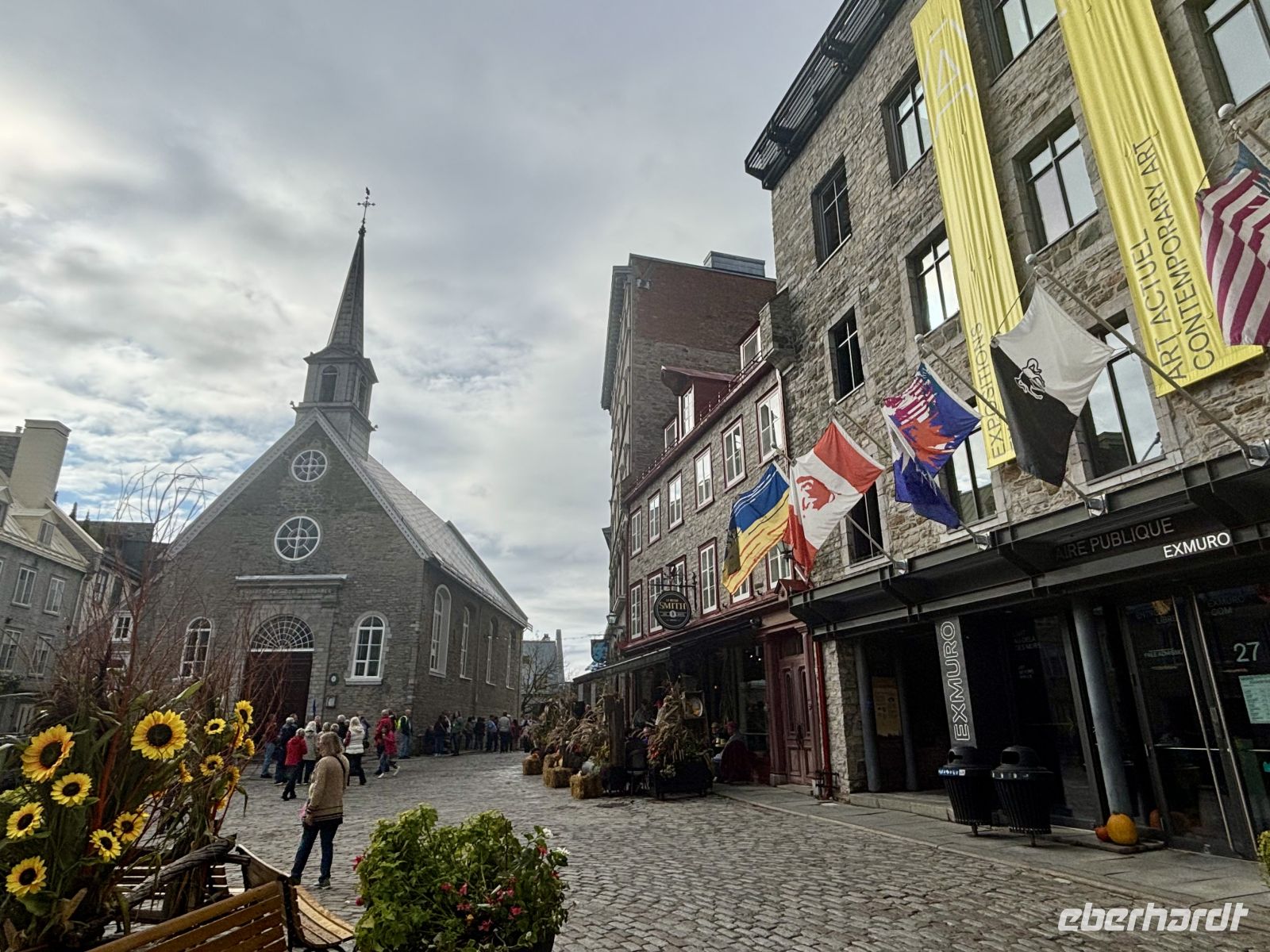Zusammen mit Dagmar und dem örtlichen Reiseleiter machen wir eine Stadtrundfahrt durch die unterschiedlichen Viertel Quebecs, sehen wir den Regierungsbezirk, den Battlefields Park, die Rue Saint-Jean mit ihren zahllosen Cafés, Restaurants, Bars, Hotels und schönen Geschäften und die Grande Allée. Wir spazieren auch zu Fuß durch die malerische Altstadt, die von dem Wahrzeichen der Stadt, dem imposanten Luxus-Hotel Château Frontenac überragt wird und bummeln entlang der Dufferin-Terrasse. Auf dieser hölzernen Panoramastrecke unterhalb des Schlosshotels lässt es sich herrlich flanieren. Sie wurde in den 1870er Jahren errichtet und verläuft über 430 Meter, von der Zitadelle in nördlicher Richtung vorbei am Hotel Château Frontenac bis zur Place d’Armes. Am nördlichen Ende der Terrasse befindet sich die Bergstation der Funiculaire du Vieux-Québec, einer Standseilbahn in die Unterstadt.