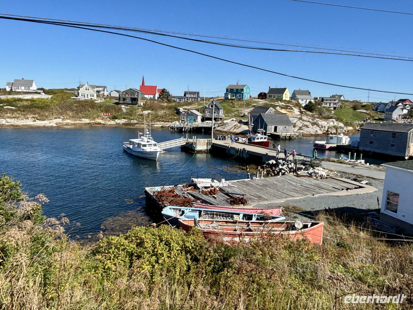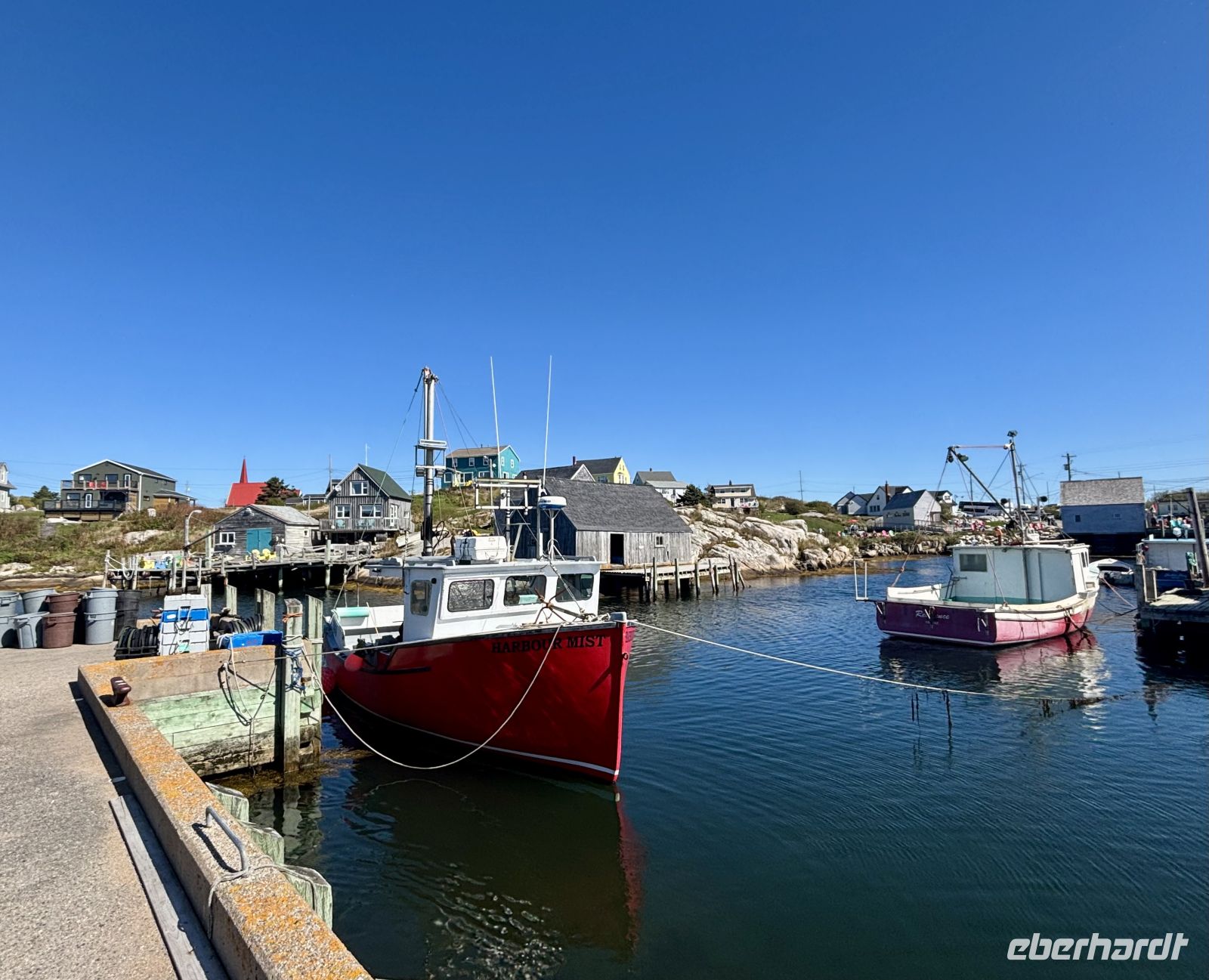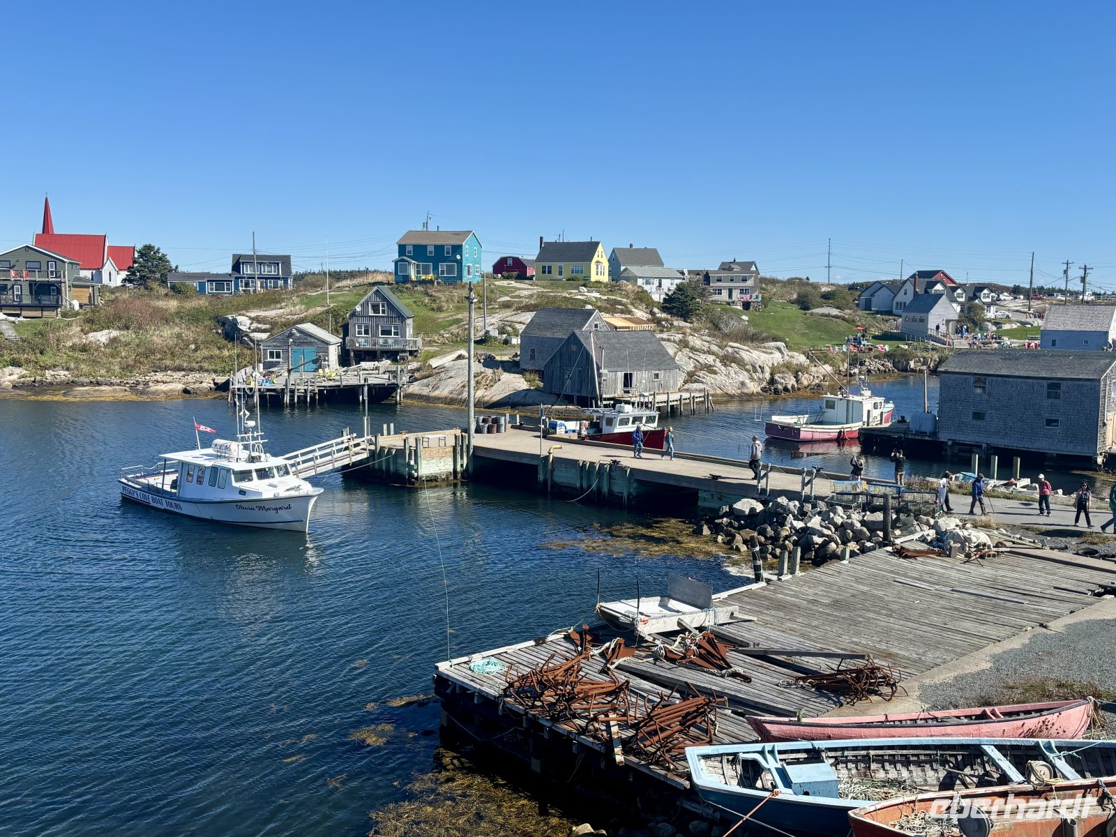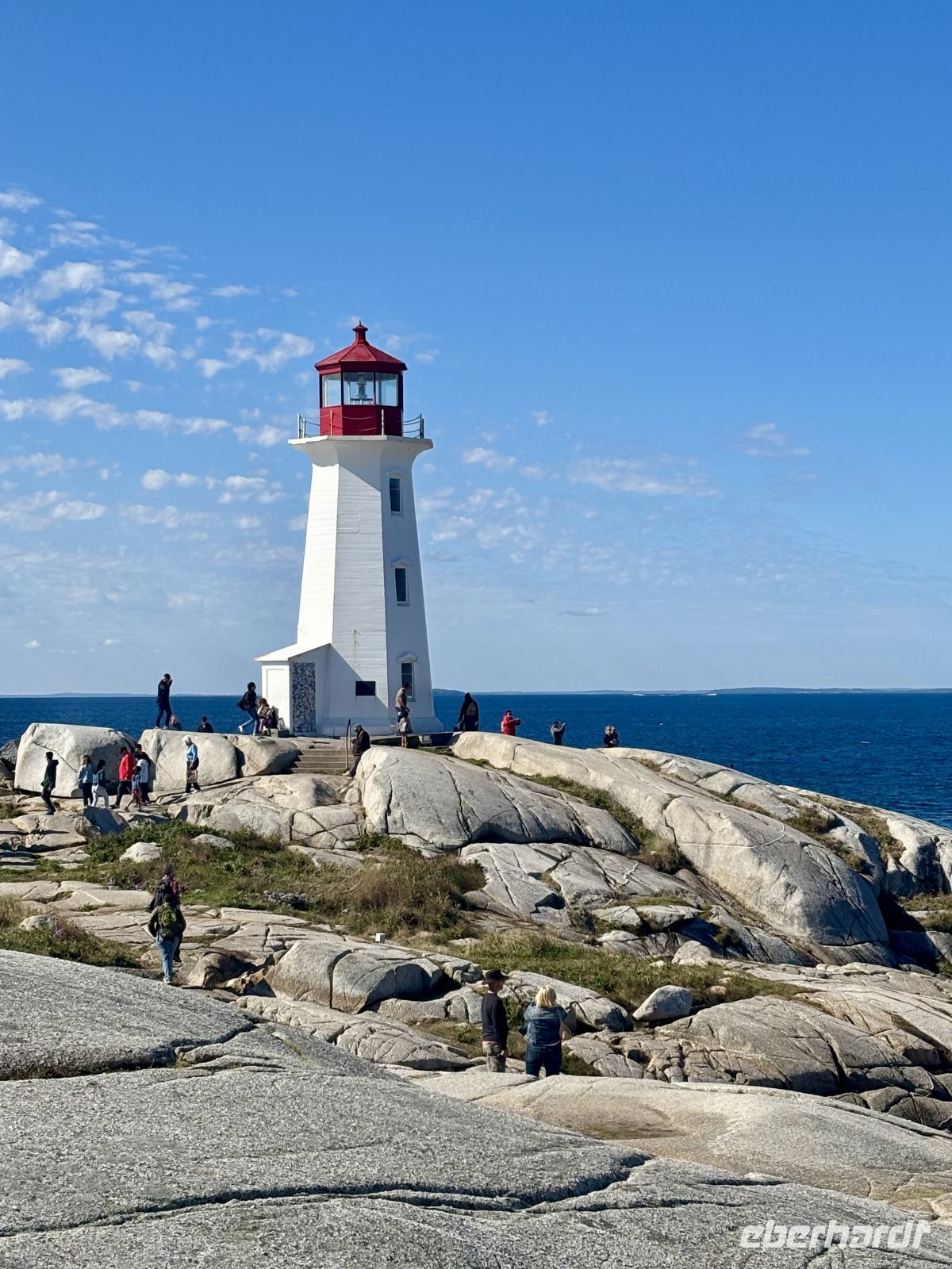 40 Kilometer entfernt kommen wir in eine andere Welt. Schon die Strecke mutet an wie die Reise durch ein Bilderbuch: Wunderschöne Holzhäuser und prunkvolle Villen säumen die Ufer, Segelyachten liegen vor Anker. Die Bäume erstrahlen in intensiven Herbstfarben, darüber ein tiefblauer Himmel. Dann sehen wir das weltberühmte Lighthouse von Peggy's Cove, dem pittoresken kleinen Fischerdorf an der Südküste von Nova Scotia. Der Leuchtturm wurde Jahr 1915 auf Granitfelsen über dem Meer errichtet und ist eines der beliebtesten Fotomotive Kanadas. Leider verbindet man den Ort Peggy's Cove auch mit einem tragischen Ereignis: der Swissair-Flug 111 stürzte 1998 hier vor der Küste in den Atlantik, weil an Bord ein Feuer ausgebrochen war. Alle 229 Personen an Bord kamen ums Leben, ein Gedenkstein erinnert an das schreckliche Unglück.