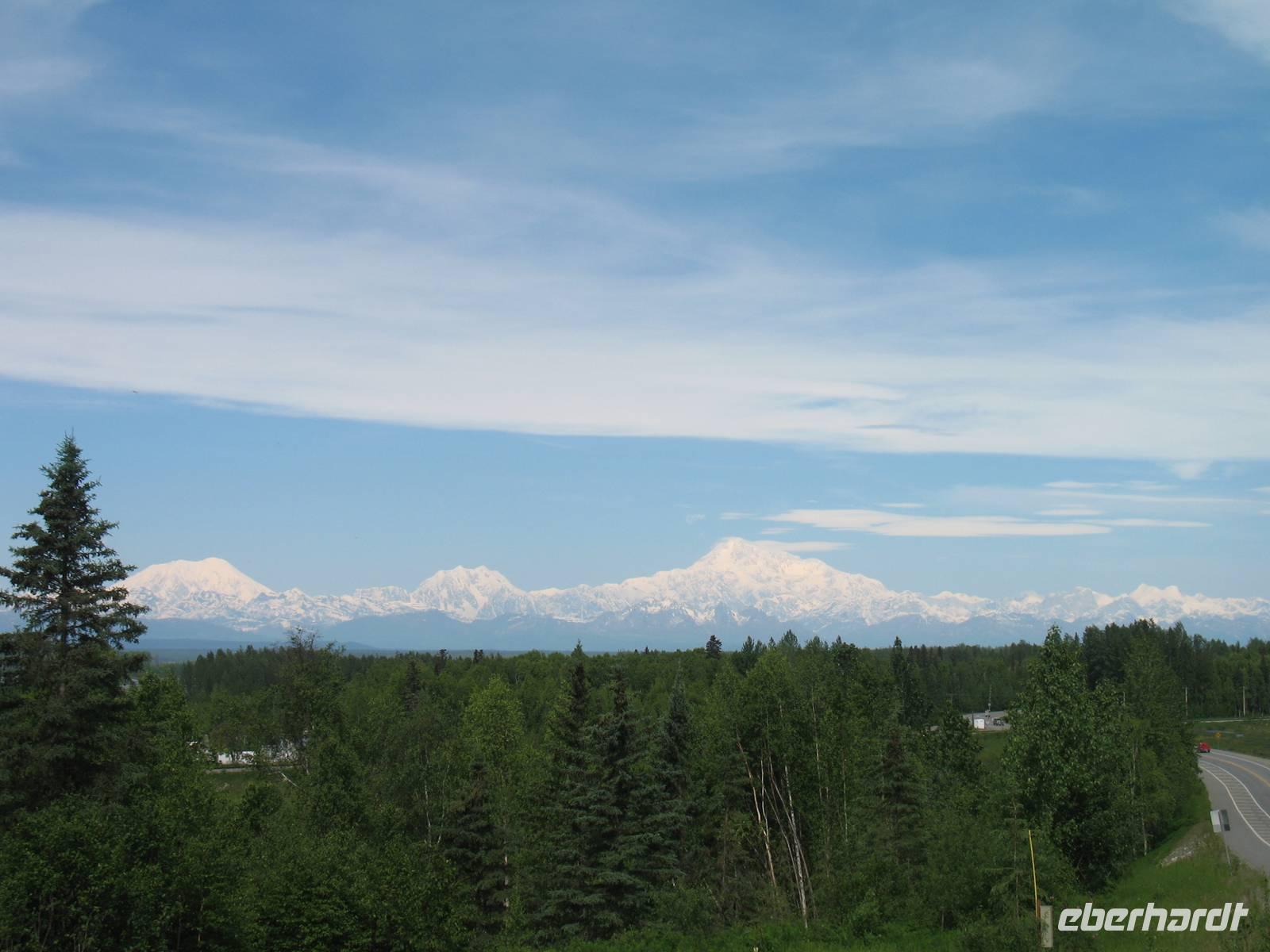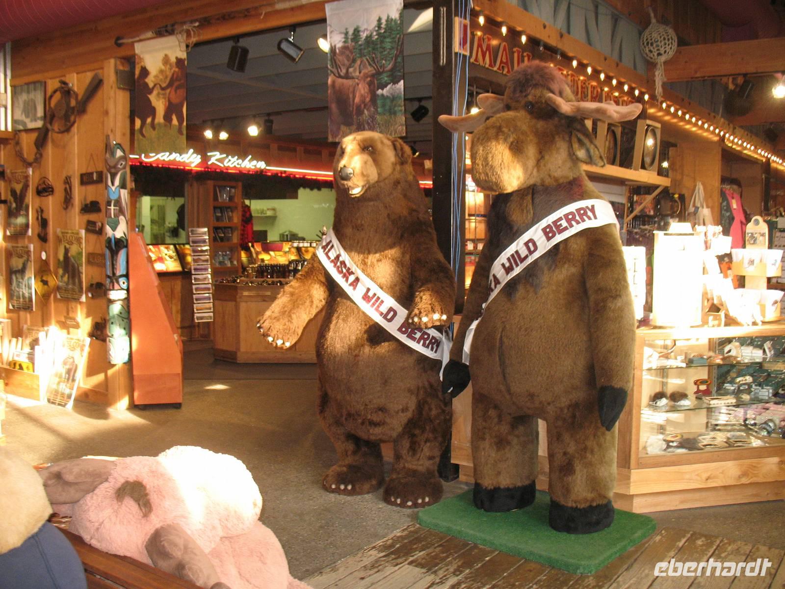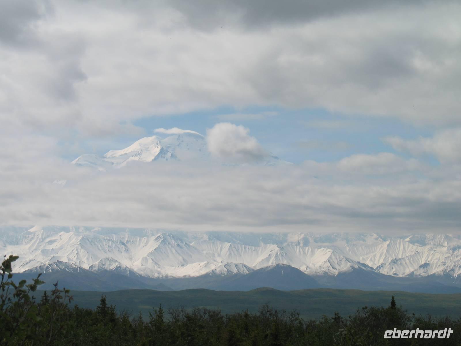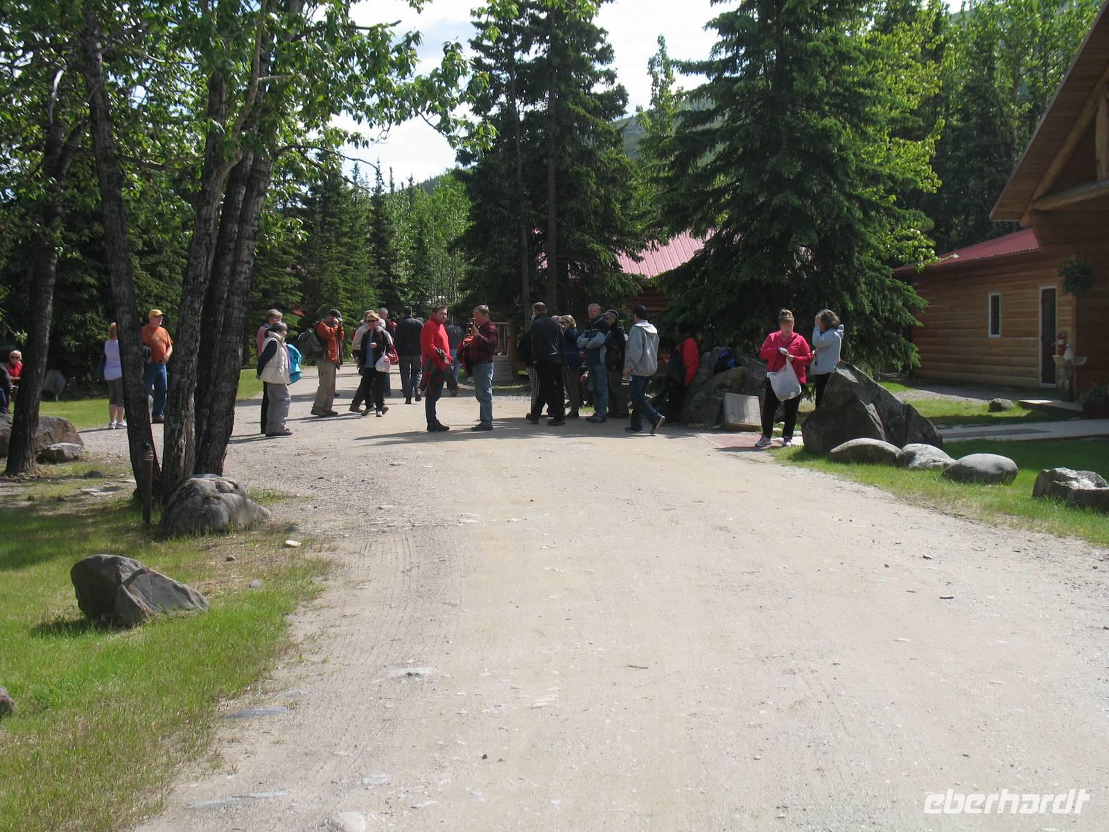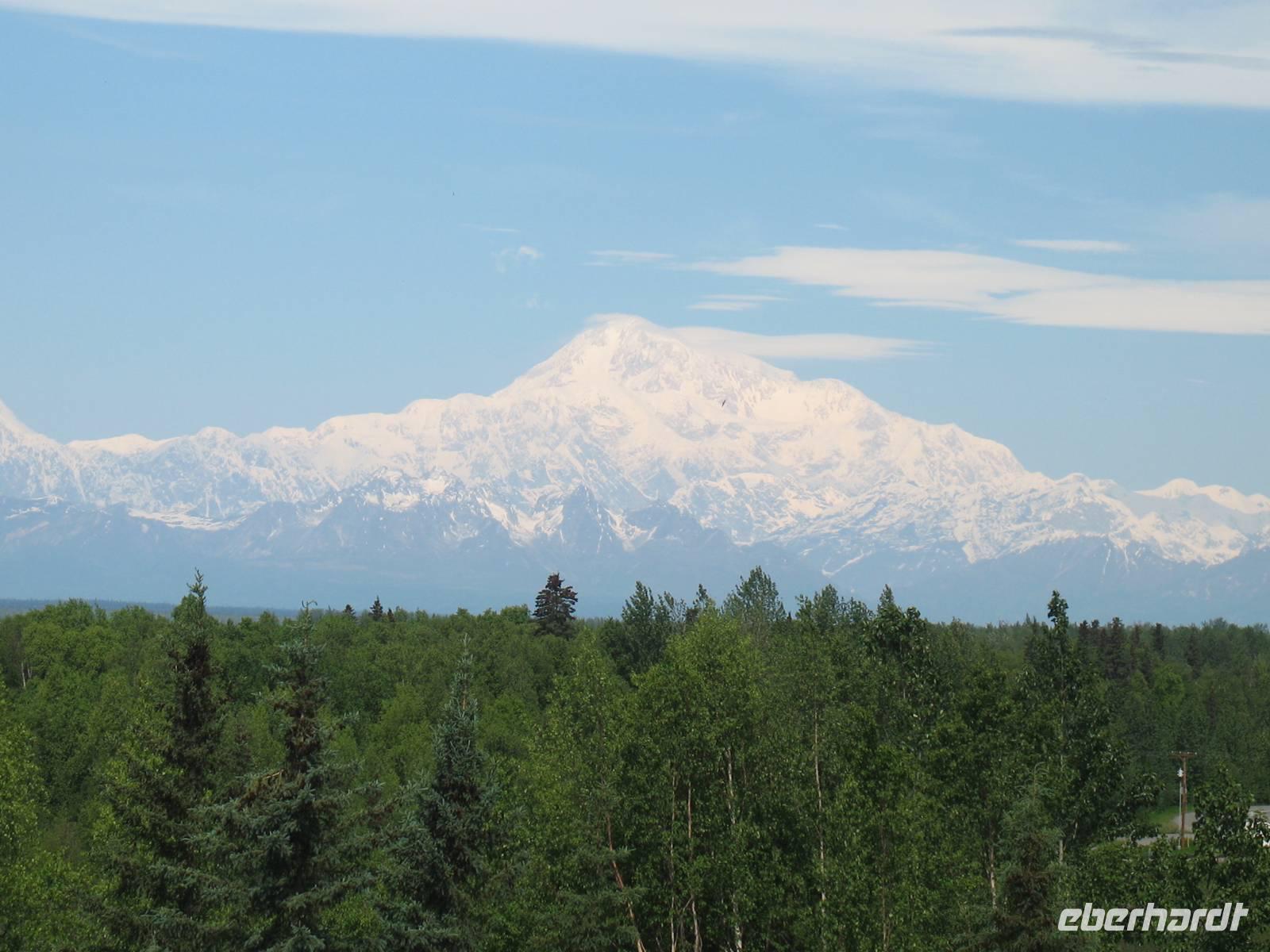 Nach einem erneuten sehr leckerem Frühstück treffen wir uns mit den Koffern am Bus und starten pünktlich um 08.30 Uhr in Richtung Talkeetna. Nach zwei Stunden Busfahrt vorbei an wunderschöner Landschaft und bei traumhaften Wetter legen wir einen Fotostopp beim Denali State Park Visitor Information mit großartigem Blick auf den Mount McKinley ein. Natürlich nutzen wir die Gelegenheit gleich für ein tolles Gruppenfoto :-) Dann geht es auch schon weiter nach Talkeetna. Kurz bevor wir dieses kleine Örtchen erreichen, halten wir noch einmal für einen letzten Blick auf den berühmten Mount McKinley an. In Talkeetna bleiben wir rund eine Stunde. Einige Gäste nutzen die Zeit zum Kauf von Souvenirs, für einen kleinen Snack oder einfach nur, um durch diesen kleinen Ort zu spazieren und die Atmosphäre zu genießen. Danach halten wir noch an einem Supermarkt rund zehn Minuten von Talkeetna an. Wir kaufen unter anderem kleine Snacks, Kekse und Getränke. Auf unserer Weiterfahrt nach Anchorage entdecken wir dann aber eine dunkle Wolke am Horizont. Bei näherer Betrachtung zeigt sich, dass es sich um den Rauch eines Waldbrandes handelt. Die Feuerwehr ist auch schon zu sehen. Es gibt nur eine Straße nach Anchorage, diese führt genau entlang des Waldbrandes. Aber wir haben ganz viel Glück, wir können ohne Stau durchfahren. Am nächsten Tag auf dem Schiff werden wir jedoch von anderen Reisegruppen erfahren, dass diese unter anderem mehrere Stunden im Stau verbracht haben oder auch wieder nach Talkeetna zurückfahren mussten, um dort zu übernachten. Also können wir wirklich froh sein, dass uns diese Aufregung erspart geblieben ist!!! Eigentlich steht auf unserem heutigem Plan noch das Alaska Native Heritage Center, dies verschieben wir aber auf den sechsten Tag, da wir sonst zu wenig Zeit dafür gehabt hätten. Stattdessen unternehmen wir die für den nächsten Morgen geplante Stadtrundfahrt. Dazu legen wir auch einen Stopp am Earthquake Park ein. Am späten Nachmittag gegen 17.00 Uhr checken wir im für uns bereits bekanntem 3-Sterne-Hotel "Westmark Hotel and Conference Center" in Anchorage ein. Die kurze freie Zeit bis zum Abendessen nutzen wir hauptsächlich zum Erfrischen. Um 19.00 Uhr werden wir von einem Busshuttle abgeholt und zum Restaurant "Sourdough Mining Co." gebracht. Dies ist wieder ein sehr uriges Restaurant, dem gegenüber befindet sich ein Souvenirladen und ein Geschäft mit selbstgemachter Schokolade. Unser heutiges Abendessen besteht aus mehreren Gänge wie verschiedenen Kartoffelvarianten, Rippchen und Weißfisch. Als Dessert gibt es Eis, die Sorte und Zutaten kann sich jeder selbst wählen. Nach dem Essen schauen wir noch im Souvenirladen vorbei, wo ein riesiger unechter Bär direkt im Eingang aufgestellt ist. Im Anschluss werden wieder zum Hotel chauffiert. Während sich der Großteil auf die Zimmer zurückzieht, genießen einige Gäste noch das warme Wetter bei einem tollen Abendspaziergang.