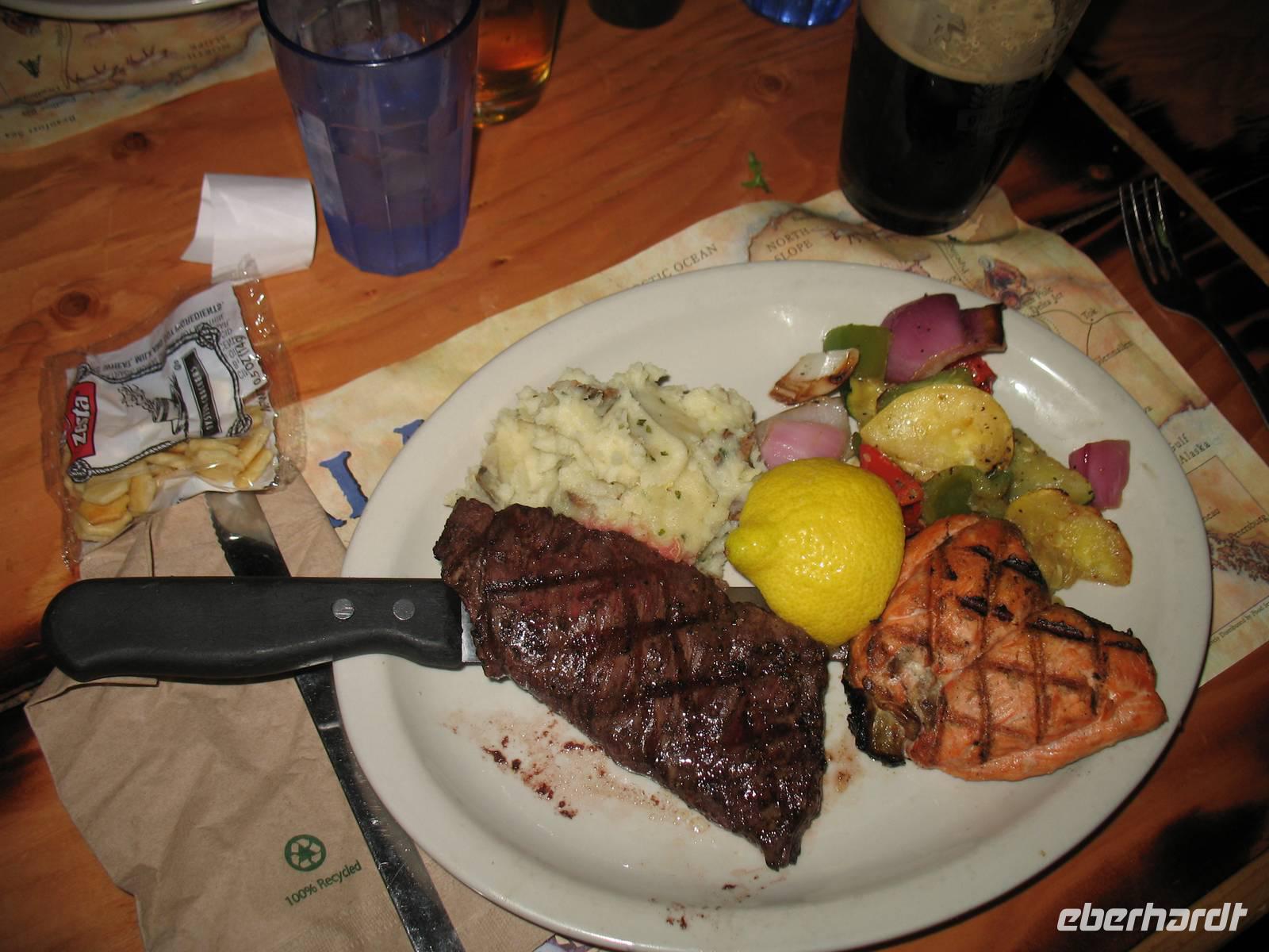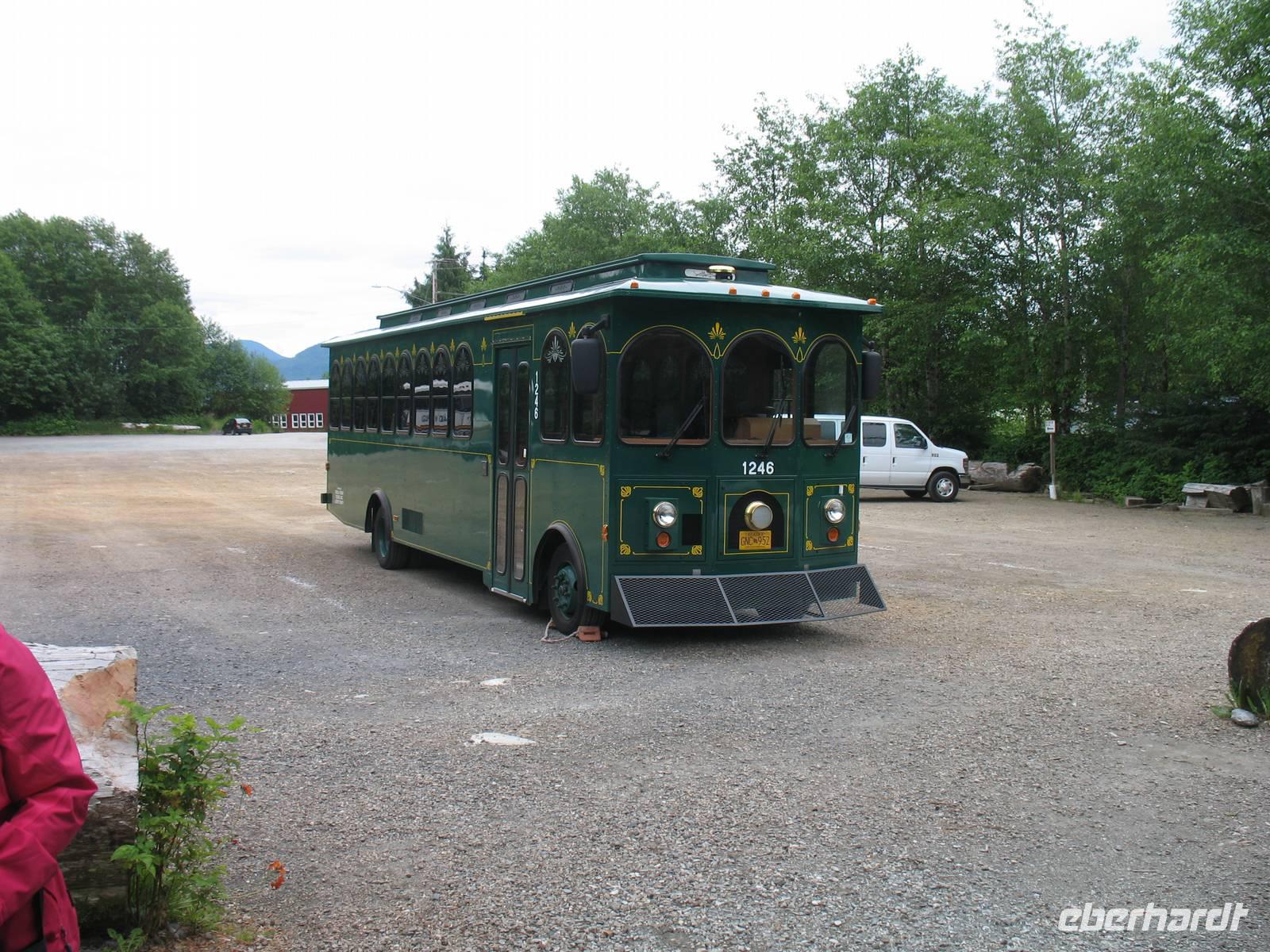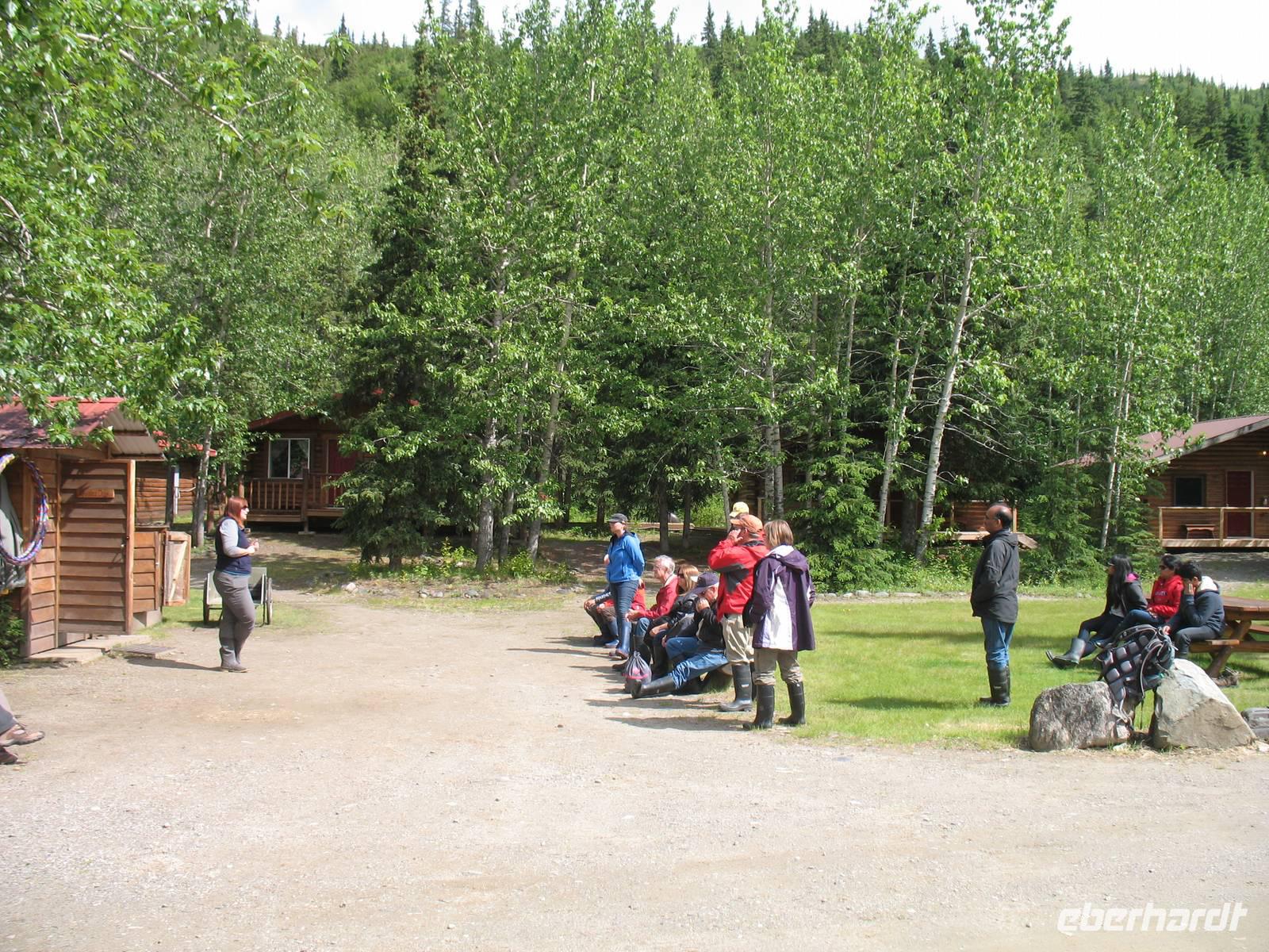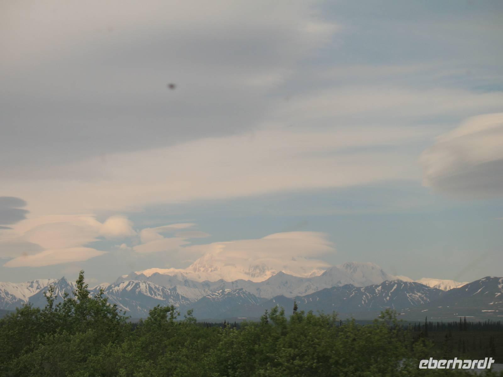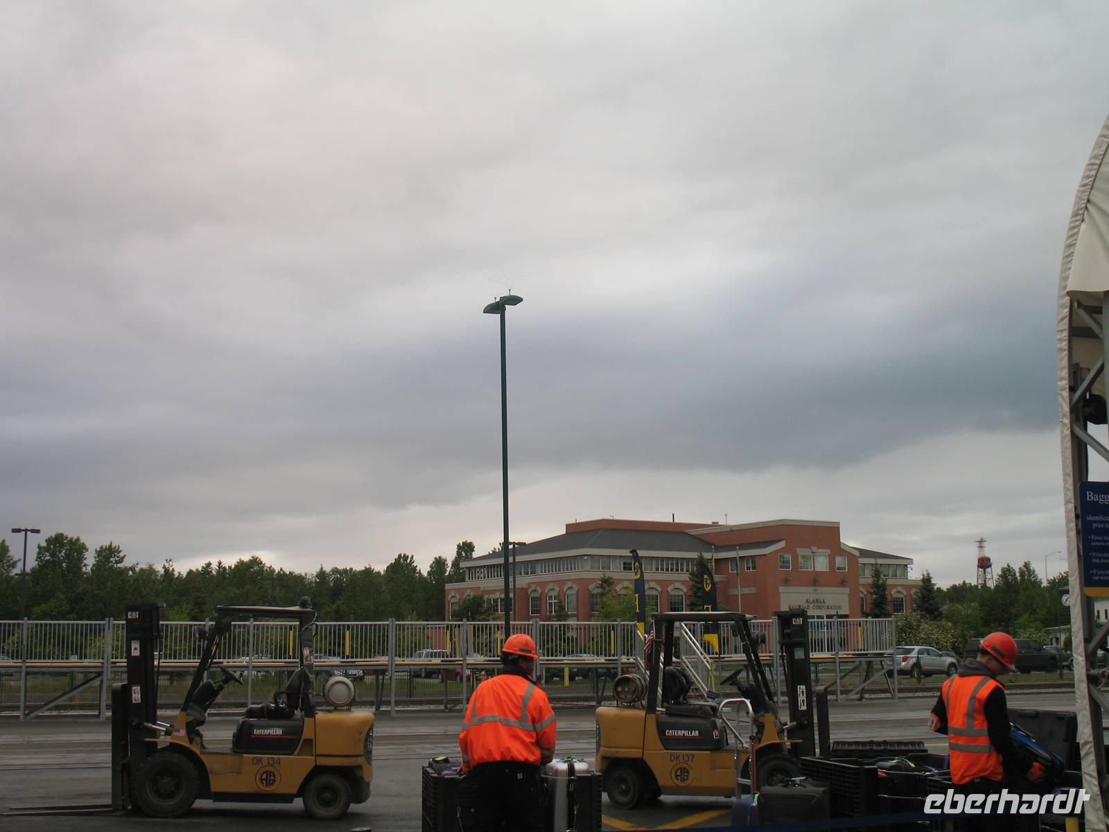 Nach einem erneuten sehr leckerem Frühstück treffen wir uns mit den Koffern am Bus und starten pünktlich um 08.30 Uhr in Richtung Talkeetna. Nach zwei Stunden Busfahrt vorbei an wunderschöner Landschaft und bei traumhaften Wetter legen wir einen Fotostopp beim Denali State Park Visitor Information mit großartigem Blick auf den Mount McKinley ein. Natürlich nutzen wir die Gelegenheit gleich für ein tolles Gruppenfoto :-) Dann geht es auch schon weiter nach Talkeetna. Kurz bevor wir dieses kleine Örtchen erreichen, halten wir noch einmal für einen letzten Blick auf den berühmten Mount McKinley an. In Talkeetna bleiben wir rund eine Stunde. Einige Gäste nutzen die Zeit zum Kauf von Souvenirs, für einen kleinen Snack oder einfach nur, um durch diesen kleinen Ort zu spazieren und die Atmosphäre zu genießen. Danach halten wir noch an einem Supermarkt rund zehn Minuten von Talkeetna an. Wir kaufen unter anderem kleine Snacks, Kekse und Getränke. Auf unserer Weiterfahrt nach Anchorage entdecken wir dann aber eine dunkle Wolke am Horizont. Bei näherer Betrachtung zeigt sich, dass es sich um den Rauch eines Waldbrandes handelt. Die Feuerwehr ist auch schon zu sehen. Es gibt nur eine Straße nach Anchorage, diese führt genau entlang des Waldbrandes. Aber wir haben ganz viel Glück, wir können ohne Stau durchfahren. Am nächsten Tag auf dem Schiff werden wir jedoch von anderen Reisegruppen erfahren, dass diese unter anderem mehrere Stunden im Stau verbracht haben oder auch wieder nach Talkeetna zurückfahren mussten, um dort zu übernachten. Also können wir wirklich froh sein, dass uns diese Aufregung erspart geblieben ist!!! Eigentlich steht auf unserem heutigem Plan noch das Alaska Native Heritage Center, dies verschieben wir aber auf den sechsten Tag, da wir sonst zu wenig Zeit dafür gehabt hätten. Stattdessen unternehmen wir die für den nächsten Morgen geplante Stadtrundfahrt. Dazu legen wir auch einen Stopp am Earthquake Park ein. Am späten Nachmittag gegen 17.00 Uhr checken wir im für uns bereits bekanntem 3-Sterne-Hotel "Westmark Hotel and Conference Center" in Anchorage ein. Die kurze freie Zeit bis zum Abendessen nutzen wir hauptsächlich zum Erfrischen. Um 19.00 Uhr werden wir von einem Busshuttle abgeholt und zum Restaurant "Sourdough Mining Co." gebracht. Dies ist wieder ein sehr uriges Restaurant, dem gegenüber befindet sich ein Souvenirladen und ein Geschäft mit selbstgemachter Schokolade. Unser heutiges Abendessen besteht aus mehreren Gänge wie verschiedenen Kartoffelvarianten, Rippchen und Weißfisch. Als Dessert gibt es Eis, die Sorte und Zutaten kann sich jeder selbst wählen. Nach dem Essen schauen wir noch im Souvenirladen vorbei, wo ein riesiger unechter Bär direkt im Eingang aufgestellt ist. Im Anschluss werden wieder zum Hotel chauffiert. Während sich der Großteil auf die Zimmer zurückzieht, genießen einige Gäste noch das warme Wetter bei einem tollen Abendspaziergang.
